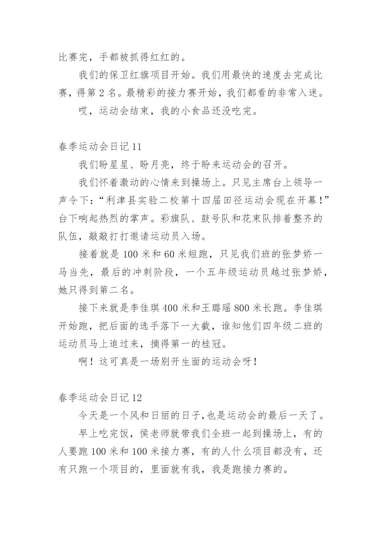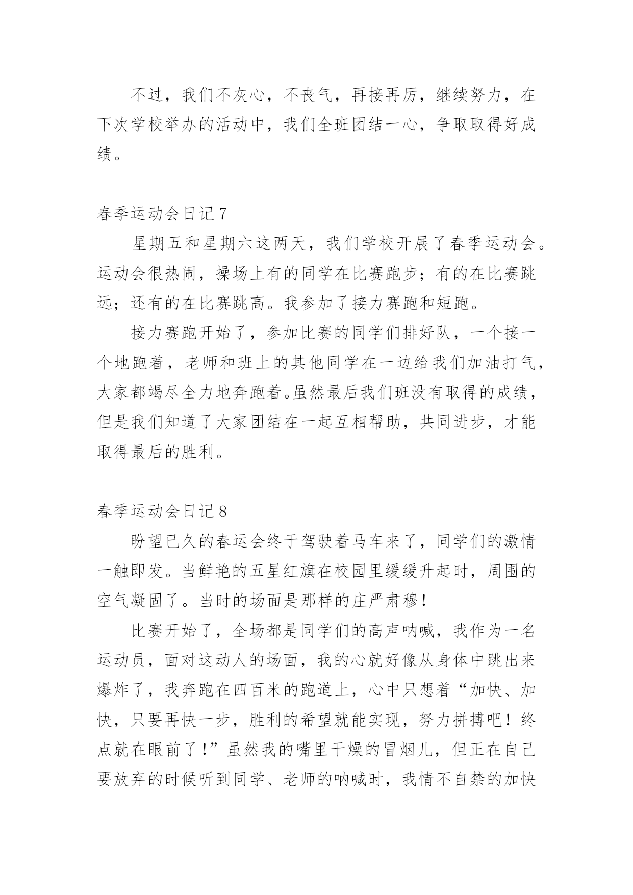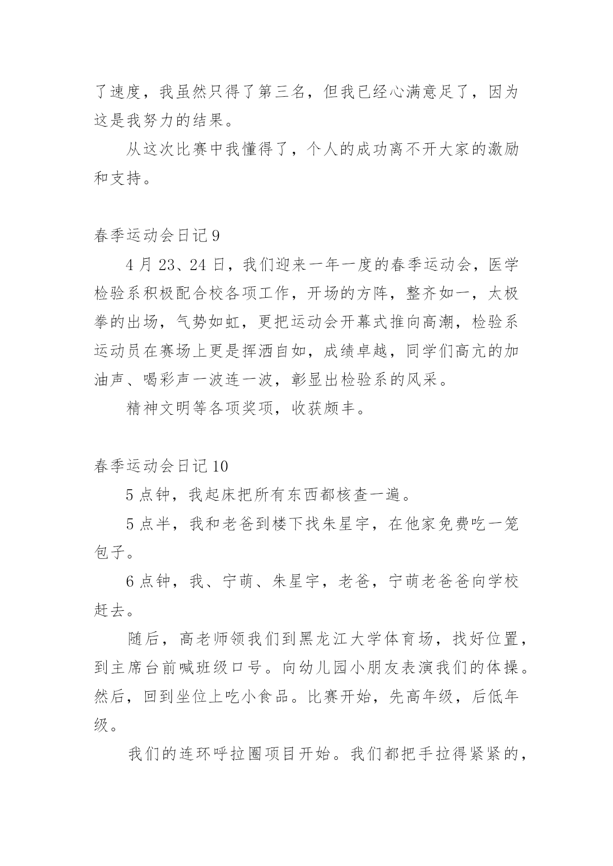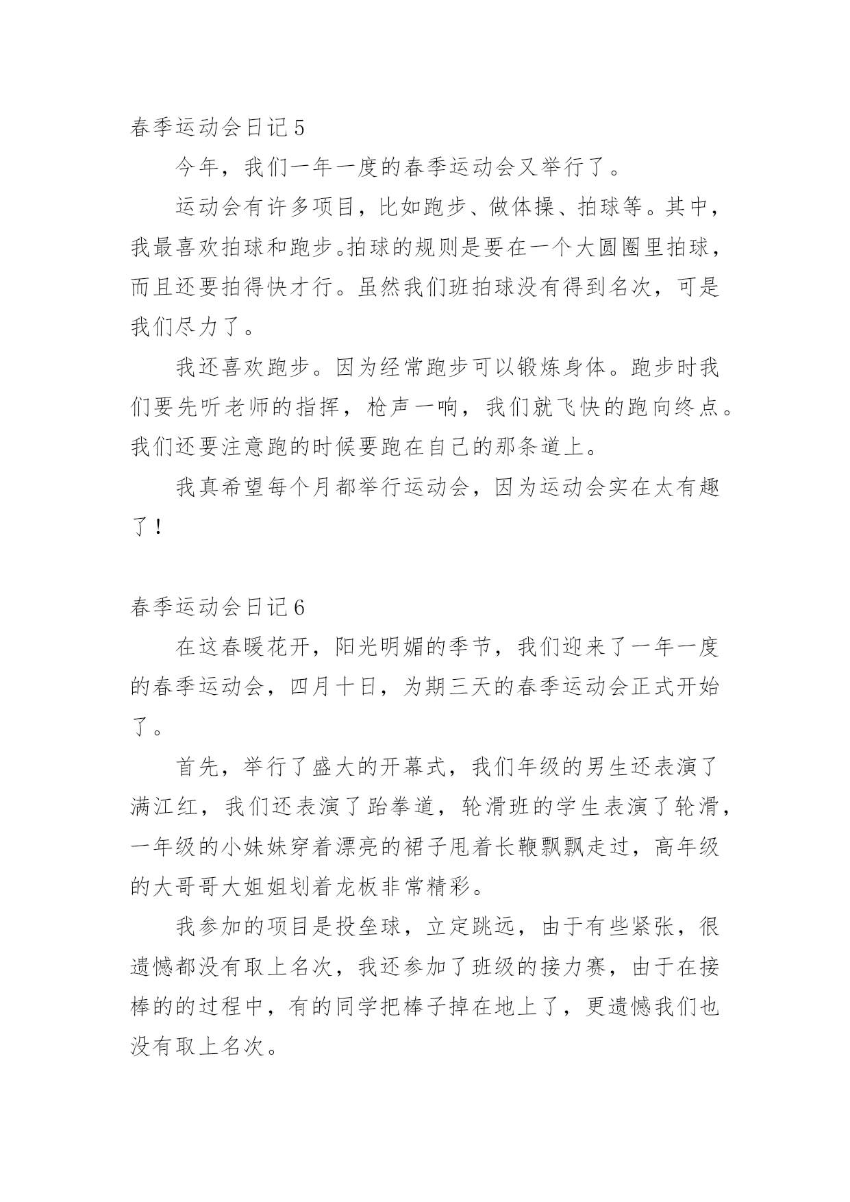 春季运动会日记即将要到一天的结尾了,想必大家都学习了不少新知识,请好好地记录下在日记里。日记怎么写才合适呢?以下是小编收集整理的春季运动会日记,希望能够帮助到大家。春季运动会日记1在一个春暖花开的季节学校举行田径运动会。一大早同学们高高兴兴地来到学校。班主任曾老师我们领到运动场边。过了一会儿只听见广播里说:“请三年级参加60米跑的同学准备。”于是六十米跑的同学都排好了队。“拍”地一声枪响运动员们似箭一样向前冲刺谁都不服输。旁边的啦啦队不停地喊:“加油!加油!”这时一个运动员猛冲上去跑在前面紧随其后的另一个运动员不甘示弱加把劲超过了跑在前面的运动员第一个到达终点为班里争了光。春季运动会日记24月10日我们学校举行了春季运动会,我很激动,我为什么激动呢?因为我终于等到这一天的到来。我的项目是立定跳远,我的动作是:把胳膊甩上摔下双腿半蹲然后在往前跳。我拿到了全年级第四名。我们班得了全年级第三名,我们还得了卫生奖,我们很高兴!春季运动会日记3今天,我们开学校运动会,有跳高的,有跑步的,还有滚轮胎的。开幕式开始了,军乐队统一服装,有打鼓的,吹号的。紧接着升国旗,奏国歌。全体行注目礼,少先队员行队礼。比赛开始了,庄世龙开始跑步了,我们给他喊加油。下午的跳远比赛,解家雨进入了决赛。今天我们真开心!春季运动会日记4今个星期我们学校举行了一场春季运动会,我们都早早地布置好了。运动会开始了,我们每个人都迫不及待地跑去观看运动员比赛,第一组是50米,第二组是200米,第三组是800米,当然也有不少同学获奖了!比赛结束了,大家都很开心,昏昏沉沉的天,细雨漫天,眼前的风景都蒙上了一层布幕,叫人看的不真切。忽然,一道闪电划过,硬生生的把乌云撕碎的天空劈成了两半,眼前的亮光还没闪过,紧接着就是轰隆一片雷响,收回目光,就看见被晒的冒烟的地面被豆大的雨点打得飞扬。下雨了,我们赶紧飞快地跑进了教室,可还是依依不舍的。春季运动会日记5今年,我们一年一度的春季运动会又举行了。运动会有许多项目,比如跑步、做体操、拍球等。其中,我最喜欢拍球和跑步。拍球的规则是要在一个大圆圈里拍球,而且还要拍得快才行。虽然我们班拍球没有得到名次,可是我们尽力了。我还喜欢跑步。因为经常跑步可以锻炼身体。跑步时我们要先听老师的指挥,枪声一响,我们就飞快的跑向终点。我们还要注意跑的时候要跑在自己的那条道上。我真希望每个月都举行运动会,因为运动会实在太有趣了!春季运动会日记6在这春暖花开,阳光明媚的季节,我们迎来了一年一度的春季运动会,四月十日,为期三天的春季运动会正式开始了。首先,举行了盛大的开幕式,我们年级的男生还表演了满江红,我们还表演了跆拳道,轮滑班的学生表演了轮滑,一年级的小妹妹穿着漂亮的裙子甩着长鞭飘飘走过,高年级的大哥哥大姐姐划着龙板非常精彩。我参加的项目是投垒球,立定跳远,由于有些紧张,很遗憾都没有取上名次,我还参加了班级的接力赛,由于在接棒的的过程中,有的同学把棒子掉在地上了,更遗憾我们也没有取上名次。不过,我们不灰心,不丧气,再接再厉,继续努力,在下次学校举办的活动中,我们全班团结一心,争取取得好成绩。春季运动会日记7星期五和星期六这两天,我们学校开展了春季运动会。运动会很热闹,操场上有的同学在比赛跑步;有的在比赛跳远;还有的在比赛跳高。我参加了接力赛跑和短跑。接力赛跑开始了,参加比赛的同学们排好队,一个接一个地跑着,老师和班上的其他同学在一边给我们加油打气,大家都竭尽全力地奔跑着。虽然最后我们班没有取得的成绩,但是我们知道了大家团结在一起互相帮助,共同进步,才能取得最后的胜利。春季运动会日记8盼望已久的春运会终于驾驶着马车来了,同学们的激情一触即发。当鲜艳的五星红旗在校园里缓缓升起时,周围的空气凝固了。当时的场面是那样的庄严肃穆!比赛开始了,全场都是同学们的高声呐喊,我作为一名运动员,面对这动人的场面,我的心就好像从身体中跳出来爆炸了,我奔跑在四百米的跑道上,心中只想着“加快、加快,只要再快一步,胜利的希望就能实现,努力拼搏吧!终点就在眼前了!”虽然我的嘴里干燥的冒烟儿,但正在自己要放弃的时候听到同学、老师的呐喊时,我情不自禁的加快了速度,我虽然只得了第三名,但我已经心满意足了,因为这是我努力的结果。从这次比赛中我懂得了,个人的成功离不开大家的激励和支持。春季运动会日记94月23、24日,我们迎来一年一度的春季运动会,医学检验系积极配合校各项工作,开场的方阵,整齐如一,太极拳的出场,气势如虹,更把运动会开幕式推向高潮,检验系运动员在赛场上更是挥洒自如,成绩卓越,同学们高亢的加油声、喝彩声一波连一波,彰显出检验系的风采。精神文明等各项奖项,收获颇丰。春季运动会日记105点钟,我起床把所有东西都核查一遍。5点半,我和老爸到楼下找朱星宇,在他家免费吃一笼包子。6点钟,我、宁萌