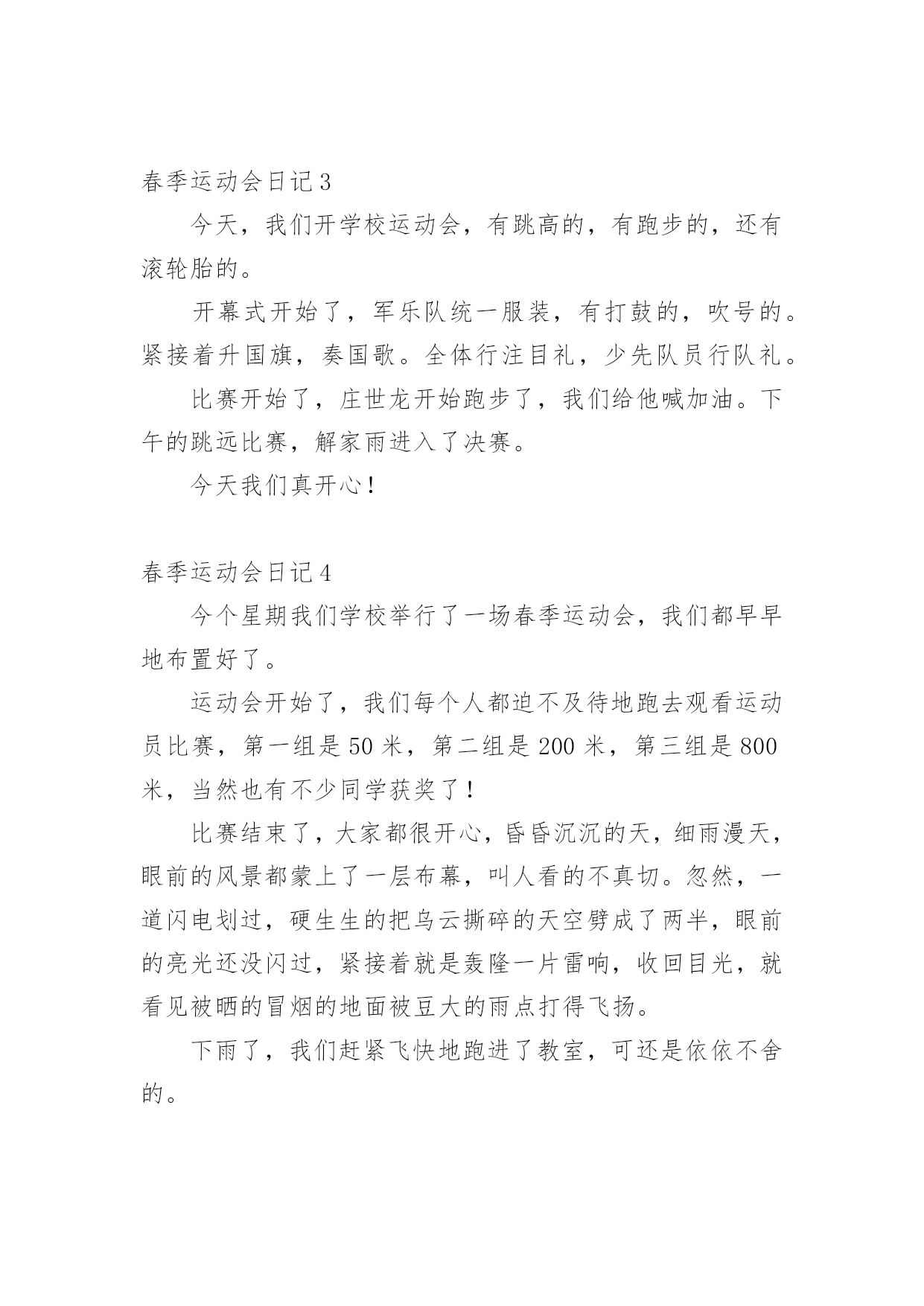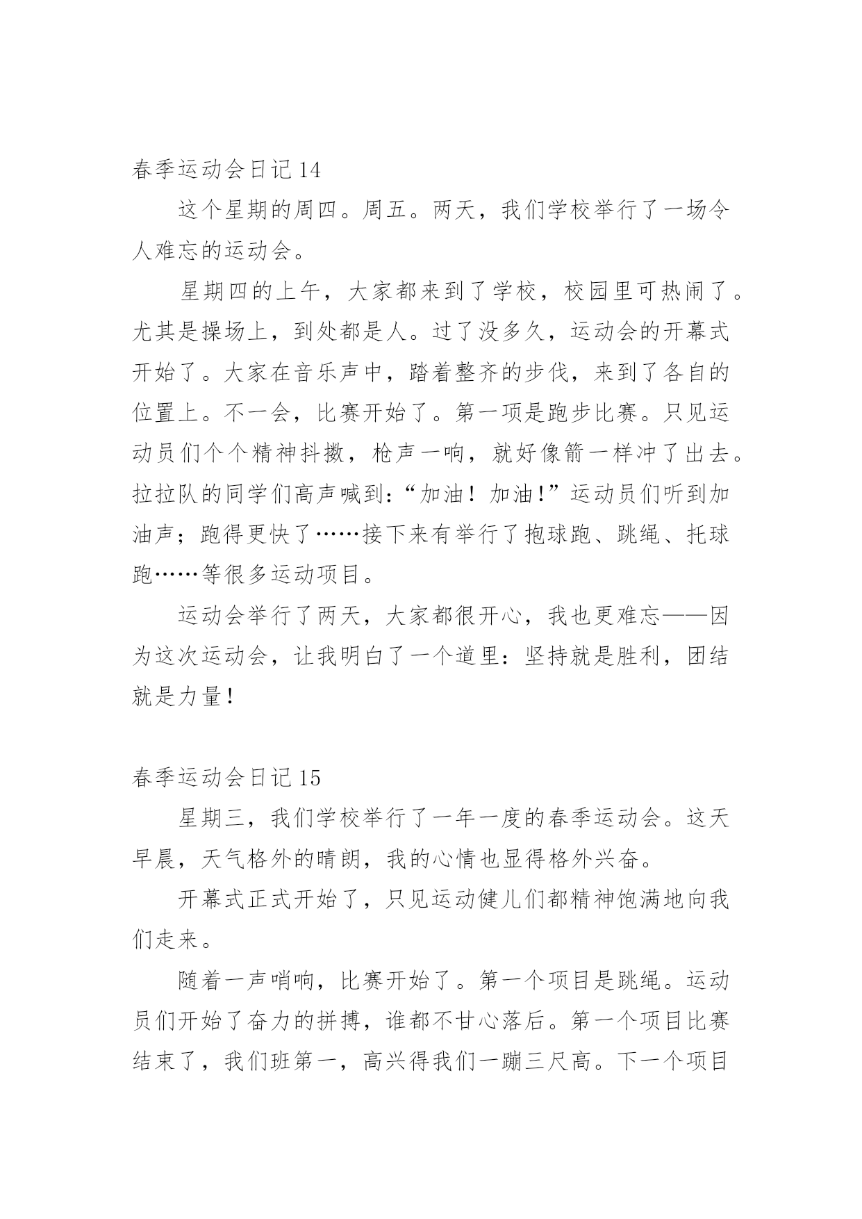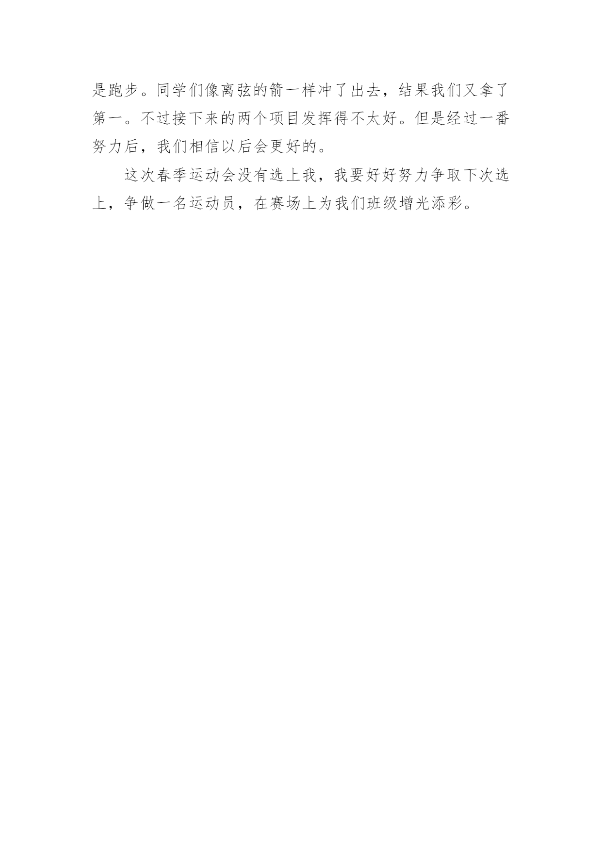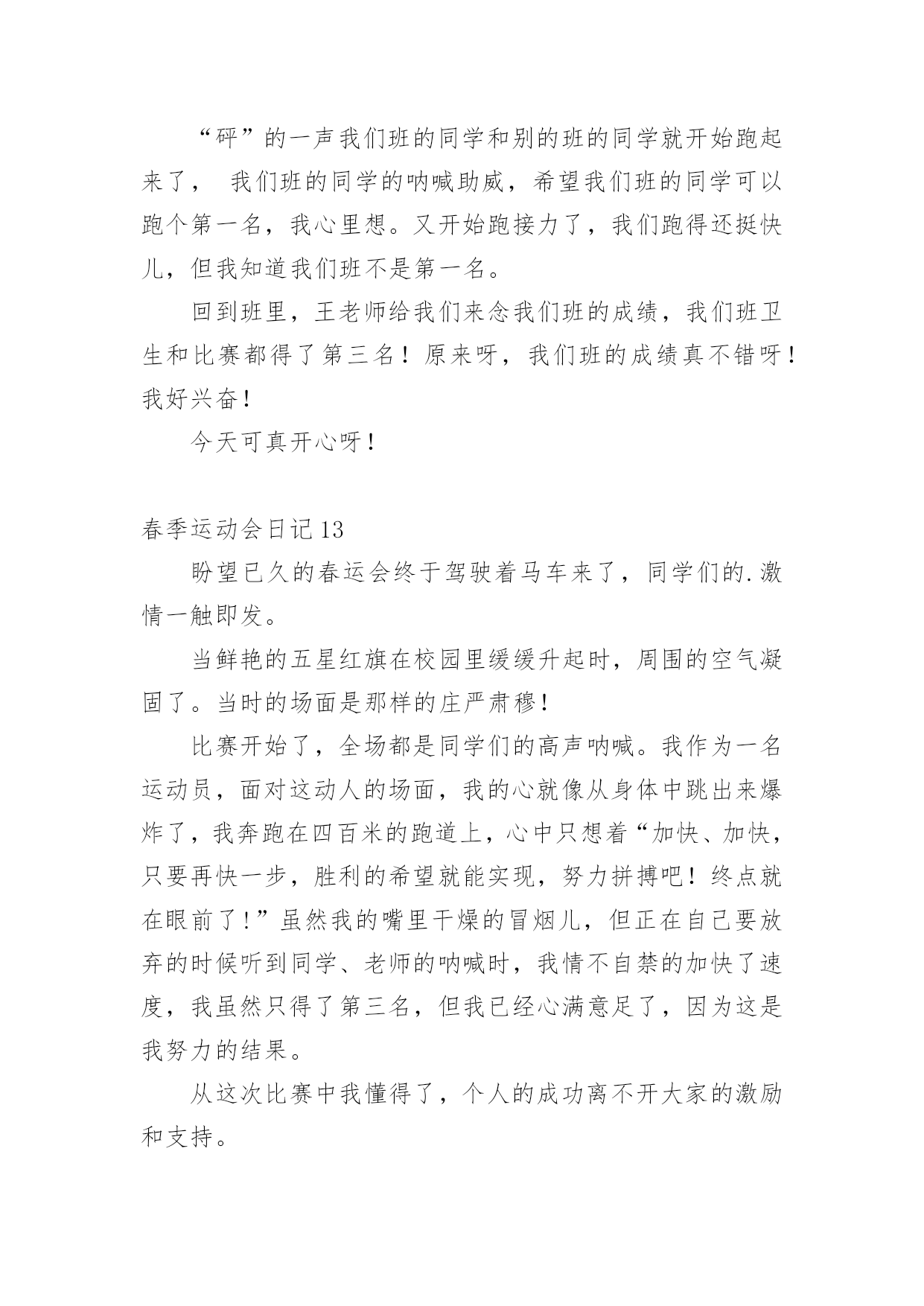 春季运动会日记即将要到一天的结尾了,想必大家都学习了不少新知识,请好好地记录下在日记里。日记怎么写才合适呢?以下是小编收集整理的春季运动会日记,希望能够帮助到大家。春季运动会日记1在一个春暖花开的季节学校举行田径运动会。一大早同学们高高兴兴地来到学校。班主任曾老师我们领到运动场边。过了一会儿只听见广播里说:“请三年级参加60米跑的同学准备。”于是六十米跑的同学都排好了队。“拍”地一声枪响运动员们似箭一样向前冲刺谁都不服输。旁边的啦啦队不停地喊:“加油!加油!”这时一个运动员猛冲上去跑在前面紧随其后的另一个运动员不甘示弱加把劲超过了跑在前面的运动员第一个到达终点为班里争了光。春季运动会日记24月10日我们学校举行了春季运动会,我很激动,我为什么激动呢?因为我终于等到这一天的到来。我的项目是立定跳远,我的动作是:把胳膊甩上摔下双腿半蹲然后在往前跳。我拿到了全年级第四名。我们班得了全年级第三名,我们还得了卫生奖,我们很高兴!春季运动会日记3今天,我们开学校运动会,有跳高的,有跑步的,还有滚轮胎的。开幕式开始了,军乐队统一服装,有打鼓的,吹号的。紧接着升国旗,奏国歌。全体行注目礼,少先队员行队礼。比赛开始了,庄世龙开始跑步了,我们给他喊加油。下午的跳远比赛,解家雨进入了决赛。今天我们真开心!春季运动会日记4今个星期我们学校举行了一场春季运动会,我们都早早地布置好了。运动会开始了,我们每个人都迫不及待地跑去观看运动员比赛,第一组是50米,第二组是200米,第三组是800米,当然也有不少同学获奖了!比赛结束了,大家都很开心,昏昏沉沉的天,细雨漫天,眼前的风景都蒙上了一层布幕,叫人看的不真切。忽然,一道闪电划过,硬生生的把乌云撕碎的天空劈成了两半,眼前的亮光还没闪过,紧接着就是轰隆一片雷响,收回目光,就看见被晒的冒烟的地面被豆大的雨点打得飞扬。下雨了,我们赶紧飞快地跑进了教室,可还是依依不舍的。春季运动会日记5今年,我们一年一度的春季运动会又举行了。运动会有许多项目,比如跑步、做体操、拍球等。其中,我最喜欢拍球和跑步。拍球的规则是要在一个大圆圈里拍球,而且还要拍得快才行。虽然我们班拍球没有得到名次,可是我们尽力了。我还喜欢跑步。因为经常跑步可以锻炼身体。跑步时我们要先听老师的指挥,枪声一响,我们就飞快的跑向终点。我们还要注意跑的时候要跑在自己的那条道上。我真希望每个月都举行运动会,因为运动会实在太有趣了!春季运动会日记6在这春暖花开,阳光明媚的季节,我们迎来了一年一度的春季运动会,四月十日,为期三天的春季运动会正式开始了。首先,举行了盛大的开幕式,我们年级的男生还表演了满江红,我们还表演了跆拳道,轮滑班的学生表演了轮滑,一年级的小妹妹穿着漂亮的裙子甩着长鞭飘飘走过,高年级的大哥哥大姐姐划着龙板非常精彩。我参加的项目是投垒球,立定跳远,由于有些紧张,很遗憾都没有取上名次,我还参加了班级的接力赛,由于在接棒的的过程中,有的同学把棒子掉在地上了,更遗憾我们也没有取上名次。不过,我们不灰心,不丧气,再接再厉,继续努力,在下次学校举办的活动中,我们全班团结一心,争取取得好成绩。春季运动会日记7星期五和星期六这两天,我们学校开展了春季运动会。运动会很热闹,操场上有的同学在比赛跑步;有的在比赛跳远;还有的在比赛跳高。我参加了接力赛跑和短跑。接力赛跑开始了,参加比赛的同学们排好队,一个接一个地跑着,老师和班上的其他同学在一边给我们加油打气,大家都竭尽全力地奔跑着。虽然最后我们班没有取得的成绩,但是我们知道了大家团结在一起互相帮助,共同进步,才能取得最后的胜利。春季运动会日记8盼望已久的春运会终于驾驶着马车来了,同学们的激情一触即发。当鲜艳的五星红旗在校园里缓缓升起时,周围的空气凝固了。当时的场面是那样的庄严肃穆!比赛开始了,全场都是同学们的高声呐喊,我作为一名运动员,面对这动人的场面,我的心就好像从身体中跳出来爆炸了,我奔跑在四百米的跑道上,心中只想着“加快、加快,只要再快一步,胜利的希望就能实现,努力拼搏吧!终点就在眼前了!”虽然我的嘴里干燥的冒烟儿,但正在自己要放弃的时候听到同学、老师的呐喊时,我情不自禁的加快了速度,我虽然只得了第三名,但我已经心满意足了,因为这是我努力的结果。从这次比赛中我懂得了,个人的成功离不开大家的激励和支持。春季运动会日记94月23、24日,我们迎来一年一度的春季运动会,医学检验系积极配合校各项工作,开场的方阵,整齐如一,太极拳的出场,气势如虹,更把运动会开幕式推向高潮,检验系运动员在赛场上更是挥洒自如,成绩卓越,同学们高亢的加油声、喝彩声一波连一波,彰显出检验系的风采。精神文明等各项奖项,收获颇丰。春季运动会日记105点钟,我起床把所有东西都核查一遍。5点半,我和老爸到楼下找朱星宇,在他家免费吃一笼包子。6点钟,我、宁萌