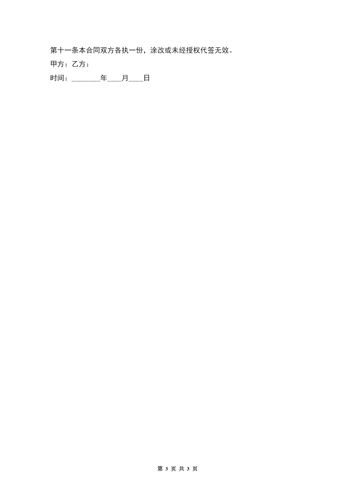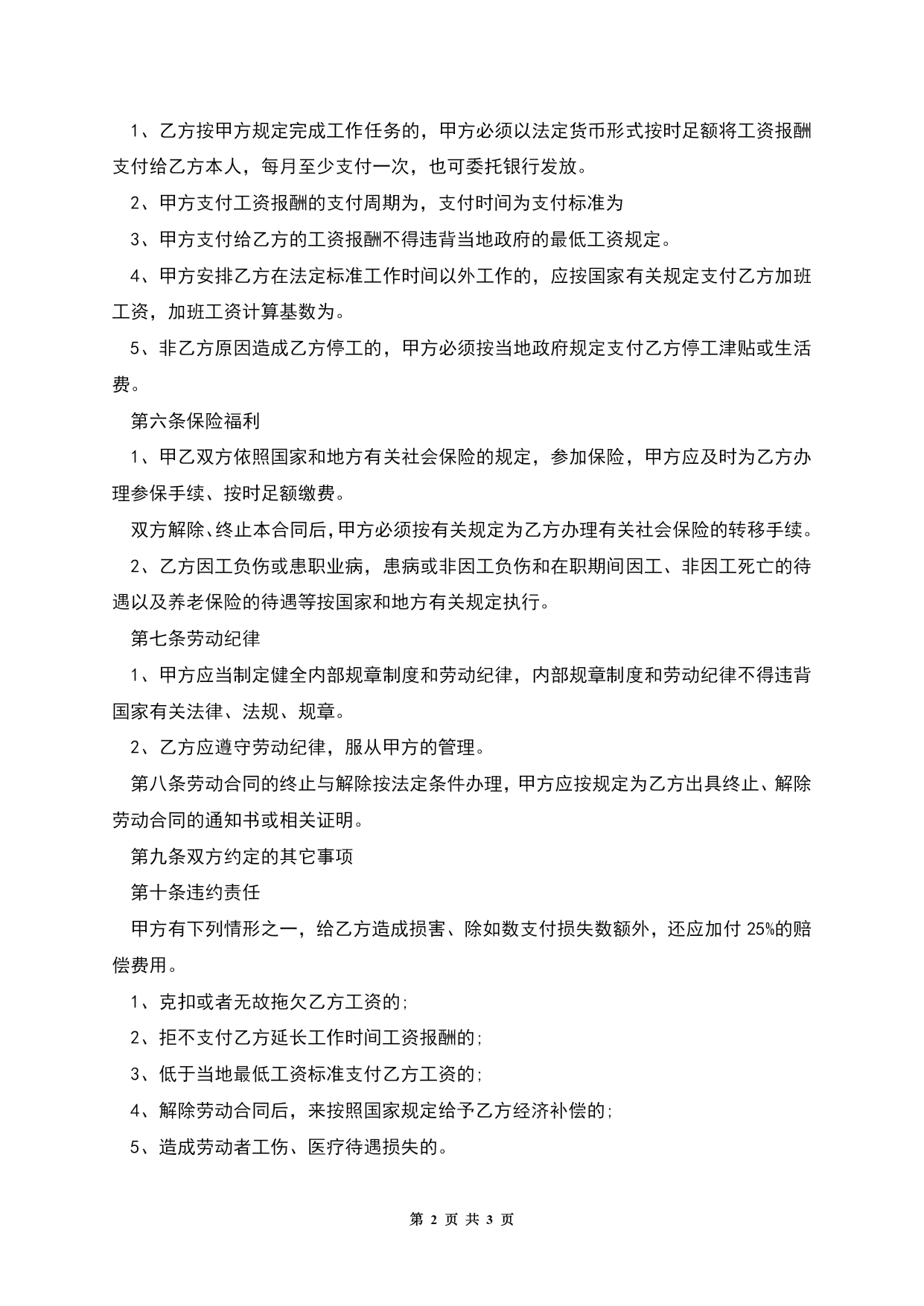 第PAGE\*MERGEFORMAT3页共NUMPAGES\*MERGEFORMAT3页公司法务聘用劳动合同为建立劳动关系,明确权利义务,依据《中华人民共和国劳动法》及有关法律、法规,规章,在平等自愿、协商一致的基础上。订立本合同。第一条劳动合同期限本合同期限类型为期限,自________年____月____日起,至________年____月____日止。第二条工作内容1、甲方根据工作需要,安排乙方在工作岗位,乙方的工作任务为。2、甲方根据工作需要,经双方协商同意,可以调换乙方的工种或岗位。第三条劳动保护和劳动条件1、甲方必须建立健全劳动安全卫生制度和操作规程,工作规范,在上岗或调换新岗位前应对乙方进行严格的岗前培训和劳动安全卫生教育。2、甲方必须为乙方提供符合国家规定的劳动安全卫生条件和必要的劳动防护用品。3、甲方必须根据国家有关规定对女职工和未成年工实行特殊劳动保护。4、乙方在工作过程中,必须严格遵守安全操作规程,对甲方管理人员违章指挥、强令冒险作业时有权拒绝执行。5、团方安排乙方从事特种作业的,必须按国家规定对乙方进行专门培训并取得特种作业资格或者乙方已经过专门培训取得特种作业资格。第四条工作时间和休息、休假1、甲方安排乙方的每日工作时间不超过八小时,甲方由于工作需要。经与工会和乙方协商后可以延长工作时间,一般每日不得超过一小时;因特殊原因需要延长工作时间的,在保障乙方身体健康的条件下延长工作时间每日不得超过三小时,每月不得超过三十六小时。2、甲方应按国家规定保证乙方的休息权利,每周至少保证乙方休息一天。3、在国家法定节日期间,甲方应按国家规定安排乙方休假。第五条劳动报酬1、乙方按甲方规定完成工作任务的,甲方必须以法定货币形式按时足额将工资报酬支付给乙方本人,每月至少支付一次,也可委托银行发放。2、甲方支付工资报酬的支付周期为,支付时间为支付标准为3、甲方支付给乙方的工资报酬不得违背当地政府的最低工资规定。4、甲方安排乙方在法定标准工作时间以外工作的,应按国家有关规定支付乙方加班工资,加班工资计算基数为。5、非乙方原因造成乙方停工的,甲方必须按当地政府规定支付乙方停工津贴或生活费。第六条保险福利1、甲乙双方依照国家和地方有关社会保险的规定,参加保险,甲方应及时为乙方办理参保手续、按时足额缴费。双方解除、终止本合同后,甲方必须按有关规定为乙方办理有关社会保险的转移手续。2、乙方因工负伤或患职业病,患病或非因工负伤和在职期间因工、非因工死亡的待遇以及养老保险的待遇等按国家和地方有关规定执行。第七条劳动纪律1、甲方应当制定健全内部规章制度和劳动纪律,内部规章制度和劳动纪律不得违背国家有关法律、法规、规章。2、乙方应遵守劳动纪律,服从甲方的管理。第八条劳动合同的终止与解除按法定条件办理,甲方应按规定为乙方出具终止、解除劳动合同的通知书或相关证明。第九条双方约定的其它事项第十条违约责任甲方有下列情形之一,给乙方造成损害、除如数支付损失数额外,还应加付25%的赔偿费用。1、克扣或者无故拖欠乙方工资的;2、拒不支付乙方延长工作时间工资报酬的;3、低于当地最低工资标准支付乙方工资的;4、解除劳动合同后,来按照国家规定给予乙方经济补偿的;5、造成劳动者工伤、医疗待遇损失的。第十一条本合同双方各执一份,涂改或未经授权代签无效。甲方:乙方:时间:________年____月____日