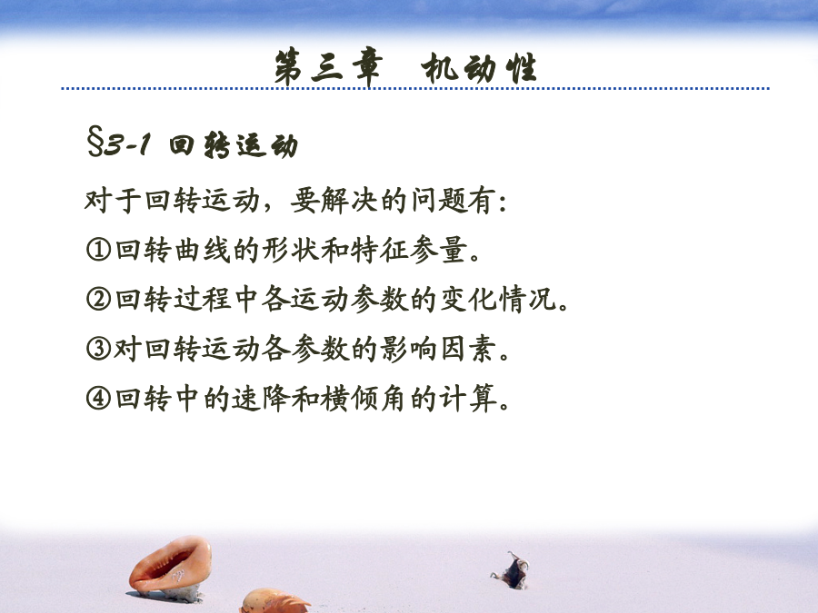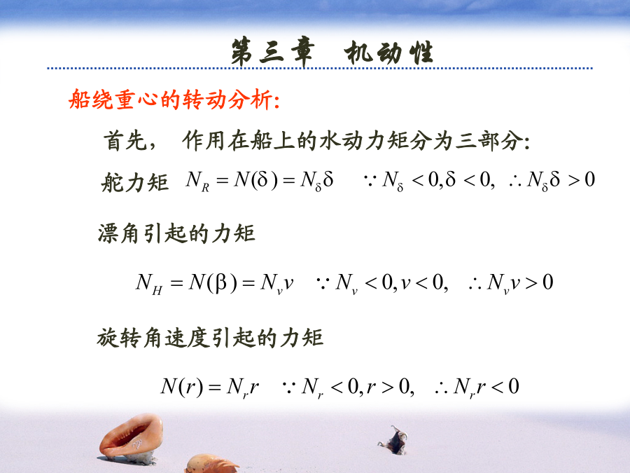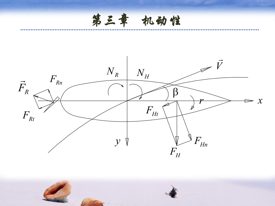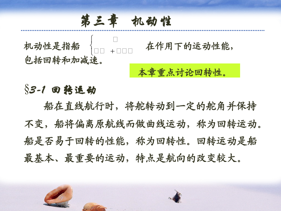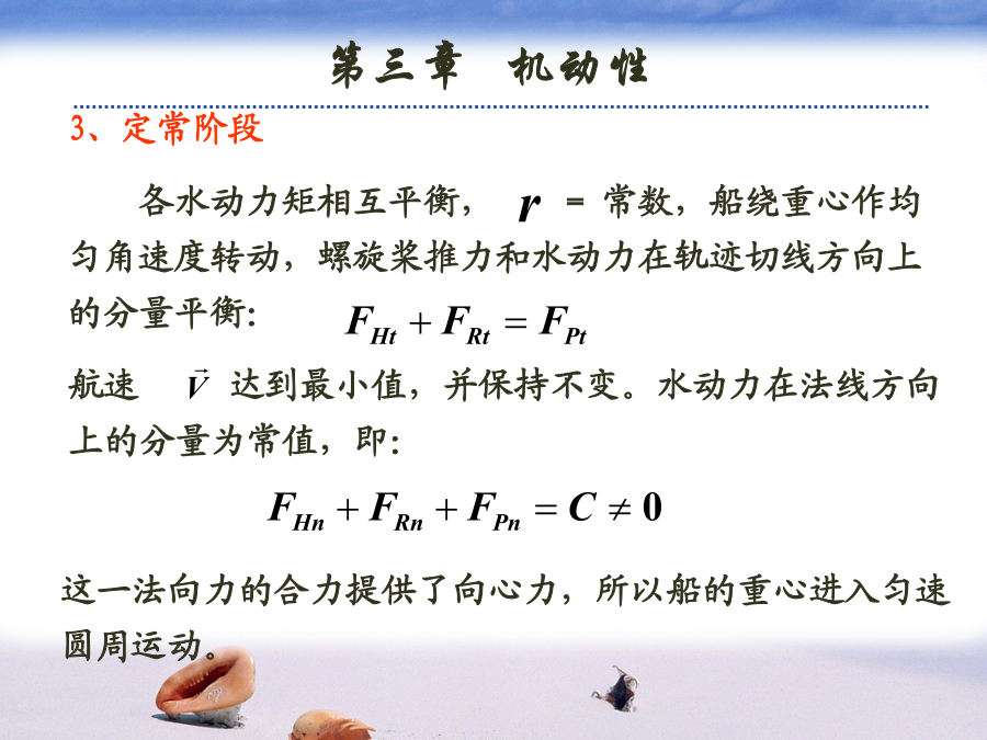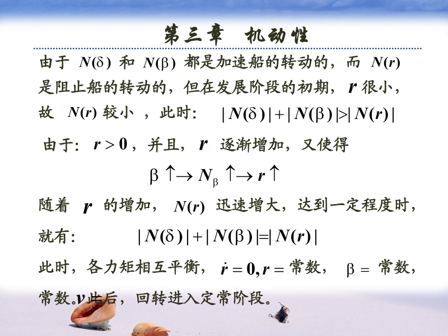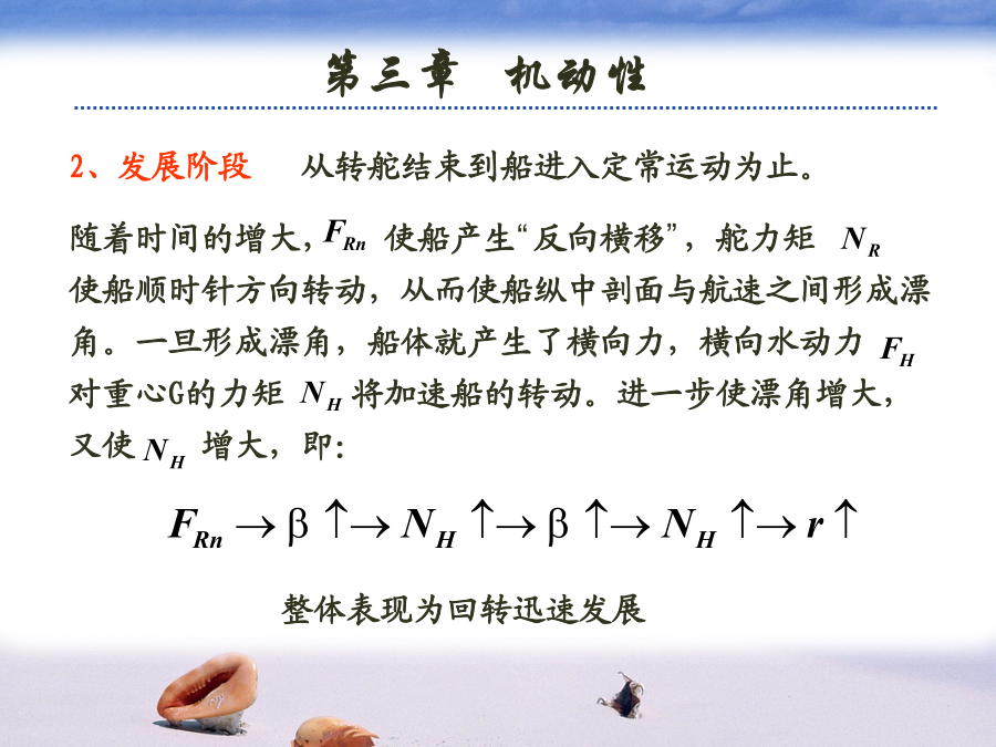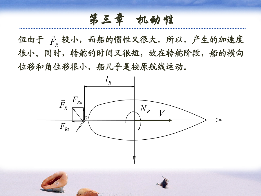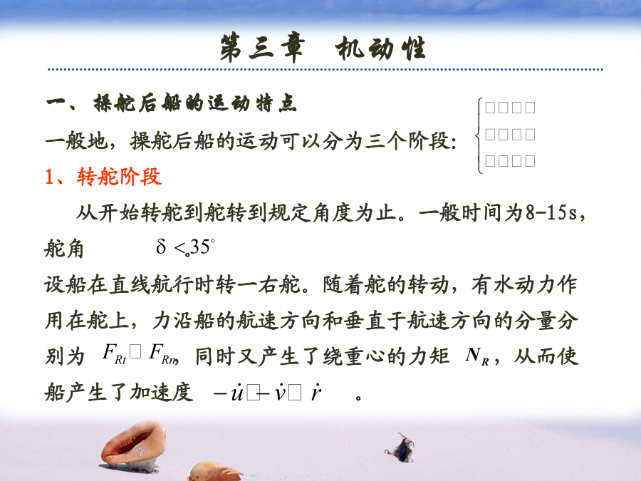 机动性是指船在作用下的运动性能,包括回转和加减速。§3-1回转运动对于回转运动,要解决的问题有:①回转曲线的形状和特征参量。②回转过程中各运动参数的变化情况。③对回转运动各参数的影响因素。④回转中的速降和横倾角的计算。一、操舵后船的运动特点一般地,操舵后船的运动可以分为三个阶段:1、转舵阶段从开始转舵到舵转到规定角度为止。一般时间为8-15s,舵角。设船在直线航行时转一右舵。随着舵的转动,有水动力作用在舵上,力沿船的航速方向和垂直于航速方向的分量分别为,同时又产生了绕重心的力矩,从而使船产生了加速度。2、发展阶段从转舵结束到船进入定常运动为止。随着时间的增大,使船产生“反向横移”,舵力矩使船顺时针方向转动,从而使船纵中剖面与航速之间形成漂角。一旦形成漂角,船体就产生了横向力,横向水动力对重心G的力矩将加速船的转动。进一步使漂角增大,又使增大,即:第三章机动性船重心的运动分析:首先,舵力和船体水动力沿船前进的方向上的分量使船的速度逐渐减少。另一方面,随着在轴上分量的增大,逐渐达到并超过在轴上分量,所以,船反向横移的加速度减少到0,然后改变方向,使船产生正向加速度,经过一段时间后,重心的位置将出现正向横移,加上桨的推动和船的转动,重心的轨迹就形成了一条变速的曲线,重心的运动就是变速曲线运动。船绕重心的转动分析:首先,作用在船上的水动力矩分为三部分:由于和都是加速船的转动的,而是阻止船的转动的,但在发展阶段的初期,很小,故较小,此时:3、定常阶段各水动力矩相互平衡,=常数,船绕重心作均匀角速度转动,螺旋桨推力和水动力在轨迹切线方向上的分量平衡:二、回转运动的主要特征参数:1、回转圈——为船在回转时其重心的运动轨迹。2、定常回转直径——定常回转圈的直径。通常以相对回转直径表示;对于军舰。4、纵距——自转舵开始至船首转到90°时,重心沿初始航线前进的距离。5、正横距——船首转到90°时,重心沿初始航线的距离。6、反横距——反向横移的最大距离。7、定常回转航速、漂角、横倾角、回转周期—自转舵起回转360°所用的时间。1、船型的影响:由二阶K-T方程知,对于定常回转运动有:结论:C大,则r小,回转直径DS大,回转性差,稳定性好;反之C小,则r大,回转直径DS小,回转性好;稳定性差。2、纵倾的影响:①艏纵倾相当于减小了尾部的投影面积,故可使DS减小,机动性变好、稳定性变差;②艉纵倾相当于增加了尾部的投影面积,故可使DS增大,机动性变差、稳定性变好。艏纵倾舵的作用是产生水动力,提供使船回转的力矩,此力矩大,则回转性好。为使舵产生足够的力矩,一般可采用以下方法:a.增加舵的面积b.合理选择舵的形状c.提高升力系数d.将舵置于桨的尾流中e.使舵远离转动中心航速的影响以来表示,经验表明:当Fr≤0.25时,航速对Ds无影响;当Fr>0.25时,由于航行中船体下沉、纵倾和兴波的影响,船的水动力发生变化,Ds随着Fr的增加而迅速增大。我国海军船体规范规定,对于军舰:为Fr≤0.25时的回转直径。5、横倾的影响:横倾→水动力系数改变,经验与计算表明横倾使Ds减少。船在稳定直航时,其阻力和推力平衡。操舵后船进入变速曲线运动。由于漂角和舵角的存在,船体中的阻力发生变化,流向螺旋桨的水流发生变化导致主机的工况发生变化,因而桨的推力也变化,导致船的航速发生变化,满舵回转时,航速要下降20%。由纵向操纵运动方程:定常回转时:将代入,有确定定常回转速度的经验公式:1、费尔索夫公式:确定定常回转速度的图谱方法五、船舶回转过程中的横倾现象回转时,作用在船体和舵上的水动力与重心不在同一高度,组成一横倾力矩而产生横倾。对于高速舰船,由于横倾有时很大,有倾覆的危险。以右舵为例:当船在水平面内转舵时,舵上水动力在船横剖面上的分量为,作用于舵面上的水动力中心(坐标原点取在船基线处)。力使船有向左的加速度,使船受到向右的流体惯性力,作用点的垂向高度为。由于在转舵阶段船的漂角和角速度皆很小,作用于船体上的粘性类水动力可以忽略。按达兰贝尔原理,在重心处再加上船体惯性力,方向向右。流体惯性力的作用点一般在高度中心线附近(或可以认为在浮心B附近)。故该力与对重心的力矩相反。但由于初始阶段较小,所以对重心的力矩是主以右舵为例:当船在水平面内转舵时,舵上水动力在船横剖面上的分量为,作用于舵面上的水动力中心(坐标原点取在船基线处)。力使船有向左的加速度,使船受到向右的流体惯性力,作用点的垂向高度为。由于在转舵阶段船的漂角和角速度皆很小,作用于船体上的粘性类水动力可以忽略。按达兰贝尔原理,在重心处再加上船体惯性力,方向向右。流体惯性力的作用点一般在高度中心线附近(或可以认为在浮心B附近)。故该力与对重心的力矩相反