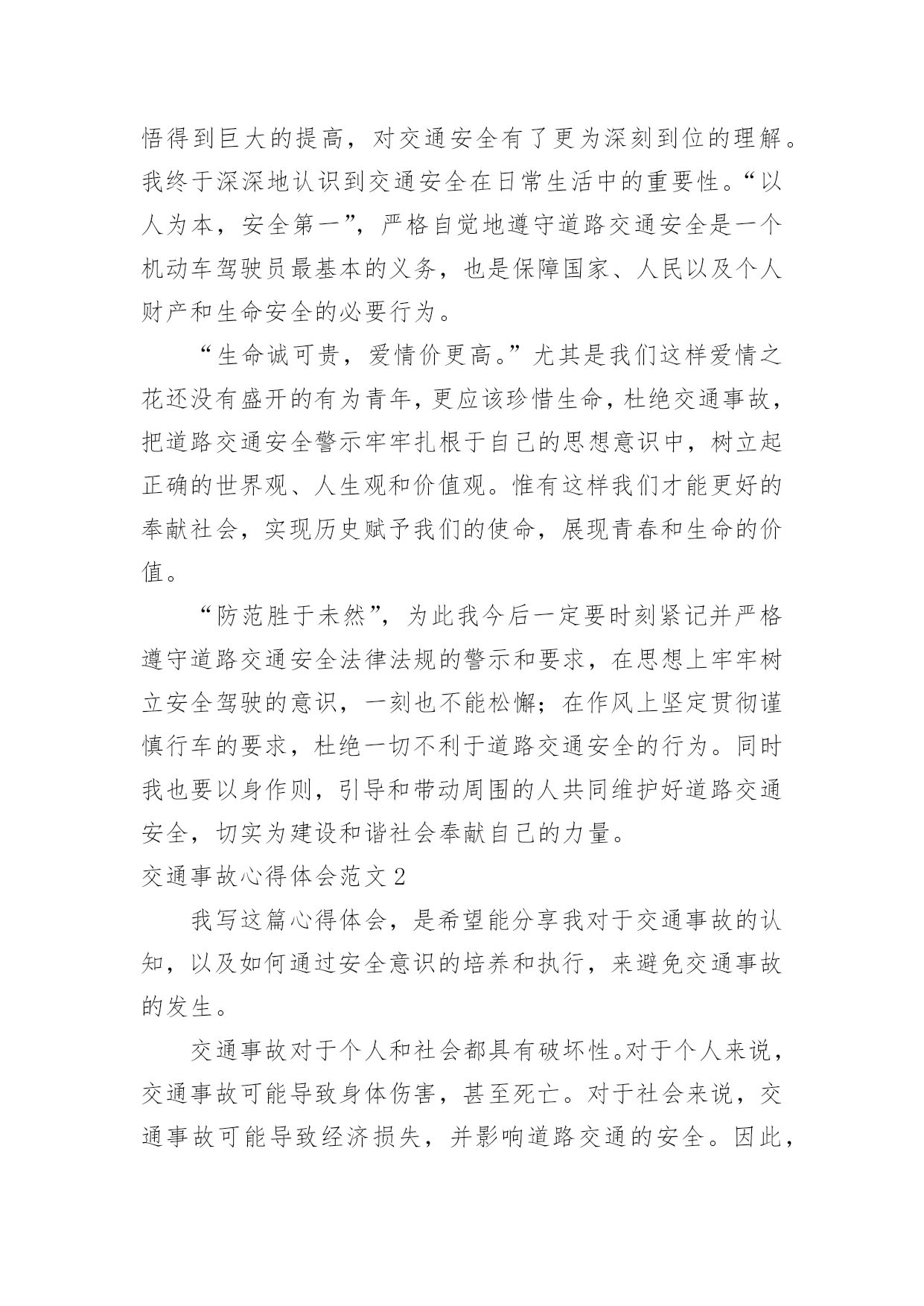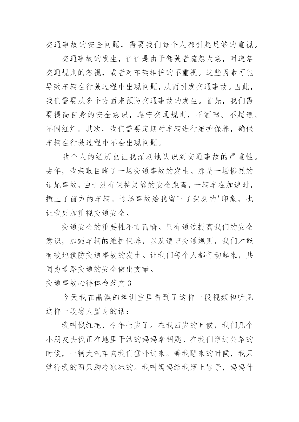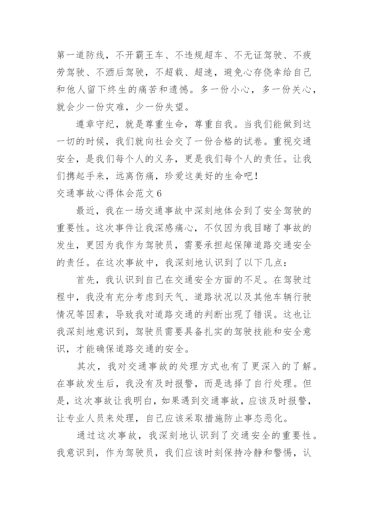 交通事故心得体会交通事故心得体会范文当在某些事情上我们有很深的体会时,可以将其记录在心得体会中,通过写心得体会,可以帮助我们总结积累经验。相信许多人会觉得心得体会很难写吧,以下是小编为大家整理的交通事故心得体会范文,仅供参考,希望能够帮助到大家。交通事故心得体会范文1通过参加华联驾校组织的道路交通安全警示教育课程的学习,我真切认识到“车祸猛于虎”的残酷事实。那一幕幕因人们忽视安全思想学习、违反道路交通安全法规而引发的交通事故场景令人触目惊心,车祸惨剧给国家和家庭造成无法弥补的重大损失。通过观看交通安全宣传片,我深刻体会到道路交通安全就存在于我们日常驾车过程的每一个细节里,稍有懈怠都会酿成恶果,发人深省。通过学习道路交通安全警示教育课程,我的思想意识觉悟得到很大的提高,对交通安全有了更为深刻到位的理解。学习驾驶机动车,首先学车要谦虚谨慎,不可急躁。其次,开车要集中精力,不要走神。第三,要多学习了解交通法规,驾车做到知法守法,“宁等三分,不抢一秒”。第四,全身心投入驾驶学习,刻苦练习,才能够更好的掌握驾驶技术,把车开好。通过道路交通安全警示教育课程学习,我深刻体会到遵守道路交通安全法在日常生活中的重要性。严格自觉地遵守道路交通规则、做到“以人为本,安全第一”,是一名合格的机动车驾驶员应尽的基本义务,也是保障国家、人民以及个人生命财产安全的必要行为。把道路交通安全警示牢牢扎根于自己的思想意识中,树立起正确的世界观、人生观和价值观,谨慎驾驶、安全行车,减少交通事故的发生,让汽车更好的为我们的生活服务。汽车的出现,不但方便了人们出行、运输,还成为社会结构中身份认同的一个不可或缺的元素。时至今日,不可否认汽车推动了人类文明的发展。随着汽车逐渐普及之后,汽车和我们的生活中越来越密不可分。一直以来,我都觉得自己不会那么倒霉,交通安全事故不会找上我,我稍微注意一点就行了。学习过程中繁文缛节般的道路交通安全法律法规不免让人心生倦意,但是学习了交通安全事故案例之后,一幕幕触目惊心的事件和惨不忍睹的苦果徘徊在我的脑海久久挥之不去。这些事故无一例外都是因为忽视思想作风建设、忽略道路交通安全而引发的,事故的后果给国家和人民的生命财产造成无法弥补的.重大损失。在学习道路交通安全警示的现场,我深刻体会到道路交通安全就存在于我们道路驾驶过程中的每一个细节里,稍有懈怠都有可能酿出恶果,毕竟“车祸猛于虎”。学习了道路交通安全警示教育课程后,我的思想意识觉悟得到巨大的提高,对交通安全有了更为深刻到位的理解。我终于深深地认识到交通安全在日常生活中的重要性。“以人为本,安全第一”,严格自觉地遵守道路交通安全是一个机动车驾驶员最基本的义务,也是保障国家、人民以及个人财产和生命安全的必要行为。“生命诚可贵,爱情价更高。”尤其是我们这样爱情之花还没有盛开的有为青年,更应该珍惜生命,杜绝交通事故,把道路交通安全警示牢牢扎根于自己的思想意识中,树立起正确的世界观、人生观和价值观。惟有这样我们才能更好的奉献社会,实现历史赋予我们的使命,展现青春和生命的价值。“防范胜于未然”,为此我今后一定要时刻紧记并严格遵守道路交通安全法律法规的警示和要求,在思想上牢牢树立安全驾驶的意识,一刻也不能松懈;在作风上坚定贯彻谨慎行车的要求,杜绝一切不利于道路交通安全的行为。同时我也要以身作则,引导和带动周围的人共同维护好道路交通安全,切实为建设和谐社会奉献自己的力量。交通事故心得体会范文2我写这篇心得体会,是希望能分享我对于交通事故的认知,以及如何通过安全意识的培养和执行,来避免交通事故的发生。交通事故对于个人和社会都具有破坏性。对于个人来说,交通事故可能导致身体伤害,甚至死亡。对于社会来说,交通事故可能导致经济损失,并影响道路交通的安全。因此,交通事故的安全问题,需要我们每个人都引起足够的重视。交通事故的发生,往往是由于驾驶者疏忽大意,对道路交通规则的忽视,或者对车辆维护的不重视。这些因素可能导致车辆在行驶过程中出现问题,从而引发交通事故。因此,我们需要从多个方面来预防交通事故的发生。首先,我们需要提高自身的安全意识,遵守交通规则,不酒驾、不超速、不闯红灯。其次,我们需要定期对车辆进行维护保养,确保车辆在行驶过程中不会出现问题。我个人的经历也让我深刻地认识到交通事故的严重性。去年,我亲眼目睹了一场交通事故的发生。那是一场惨烈的追尾事故,由于没有保持足够的安全距离,一辆车在加速时,撞上了前方的车辆。这场事故给我留下了深刻的'印象,也让我更加重视交通安全。交通安全的重要性不言而喻。只有通过提高我们的安全意识,加强车辆的维护保养,以及遵守交通规则,我们才能有效地预防交通事故的发生。让我们每个人都行动起来,共同为道路交通的安全做出贡献。交通事故心得体会范文3今天我在晶澳的培训室里看到了这样一段视频和听见