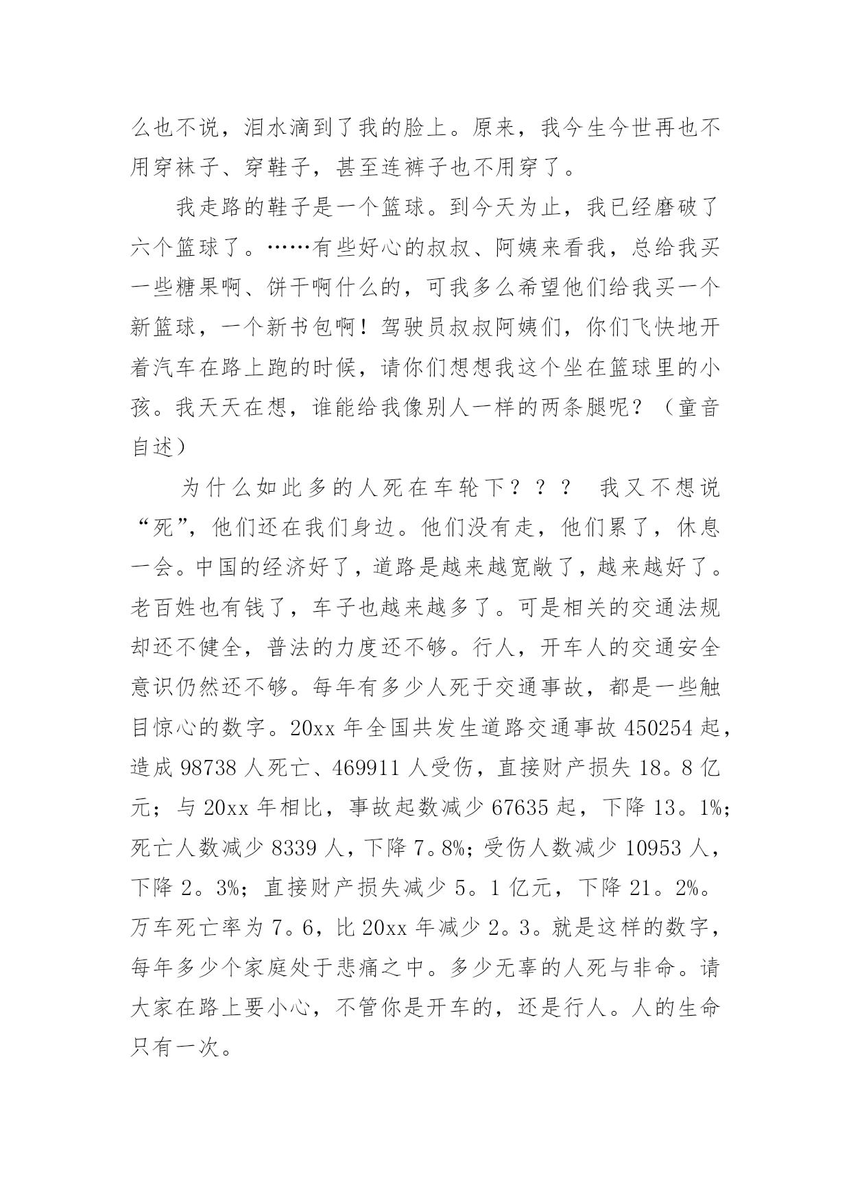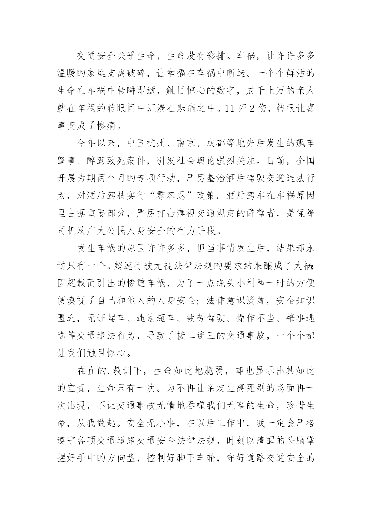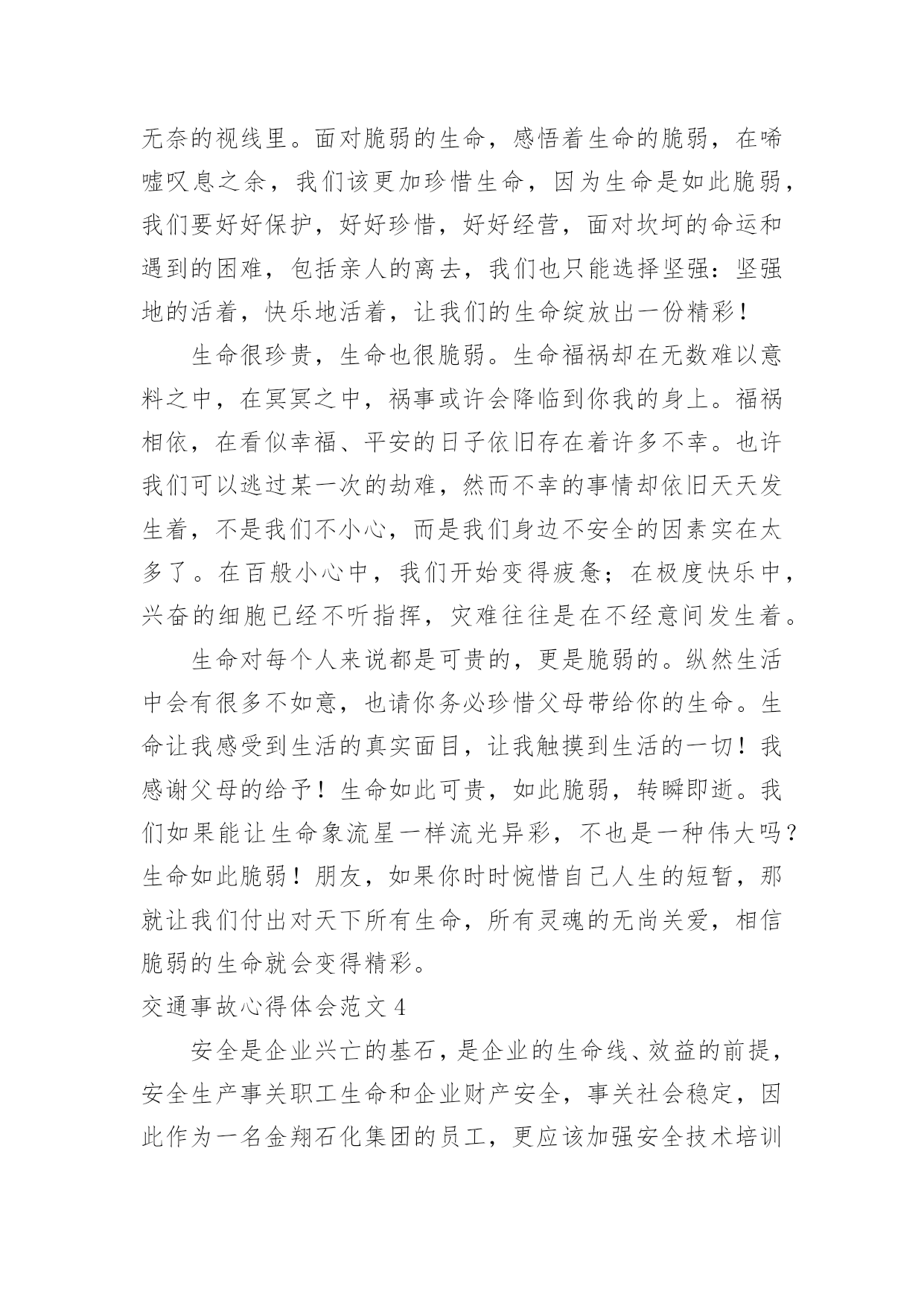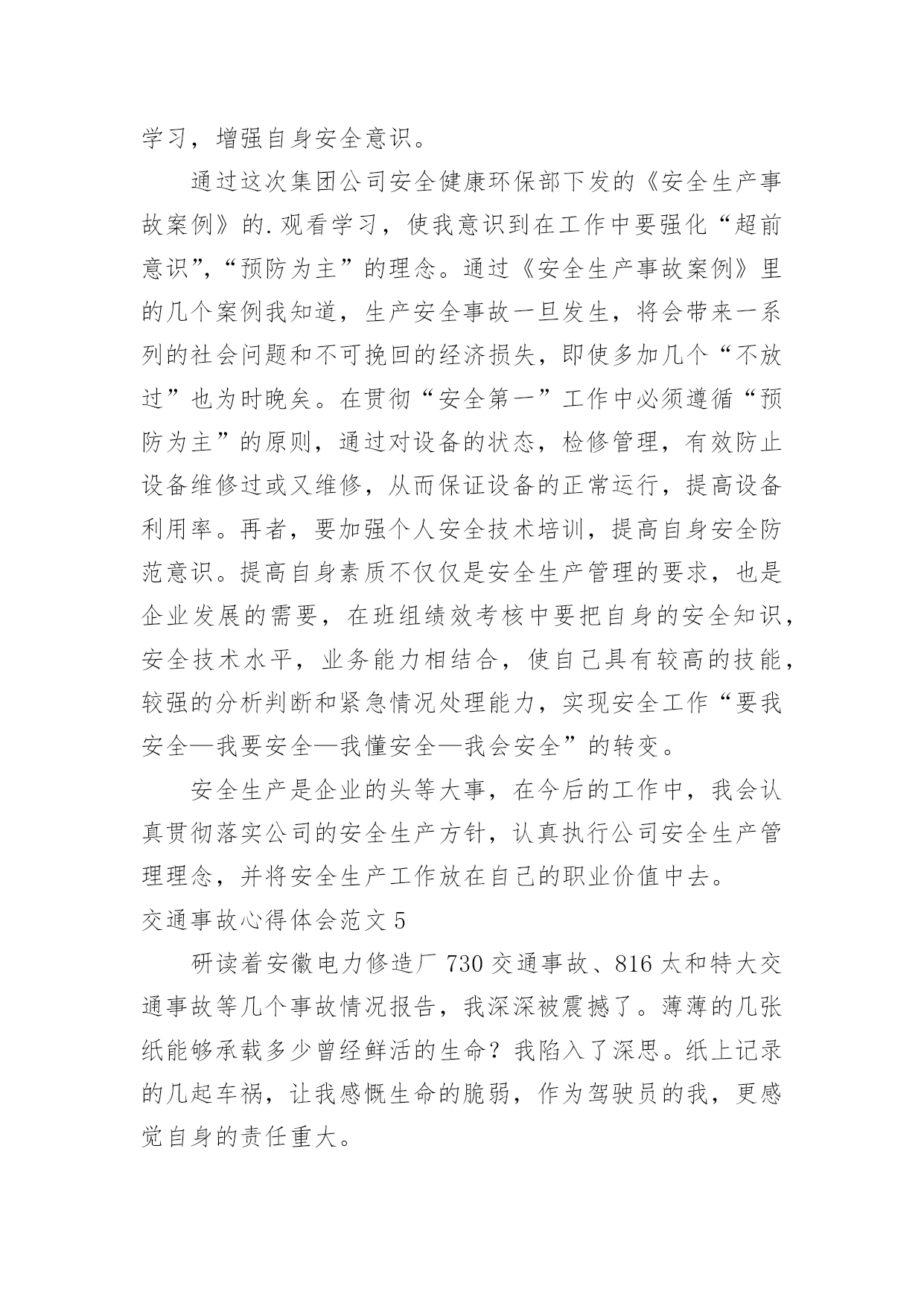 交通事故心得体会交通事故心得体会范文当在某些事情上我们有很深的体会时,可以将其记录在心得体会中,通过写心得体会,可以帮助我们总结积累经验。相信许多人会觉得心得体会很难写吧,以下是小编为大家整理的交通事故心得体会范文,仅供参考,希望能够帮助到大家。交通事故心得体会范文1通过参加华联驾校组织的道路交通安全警示教育课程的学习,我真切认识到“车祸猛于虎”的残酷事实。那一幕幕因人们忽视安全思想学习、违反道路交通安全法规而引发的交通事故场景令人触目惊心,车祸惨剧给国家和家庭造成无法弥补的重大损失。通过观看交通安全宣传片,我深刻体会到道路交通安全就存在于我们日常驾车过程的每一个细节里,稍有懈怠都会酿成恶果,发人深省。通过学习道路交通安全警示教育课程,我的思想意识觉悟得到很大的提高,对交通安全有了更为深刻到位的理解。学习驾驶机动车,首先学车要谦虚谨慎,不可急躁。其次,开车要集中精力,不要走神。第三,要多学习了解交通法规,驾车做到知法守法,“宁等三分,不抢一秒”。第四,全身心投入驾驶学习,刻苦练习,才能够更好的掌握驾驶技术,把车开好。通过道路交通安全警示教育课程学习,我深刻体会到遵守道路交通安全法在日常生活中的重要性。严格自觉地遵守道路交通规则、做到“以人为本,安全第一”,是一名合格的机动车驾驶员应尽的基本义务,也是保障国家、人民以及个人生命财产安全的必要行为。把道路交通安全警示牢牢扎根于自己的思想意识中,树立起正确的世界观、人生观和价值观,谨慎驾驶、安全行车,减少交通事故的发生,让汽车更好的为我们的生活服务。汽车的出现,不但方便了人们出行、运输,还成为社会结构中身份认同的一个不可或缺的元素。时至今日,不可否认汽车推动了人类文明的发展。随着汽车逐渐普及之后,汽车和我们的生活中越来越密不可分。一直以来,我都觉得自己不会那么倒霉,交通安全事故不会找上我,我稍微注意一点就行了。学习过程中繁文缛节般的道路交通安全法律法规不免让人心生倦意,但是学习了交通安全事故案例之后,一幕幕触目惊心的事件和惨不忍睹的苦果徘徊在我的脑海久久挥之不去。这些事故无一例外都是因为忽视思想作风建设、忽略道路交通安全而引发的,事故的后果给国家和人民的生命财产造成无法弥补的.重大损失。在学习道路交通安全警示的现场,我深刻体会到道路交通安全就存在于我们道路驾驶过程中的每一个细节里,稍有懈怠都有可能酿出恶果,毕竟“车祸猛于虎”。学习了道路交通安全警示教育课程后,我的思想意识觉悟得到巨大的提高,对交通安全有了更为深刻到位的理解。我终于深深地认识到交通安全在日常生活中的重要性。“以人为本,安全第一”,严格自觉地遵守道路交通安全是一个机动车驾驶员最基本的义务,也是保障国家、人民以及个人财产和生命安全的必要行为。“生命诚可贵,爱情价更高。”尤其是我们这样爱情之花还没有盛开的有为青年,更应该珍惜生命,杜绝交通事故,把道路交通安全警示牢牢扎根于自己的思想意识中,树立起正确的世界观、人生观和价值观。惟有这样我们才能更好的奉献社会,实现历史赋予我们的使命,展现青春和生命的价值。“防范胜于未然”,为此我今后一定要时刻紧记并严格遵守道路交通安全法律法规的警示和要求,在思想上牢牢树立安全驾驶的意识,一刻也不能松懈;在作风上坚定贯彻谨慎行车的要求,杜绝一切不利于道路交通安全的行为。同时我也要以身作则,引导和带动周围的人共同维护好道路交通安全,切实为建设和谐社会奉献自己的力量。交通事故心得体会范文2我写这篇心得体会,是希望能分享我对于交通事故的认知,以及如何通过安全意识的培养和执行,来避免交通事故的发生。交通事故对于个人和社会都具有破坏性。对于个人来说,交通事故可能导致身体伤害,甚至死亡。对于社会来说,交通事故可能导致经济损失,并影响道路交通的安全。因此,交通事故的安全问题,需要我们每个人都引起足够的重视。交通事故的发生,往往是由于驾驶者疏忽大意,对道路交通规则的忽视,或者对车辆维护的不重视。这些因素可能导致车辆在行驶过程中出现问题,从而引发交通事故。因此,我们需要从多个方面来预防交通事故的发生。首先,我们需要提高自身的安全意识,遵守交通规则,不酒驾、不超速、不闯红灯。其次,我们需要定期对车辆进行维护保养,确保车辆在行驶过程中不会出现问题。我个人的经历也让我深刻地认识到交通事故的严重性。去年,我亲眼目睹了一场交通事故的发生。那是一场惨烈的追尾事故,由于没有保持足够的安全距离,一辆车在加速时,撞上了前方的车辆。这场事故给我留下了深刻的'印象,也让我更加重视交通安全。交通安全的重要性不言而喻。只有通过提高我们的安全意识,加强车辆的维护保养,以及遵守交通规则,我们才能有效地预防交通事故的发生。让我们每个人都行动起来,共同为道路交通的安全做出贡献。交通事故心得体会范文3今天我在晶澳的培训室里看到了这样一段视频和听见