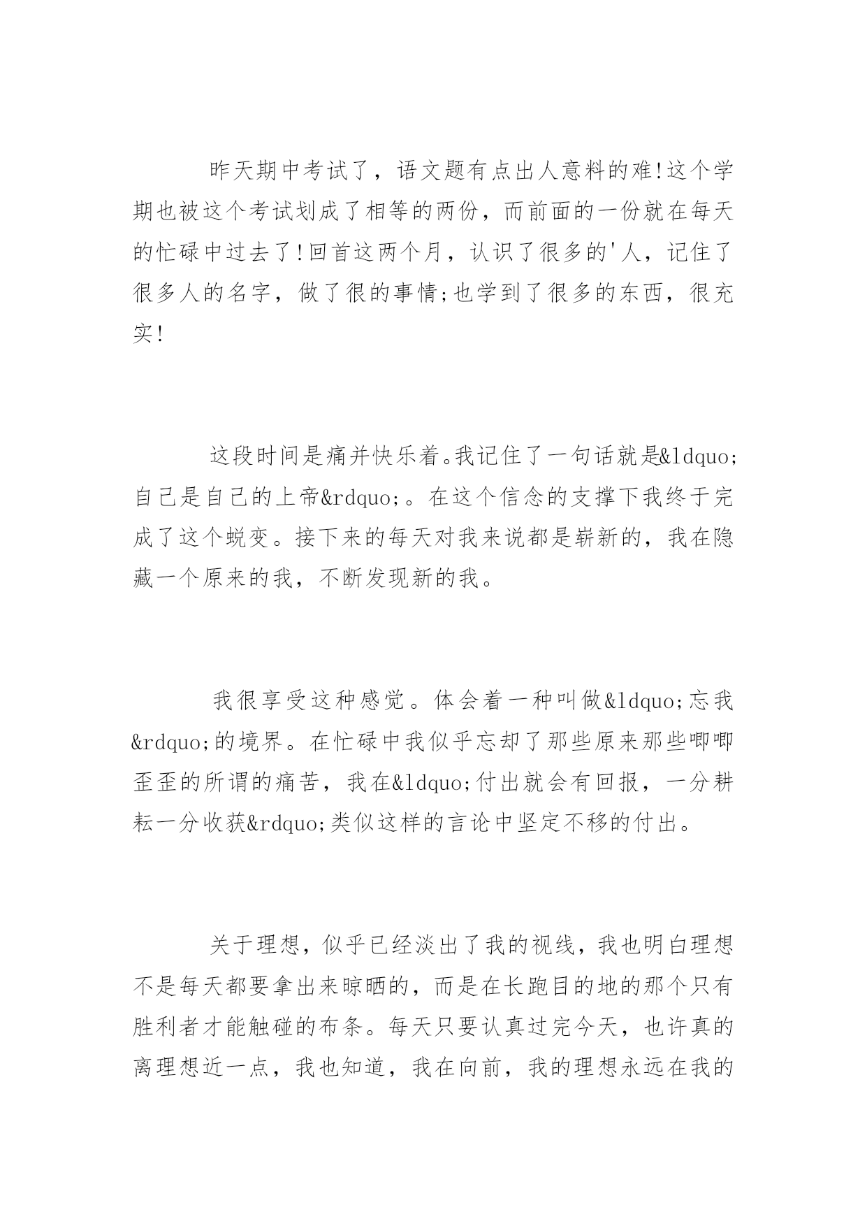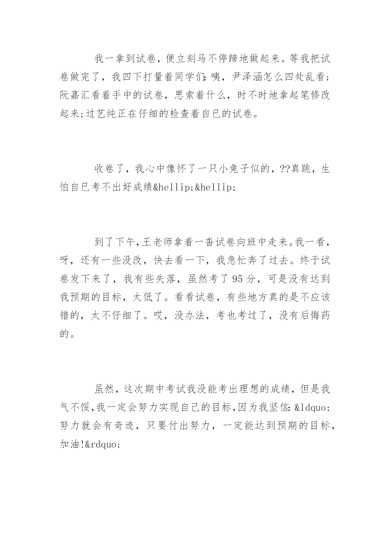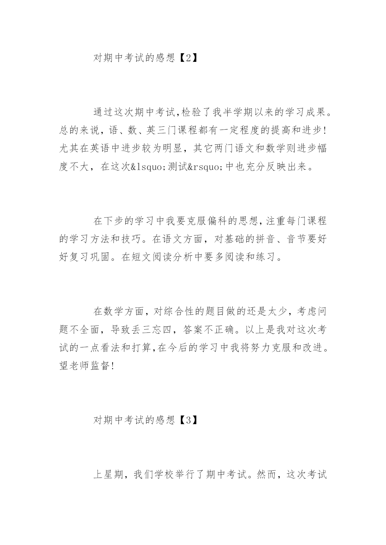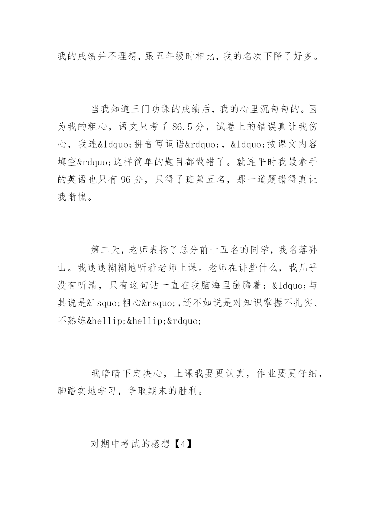 对期中考试的感想对期中考试的感想期中考试是为了检验了同学们半学期以来的学习成果,对于已经结束的考试,同学们有什么感想呢?下面是小编给大家准备的对期中考试的感想,一起来看看吧!对期中考试的感想【1】期中考试,期中考试,可真烦哪,考了语文,还得考数学。考试,顾名思义,就是考验你的测试。考得好了,父母表扬,同学称赞,老师夸奖,那种感觉,实在是洋洋得意;可要是考不好呢,泪水会蹭着你的脸,不停地哀求你让我掉下来吧。“要考试了,要考试了!”一阵阵紧张的声音从教室中传出来了。语文考试,关键是作文呀,只好写得好,分数自然也会高点。开考了!我一拿到试卷,便立刻马不停蹄地做起来。等我把试卷做完了,我四下打量着同学们:咦,尹泽涵怎么四处乱看;阮嘉汇看着手中的试卷,思索着什么,时不时地拿起笔修改起来;过艺纯正在仔细的检查着自已的试卷。收卷了,我心中像怀了一只小兔子似的,??真跳,生怕自已考不出好成绩……到了下午,王老师拿着一沓试卷向班中走来。我一看,呀,还有一些没改,快去看一下,我急忙奔了过去。终于试卷发下来了,我有些失落,虽然考了95分,可是没有达到我预期的目标,太低了。看看试卷,有些地方真的是不应该错的,太不仔细了。哎,没办法,考也考过了,没有后悔药的。虽然,这次期中考试我没能考出理想的成绩,但是我气不馁,我一定会努力实现自己的目标,因为我坚信:“努力就会有奇迹,只要付出努力,一定能达到预期的目标,加油!”对期中考试的感想【2】通过这次期中考试,检验了我半学期以来的学习成果。总的来说,语、数、英三门课程都有一定程度的提高和进步!尤其在英语中进步较为明显,其它两门语文和数学则进步幅度不大,在这次‘测试’中也充分反映出来。在下步的学习中我要克服偏科的思想,注重每门课程的学习方法和技巧。在语文方面,对基础的拼音、音节要好好复习巩固。在短文阅读分析中要多阅读和练习。在数学方面,对综合性的题目做的还是太少,考虑问题不全面,导致丢三忘四,答案不正确。以上是我对这次考试的一点看法和打算,在今后的学习中我将努力克服和改进。望老师监督!对期中考试的感想【3】上星期,我们学校举行了期中考试。然而,这次考试我的成绩并不理想,跟五年级时相比,我的名次下降了好多。当我知道三门功课的成绩后,我的心里沉甸甸的。因为我的粗心,语文只考了86.5分,试卷上的错误真让我伤心,我连“拼音写词语”,“按课文内容填空”这样简单的题目都做错了。就连平时我最拿手的英语也只有96分,只得了班第五名,那一道题错得真让我惭愧。第二天,老师表扬了总分前十五名的同学,我名落孙山。我迷迷糊糊地听着老师上课。老师在讲些什么,我几乎没有听清,只有这句话一直在我脑海里翻腾着:“与其说是‘粗心’,还不如说是对知识掌握不扎实、不熟练……”我暗暗下定决心,上课我要更认真,作业要更仔细,脚踏实地学习,争取期末的胜利。对期中考试的感想【4】昨天期中考试了,语文题有点出人意料的难!这个学期也被这个考试划成了相等的两份,而前面的一份就在每天的忙碌中过去了!回首这两个月,认识了很多的'人,记住了很多人的名字,做了很的事情;也学到了很多的东西,很充实!这段时间是痛并快乐着。我记住了一句话就是“自己是自己的上帝”。在这个信念的支撑下我终于完成了这个蜕变。接下来的每天对我来说都是崭新的,我在隐藏一个原来的我,不断发现新的我。我很享受这种感觉。体会着一种叫做“忘我”的境界。在忙碌中我似乎忘却了那些原来那些唧唧歪歪的所谓的痛苦,我在“付出就会有回报,一分耕耘一分收获”类似这样的言论中坚定不移的付出。关于理想,似乎已经淡出了我的视线,我也明白理想不是每天都要拿出来晾晒的,而是在长跑目的地的那个只有胜利者才能触碰的布条。每天只要认真过完今天,也许真的离理想近一点,我也知道,我在向前,我的理想永远在我的前方。我似乎健康起来了,在我的头脑里没有抱怨,攀比,嫉妒,甚至羡慕!已经不在乎原来看似很严重的,甚至很重要的事情。我只想让我自己不断的提高在这个过程中享受一种内心的安静与平和,就很好了!