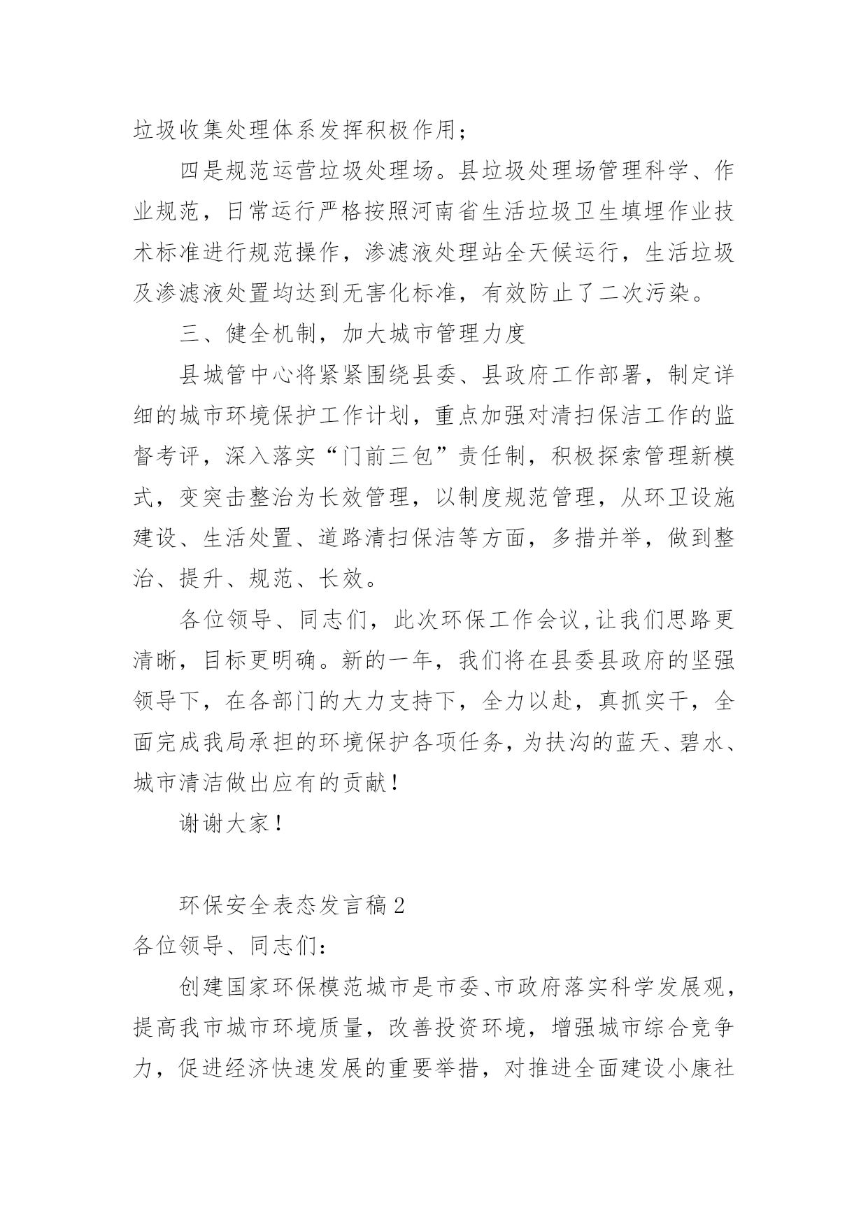 环保安全表态发言稿环保表态发言稿范文在不断进步的社会中,发言稿的使用频率越来越高,发言稿具有观点鲜明,内容具有鼓动性的特点。写起发言稿来就毫无头绪?下面是小编整理的环保表态发言稿范文,欢迎阅读,希望大家能够喜欢。环保安全表态发言稿1尊敬的各位领导、同志们:加强环境保护工作,城管部门责无旁贷,义不容辞。县城市管理服务中心将积极响应县委、县政府号召,以这次会议为契机,以城市管理工作为抓手,认真履职尽责,狠抓任务落实,扎实做好环境保护各项工作。一、强化宣传,营造良好氛围县城管中心将紧密结合自身职能,围绕县委、县政府要求,将宣传教育放在首要位置,努力营造“环境保护靠大家”的良好氛围。我们将全局发动,全员参与,坚持从自身做起,从现在做起,从身边做起,加强全局干部职工思想教育,争做环境保护工作的先行者、践行者、落实者;集中进行宣传,通过设置公益广告栏,张贴文明标语,发放致广大市民的`一封信等形式,大力开展环保知识宣传活动,营造环境保护的浓厚氛围,引导广大市民群众爱护环境,保护环境。二、多措并举,促进环境保护一是全力抓好城区环境卫生整治工作。加强道路扬尘污染防治,深入推进卫生清扫保洁全覆盖,改进清扫方式,在全城规划范围内,按照清扫面积及实际工作量大小,划分不同的清扫保洁片区,实行定路段、定人员、定职责的管理方式,坚持道路一天两扫,全天保洁,主要干道坚持一天两扫水,减少因道路清扫产生的二次污染;同时加大道路巡查力度,规范治理焚烧垃圾等污染环境行为,出动铲车、垃圾运输车对城乡结合部、城中村、背街小巷等的卫生死角进行集中清理,确保城区环境改善落到实处。二是加强公厕管理。加大对城区22座公厕的管理力度,确保每个公厕都有专人管理,负责公厕室内外环境卫生,保障公厕按时对外开放,及时清除污物、积水、消除蚊蝇孳生地,全面提升公厕管理水平。三是进一步提高垃圾收运能力。20xx年,我局将紧紧围绕城市生活垃圾收运系统工程,明确责任,优化方案,全力组织实施,力争今年六月27座垃圾中转站全部完工并投入使用,使我县城市生活垃圾日收运能力提高至320吨,同时,我们将科学调度、合理安排垃圾清运线路,重要路段,敏感路段先清先运,确保城区生活垃圾日产日清,垃圾清运率达100%,生活垃圾收集运输和转运全部实现密闭化,防止洒漏等二次污染;另外,我局将加强沟通,强化责任,确保9座建制镇垃圾中转站和5个建制乡压缩式垃圾收集车正常运转,进一步改善农村环境卫生整体状态,提升城乡生活垃圾无害化处理水平,为“户集、乡收、县运、县处理”的农村生活垃圾收集处理体系发挥积极作用;四是规范运营垃圾处理场。县垃圾处理场管理科学、作业规范,日常运行严格按照河南省生活垃圾卫生填埋作业技术标准进行规范操作,渗滤液处理站全天候运行,生活垃圾及渗滤液处置均达到无害化标准,有效防止了二次污染。三、健全机制,加大城市管理力度县城管中心将紧紧围绕县委、县政府工作部署,制定详细的城市环境保护工作计划,重点加强对清扫保洁工作的监督考评,深入落实“门前三包”责任制,积极探索管理新模式,变突击整治为长效管理,以制度规范管理,从环卫设施建设、生活处置、道路清扫保洁等方面,多措并举,做到整治、提升、规范、长效。各位领导、同志们,此次环保工作会议,让我们思路更清晰,目标更明确。新的一年,我们将在县委县政府的坚强领导下,在各部门的大力支持下,全力以赴,真抓实干,全面完成我局承担的环境保护各项任务,为扶沟的蓝天、碧水、城市清洁做出应有的贡献!谢谢大家!环保安全表态发言稿2各位领导、同志们:创建国家环保模范城市是市委、市政府落实科学发展观,提高我市城市环境质量,改善投资环境,增强城市综合竞争力,促进经济快速发展的重要举措,对推进全面建设小康社会,构建和谐兴化具有极其重要的意义。自去年全市“五城同创”动员大会以来,在市委、市政府统一领导下,在市“五城同创”总指挥部及创建国家环保模范城市指挥部的工作指导下,我局紧紧围绕环保城市创建目标,不断加大工作力度,深入推进城市生态环保建设,城市人居环境和综合环境质量不断优化。一是大力开展了城市绿化建设,加强了城郊结合部环境整治和绿化配套,全面推进了城市公共绿地、单位绿地和居住区绿地建设,XX年,全市新增绿化面积达87.91万平方米。二是切实加快了污水处理厂建设。污水处理厂土建及部分收集管网已完成,今年内投产运行。三是切实加大了城市供水管理力度,集中开展了城市水环境整治,深入推进城市集中式饮用水水源地保护,加强城市一水厂、二水厂水源保护区的管理,确保了全市人民群众饮用水安全。今年是创建国家环保模范城市第二年,做好今年的'环保城市创建工作,具有重大的现实意义。作为城乡建设职能部门,我们将在市委、市政府及市“五城同创”总指挥部正确领导下,以城市生态绿化建设为先导,以城市住宅小区环境整治和建筑施工场所规范
