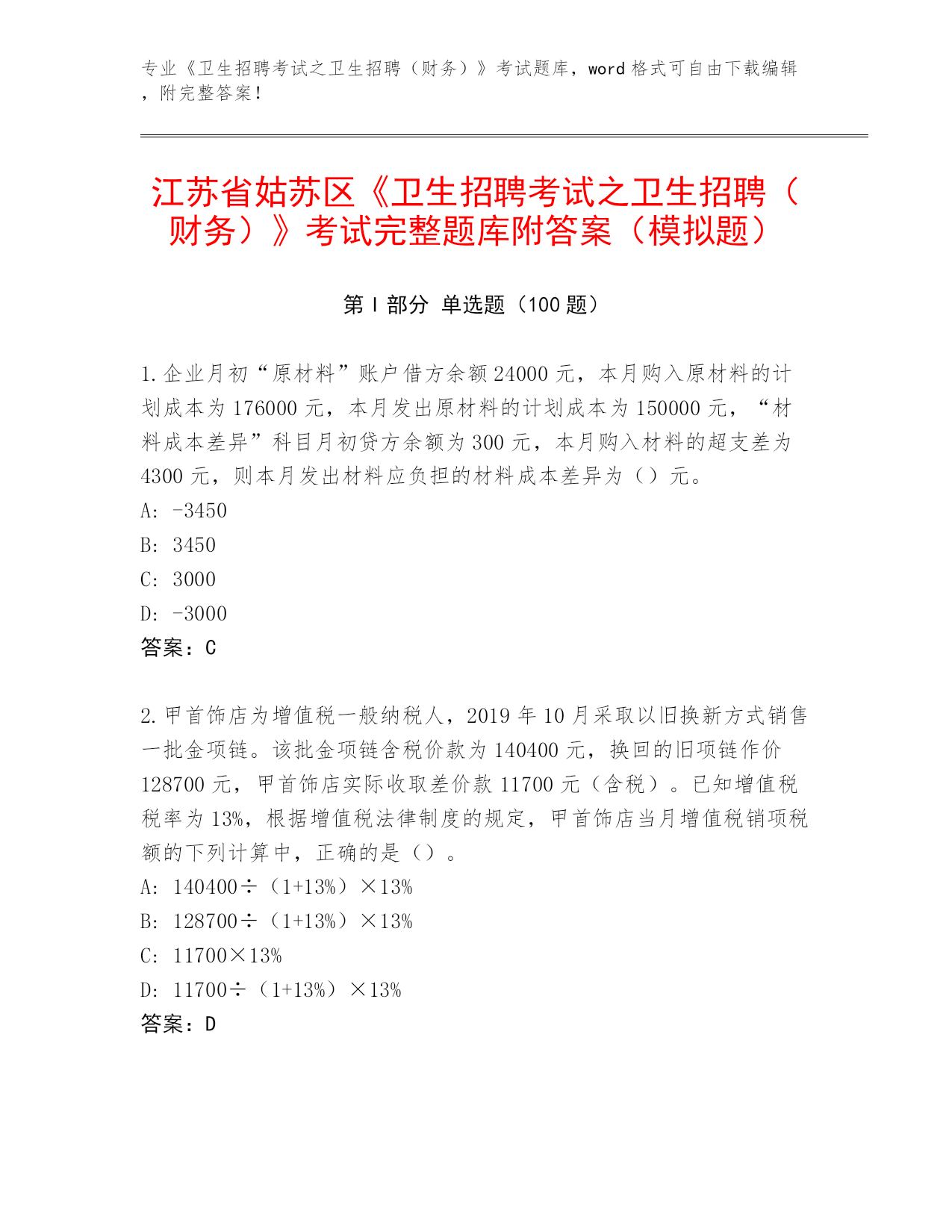 江苏省姑苏区《卫生招聘考试之卫生招聘(财务)》考试完整题库附答案(模拟题)
