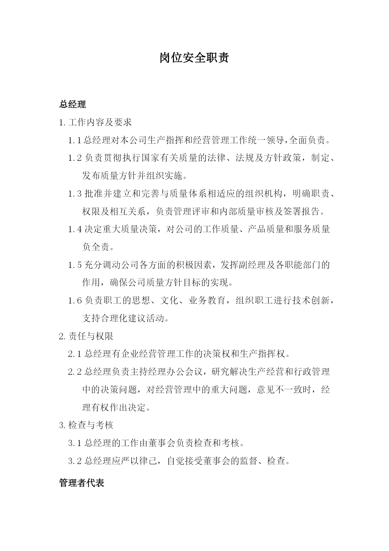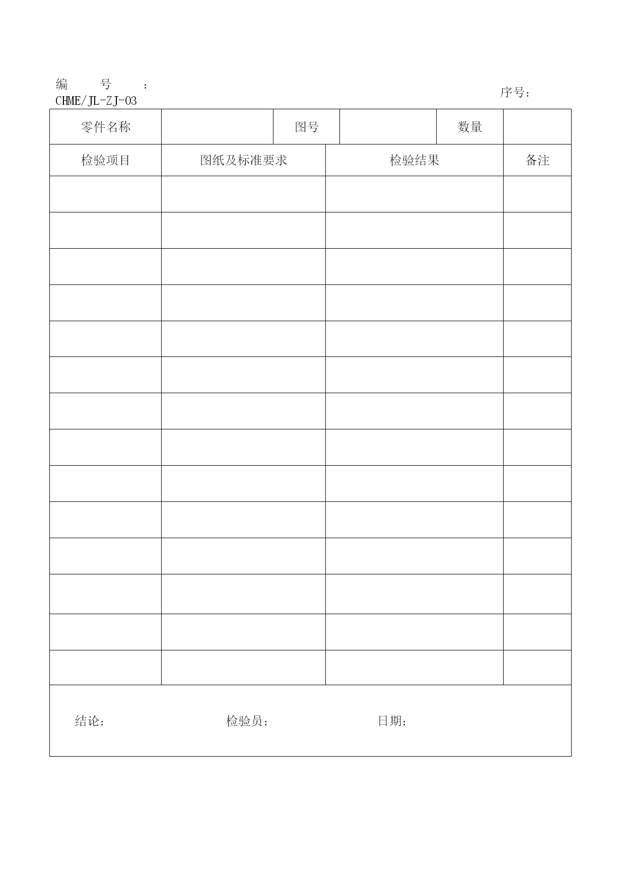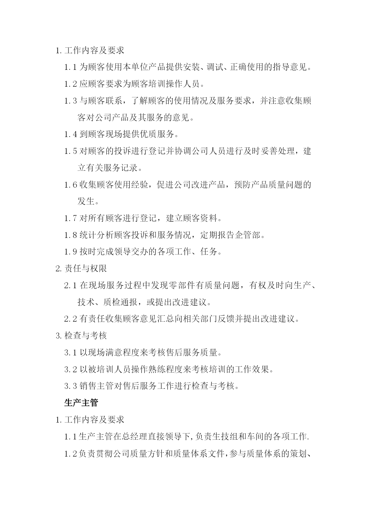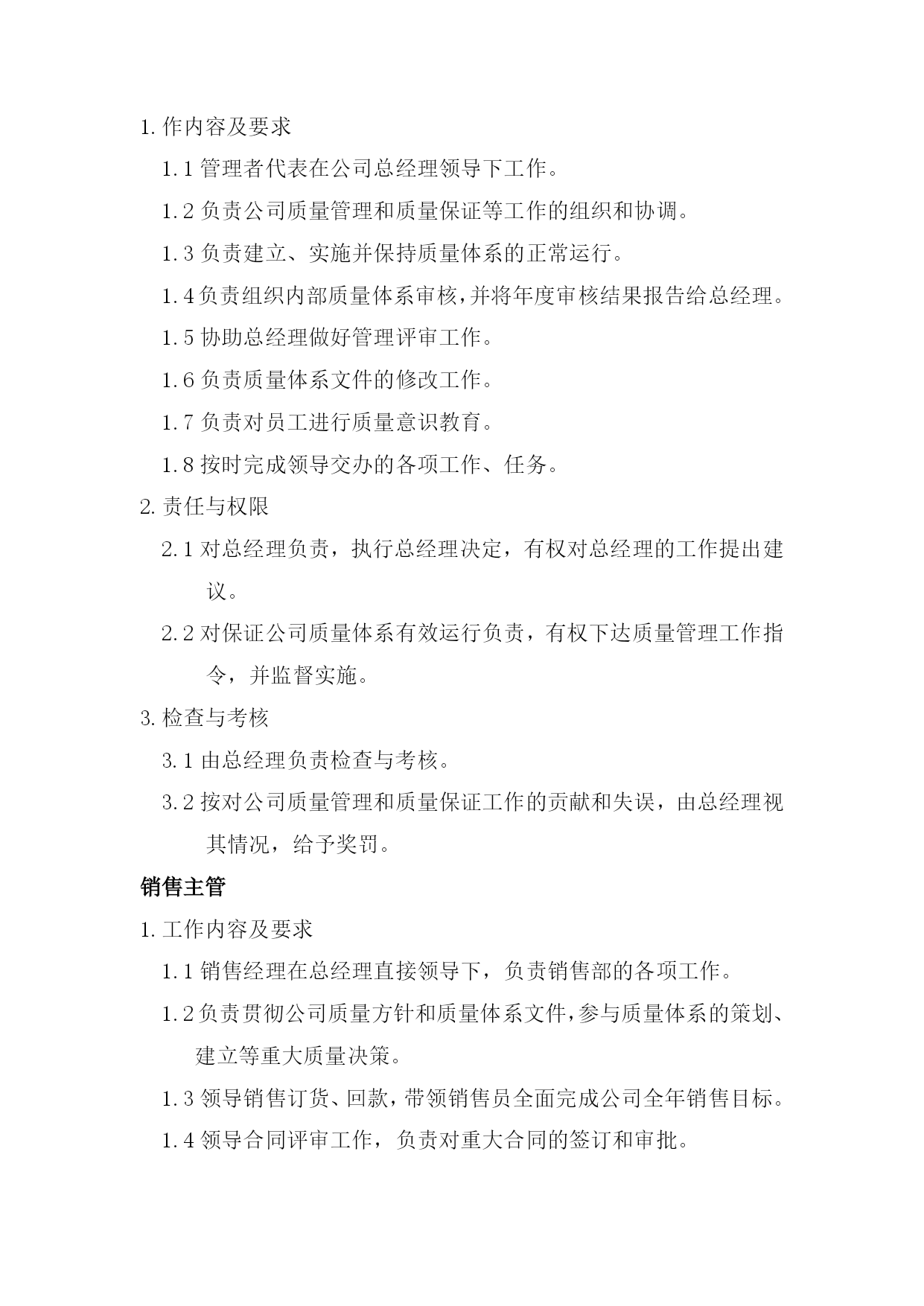 机械加工检验记录表最新文档(可以直接使用,可编辑最新文档,欢迎下载)机加工检验记录表编号:CHME/JL-ZJ-03序号:零件名称图号数量检验项目图纸及标准要求检验结果备注结论:检验员:日期:岗位安全职责总经理1.工作内容及要求1.1总经理对本公司生产指挥和经营管理工作统一领导,全面负责。1.2负责贯彻执行国家有关质量的法律、法规及方针政策,制定、发布质量方针并组织实施。1.3批准并建立和完善与质量体系相适应的组织机构,明确职责、权限及相互关系,负责管理评审和内部质量审核及签署报告。1.4决定重大质量决策,对公司的工作质量、产品质量和服务质量负全责。1.5充分调动公司各方面的积极因素,发挥副经理及各职能部门的作用,确保公司质量方针目标的实现。1.6负责职工的思想、文化、业务教育,组织职工进行技术创新,支持合理化建议活动。2.责任与权限2.1总经理有企业经营管理工作的决策权和生产指挥权。2.2总经理负责主持经理办公会议,研究解决生产经营和行政管理中的决策问题,对经营管理中的重大问题,意见不一致时,经理有权作出决定。3.检查与考核3.1总经理的工作由董事会负责检查和考核。3.2总经理应严以律己,自觉接受董事会的监督、检查。管理者代表1.作内容及要求1.1管理者代表在公司总经理领导下工作。1.2负责公司质量管理和质量保证等工作的组织和协调。1.3负责建立、实施并保持质量体系的正常运行。1.4负责组织内部质量体系审核,并将年度审核结果报告给总经理。1.5协助总经理做好管理评审工作。1.6负责质量体系文件的修改工作。1.7负责对员工进行质量意识教育。1.8按时完成领导交办的各项工作、任务。2.责任与权限2.1对总经理负责,执行总经理决定,有权对总经理的工作提出建议。2.2对保证公司质量体系有效运行负责,有权下达质量管理工作指令,并监督实施。3.检查与考核3.1由总经理负责检查与考核。3.2按对公司质量管理和质量保证工作的贡献和失误,由总经理视其情况,给予奖罚。销售主管1.工作内容及要求1.1销售经理在总经理直接领导下,负责销售部的各项工作。1.2负责贯彻公司质量方针和质量体系文件,参与质量体系的策划、建立等重大质量决策。1.3领导销售订货、回款,带领销售员全面完成公司全年销售目标。1.4领导合同评审工作,负责对重大合同的签订和审批。1.5负责产品售后服务工作,随时掌握顾客信息,建立顾客服务档案。1.6积极开拓市场,掌握市场信息,拓宽销售渠道。1.7负责成品库的组织领导。1.8负责销售人员的文化、业务教育,培养员工爱岗敬业、积极进取精神。1.9按时完成领导交办的各项工作、任务。2.责任与权限2.1对总经理负责,执行总经理决定,有权对总经理的工作提出建议。2.2对保证完成公司销售目标负责,对合同评审的正确性负责。2.3对产品售后服务及成品库的管理负责。3.检查与考核3.1销售主管的工作由总经理负责检查和考核。3.2按销售主管的职权范围,全面完成公司销售目标及各项指标,由总经理视其贡献大小,给予加奖。3.3销售主管在职权范围内,工作不利造成损失,由总经理视其情节,给予经济处罚。销售员:1.工作内容及要求1.1遵守公司各项规章制度。1.2认真学习公司产品性能、特点,不断提高销售技巧。1.3积极收集顾客使用产品信息,做好产品售后服务工作。1.4爱岗敬业,忠于职守,全面完成销售指标。1.5按时完成领导交办的各项工作、任务。2.责任与权限2.1按授权范围进行合同的签订及业务洽谈工作。2.2有权要求相关部门做好售前、售后有关方面的问题解答。2.3有权对公司产品及其他方面提出合理化建议。3.检查与考核3.1销售主管负责检查和考核销售员的工作。3.2视其工作完成情况予以奖惩。库房保管员1.工作内容及要求1.1全面负责库管工作。1.2认真学习公司制度及其他相关文件。1.3严格履行出入库手续。1.4加强库房管理,定期检查库存情况,对超过存放期的产品进行报检,保持完好无损。1.5要实行月清点、季盘点、年终总盘点制度,做到帐、物、卡相符。1.6保持库房卫生,做好标识工作。1.7按时完成领导交办的各项工作、任务。2.责任与权限2.1保管员应严格执行公司规定,对不符合出入库手续的有权拒绝。2.2做好库房安全、消防及保卫工作,应做到保管无丢失,无损坏。3.检查与考核3.1销售主管对其工作完成情况进行检查和考核。3.2视其工作完成情况予以奖惩。售后服务人员1.工作内容及要求1.1为顾客使用本单位产品提供安装、调试、正确使用的指导意见。1.2应顾客要求为顾客培训操作人员。1.3与顾客联系,了解顾客的使用