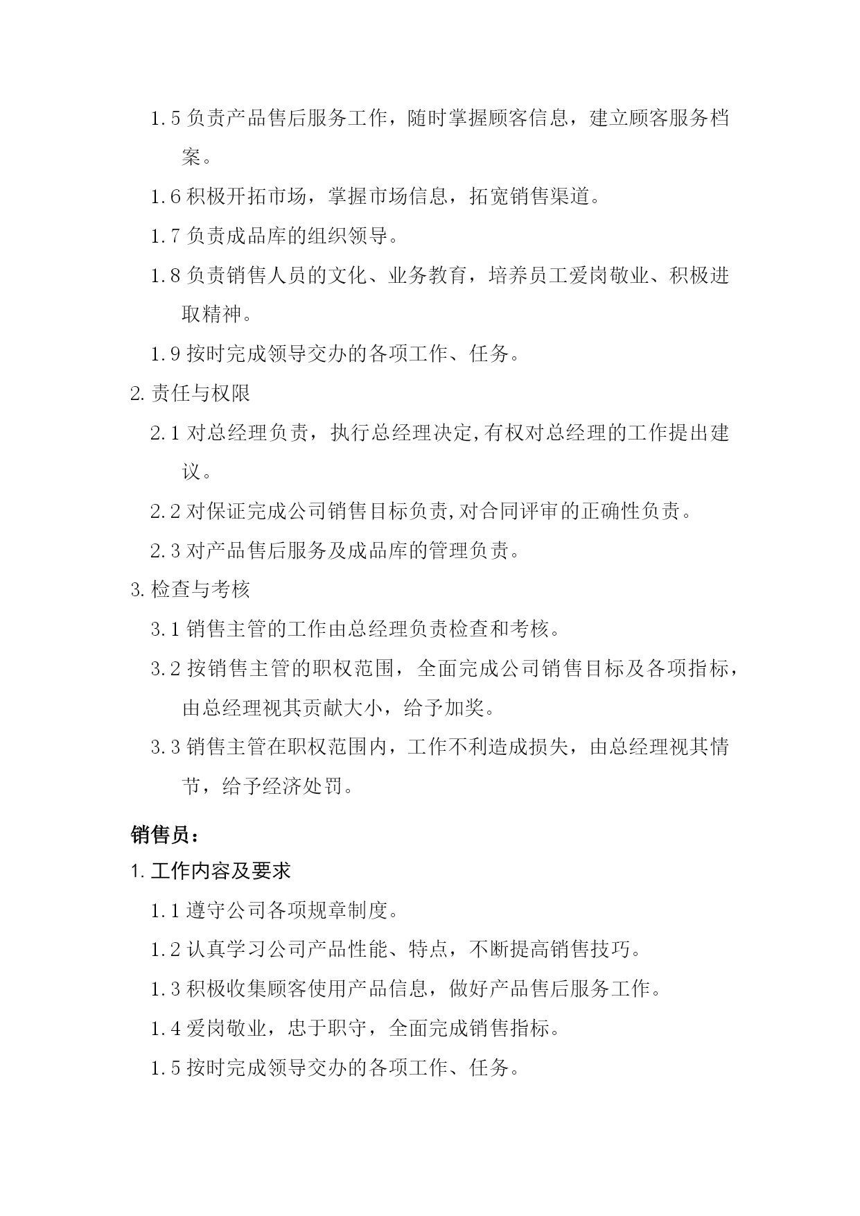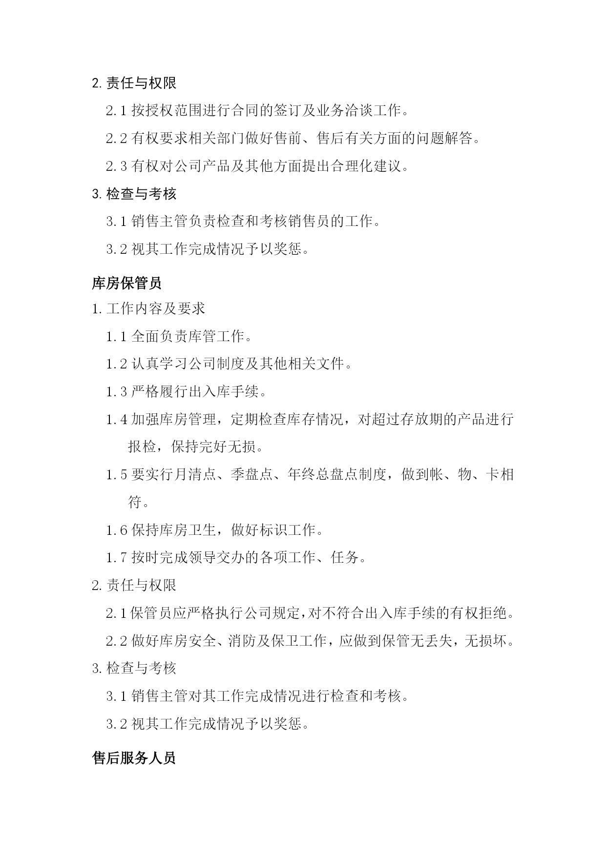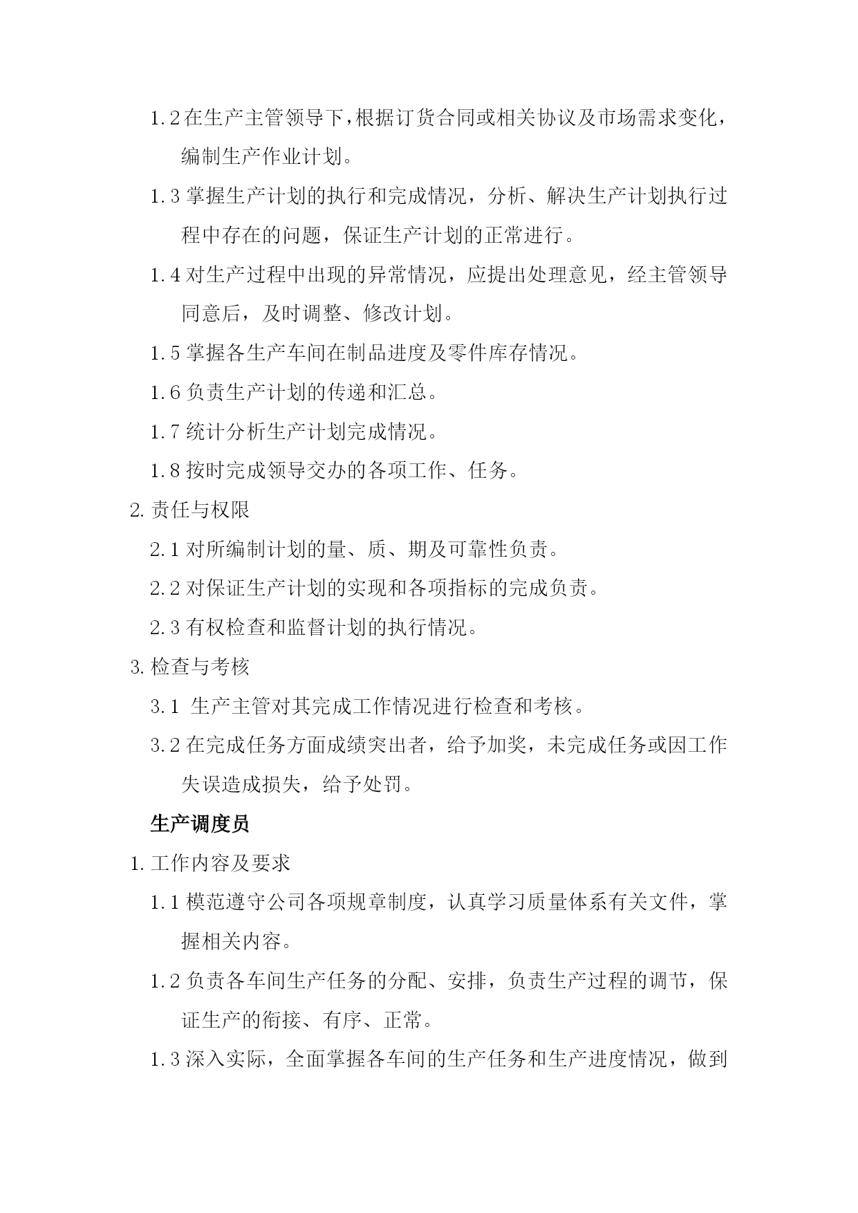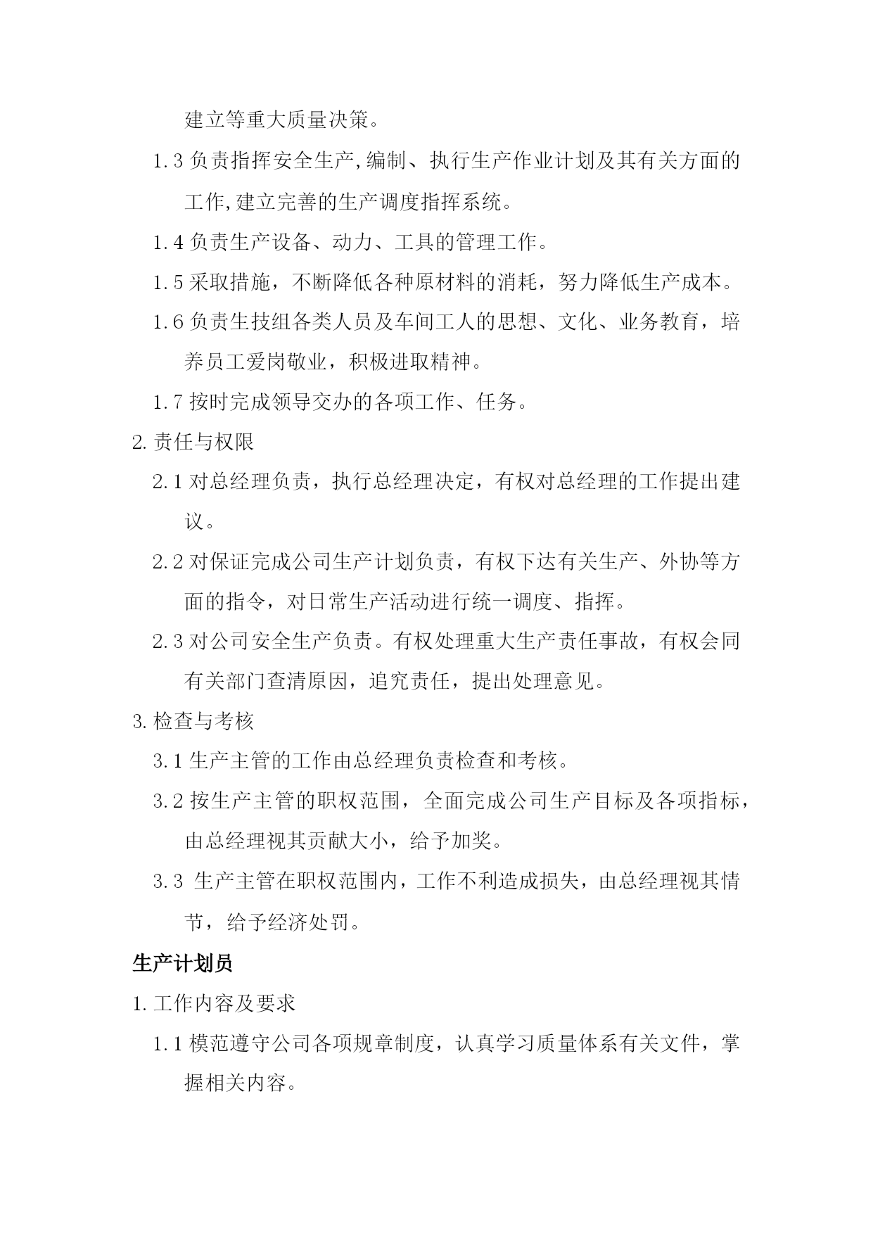 机械加工检验记录表最新文档(可以直接使用,可编辑最新文档,欢迎下载)机加工检验记录表编号:CHME/JL-ZJ-03序号:零件名称图号数量检验项目图纸及标准要求检验结果备注结论:检验员:日期:岗位安全职责总经理1.工作内容及要求1.1总经理对本公司生产指挥和经营管理工作统一领导,全面负责。1.2负责贯彻执行国家有关质量的法律、法规及方针政策,制定、发布质量方针并组织实施。1.3批准并建立和完善与质量体系相适应的组织机构,明确职责、权限及相互关系,负责管理评审和内部质量审核及签署报告。1.4决定重大质量决策,对公司的工作质量、产品质量和服务质量负全责。1.5充分调动公司各方面的积极因素,发挥副经理及各职能部门的作用,确保公司质量方针目标的实现。1.6负责职工的思想、文化、业务教育,组织职工进行技术创新,支持合理化建议活动。2.责任与权限2.1总经理有企业经营管理工作的决策权和生产指挥权。2.2总经理负责主持经理办公会议,研究解决生产经营和行政管理中的决策问题,对经营管理中的重大问题,意见不一致时,经理有权作出决定。3.检查与考核3.1总经理的工作由董事会负责检查和考核。3.2总经理应严以律己,自觉接受董事会的监督、检查。管理者代表1.作内容及要求1.1管理者代表在公司总经理领导下工作。1.2负责公司质量管理和质量保证等工作的组织和协调。1.3负责建立、实施并保持质量体系的正常运行。1.4负责组织内部质量体系审核,并将年度审核结果报告给总经理。1.5协助总经理做好管理评审工作。1.6负责质量体系文件的修改工作。1.7负责对员工进行质量意识教育。1.8按时完成领导交办的各项工作、任务。2.责任与权限2.1对总经理负责,执行总经理决定,有权对总经理的工作提出建议。2.2对保证公司质量体系有效运行负责,有权下达质量管理工作指令,并监督实施。3.检查与考核3.1由总经理负责检查与考核。3.2按对公司质量管理和质量保证工作的贡献和失误,由总经理视其情况,给予奖罚。销售主管1.工作内容及要求1.1销售经理在总经理直接领导下,负责销售部的各项工作。1.2负责贯彻公司质量方针和质量体系文件,参与质量体系的策划、建立等重大质量决策。1.3领导销售订货、回款,带领销售员全面完成公司全年销售目标。1.4领导合同评审工作,负责对重大合同的签订和审批。1.5负责产品售后服务工作,随时掌握顾客信息,建立顾客服务档案。1.6积极开拓市场,掌握市场信息,拓宽销售渠道。1.7负责成品库的组织领导。1.8负责销售人员的文化、业务教育,培养员工爱岗敬业、积极进取精神。1.9按时完成领导交办的各项工作、任务。2.责任与权限2.1对总经理负责,执行总经理决定,有权对总经理的工作提出建议。2.2对保证完成公司销售目标负责,对合同评审的正确性负责。2.3对产品售后服务及成品库的管理负责。3.检查与考核3.1销售主管的工作由总经理负责检查和考核。3.2按销售主管的职权范围,全面完成公司销售目标及各项指标,由总经理视其贡献大小,给予加奖。3.3销售主管在职权范围内,工作不利造成损失,由总经理视其情节,给予经济处罚。销售员:1.工作内容及要求1.1遵守公司各项规章制度。1.2认真学习公司产品性能、特点,不断提高销售技巧。1.3积极收集顾客使用产品信息,做好产品售后服务工作。1.4爱岗敬业,忠于职守,全面完成销售指标。1.5按时完成领导交办的各项工作、任务。2.责任与权限2.1按授权范围进行合同的签订及业务洽谈工作。2.2有权要求相关部门做好售前、售后有关方面的问题解答。2.3有权对公司产品及其他方面提出合理化建议。3.检查与考核3.1销售主管负责检查和考核销售员的工作。3.2视其工作完成情况予以奖惩。库房保管员1.工作内容及要求1.1全面负责库管工作。1.2认真学习公司制度及其他相关文件。1.3严格履行出入库手续。1.4加强库房管理,定期检查库存情况,对超过存放期的产品进行报检,保持完好无损。1.5要实行月清点、季盘点、年终总盘点制度,做到帐、物、卡相符。1.6保持库房卫生,做好标识工作。1.7按时完成领导交办的各项工作、任务。2.责任与权限2.1保管员应严格执行公司规定,对不符合出入库手续的有权拒绝。2.2做好库房安全、消防及保卫工作,应做到保管无丢失,无损坏。3.检查与考核3.1销售主管对其工作完成情况进行检查和考核。3.2视其工作完成情况予以奖惩。售后服务人员1.工作内容及要求1.1为顾客使用本单位产品提供安装、调试、正确使用的指导意见。1.2应顾客要求为顾客培训操作人员。1.3与顾客联系,了解顾客的使用