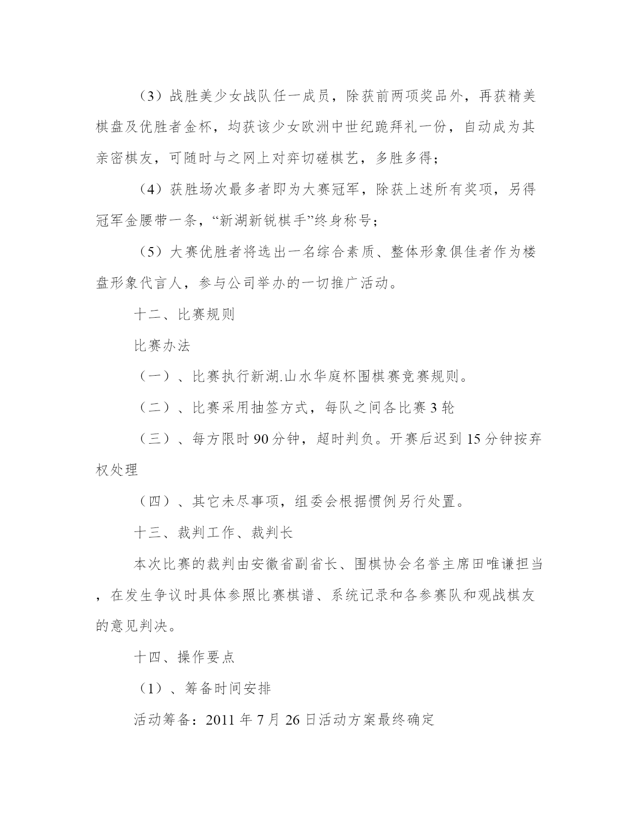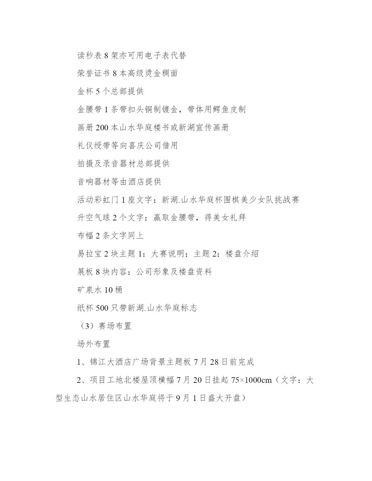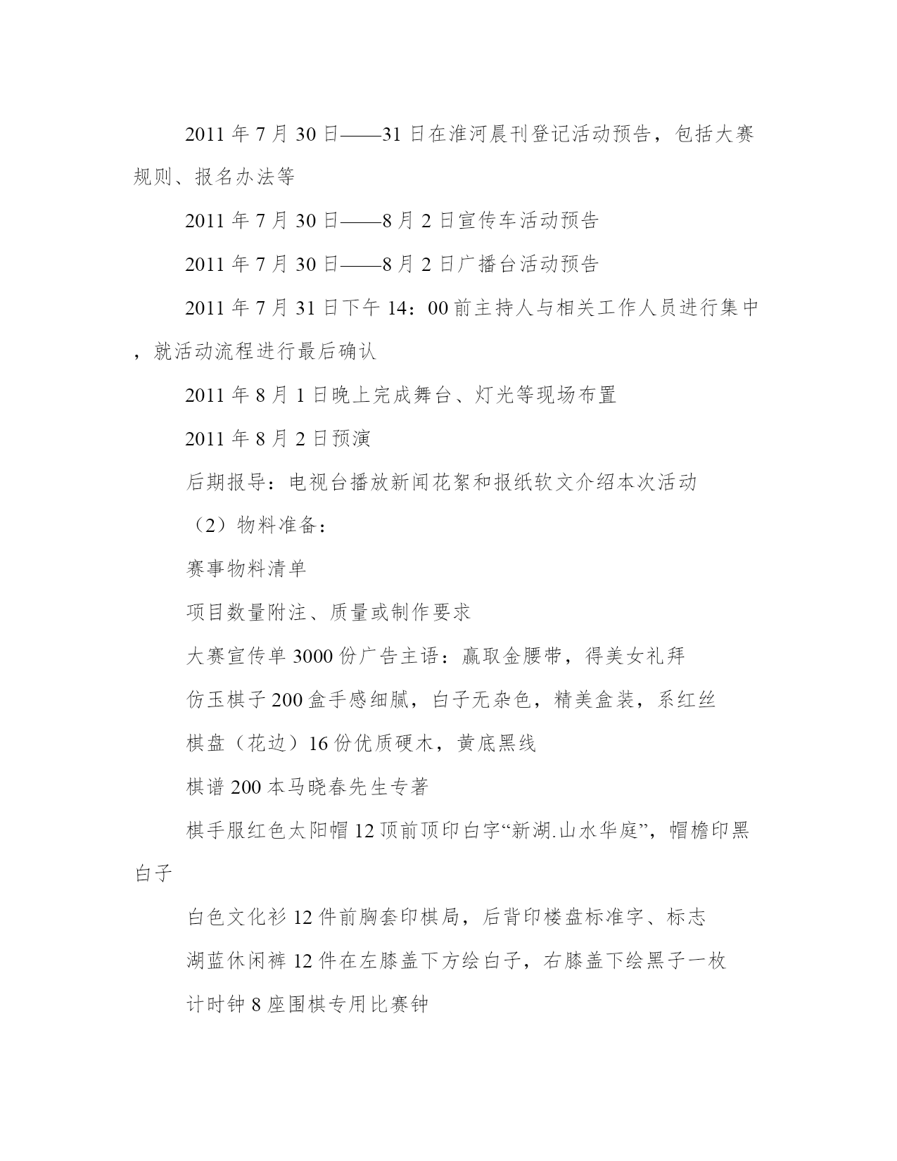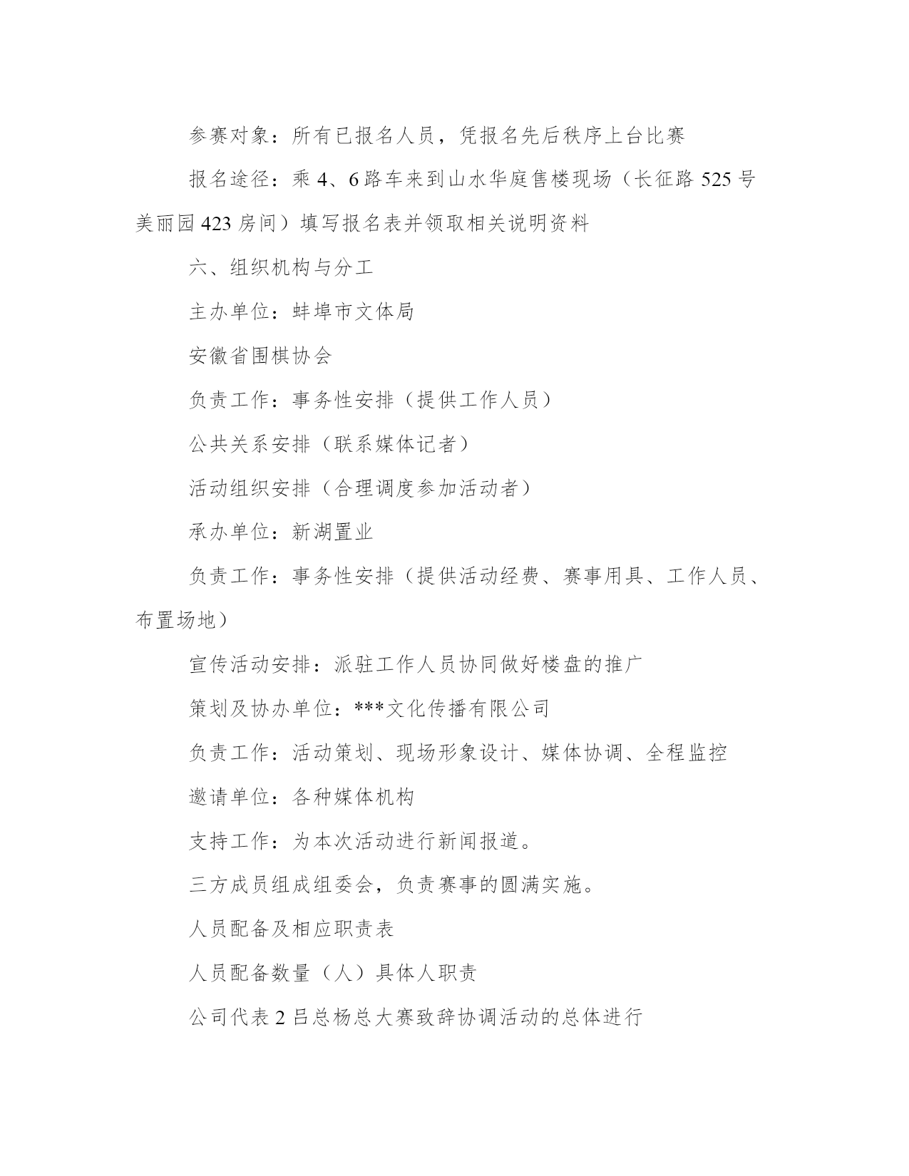 棋艺大赛的活动策划方案8月3日—8月10日二、大赛地点蚌埠.锦江大酒店二楼三、大赛主题“新湖·山水华庭”杯——新湖美少女挑战蚌埠棋艺高手四、大赛意义本着盛事行销的原则,我们以极富生活化、艺术化、浪漫化、生动化的赛事来提高公司知名度,尽快树立起新湖企业在当地人心中的形象;提升项目知名度,力争在目标客户群中达成一定的记忆度,在蚌埠公众中达到理想的传播效果,让山水华庭乘着大赛的翅膀飞翔。新湖围棋美少女战队是一道亮丽的风景线,在这个眼球经济时代,美女兼才女,势必能极大地吸引人气,以广义的能量不守恒转换定律分析,“才女美能赛事势能品牌动能”的能量传递链,以蚌埠活动传播史上史无前例的美女赛事盛世出击,必能达到良好的品牌传播效果,迅速提升后期的楼盘销售。五、参赛选手报名方式报名时间:自7月28日—7月30日(8:30—18:00)开始报名,并领取相应的资料,接待员再次告知参赛人员准点到场报名对象:男性,围棋爱好者均有资格报名参赛参赛对象:所有已报名人员,凭报名先后秩序上台比赛报名途径:乘4、6路车来到山水华庭售楼现场(长征路525号美丽园423房间)填写报名表并领取相关说明资料六、组织机构与分工主办单位:蚌埠市文体局安徽省围棋协会负责工作:事务性安排(提供工作人员)公共关系安排(联系媒体记者)活动组织安排(合理调度参加活动者)承办单位:新湖置业负责工作:事务性安排(提供活动经费、赛事用具、工作人员、布置场地)宣传活动安排:派驻工作人员协同做好楼盘的推广策划及协办单位:***文化传播有限公司负责工作:活动策划、现场形象设计、媒体协调、全程监控邀请单位:各种媒体机构支持工作:为本次活动进行新闻报道。三方成员组成组委会,负责赛事的圆满实施。人员配备及相应职责表人员配备数量(人)具体人职责公司代表2吕总杨总大赛致辞协调活动的总体进行主持人男女各1酒店提供宣读大赛规则、奖项设置、兑奖办法、负责控制现场、调节气氛、及时宣布赛事结果等嘉宾评委区评委2省围棋协会1、负责比量、比快选手上台参赛打√登记、计分;2、统计出进入决赛前8名名单公证员2省围棋协会监督评分的准确、公正保安2负责维护活动现场秩序,必须穿制服机动人员2处理应急事项七、特邀嘉宾及评委特邀嘉宾安徽省副省长、围棋协会名誉主席田唯谦蚌埠市副市长蚌埠市文化局副局长安徽省围棋协会会长特邀评委新湖围棋俱乐部常务会长安徽省围棋协会常务理事八、主力棋手集中、日、韩三国美少女棋手方阵之精英,初定人选为:毛佳君(浙江棋手)、唐莉(四川棋手)、河好贞(韩国棋手)、万波佳奈(日本棋手)九、大赛方式由美女队成员与蚌埠棋手(男)博奕,须眉与巾帼争峰,争夺冠军。十、大赛内容(1)赛前宣传:2011年7月30日——8月2日,通过蚌埠广播电视报启事、蚌埠日报启事、蚌埠电视台游飞字幕、百货大楼及市文化宫体育场一带广发传单、市围棋协会定向邀请等方式,争取尽可能多的棋手参与。(2)预赛-热身赛:2011年8月3日——8月4日,将选手分为七队,以山水华庭组团命名为听涛苑队、水云天队、月玲珑队、华庭汇队、浅水湾队、栖云居队、花溪地队,先举行队内单循环淘汰赛,各队选出三名种子选手,入围半决赛。(3)半决赛:采用淘汰赛决出8强。(4)决赛–热力赛:2011年8月9日——8月10日,8强与美少女博奕,一决雌雄。十一、奖项设置(1)所有参与之棋手,均获山水华庭精美画册一本,新湖围棋俱乐部九段棋圣马晓春先生专著一本、精美棋子一盒;(2)进入决赛八强,再获印有新湖标志与黑白子图的新湖棋手服一套(红色太阳帽、文化衫、休闲裤三件套),自动升级为新湖围棋俱乐部会员,免费参与俱乐部的一切赛事文艺活动,有机会获得更多奖品;(3)战胜美少女战队任一成员,除获前两项奖品外,再获精美棋盘及优胜者金杯,均获该少女欧洲中世纪跪拜礼一份,自动成为其亲密棋友,可随时与之网上对弈切磋棋艺,多胜多得;(4)获胜场次最多者即为大赛冠军,除获上述所有奖项,另得冠军金腰带一条,“新湖新锐棋手”终身称号;(5)大赛优胜者将选出一名综合素质、整体形象俱佳者作为楼盘形象代言人,参与公司举办的一切推广活动。十二、比赛规则比赛办法(一)、比赛执行新湖.山水华庭杯围棋赛竞赛规则。(二)、比赛采用抽签方式,每队之间各比赛3轮(三)、每方限时90分钟,超时判负。开赛后迟到15分钟按弃权处理(四)、其它未尽事项,组委会根据惯例另行处置。十三、裁判工作、裁判长本次比赛的裁判由安徽省副省长、围棋协会名誉主席田唯谦担当,在发生争议时具体参照比赛棋谱、系统记录和各参赛队和观战棋友的意见判决。十四、操作要点(1)、筹备时间安排活动筹备:2011年7月26日活动方案最终确