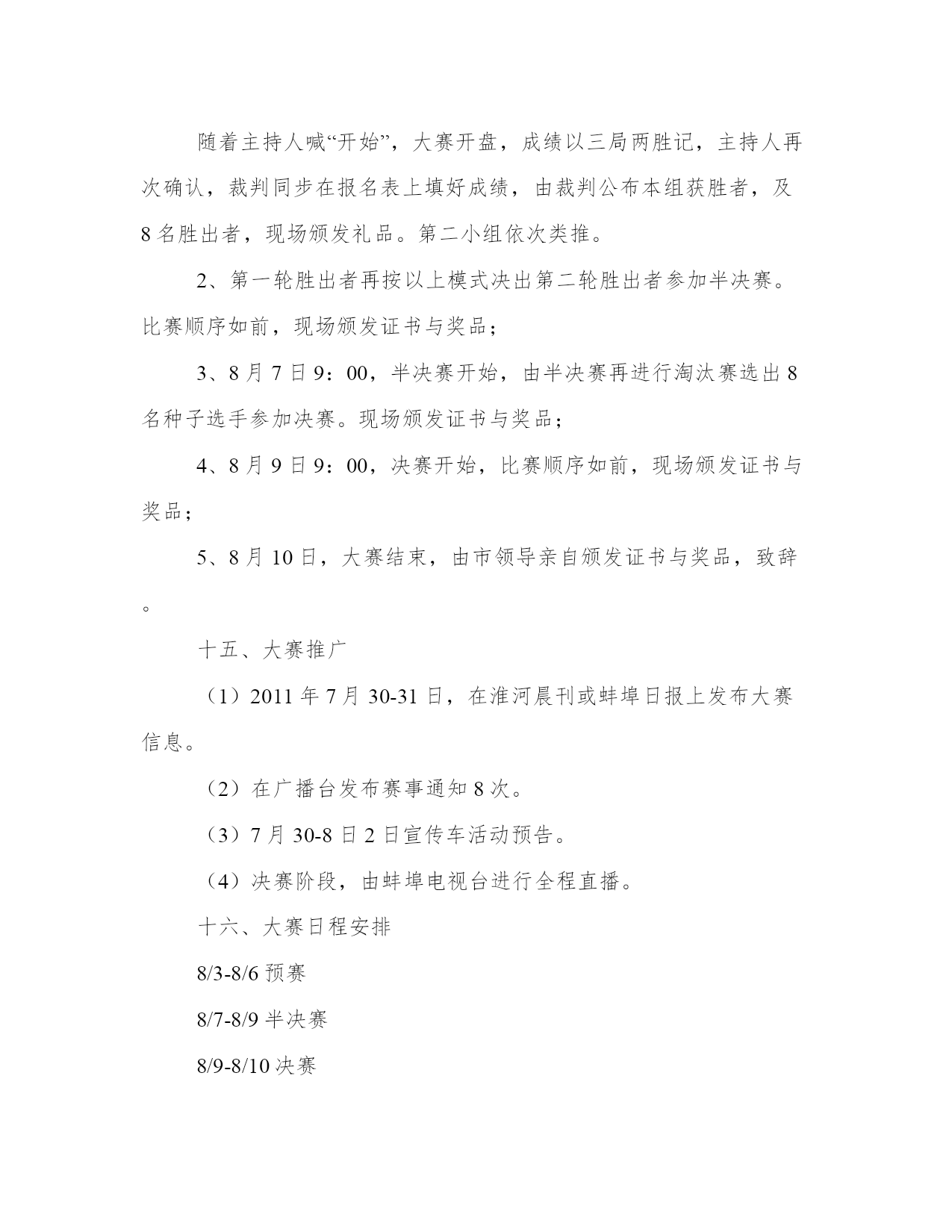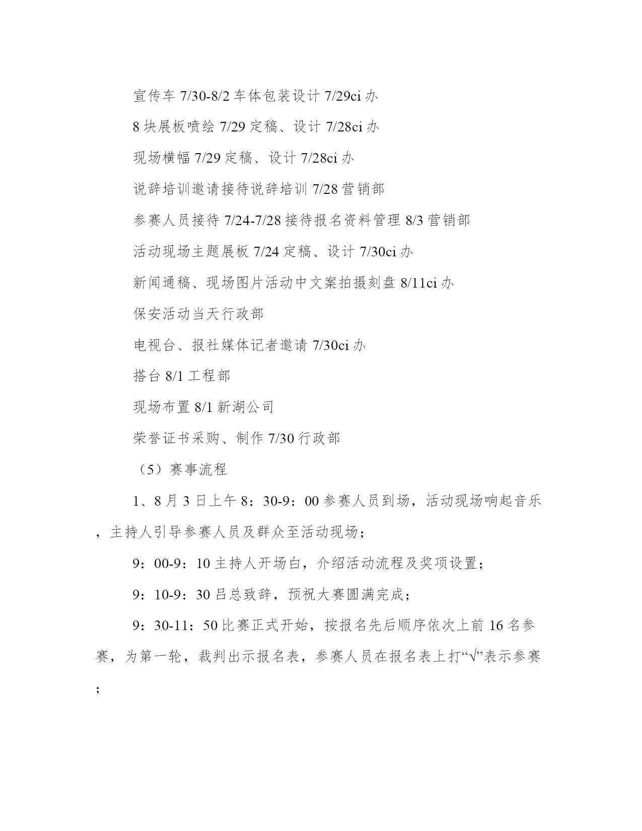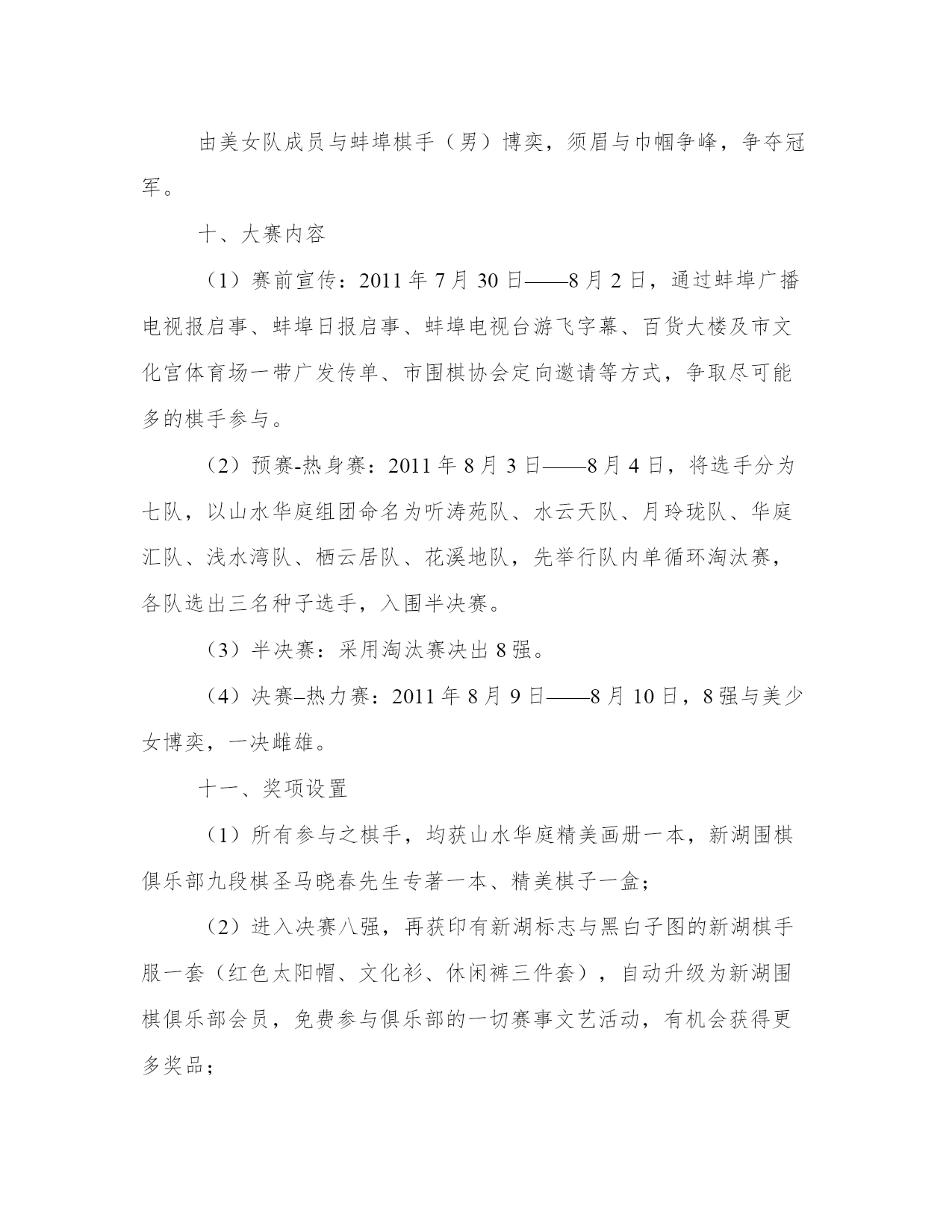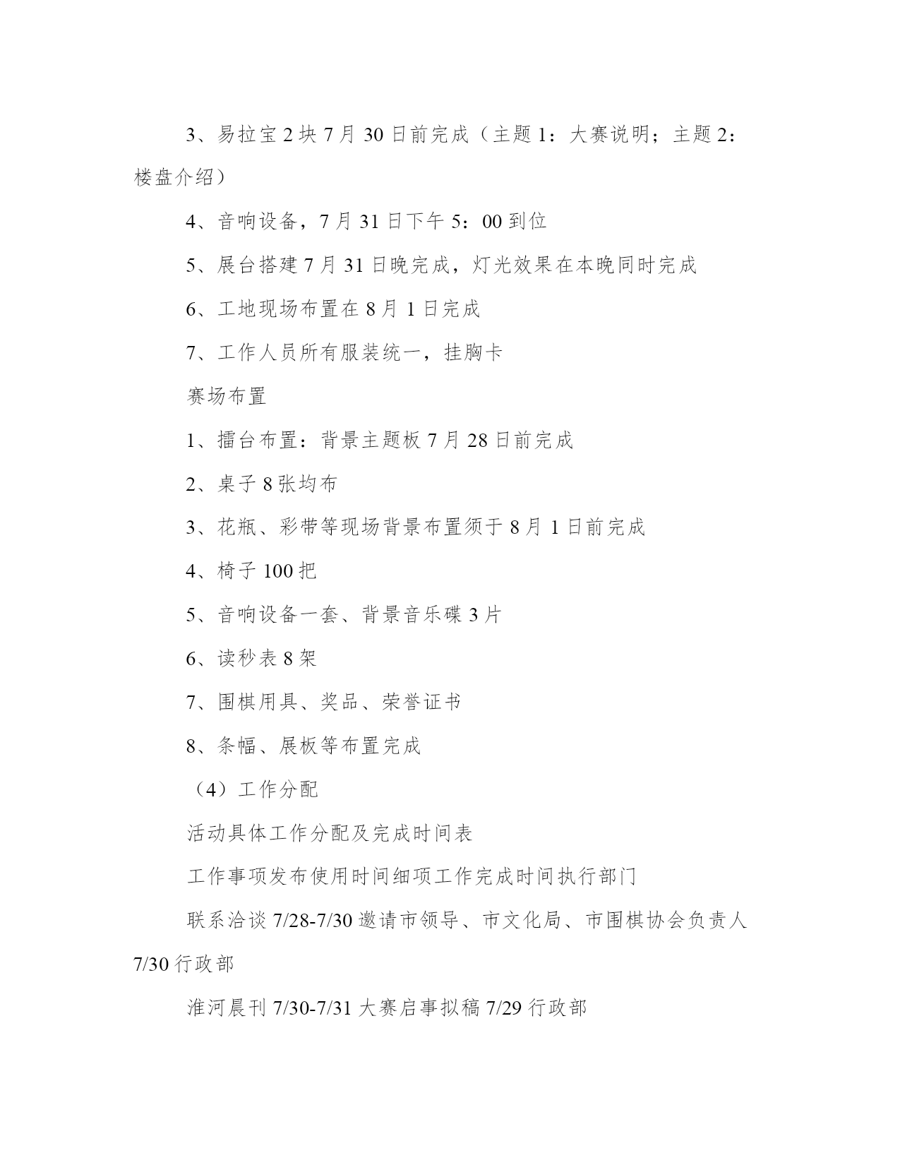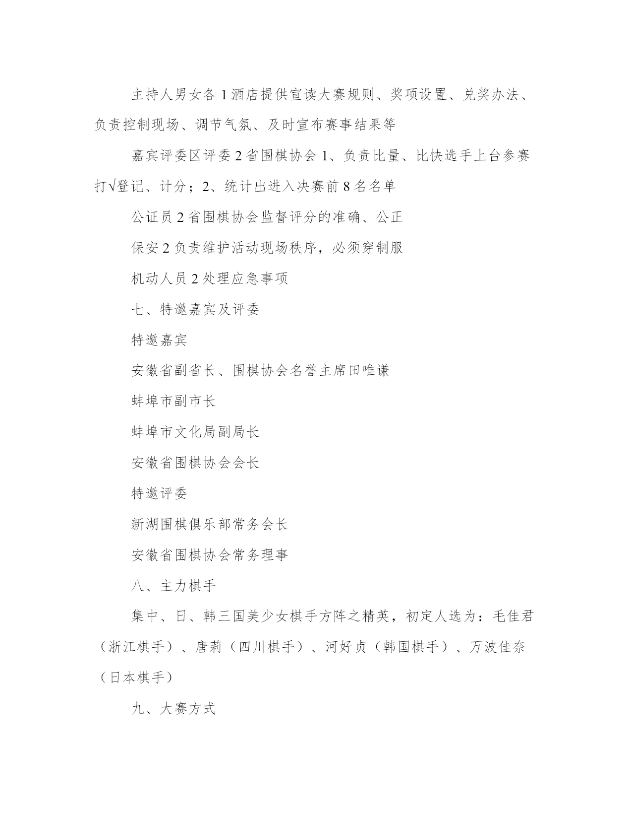 棋艺大赛的活动策划方案8月3日—8月10日二、大赛地点蚌埠.锦江大酒店二楼三、大赛主题“新湖·山水华庭”杯——新湖美少女挑战蚌埠棋艺高手四、大赛意义本着盛事行销的原则,我们以极富生活化、艺术化、浪漫化、生动化的赛事来提高公司知名度,尽快树立起新湖企业在当地人心中的形象;提升项目知名度,力争在目标客户群中达成一定的记忆度,在蚌埠公众中达到理想的传播效果,让山水华庭乘着大赛的翅膀飞翔。新湖围棋美少女战队是一道亮丽的风景线,在这个眼球经济时代,美女兼才女,势必能极大地吸引人气,以广义的能量不守恒转换定律分析,“才女美能赛事势能品牌动能”的能量传递链,以蚌埠活动传播史上史无前例的美女赛事盛世出击,必能达到良好的品牌传播效果,迅速提升后期的楼盘销售。五、参赛选手报名方式报名时间:自7月28日—7月30日(8:30—18:00)开始报名,并领取相应的资料,接待员再次告知参赛人员准点到场报名对象:男性,围棋爱好者均有资格报名参赛参赛对象:所有已报名人员,凭报名先后秩序上台比赛报名途径:乘4、6路车来到山水华庭售楼现场(长征路525号美丽园423房间)填写报名表并领取相关说明资料六、组织机构与分工主办单位:蚌埠市文体局安徽省围棋协会负责工作:事务性安排(提供工作人员)公共关系安排(联系媒体记者)活动组织安排(合理调度参加活动者)承办单位:新湖置业负责工作:事务性安排(提供活动经费、赛事用具、工作人员、布置场地)宣传活动安排:派驻工作人员协同做好楼盘的推广策划及协办单位:***文化传播有限公司负责工作:活动策划、现场形象设计、媒体协调、全程监控邀请单位:各种媒体机构支持工作:为本次活动进行新闻报道。三方成员组成组委会,负责赛事的圆满实施。人员配备及相应职责表人员配备数量(人)具体人职责公司代表2吕总杨总大赛致辞协调活动的总体进行主持人男女各1酒店提供宣读大赛规则、奖项设置、兑奖办法、负责控制现场、调节气氛、及时宣布赛事结果等嘉宾评委区评委2省围棋协会1、负责比量、比快选手上台参赛打√登记、计分;2、统计出进入决赛前8名名单公证员2省围棋协会监督评分的准确、公正保安2负责维护活动现场秩序,必须穿制服机动人员2处理应急事项七、特邀嘉宾及评委特邀嘉宾安徽省副省长、围棋协会名誉主席田唯谦蚌埠市副市长蚌埠市文化局副局长安徽省围棋协会会长特邀评委新湖围棋俱乐部常务会长安徽省围棋协会常务理事八、主力棋手集中、日、韩三国美少女棋手方阵之精英,初定人选为:毛佳君(浙江棋手)、唐莉(四川棋手)、河好贞(韩国棋手)、万波佳奈(日本棋手)九、大赛方式由美女队成员与蚌埠棋手(男)博奕,须眉与巾帼争峰,争夺冠军。十、大赛内容(1)赛前宣传:2011年7月30日——8月2日,通过蚌埠广播电视报启事、蚌埠日报启事、蚌埠电视台游飞字幕、百货大楼及市文化宫体育场一带广发传单、市围棋协会定向邀请等方式,争取尽可能多的棋手参与。(2)预赛-热身赛:2011年8月3日——8月4日,将选手分为七队,以山水华庭组团命名为听涛苑队、水云天队、月玲珑队、华庭汇队、浅水湾队、栖云居队、花溪地队,先举行队内单循环淘汰赛,各队选出三名种子选手,入围半决赛。(3)半决赛:采用淘汰赛决出8强。(4)决赛–热力赛:2011年8月9日——8月10日,8强与美少女博奕,一决雌雄。十一、奖项设置(1)所有参与之棋手,均获山水华庭精美画册一本,新湖围棋俱乐部九段棋圣马晓春先生专著一本、精美棋子一盒;(2)进入决赛八强,再获印有新湖标志与黑白子图的新湖棋手服一套(红色太阳帽、文化衫、休闲裤三件套),自动升级为新湖围棋俱乐部会员,免费参与俱乐部的一切赛事文艺活动,有机会获得更多奖品;(3)战胜美少女战队任一成员,除获前两项奖品外,再获精美棋盘及优胜者金杯,均获该少女欧洲中世纪跪拜礼一份,自动成为其亲密棋友,可随时与之网上对弈切磋棋艺,多胜多得;(4)获胜场次最多者即为大赛冠军,除获上述所有奖项,另得冠军金腰带一条,“新湖新锐棋手”终身称号;(5)大赛优胜者将选出一名综合素质、整体形象俱佳者作为楼盘形象代言人,参与公司举办的一切推广活动。十二、比赛规则比赛办法(一)、比赛执行新湖.山水华庭杯围棋赛竞赛规则。(二)、比赛采用抽签方式,每队之间各比赛3轮(三)、每方限时90分钟,超时判负。开赛后迟到15分钟按弃权处理(四)、其它未尽事项,组委会根据惯例另行处置。十三、裁判工作、裁判长本次比赛的裁判由安徽省副省长、围棋协会名誉主席田唯谦担当,在发生争议时具体参照比赛棋谱、系统记录和各参赛队和观战棋友的意见判决。十四、操作要点(1)、筹备时间安排活动筹备:2011年7月26日活动方案最终确