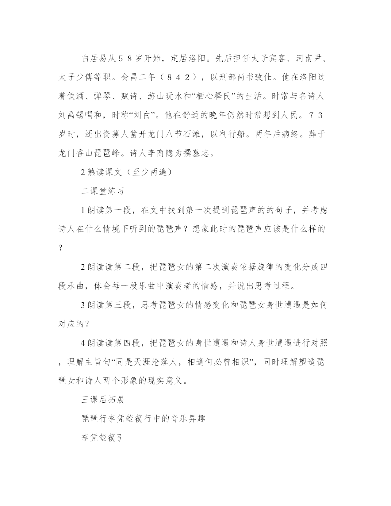 2024年琵琶行教学教案工作开展情况琵琶行教学教案根据普通高中语文课程标准(实验)课程理念的基本要求,文学艺术的鉴赏和创作是重要的审美活动,高中语文课程应关注学生情感的发展,让学生受到美的熏陶,培养自觉的审美意识和高尚的审美情趣,培养审美感和审美创造的能力。琵琶行是一篇情感充沛的美文,通过诵读和学案导学的方法,学生会体会到文章的情感美、结构美、语言美。二教材教法分析琵琶行是第三模块第二单元的文章。教学本单元有一个要求就是启发学生的审美情趣。鉴赏诗歌的情感美和形式美,是诗歌教学的重要内容。从审美方面说,审美对象的形式和内容是不可分的。没有情感真空的形式美,也没有不用包装的情感美。诵读是体会三教学目标定位教学目标1通过诵读教学感受诗人的情感美2利用学习学案分析文章结构把握诗歌的整体美3通过语言品味领悟形象美教学重点进入诗歌情境,感受诗人情感四教学过程主要环节(后附学案)第一部分导入:总结上节课所学,由琵琶声入手,伴随着琵琶声一起走进诗人和琵琶女的情感世界。诵读课文第一段感受第一次的琵琶声应该是怎样的?(学案)第二部分重点解读琵琶声1诵读第二段,把琵琶女的第二次演奏依据旋律的变化分成四段乐曲,体会每一段乐曲中演奏者的情感,并说出思考过程。(学案)分成四部乐曲序曲转轴拨弦三两声,未成曲调先有情。弦弦掩抑声声思,似诉平生不得意。低眉信手续续弹,说尽心中无限事。——悲凉伤感第一乐曲轻拢慢捻抹复挑,初为霓裳后六幺。大弦嘈嘈如急雨,小弦切切如私语。嘈嘈切切错杂弹,大珠小珠落玉盘。——欢乐愉快第二乐曲间关莺语花底滑,幽咽泉流冰下难。冰泉冷涩弦凝绝,凝绝不通声暂歇。别有幽愁暗恨生,此时无声胜有声。——幽愁暗恨第三乐曲银瓶乍破水浆迸,铁骑突出刀枪鸣。曲终收拨当心画,四弦一声如裂帛。——悲愤不平2找同学示范朗读第三段,思考琵琶女的情感变化和琵琶女身世遭遇是如何对应的?(用琵琶女的身世遭遇再次解读琵琶女的演奏)(学案)琵琶女的情感琵琶女的身世悲凉伤感深夜忽梦少年事,梦啼妆泪红阑干。欢乐愉快自言本是京城女,家在虾蟆陵下住。十三学得琵琶成,名属教坊第一部。曲罢曾教善才服,妆成每被秋娘妒。五陵年少争缠头,一曲红绡不知数。钿头银篦击节碎,血色罗裙翻酒污。今年欢笑复明年,秋月春风等闲度幽愁暗恨弟走从军阿姨死,暮去朝来颜故。悲愤不平门前冷落鞍马稀,老大嫁作商妇。商人重利轻别离,前月浮梁买去。去来江口守空船。绕船月明江寒。琵琶声表达出演奏者的内心情感的起伏变化,也是演奏者身世遭遇的写照。第三部分解读青衫泪齐读第四段,把琵琶女的身世遭遇和诗人身世遭遇进行对照,理解主旨句“同是天涯沦落人,相逢何必曾相识”,同时理解塑造琵琶女和诗人两个形象的现实意义。(学案)琵琶女诗人京城女-------身份-------京城官色艺双全-------昔日-------才权并重独守空船-------今日-------谪居卧病受侮辱的艺人形象受排挤的知识分子形象同是天涯沦落人相逢何必曾相识青衫泪因怜人悲己的两重感情交融在一起积累沉淀而成,这泪水既是对压迫妇女的同情与尊重,又是对当时社会重利薄情、重色轻才的控诉。第四部分课堂小结总结出本文的行文思路。把握诗人的行文思路,有利于充分把握诗人情感,更有利于课文的背诵。三次琵琶声:先是诗人送客听到第一次琵琶声,第二次请出琵琶女为自己弹奏一曲,弹奏结束后琵琶女又说了自己的身世经历,诗人被琵琶女的身世感动,也叙述了自己的经历,第三次再请琵琶女弹奏,为她翻作琵琶行。每段之间都有对应。第二段演奏依据旋律的变化分成四段乐曲,每一段乐曲表达琵琶女不同的情感对应着第三段琵琶女的身世遭遇的变化,琵琶女的遭遇又是和第四段诗人的遭遇相对应的。第五部分作业你怎样理解“同是天涯沦落人,相逢何必曾相识”两句诗的意蕴?(不少于100字)写在作业本上。五板书设计第二段第三段第四段第五段︱︱同是天涯沦落人︱怜人悲己︱琵琶声←→琵琶女的身世——诗人的身世——青衫泪学案附:琵琶行学案一课前准备1白居易生平简介白居易(772~846),唐代诗人。字乐天,号香山居士、醉吟先生。下邽(今陕西渭南)人。原籍山西太原,祖上迁下陕西渭南。晚年官太子少傅,谥号“文”,世称白傅,白文公。公元772年2月28日,白居易出生于郑州新郑(今河南新郑县)一个“世敦儒业”的中小官僚家庭。父季庚,做过彭城县令,徐州、襄州别贺。白居易自幼聪慧,5、6岁学作诗,9岁熟悉声韵。11岁时,因两河藩镇战乱,由荥阳逃难到徐州符离(今安徽宿县北),不久又下到越中,投奔在杭州作县尉的堂兄。5、6年的颠沛流离生活中,白居易接触到民间疾苦,并受到当时任苏州、杭州刺史的两位诗人韦应物、房孺复的影响,作