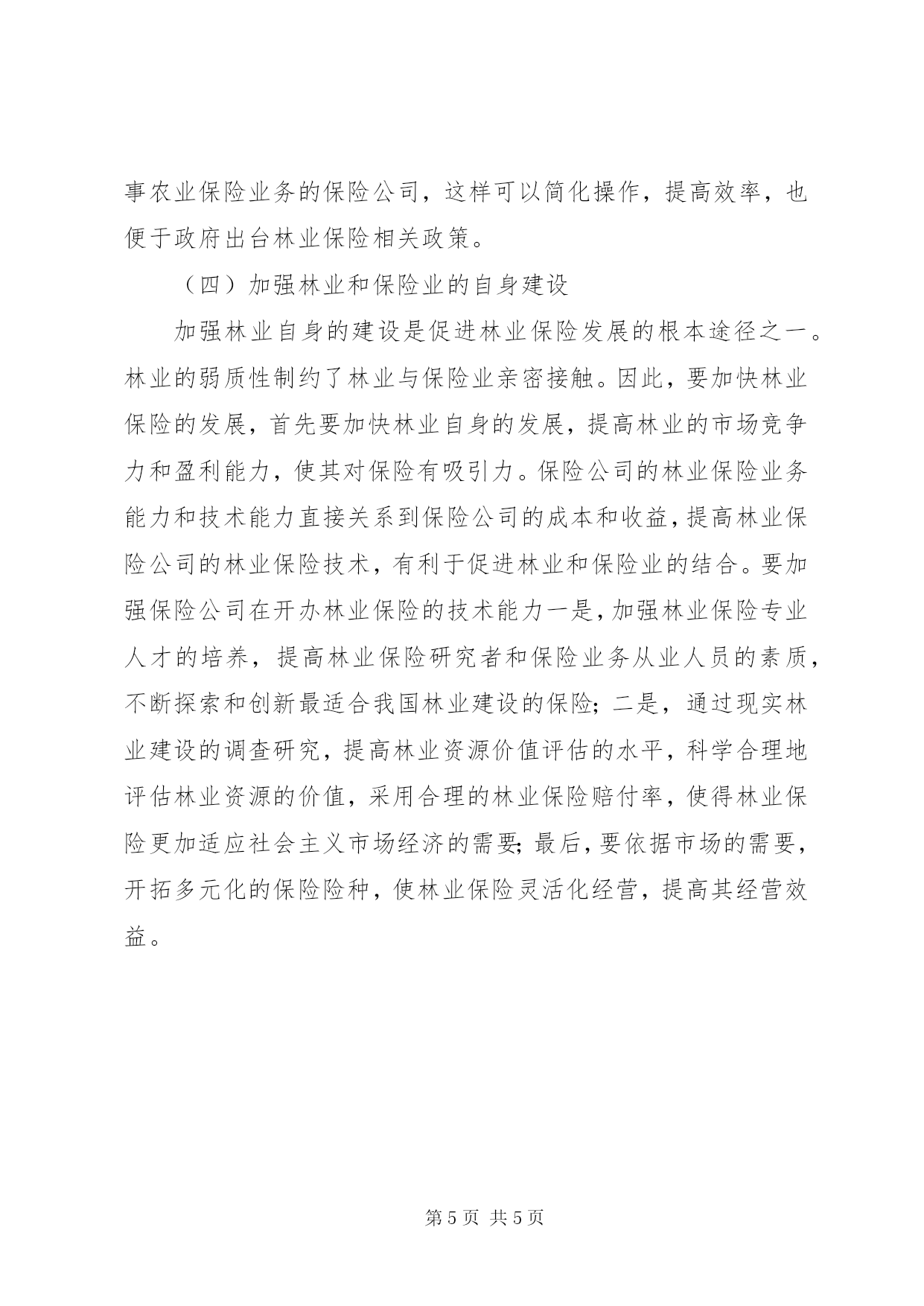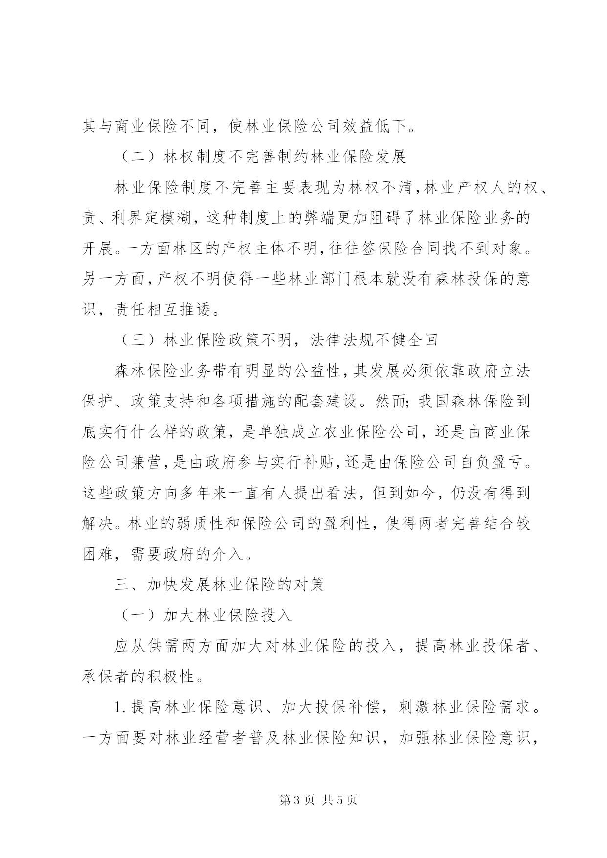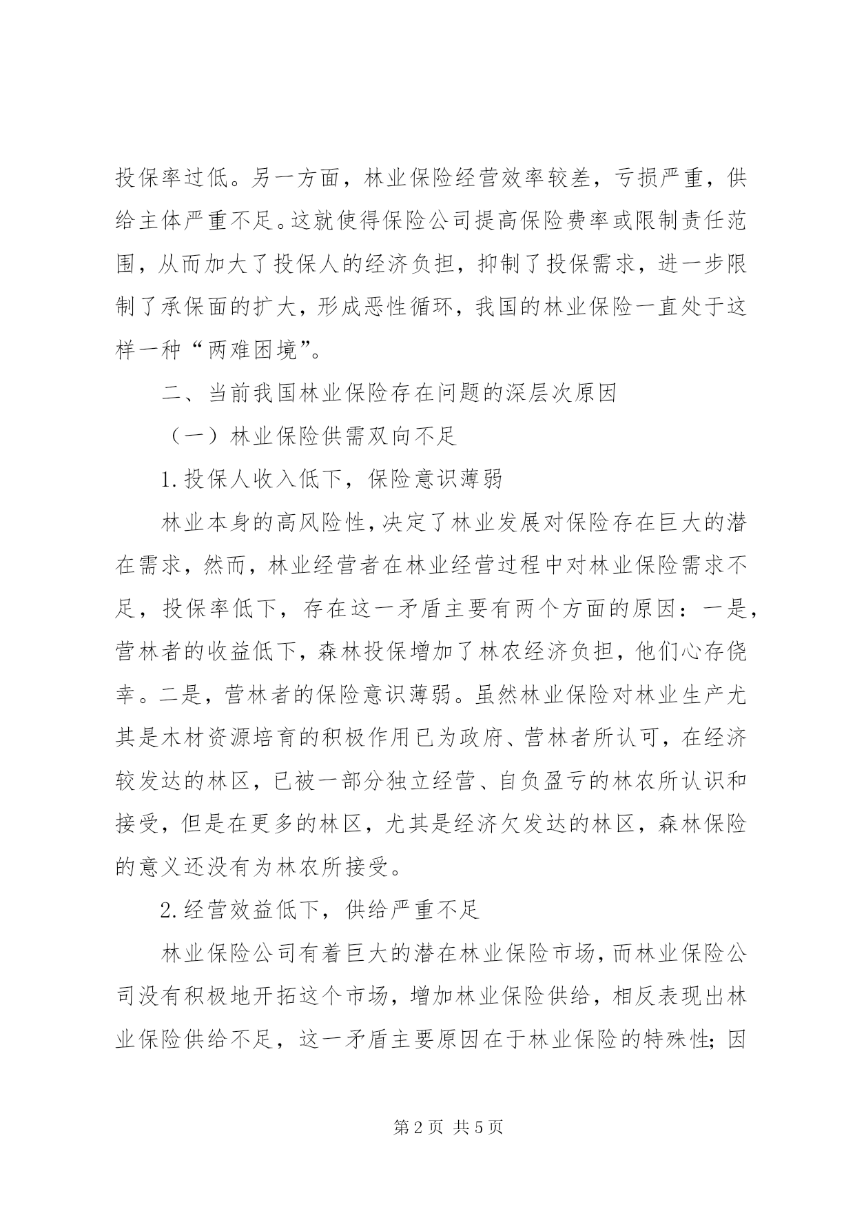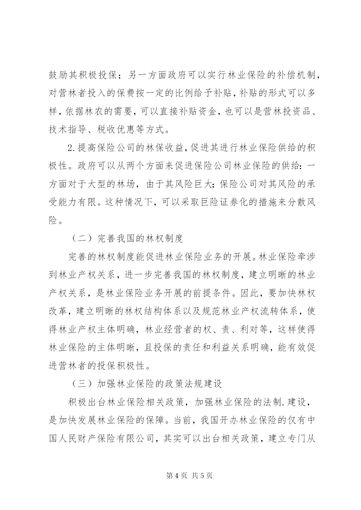 第PAGE\*Arabic\*MERGEFORMAT5页共NUMPAGES\*MERGEFORMAT5页我国林业保险若干问题综述摘要。我国森林保险缺乏法律规范,目前还没有专门的森林保险的法律法规,对森林保险的性质也没有做出明确的规定,森林保险的组织机构、业务经营方式和会计核算制度等都按照《保险法》中对商业保险的规范来实施,森林保险始终被包容在商业性保险体制中,但由于林业保险的特殊性,其和商业保险有着很大的林业竞争力薄弱、林业保险技术不高林业的弱质性及林业保险技术的薄弱不利于林业保险发展。关键词:林业保险一、我国林业保险的发展现状(一)林业对保险有着巨大的潜在需求林业是一个高风险的产业,其对保险有着巨大的潜在需求。林木在漫长的生产周期里,既易受到火、风、雪、水、病虫害等自然灾害袭击,又易遭到乱砍乱伐、毁林开荒等人为破坏。从调查可以看出林业自身具有巨大的风险性,且有增大的趋势。林业灾害给林业发展造成的巨大损失是林业经营无法承受的。(二)林业保险发展滞后对林业发展的需要我国林业保险出现较早,但发展十分缓慢。进入上世纪90年代后,森林保险却一直停滞不前甚至出现业务萎缩的现象。随着林业市场经济的到来,林业保险越来越重要,尤其是一些较为注重效益的商品林。一方面,林农的收入偏低、保险意识薄弱,投保率过低。另一方面,林业保险经营效率较差,亏损严重,供给主体严重不足。这就使得保险公司提高保险费率或限制责任范围,从而加大了投保人的经济负担,抑制了投保需求,进一步限制了承保面的扩大,形成恶性循环,我国的林业保险一直处于这样一种“两难困境”。二、当前我国林业保险存在问题的深层次原因(一)林业保险供需双向不足1.投保人收入低下,保险意识薄弱林业本身的高风险性,决定了林业发展对保险存在巨大的潜在需求,然而,林业经营者在林业经营过程中对林业保险需求不足,投保率低下,存在这一矛盾主要有两个方面的原因:一是,营林者的收益低下,森林投保增加了林农经济负担,他们心存侥幸。二是,营林者的保险意识薄弱。虽然林业保险对林业生产尤其是木材资源培育的积极作用已为政府、营林者所认可,在经济较发达的林区,已被一部分独立经营、自负盈亏的林农所认识和接受,但是在更多的林区,尤其是经济欠发达的林区,森林保险的意义还没有为林农所接受。2.经营效益低下,供给严重不足林业保险公司有着巨大的潜在林业保险市场,而林业保险公司没有积极地开拓这个市场,增加林业保险供给,相反表现出林业保险供给不足,这一矛盾主要原因在于林业保险的特殊性;因其与商业保险不同,使林业保险公司效益低下。(二)林权制度不完善制约林业保险发展林业保险制度不完善主要表现为林权不清,林业产权人的权、责、利界定模糊,这种制度上的弊端更加阻碍了林业保险业务的开展。一方面林区的产权主体不明,往往签保险合同找不到对象。另一方面,产权不明使得一些林业部门根本就没有森林投保的意识,责任相互推诿。(三)林业保险政策不明,法律法规不健全回森林保险业务带有明显的公益性,其发展必须依靠政府立法保护、政策支持和各项措施的配套建设。然而;我国森林保险到底实行什么样的政策,是单独成立农业保险公司,还是由商业保险公司兼营,是由政府参与实行补贴,还是由保险公司自负盈亏。这些政策方向多年来一直有人提出看法,但到如今,仍没有得到解决。林业的弱质性和保险公司的盈利性,使得两者完善结合较困难,需要政府的介入。三、加快发展林业保险的对策(一)加大林业保险投入应从供需两方面加大对林业保险的投入,提高林业投保者、承保者的积极性。1.提高林业保险意识、加大投保补偿,刺激林业保险需求。一方面要对林业经营者普及林业保险知识,加强林业保险意识,鼓励其积极投保;另一方面政府可以实行林业保险的补偿机制,对营林者投入的保费按一定的比例给予补贴,补贴的形式可以多样,依据林农的需要,可以直接补贴资金,也可以是营林投资品、技术指导、税收优惠等方式。2.提高保险公司的林保收益,促进其进行林业保险供给的积极性。政府可以从两个方面来促进保险公司林业保险的供给:一方面对于大型的林场,由于其风险巨大;保险公司对其风险的承受能力有限。这种情况下,可以采取巨险证券化的措施来分散风险。(二)完善我国的林权制度完善的林权制度能促进林业保险业务的开展。林业保险牵涉到林业产权关系,进一步完善我国的林权制度,建立明晰的林业产权关系,是林业保险业务开展的前提条件。因此,要加快林权改革,建立明晰的林权结构体系以及规范林业产权流转体系,使得林业产权主体明确,林业经营者的权、责、利对等,这样使得林业保险的主体明晰,且投保的责任和利益关系明确,能有效促进营林者的投保积极性。(三)加强林业保险的政策法规建设积极出台林业保险相关政策,加强林业保险的法制.建设,是加快发展林业保险的保障。当前,我国开办林业保