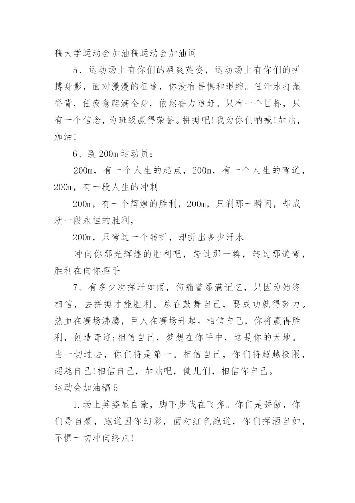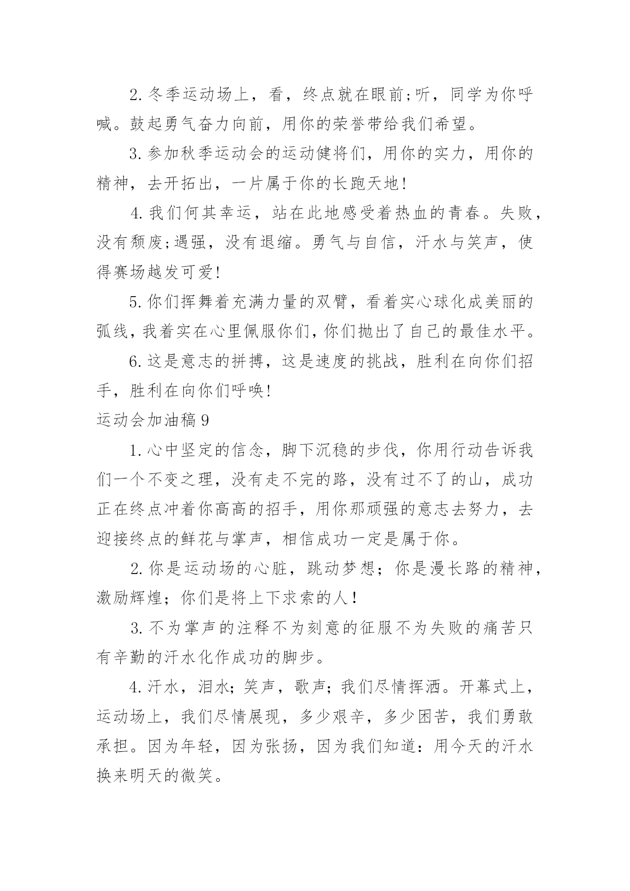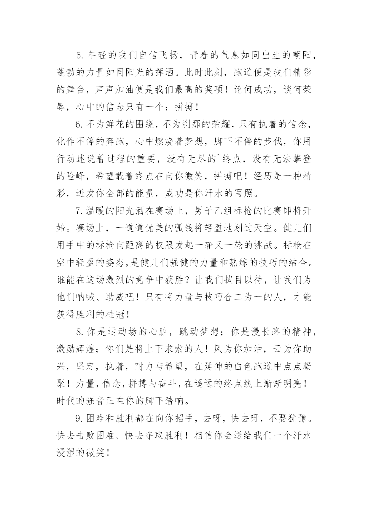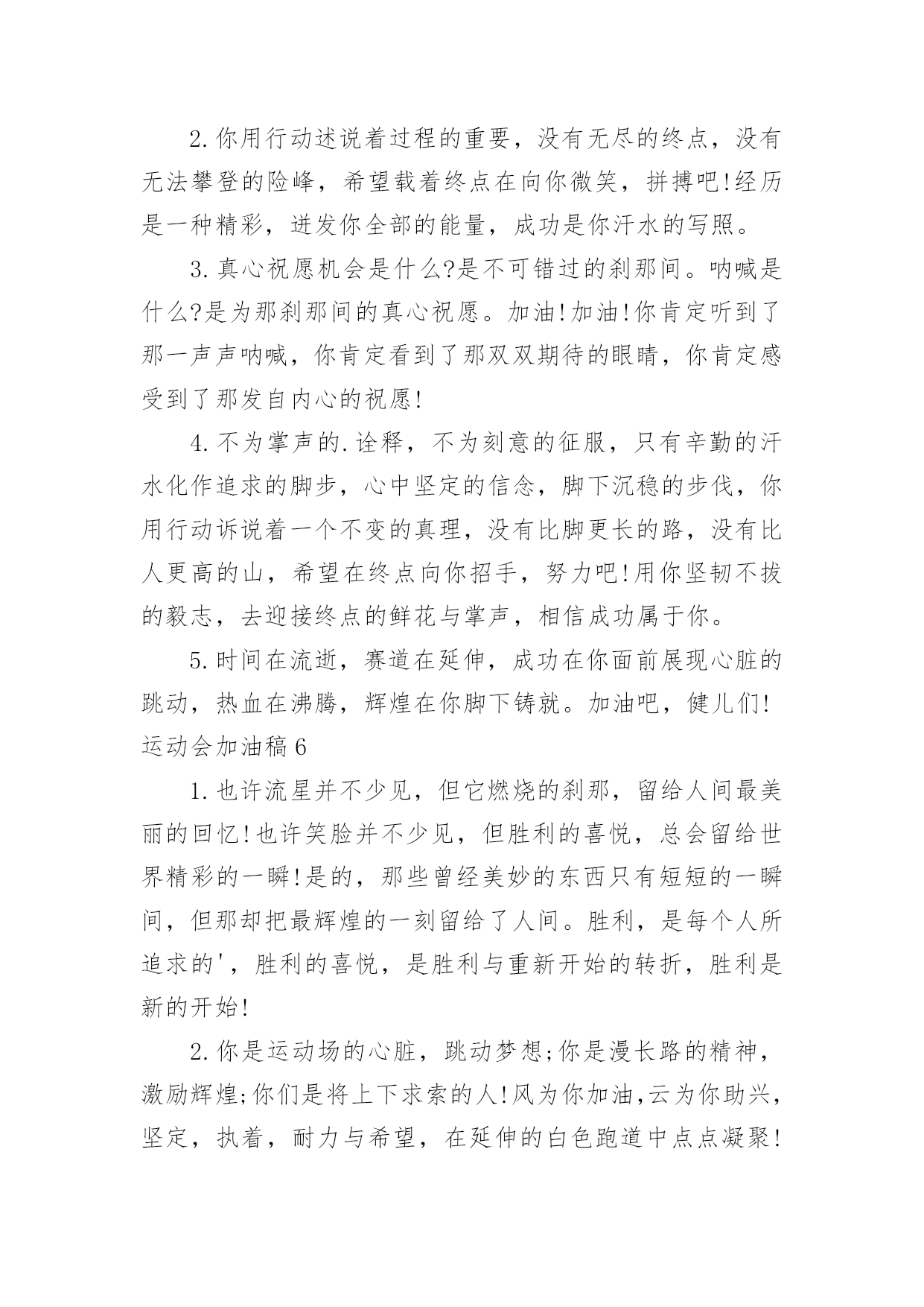 运动会加油稿运动会加油稿集合(15篇)在社会发展不断提速的今天,需要使用加油稿的情境愈发增多,加油稿可以起到活跃气氛的作用。那么你有了解过加油稿吗?下面是小编收集整理的运动会加油稿,欢迎大家借鉴与参考,希望对大家有所帮助。运动会加油稿1不为掌声的注释,不为刻意的征服,不为失败的痛苦,仅有辛勤的`汗水,化作成功的脚步!在竞技场上,你付出汗水,释放光芒;辛勤耕耘,收获成果;为别人喝彩,以努力拼搏激励自我,感动他人。时间在流逝,赛道在延伸,成功在你面前展现,心脏在跳动,热血在沸腾,辉煌在你脚下铸就。加油吧,健儿们!运动会加油稿2每一份辛劳都有一份收获,每一次的痛苦都是快乐的开始,没一声呐喊都是力量的呼唤。我们有着大浪拍岸的豪迈,所以你不必在乎小荷初露的恬静。我们有着春日的阳光明媚,所以不用去羡慕冬日乱玉碎琼。我们是雨天的一把伞,是寒冷冬日里的一盆碳火,温暖的`不只是你我,而是大家的心。运动场上的健儿,掌声属于你们,鲜花属于你们,成功也是属于你们!运动会加油稿3加油,加油,加油!希望你们能获得优异的结果,如何无论,我们都会支持你的。看到你们努力的样子,我真得很感动。谢谢你们的坚持。我明白成功并不是每个运动员都能获得,看到赛后你们痛苦的`表情,我真得很为难,不知应该鼓励你们还是安慰你们。成功的花终会绽放,不在此时便是彼时。运动会加油稿41、——致100米运动员运动场上有你们的步伐,那是辛苦汗水的抒发,你就像天边的云端,有彩霞的绚丽色彩。奔驰的骏马,飞奔的步伐让你的胜利在前方等待。为你们祝福,为你们喝彩!2、致运动员矫健的身姿,飞奔的身影,一道道亮丽的风景线,辛勤的汗水,激动的泪水,还有伤心的`泪水,赛场上的奋力拼搏,成功者,取得了荣誉,失败者,获得了尊重。班级,同学,老师,为你加油,加油吧!运动健儿。3、今天的你们英姿飒爽,今天的你们朝气蓬勃,今天的你们一马当先。相信自己,你是最棒的!不要放弃,不要气馁。成功永远属于你们。运动员~加油4、在黑白相间的跑道上,留下了你们灿烂的身影。在枪响的.那一刹那,似流星、似闪电,如骏马奔腾,如蛟龙腾空,如猛虎出洞,不在乎名次高低,不在乎成绩高下。努力拼搏,顽强奋斗,即使落后,也顽强不屈,永不退缩!运动会加油稿运动会广播稿运动会专题秋季运动会加油稿春季运动会加油稿运动会加油稿20字运动会加油稿30字运动会加油稿50字运动会加油稿100字运动会加油稿200字幼儿园运动会加油稿小学运动会加油稿中学运动会加油稿大学运动会加油稿运动会加油词5、运动场上有你们的飒爽英姿,运动场上有你们的拼搏身影,面对漫漫的征途,你没有畏惧和退缩。任汗水打湿脊背,任疲惫爬满全身,依然奋力追赶。只有一个目标,只有一个信念,为班级赢得荣誉。拼搏吧!我为你们呐喊!加油,加油!6、致200m运动员:200m,有一个人生的起点,200m,有一个人生的弯道,200m,有一段人生的冲刺200m,有一个辉煌的胜利,200m,只刹那一瞬间,却成就一段永恒的胜利,200m,只弯过一个转折,却折出多少汗水冲向你那光辉煌的胜利吧,跨过那一瞬,转过那道弯,胜利在向你招手7、有多少次挥汗如雨,伤痛曾添满记忆,只因为始终相信,去拼搏才能胜利。总在鼓舞自己,要成功就得努力。热血在赛场沸腾,巨人在赛场升起。相信自己,你将赢得胜利,创造奇迹;相信自己,梦想在你手中,这是你的天地。当一切过去,你们将是第一。相信自己,你们将超越极限,超越自己!相信自己,加油吧,健儿们,相信你自己。运动会加油稿51.场上英姿显自豪,脚下步伐在飞奔。你们是骄傲,你们是自豪,跑道因你幻彩,面对红色跑道,你们挥洒自如,不惧一切冲向终点!2.你用行动述说着过程的重要,没有无尽的终点,没有无法攀登的险峰,希望载着终点在向你微笑,拼搏吧!经历是一种精彩,迸发你全部的能量,成功是你汗水的写照。3.真心祝愿机会是什么?是不可错过的刹那间。呐喊是什么?是为那刹那间的真心祝愿。加油!加油!你肯定听到了那一声声呐喊,你肯定看到了那双双期待的眼睛,你肯定感受到了那发自内心的祝愿!4.不为掌声的.诠释,不为刻意的征服,只有辛勤的汗水化作追求的脚步,心中坚定的信念,脚下沉稳的步伐,你用行动诉说着一个不变的真理,没有比脚更长的路,没有比人更高的山,希望在终点向你招手,努力吧!用你坚韧不拔的毅志,去迎接终点的鲜花与掌声,相信成功属于你。5.时间在流逝,赛道在延伸,成功在你面前展现心脏的跳动,热血在沸腾,辉煌在你脚下铸就。加油吧,健儿们!运动会加油稿61.也许流星并不少见,但它燃烧的刹那,留给人间最美丽的回忆!也许笑脸并不少见,但胜利的喜悦,总会留给世界精彩的一瞬!是的,那些曾经美妙的东西只有短短的一瞬间,但那却把最辉煌的一刻留给了人间。胜利,是每个人所追求的',胜利的喜悦,是胜利与重新开始的转折,胜利是新的开始!2