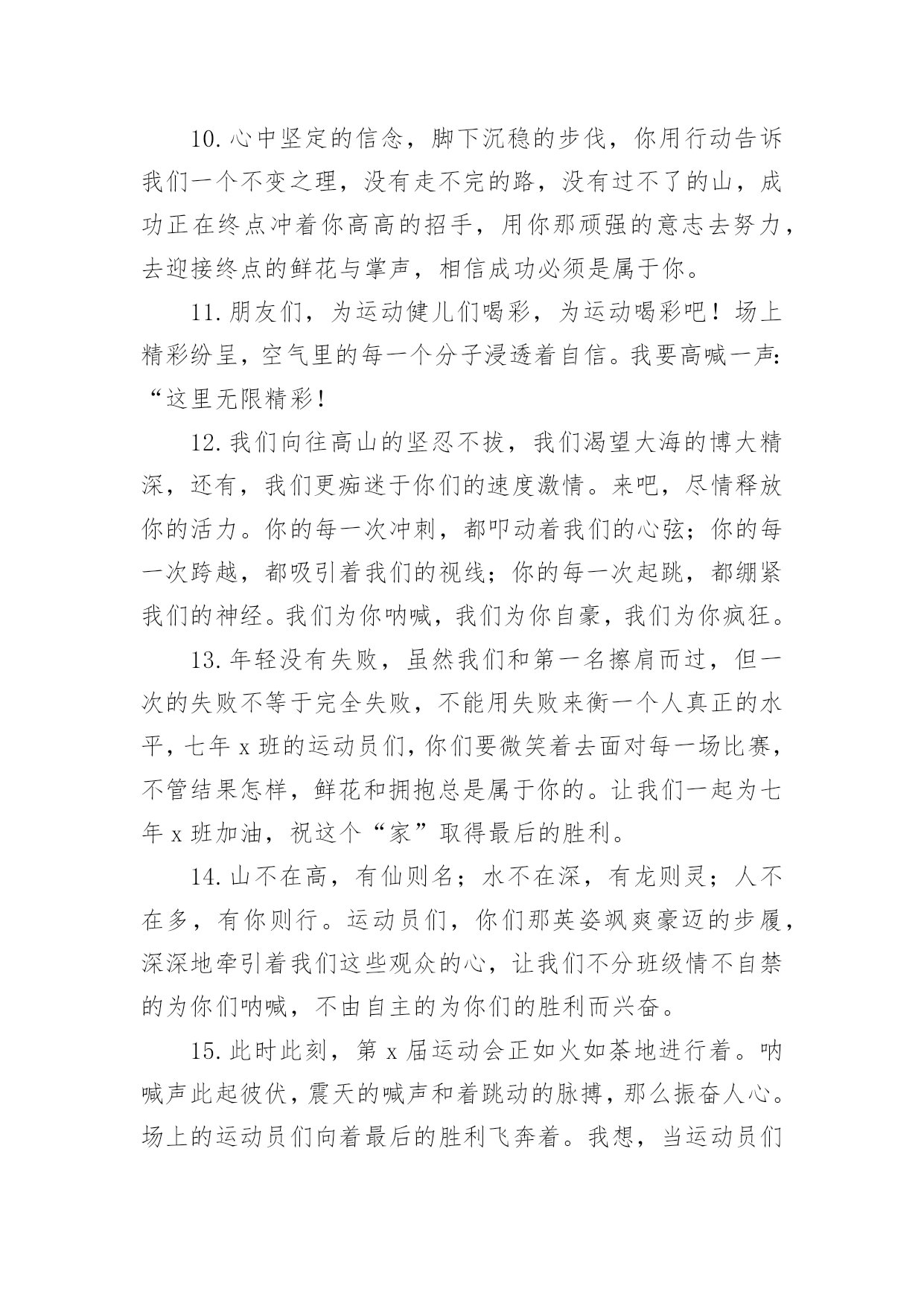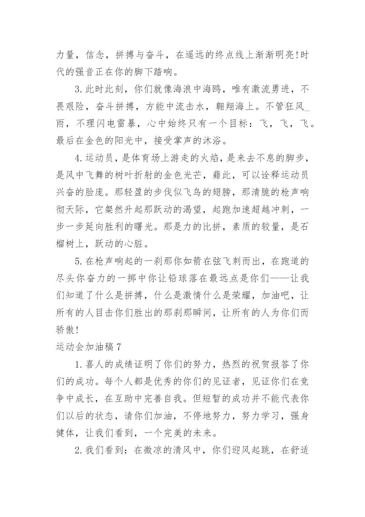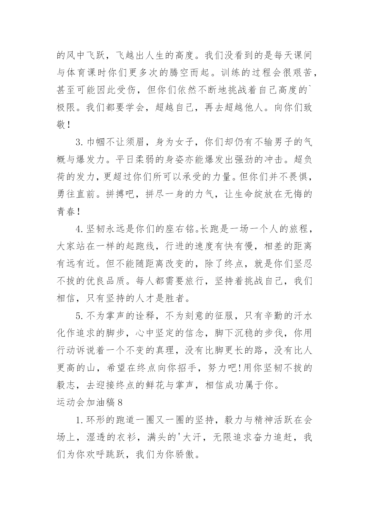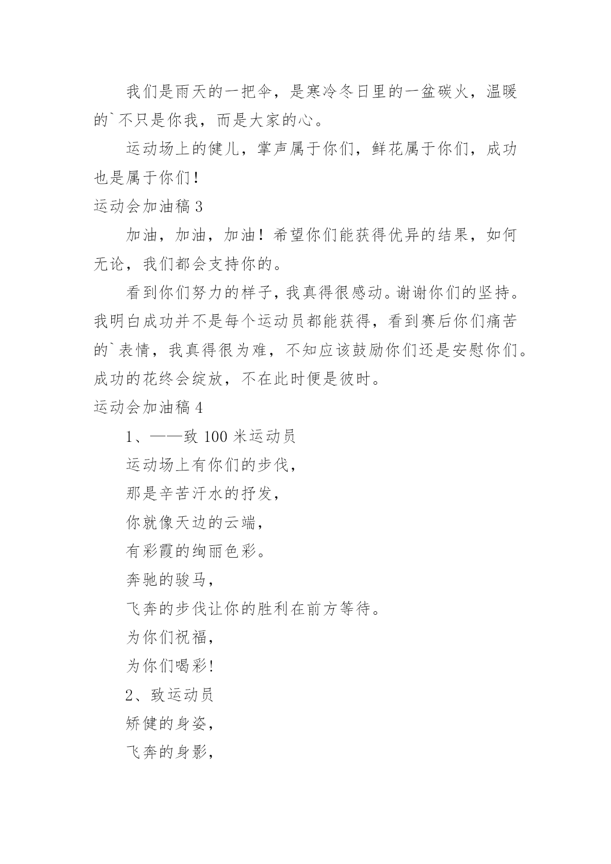 运动会加油稿运动会加油稿集合(15篇)在社会发展不断提速的今天,需要使用加油稿的情境愈发增多,加油稿可以起到活跃气氛的作用。那么你有了解过加油稿吗?下面是小编收集整理的运动会加油稿,欢迎大家借鉴与参考,希望对大家有所帮助。运动会加油稿1不为掌声的注释,不为刻意的征服,不为失败的痛苦,仅有辛勤的`汗水,化作成功的脚步!在竞技场上,你付出汗水,释放光芒;辛勤耕耘,收获成果;为别人喝彩,以努力拼搏激励自我,感动他人。时间在流逝,赛道在延伸,成功在你面前展现,心脏在跳动,热血在沸腾,辉煌在你脚下铸就。加油吧,健儿们!运动会加油稿2每一份辛劳都有一份收获,每一次的痛苦都是快乐的开始,没一声呐喊都是力量的呼唤。我们有着大浪拍岸的豪迈,所以你不必在乎小荷初露的恬静。我们有着春日的阳光明媚,所以不用去羡慕冬日乱玉碎琼。我们是雨天的一把伞,是寒冷冬日里的一盆碳火,温暖的`不只是你我,而是大家的心。运动场上的健儿,掌声属于你们,鲜花属于你们,成功也是属于你们!运动会加油稿3加油,加油,加油!希望你们能获得优异的结果,如何无论,我们都会支持你的。看到你们努力的样子,我真得很感动。谢谢你们的坚持。我明白成功并不是每个运动员都能获得,看到赛后你们痛苦的`表情,我真得很为难,不知应该鼓励你们还是安慰你们。成功的花终会绽放,不在此时便是彼时。运动会加油稿41、——致100米运动员运动场上有你们的步伐,那是辛苦汗水的抒发,你就像天边的云端,有彩霞的绚丽色彩。奔驰的骏马,飞奔的步伐让你的胜利在前方等待。为你们祝福,为你们喝彩!2、致运动员矫健的身姿,飞奔的身影,一道道亮丽的风景线,辛勤的汗水,激动的泪水,还有伤心的`泪水,赛场上的奋力拼搏,成功者,取得了荣誉,失败者,获得了尊重。班级,同学,老师,为你加油,加油吧!运动健儿。3、今天的你们英姿飒爽,今天的你们朝气蓬勃,今天的你们一马当先。相信自己,你是最棒的!不要放弃,不要气馁。成功永远属于你们。运动员~加油4、在黑白相间的跑道上,留下了你们灿烂的身影。在枪响的.那一刹那,似流星、似闪电,如骏马奔腾,如蛟龙腾空,如猛虎出洞,不在乎名次高低,不在乎成绩高下。努力拼搏,顽强奋斗,即使落后,也顽强不屈,永不退缩!运动会加油稿运动会广播稿运动会专题秋季运动会加油稿春季运动会加油稿运动会加油稿20字运动会加油稿30字运动会加油稿50字运动会加油稿100字运动会加油稿200字幼儿园运动会加油稿小学运动会加油稿中学运动会加油稿大学运动会加油稿运动会加油词5、运动场上有你们的飒爽英姿,运动场上有你们的拼搏身影,面对漫漫的征途,你没有畏惧和退缩。任汗水打湿脊背,任疲惫爬满全身,依然奋力追赶。只有一个目标,只有一个信念,为班级赢得荣誉。拼搏吧!我为你们呐喊!加油,加油!6、致200m运动员:200m,有一个人生的起点,200m,有一个人生的弯道,200m,有一段人生的冲刺200m,有一个辉煌的胜利,200m,只刹那一瞬间,却成就一段永恒的胜利,200m,只弯过一个转折,却折出多少汗水冲向你那光辉煌的胜利吧,跨过那一瞬,转过那道弯,胜利在向你招手7、有多少次挥汗如雨,伤痛曾添满记忆,只因为始终相信,去拼搏才能胜利。总在鼓舞自己,要成功就得努力。热血在赛场沸腾,巨人在赛场升起。相信自己,你将赢得胜利,创造奇迹;相信自己,梦想在你手中,这是你的天地。当一切过去,你们将是第一。相信自己,你们将超越极限,超越自己!相信自己,加油吧,健儿们,相信你自己。运动会加油稿51.场上英姿显自豪,脚下步伐在飞奔。你们是骄傲,你们是自豪,跑道因你幻彩,面对红色跑道,你们挥洒自如,不惧一切冲向终点!2.你用行动述说着过程的重要,没有无尽的终点,没有无法攀登的险峰,希望载着终点在向你微笑,拼搏吧!经历是一种精彩,迸发你全部的能量,成功是你汗水的写照。3.真心祝愿机会是什么?是不可错过的刹那间。呐喊是什么?是为那刹那间的真心祝愿。加油!加油!你肯定听到了那一声声呐喊,你肯定看到了那双双期待的眼睛,你肯定感受到了那发自内心的祝愿!4.不为掌声的.诠释,不为刻意的征服,只有辛勤的汗水化作追求的脚步,心中坚定的信念,脚下沉稳的步伐,你用行动诉说着一个不变的真理,没有比脚更长的路,没有比人更高的山,希望在终点向你招手,努力吧!用你坚韧不拔的毅志,去迎接终点的鲜花与掌声,相信成功属于你。5.时间在流逝,赛道在延伸,成功在你面前展现心脏的跳动,热血在沸腾,辉煌在你脚下铸就。加油吧,健儿们!运动会加油稿61.也许流星并不少见,但它燃烧的刹那,留给人间最美丽的回忆!也许笑脸并不少见,但胜利的喜悦,总会留给世界精彩的一瞬!是的,那些曾经美妙的东西只有短短的一瞬间,但那却把最辉煌的一刻留给了人间。胜利,是每个人所追求的',胜利的喜悦,是胜利与重新开始的转折,胜利是新的开始!2