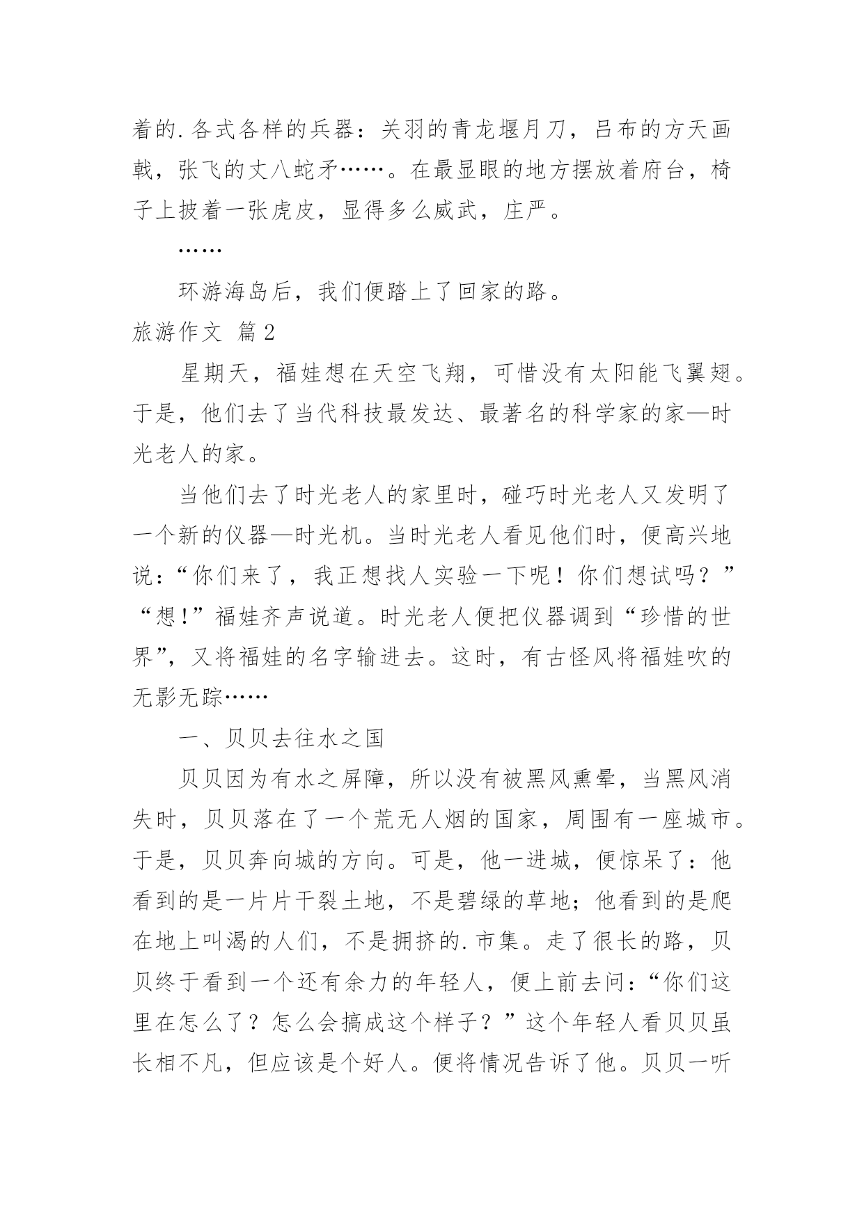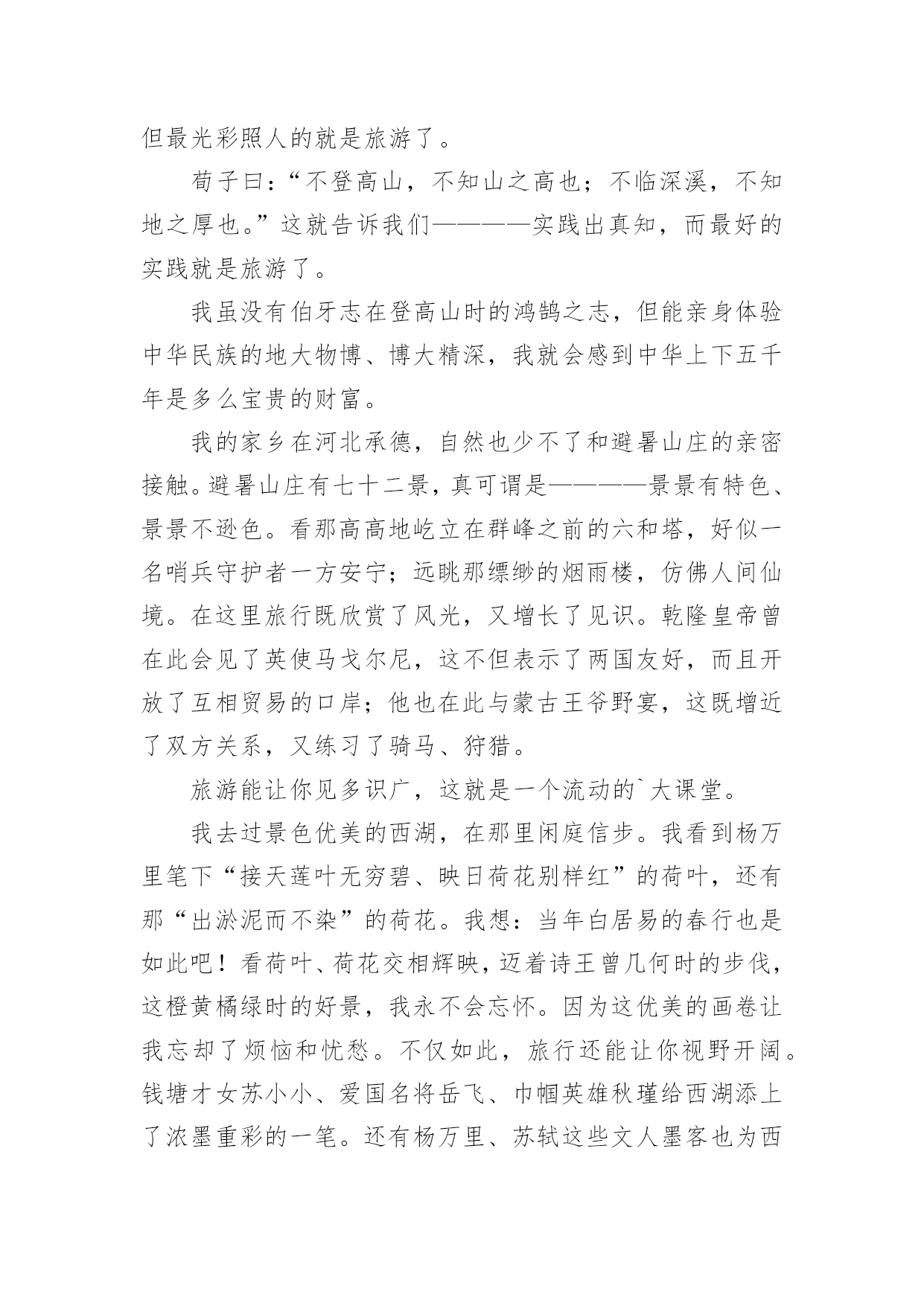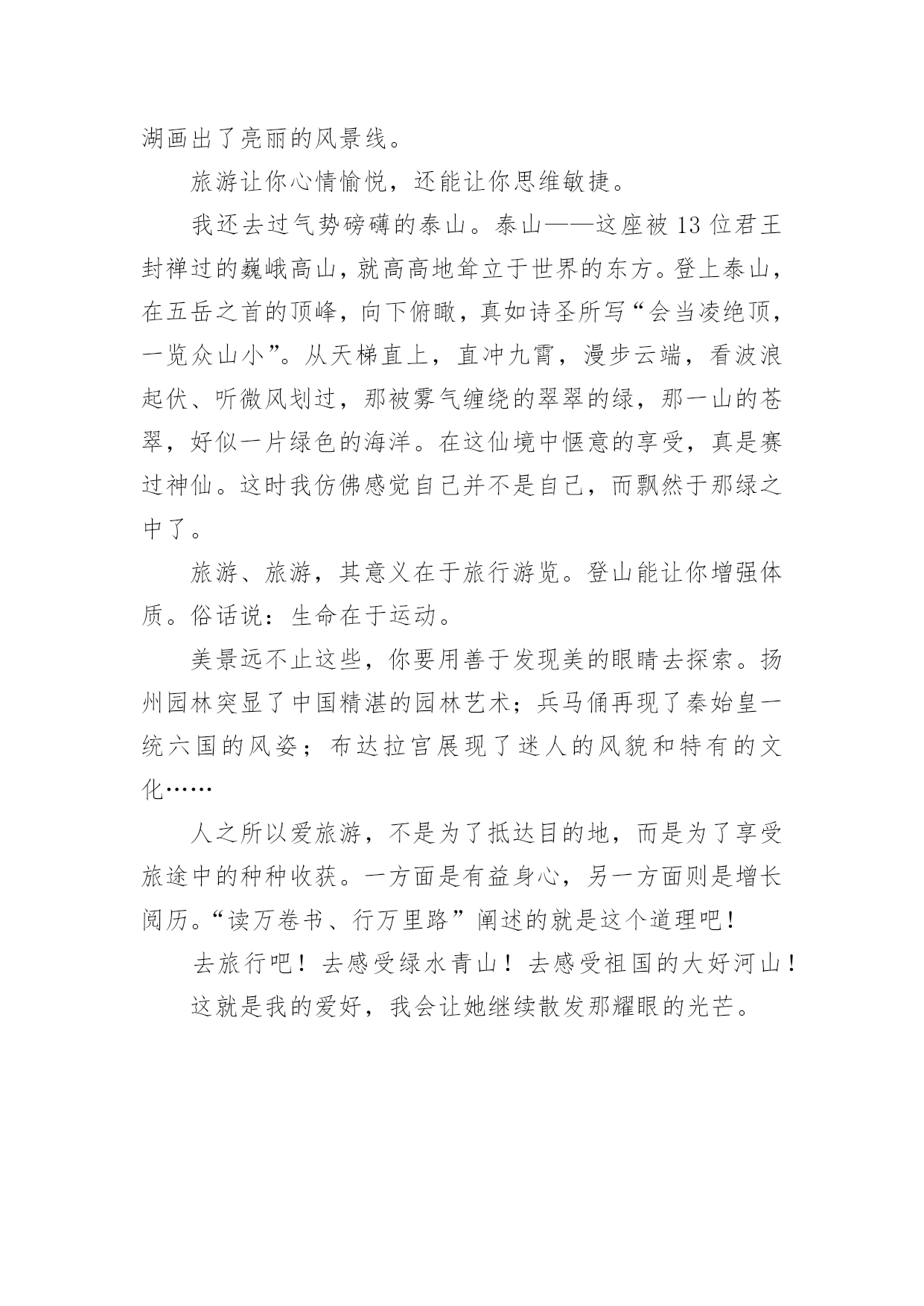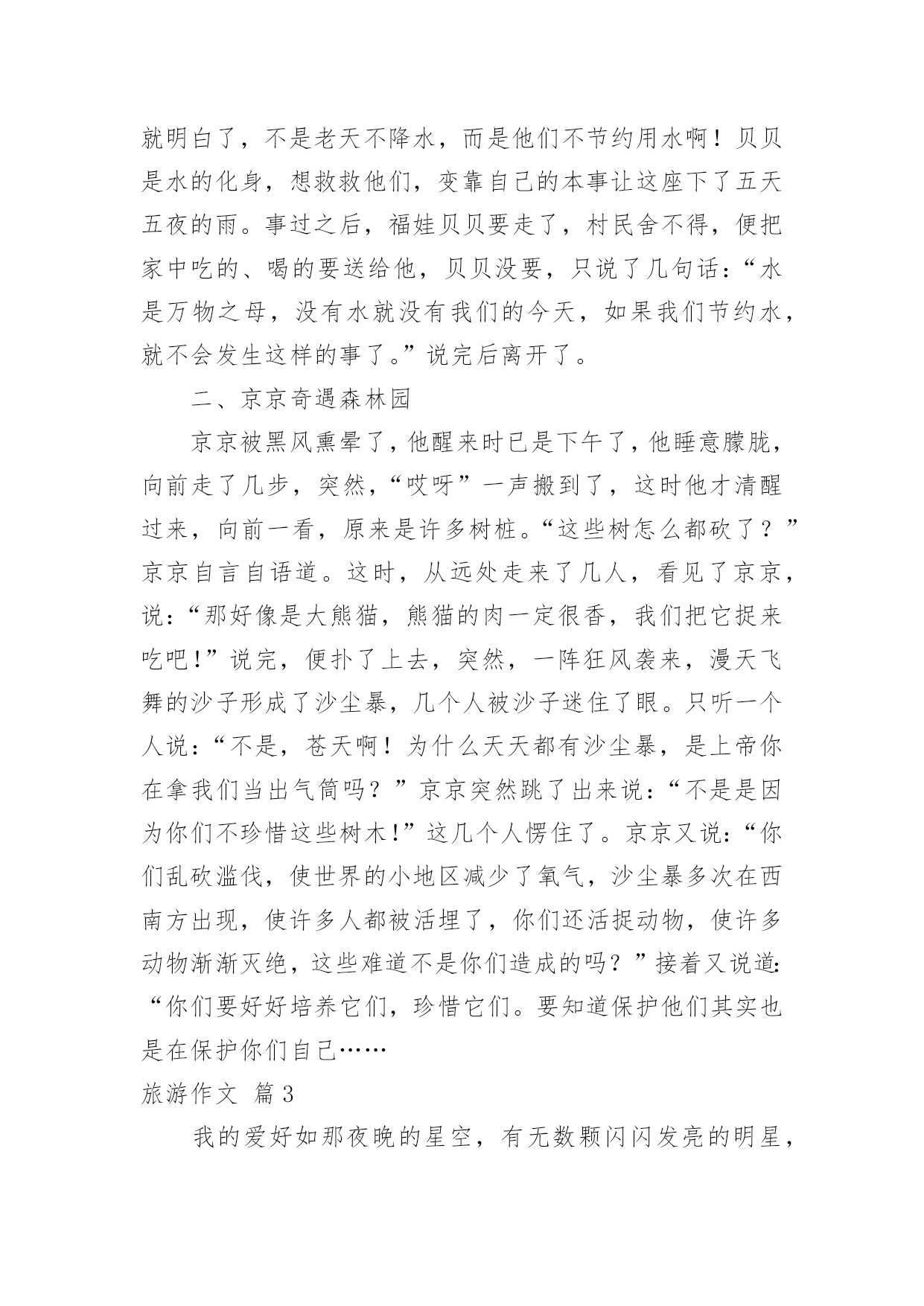 旅游作文实用的旅游作文3篇在学习、工作、生活中,大家都尝试过写作文吧,作文根据体裁的不同可以分为记叙文、说明文、应用文、议论文。那么问题来了,到底应如何写一篇优秀的作文呢?以下是小编精心整理的旅游作文3篇,希望对大家有所帮助。旅游作文篇1今天又是个高温日。即使这样,仍没能阻止我们前往南澳岛旅游的脚步。早上,不到7点钟,我们一家就出发了……半个多小时的车程后,我们便上了"南澳大桥"。往车窗外望,我们看到了波澜壮阔的大海,在蓝天的映衬下,海水是那样的湛蓝,那样的深邃,而"南澳大桥"却像是海天之间的一座"虹",相信到了华灯初上的夜晚,照明灯一亮,就真的像一座"彩虹"了。这不得不令我们惊叹!我想:当年建造大桥的工作人员们,他们一定经历并克服了千万磨难才能建造出这么一座雄伟壮观的跨海大桥吧!这应该是中国建桥史上又一得意的作品吧!踏上海岛,我们首先来到了南澳岛著名的景点之一——宋井。宋井井口不大,井沿呈四方形,不深,可井水却是清甜透凉的。更让游客震惊不已的是:井沿外的水是咸的,唯独井里的水是淡的。这怎不令人惊叹大自然的神奇呢?接着我们来到了总兵府。走进府衙,就能看到里面摆放着的.各式各样的兵器:关羽的青龙堰月刀,吕布的方天画戟,张飞的丈八蛇矛……。在最显眼的地方摆放着府台,椅子上披着一张虎皮,显得多么威武,庄严。……环游海岛后,我们便踏上了回家的路。旅游作文篇2星期天,福娃想在天空飞翔,可惜没有太阳能飞翼翅。于是,他们去了当代科技最发达、最著名的科学家的家—时光老人的家。当他们去了时光老人的家里时,碰巧时光老人又发明了一个新的仪器—时光机。当时光老人看见他们时,便高兴地说:“你们来了,我正想找人实验一下呢!你们想试吗?”“想!”福娃齐声说道。时光老人便把仪器调到“珍惜的世界”,又将福娃的名字输进去。这时,有古怪风将福娃吹的无影无踪……一、贝贝去往水之国贝贝因为有水之屏障,所以没有被黑风熏晕,当黑风消失时,贝贝落在了一个荒无人烟的国家,周围有一座城市。于是,贝贝奔向城的方向。可是,他一进城,便惊呆了:他看到的是一片片干裂土地,不是碧绿的草地;他看到的是爬在地上叫渴的人们,不是拥挤的.市集。走了很长的路,贝贝终于看到一个还有余力的年轻人,便上前去问:“你们这里在怎么了?怎么会搞成这个样子?”这个年轻人看贝贝虽长相不凡,但应该是个好人。便将情况告诉了他。贝贝一听就明白了,不是老天不降水,而是他们不节约用水啊!贝贝是水的化身,想救救他们,变靠自己的本事让这座下了五天五夜的雨。事过之后,福娃贝贝要走了,村民舍不得,便把家中吃的、喝的要送给他,贝贝没要,只说了几句话:“水是万物之母,没有水就没有我们的今天,如果我们节约水,就不会发生这样的事了。”说完后离开了。二、京京奇遇森林园京京被黑风熏晕了,他醒来时已是下午了,他睡意朦胧,向前走了几步,突然,“哎呀”一声搬到了,这时他才清醒过来,向前一看,原来是许多树桩。“这些树怎么都砍了?”京京自言自语道。这时,从远处走来了几人,看见了京京,说:“那好像是大熊猫,熊猫的肉一定很香,我们把它捉来吃吧!”说完,便扑了上去,突然,一阵狂风袭来,漫天飞舞的沙子形成了沙尘暴,几个人被沙子迷住了眼。只听一个人说:“不是,苍天啊!为什么天天都有沙尘暴,是上帝你在拿我们当出气筒吗?”京京突然跳了出来说:“不是是因为你们不珍惜这些树木!”这几个人愣住了。京京又说:“你们乱砍滥伐,使世界的小地区减少了氧气,沙尘暴多次在西南方出现,使许多人都被活埋了,你们还活捉动物,使许多动物渐渐灭绝,这些难道不是你们造成的吗?”接着又说道:“你们要好好培养它们,珍惜它们。要知道保护他们其实也是在保护你们自己……旅游作文篇3我的爱好如那夜晚的星空,有无数颗闪闪发亮的明星,但最光彩照人的就是旅游了。荀子曰:“不登高山,不知山之高也;不临深溪,不知地之厚也。”这就告诉我们————实践出真知,而最好的实践就是旅游了。我虽没有伯牙志在登高山时的鸿鹄之志,但能亲身体验中华民族的地大物博、博大精深,我就会感到中华上下五千年是多么宝贵的财富。我的家乡在河北承德,自然也少不了和避暑山庄的亲密接触。避暑山庄有七十二景,真可谓是————景景有特色、景景不逊色。看那高高地屹立在群峰之前的六和塔,好似一名哨兵守护者一方安宁;远眺那缥缈的烟雨楼,仿佛人间仙境。在这里旅行既欣赏了风光,又增长了见识。乾隆皇帝曾在此会见了英使马戈尔尼,这不但表示了两国友好,而且开放了互相贸易的口岸;他也在此与蒙古王爷野宴,这既增近了双方关系,又练习了骑马、狩猎。旅游能让你见多识广,这就是一个流动的`大课堂。我去过景色优美的西湖,在那里闲庭信步。我看到杨万里笔下“接天莲叶无穷碧、映日荷花别样红”的荷叶,还有那“出淤泥而不染”的荷花。我想:当年白居易的春行也是如此吧!看荷叶、荷花交相辉映,迈着诗
