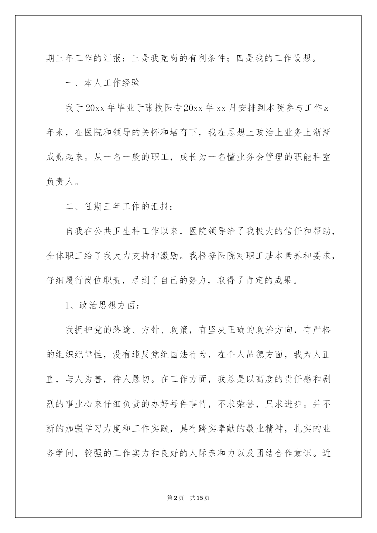 第PAGE\*Arabic\*MERGEFORMAT15页共NUMPAGES\*Arabic\*MERGEFORMAT15页第PAGE\*MERGEFORMAT15页共NUMPAGES\*MERGEFORMAT15页第PAGE\*MERGEFORMAT15页共NUMPAGES\*MERGEFORMAT15页第PAGE\*MERGEFORMAT15页共NUMPAGES\*MERGEFORMAT15页第PAGE\*MERGEFORMAT15页共NUMPAGES\*MERGEFORMAT15页第PAGE\*MERGEFORMAT15页共NUMPAGES\*MERGEFORMAT15页第PAGE\*MERGEFORMAT15页共NUMPAGES\*MERGEFORMAT15页第PAGE\*MERGEFORMAT15页共NUMPAGES\*MERGEFORMAT15页第PAGE\*MERGEFORMAT15页共NUMPAGES\*MERGEFORMAT15页第PAGE\*MERGEFORMAT15页共NUMPAGES\*MERGEFORMAT15页第PAGE\*MERGEFORMAT15页共NUMPAGES\*MERGEFORMAT15页2022公共卫生岗位竞聘演讲稿公共卫生岗位竞聘演讲稿演讲稿是作为在特定的情境中供口语表达运用的文稿。在充溢活力,日益开放的今日,越来越多人会去运用演讲稿,那要怎么写好演讲稿呢?下面是我为大家收集的公共卫生岗位竞聘演讲稿,供大家参考借鉴,希望可以帮助到有须要的挚友。公共卫生岗位竞聘演讲稿1敬重的各位领导、同事:大家好!我特别荣幸能有这样一个机会,在各位领导和同志们面前做竞聘演讲。竞争,是一个永恒的话题。在人类历史乃至整个自己界的进化中,无时无刻不存在着竞争,“物竞天择,适者生存”,达尔文道出了自然进化的法则,从肯定意义上说,它是竞争的法则。今日我站在这里参与竞聘,心里特别激烈。我要感谢在座各位领导能够给我这个机会。我今日演讲的内容分为四个部分:一是我的工作简历;二是我任期三年工作的汇报;三是我竞岗的有利条件;四是我的工作设想。一、本人工作经验我于20xx年毕业于张掖医专,20xx年xx月安排到本院参与工作。x年来,在医院和领导的关怀和培育下,我在思想上政治上业务上渐渐成熟起来。从一名一般的职工,成长为一名懂业务会管理的职能科室负责人。二、任期三年工作的汇报:自我在公共卫生科工作以来,医院领导给了我极大的信任和帮助,全体职工给了我大力支持和激励。我根据医院对职工基本素养和要求,仔细履行岗位职责,尽到了自己的努力,取得了肯定的成果。1、政治思想方面:我拥护党的路途、方针、政策,有坚决正确的政治方向,有严格的组织纪律性,没有违反党纪国法行为,在个人品德方面,我为人正直,与人为善,待人恳切。在工作方面,我总是以高度的责任感和剧烈的事业心来仔细负责的办好每件事情,不求荣誉,只求进步。并不断的加强学习力度和工作实践,具有踏实奉献的敬业精神,扎实的业务学问,较强的工作实力和良好的人际亲和力以及团结合作意识。近些年来,我深知在学问更新飞速的年头要不断的学习、装备自己,因此,努力在各方面充溢自己。2、工作业绩方面:在分管领导的领导下,根据工会各项职能,重点做了以下几方面工作。3、充分发挥公共卫生科作用。一年来,逐步健全和完善了公共卫生制度,做到了一月至少一次例会,将医院的各项公共卫生工作都通过大家协商,贯彻实施;主动开展公共卫生服务工作,协作医院进一步健全和完善了公共卫生的各项制度,增加了工作的透亮度,不断推动了医院公共卫生。4、努力为群众办实事、办好事。作为公共卫生科的干职工,我坚固树立群众利益无小事的思想,把服务工作做到实处,尽力维护职工的利益,体现“以人为本”,构建“和谐医院”的思想,体现医院的关怀,起到凝合人心,激发工作热忱的作用,得到领导和职工的好评和激励。5、发挥公共卫生的特长。以创建“学习型医院、争做学问型职工”活动为目标,与有关科室协作开展了岗位练兵、技能培训、读书月活动,努力营造学学问、学技术的氛围。针对医院女职工多的特点,在临床各科室及门诊部开展了创建巾帼示范岗的活动。通过活动的开展,提高了职工思想文化素养,医疗质量和服务水平,为广阔人民群众健康供应良好的医疗保障。三、竞岗的有利条件一是我的敬业精神比较强,工作仔细负责,勤勤恳恳,任劳任怨,干一行,爱一行,专一行。这是干好工作的基础。二是我的思想比较解放,接受新事物比较快,爱学习,勤思索,工作中留意发挥主观能动性,超前意识强。这有利于开拓工作新局面。三是我办事稳妥,处世严谨,原则性较强,能够严格要求