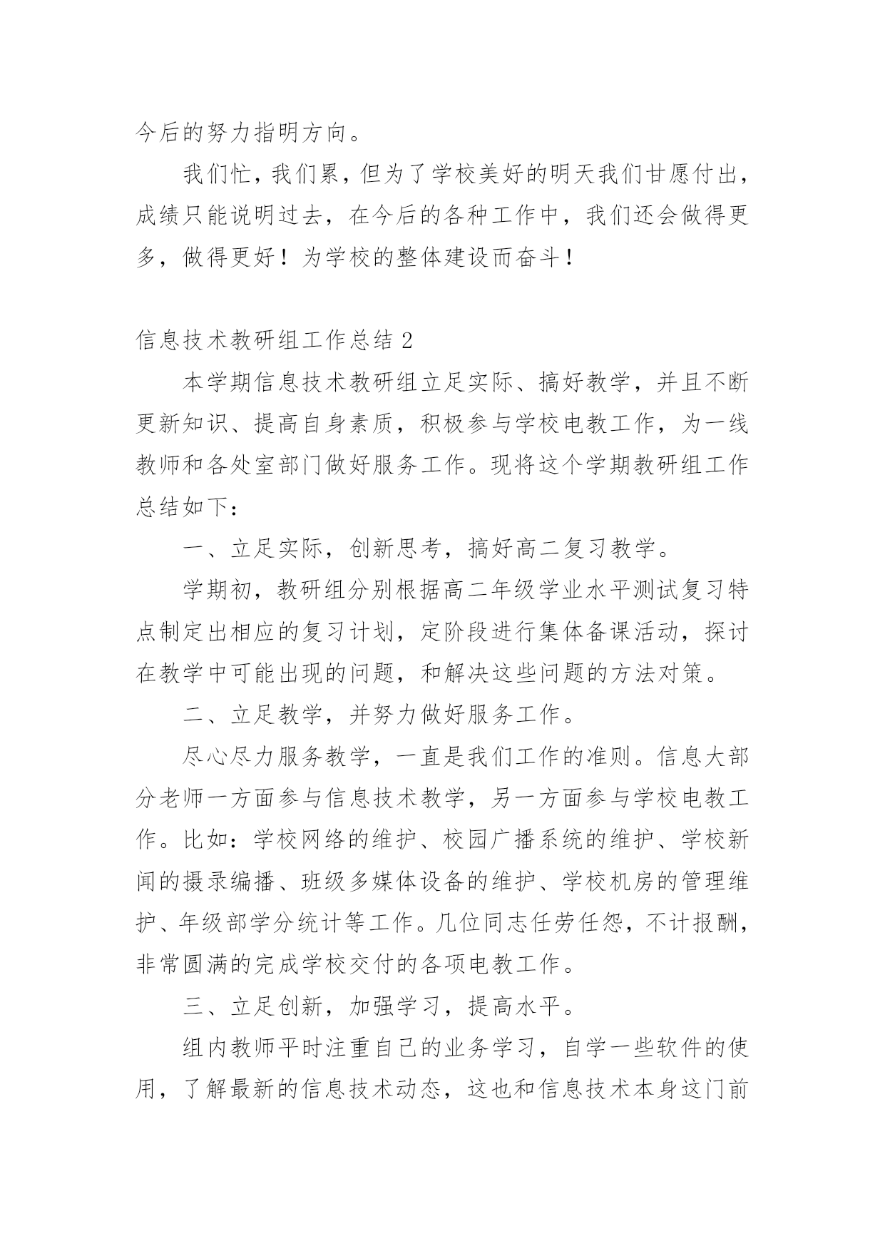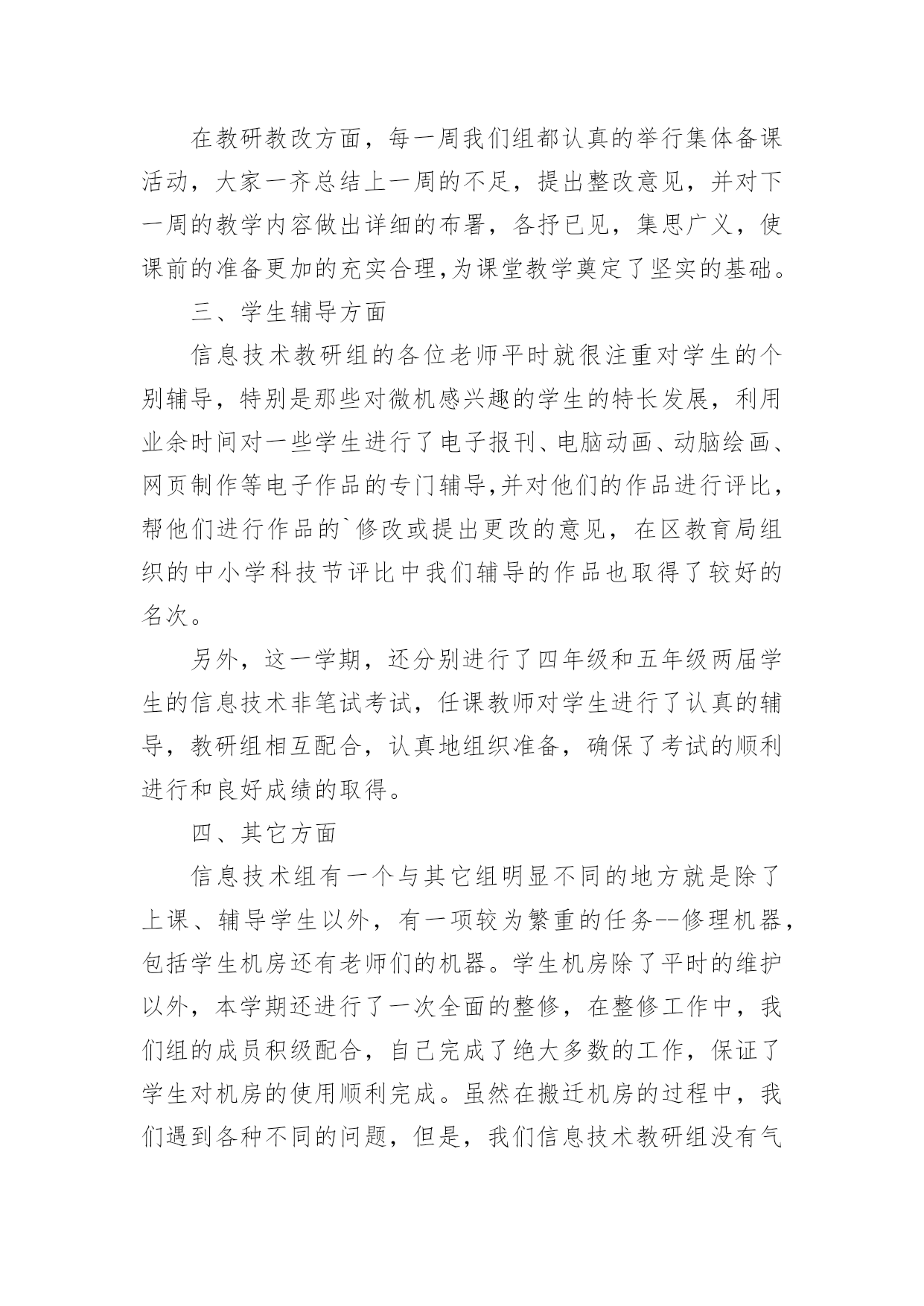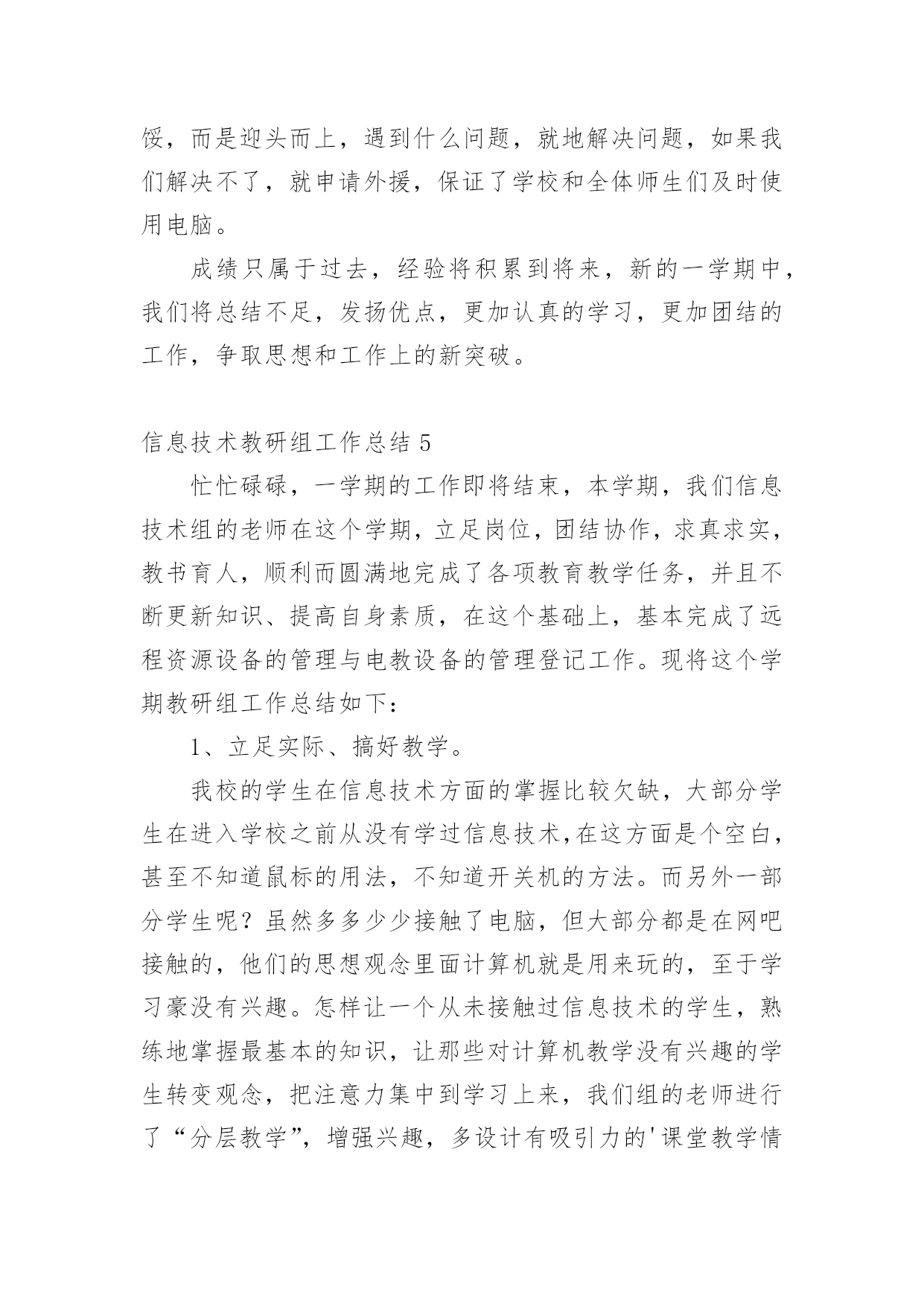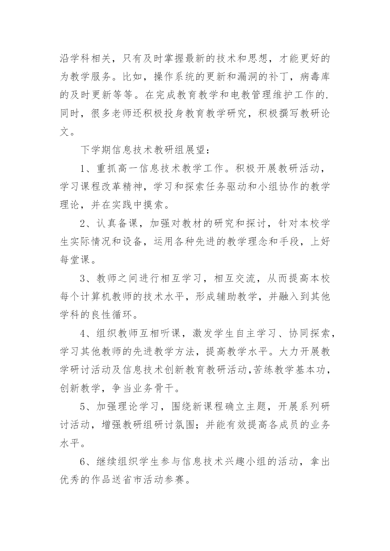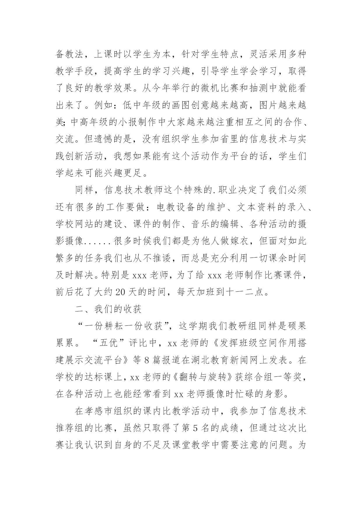 信息技术教研组工作总结总结在一个时期、一个年度、一个阶段对学习和工作生活等情况加以回顾和分析的一种书面材料,它可使零星的、肤浅的、表面的感性认知上升到全面的、系统的、本质的理性认识上来,让我们一起认真地写一份总结吧。总结怎么写才不会流于形式呢?下面是小编为大家收集的信息技术教研组工作总结,仅供参考,欢迎大家阅读。信息技术教研组工作总结1忙碌而充实的一学期转眼即逝,本学期,我们教研组认真落实学校的工作计划,团结协作、立足岗位、求真求实、教书育人,顺利而圆满地完成了各项教育教学任务。下面我们从两个方面来总结这学期的工作:一、我们的付出根据学校的工作计划,我们在学期初就及时制定了信息技术学科合理的工作计划、教学进度,并在实际工作中有计划有步骤地得到贯彻和落实。虽然每周一次的教研时间经常被各种其他活动所冲挤,但只要有时间,我们总会聚在一起进行对平时教学中遇到的问题及时交流。在实际教学中,我们继续抓好各种教学常规,建立规范、严格的机房管理制度,并且设立了多种登记表,做到有检查、有记录。每节课课前,我们都认真备学生、备教材、备素材、备教法,上课时以学生为本,针对学生特点,灵活采用多种教学手段,提高学生的学习兴趣,引导学生学会学习,取得了良好的教学效果。从今年举行的微机比赛和抽测中就能看出来了。例如:低中年级的画图创意越来越高,图片越来越美;中高年级的小报制作中大家越来越注重相互之间的合作、交流。但遗憾的是,没有组织学生参加省里的信息技术与实践创新活动,我想如果能有这个活动作为平台的话,学生们学起来可能兴趣更足。同样,信息技术教师这个特殊的.职业决定了我们必须还有很多的工作要做:电教设备的维护、文本资料的录入、学校网站的建设、课件的制作、音乐的编辑、各种活动的摄影摄像......很多时候我们都是为他人做嫁衣,但面对如此繁多的任务我们也从不推诿,而总是充分利用一切课余时间及时解决。特别是xxx老师,为了给xxx老师制作比赛课件,前后花了大约20天的时间,每天加班到十一二点。二、我们的收获“一份耕耘一份收获”,这学期我们教研组同样是硕果累累。“五优”评比中,xx老师的《发挥班级空间作用搭建展示交流平台》等8篇报道在湖北教育新闻网上发表。在学校的达标课上,xx老师的《翻转与旋转》获综合组一等奖,在各种活动上也能经常看到xx老师摄像时忙碌的身影。在孝感市组织的课内比教学活动中,我参加了信息技术推荐组的比赛,虽然只取得了第5名的成绩,但通过这次比赛让我认识到自身的不足及课堂教学中需要注意的问题。为今后的努力指明方向。我们忙,我们累,但为了学校美好的明天我们甘愿付出,成绩只能说明过去,在今后的各种工作中,我们还会做得更多,做得更好!为学校的整体建设而奋斗!信息技术教研组工作总结2本学期信息技术教研组立足实际、搞好教学,并且不断更新知识、提高自身素质,积极参与学校电教工作,为一线教师和各处室部门做好服务工作。现将这个学期教研组工作总结如下:一、立足实际,创新思考,搞好高二复习教学。学期初,教研组分别根据高二年级学业水平测试复习特点制定出相应的复习计划,定阶段进行集体备课活动,探讨在教学中可能出现的问题,和解决这些问题的方法对策。二、立足教学,并努力做好服务工作。尽心尽力服务教学,一直是我们工作的准则。信息大部分老师一方面参与信息技术教学,另一方面参与学校电教工作。比如:学校网络的维护、校园广播系统的维护、学校新闻的摄录编播、班级多媒体设备的维护、学校机房的管理维护、年级部学分统计等工作。几位同志任劳任怨,不计报酬,非常圆满的完成学校交付的各项电教工作。三、立足创新,加强学习,提高水平。组内教师平时注重自己的业务学习,自学一些软件的使用,了解最新的信息技术动态,这也和信息技术本身这门前沿学科相关,只有及时掌握最新的技术和思想,才能更好的为教学服务。比如,操作系统的更新和漏洞的补丁,病毒库的及时更新等等。在完成教育教学和电教管理维护工作的.同时,很多老师还积极投身教育教学研究,积极撰写教研论文。下学期信息技术教研组展望:1、重抓高一信息技术教学工作。积极开展教研活动,学习课程改革精神,学习和探索任务驱动和小组协作的教学理论,并在实践中摸索。2、认真备课,加强对教材的研究和探讨,针对本校学生实际情况和设备,运用各种先进的教学理念和手段,上好每堂课。3、教师之间进行相互学习,相互交流,从而提高本校每个计算机教师的技术水平,形成辅助教学,并融入到其他学科的良性循环。4、组织教师互相听课,激发学生自主学习、协同探索,学习其他教师的先进教学方法,提高教学水平。大力开展教学研讨活动及信息技术创新教育教研活动,苦练教学基本功,创新教学,争当业务骨干。5、加强理论学习,围绕新课程确立主题,开展系列研讨活动,增强教研组研讨氛围;并能有效提高各成员的业务水平。6、继续组织学