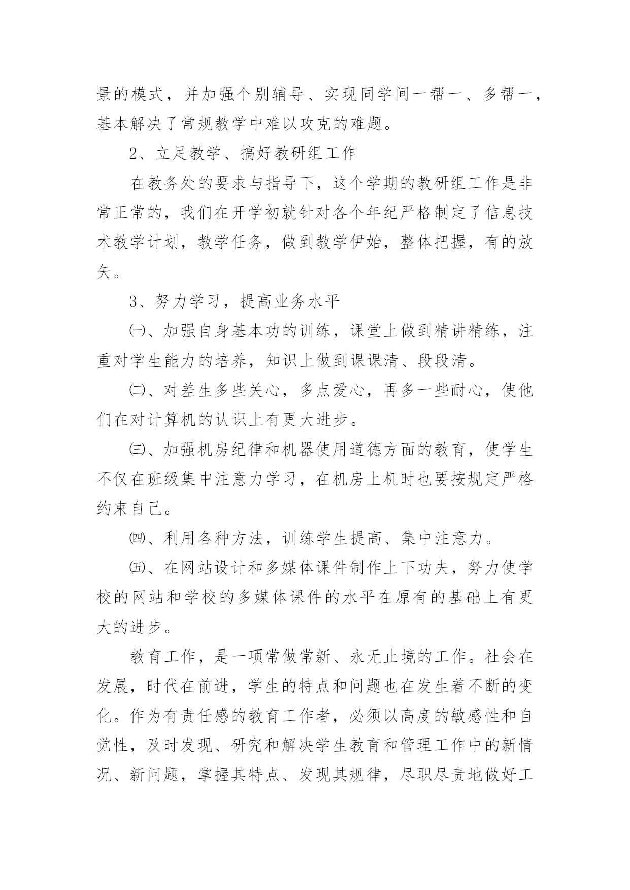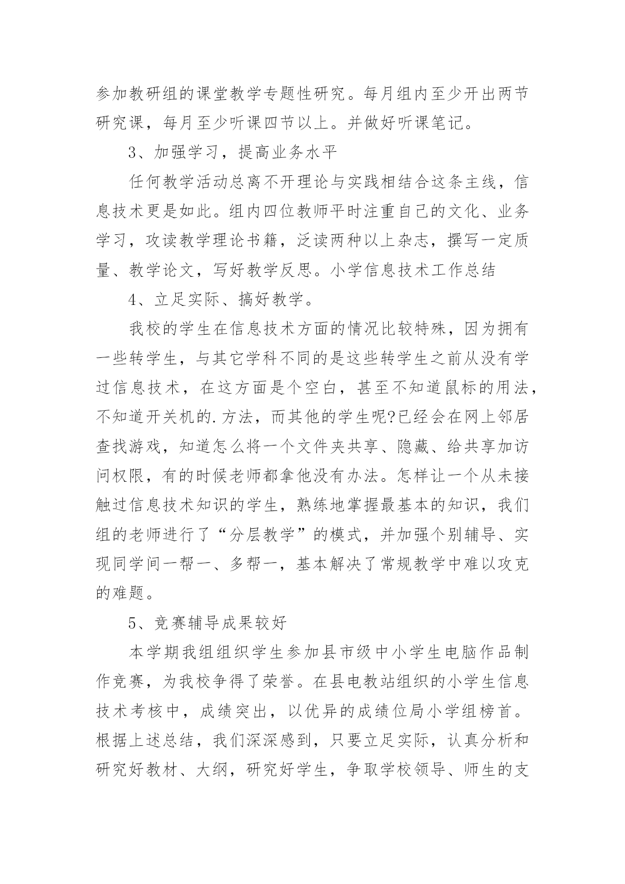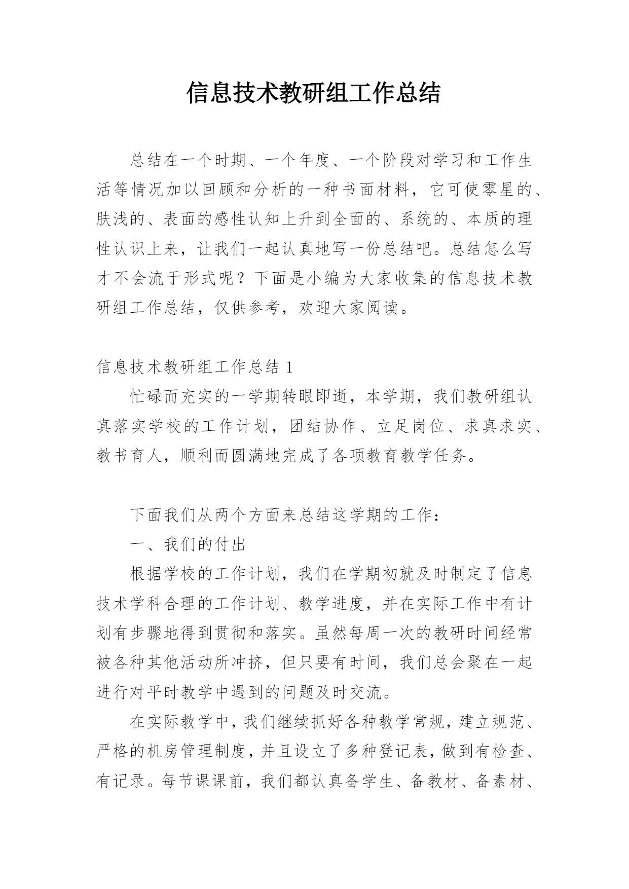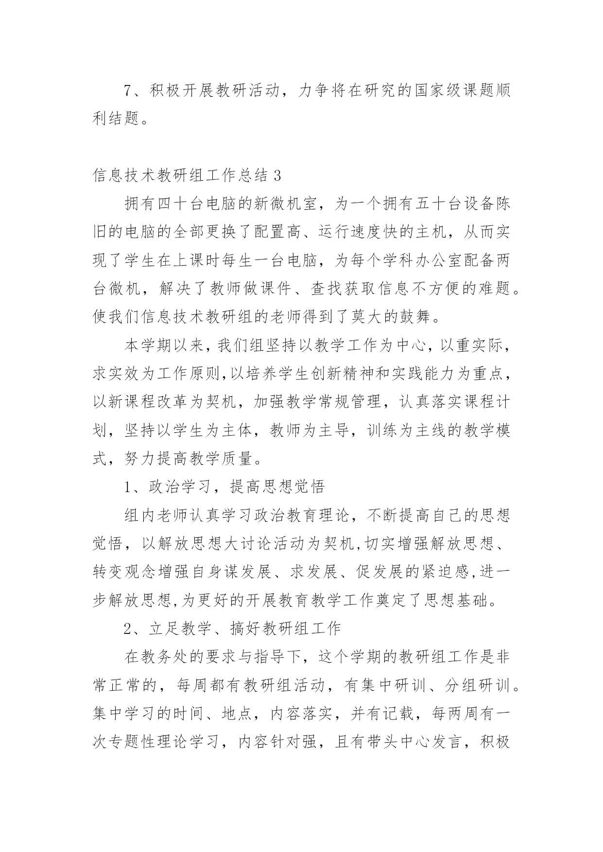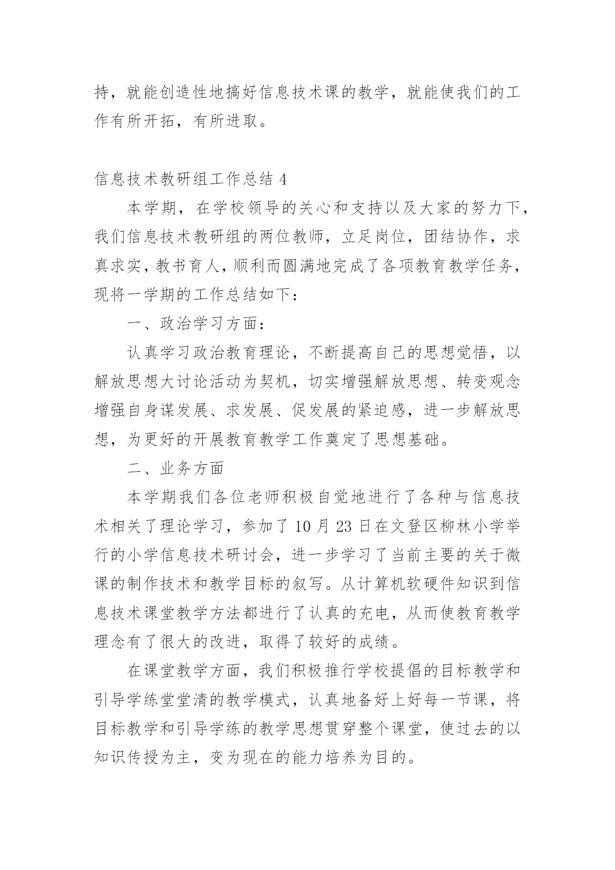 信息技术教研组工作总结总结在一个时期、一个年度、一个阶段对学习和工作生活等情况加以回顾和分析的一种书面材料,它可使零星的、肤浅的、表面的感性认知上升到全面的、系统的、本质的理性认识上来,让我们一起认真地写一份总结吧。总结怎么写才不会流于形式呢?下面是小编为大家收集的信息技术教研组工作总结,仅供参考,欢迎大家阅读。信息技术教研组工作总结1忙碌而充实的一学期转眼即逝,本学期,我们教研组认真落实学校的工作计划,团结协作、立足岗位、求真求实、教书育人,顺利而圆满地完成了各项教育教学任务。下面我们从两个方面来总结这学期的工作:一、我们的付出根据学校的工作计划,我们在学期初就及时制定了信息技术学科合理的工作计划、教学进度,并在实际工作中有计划有步骤地得到贯彻和落实。虽然每周一次的教研时间经常被各种其他活动所冲挤,但只要有时间,我们总会聚在一起进行对平时教学中遇到的问题及时交流。在实际教学中,我们继续抓好各种教学常规,建立规范、严格的机房管理制度,并且设立了多种登记表,做到有检查、有记录。每节课课前,我们都认真备学生、备教材、备素材、备教法,上课时以学生为本,针对学生特点,灵活采用多种教学手段,提高学生的学习兴趣,引导学生学会学习,取得了良好的教学效果。从今年举行的微机比赛和抽测中就能看出来了。例如:低中年级的画图创意越来越高,图片越来越美;中高年级的小报制作中大家越来越注重相互之间的合作、交流。但遗憾的是,没有组织学生参加省里的信息技术与实践创新活动,我想如果能有这个活动作为平台的话,学生们学起来可能兴趣更足。同样,信息技术教师这个特殊的.职业决定了我们必须还有很多的工作要做:电教设备的维护、文本资料的录入、学校网站的建设、课件的制作、音乐的编辑、各种活动的摄影摄像......很多时候我们都是为他人做嫁衣,但面对如此繁多的任务我们也从不推诿,而总是充分利用一切课余时间及时解决。特别是xxx老师,为了给xxx老师制作比赛课件,前后花了大约20天的时间,每天加班到十一二点。二、我们的收获“一份耕耘一份收获”,这学期我们教研组同样是硕果累累。“五优”评比中,xx老师的《发挥班级空间作用搭建展示交流平台》等8篇报道在湖北教育新闻网上发表。在学校的达标课上,xx老师的《翻转与旋转》获综合组一等奖,在各种活动上也能经常看到xx老师摄像时忙碌的身影。在孝感市组织的课内比教学活动中,我参加了信息技术推荐组的比赛,虽然只取得了第5名的成绩,但通过这次比赛让我认识到自身的不足及课堂教学中需要注意的问题。为今后的努力指明方向。我们忙,我们累,但为了学校美好的明天我们甘愿付出,成绩只能说明过去,在今后的各种工作中,我们还会做得更多,做得更好!为学校的整体建设而奋斗!信息技术教研组工作总结2本学期信息技术教研组立足实际、搞好教学,并且不断更新知识、提高自身素质,积极参与学校电教工作,为一线教师和各处室部门做好服务工作。现将这个学期教研组工作总结如下:一、立足实际,创新思考,搞好高二复习教学。学期初,教研组分别根据高二年级学业水平测试复习特点制定出相应的复习计划,定阶段进行集体备课活动,探讨在教学中可能出现的问题,和解决这些问题的方法对策。二、立足教学,并努力做好服务工作。尽心尽力服务教学,一直是我们工作的准则。信息大部分老师一方面参与信息技术教学,另一方面参与学校电教工作。比如:学校网络的维护、校园广播系统的维护、学校新闻的摄录编播、班级多媒体设备的维护、学校机房的管理维护、年级部学分统计等工作。几位同志任劳任怨,不计报酬,非常圆满的完成学校交付的各项电教工作。三、立足创新,加强学习,提高水平。组内教师平时注重自己的业务学习,自学一些软件的使用,了解最新的信息技术动态,这也和信息技术本身这门前沿学科相关,只有及时掌握最新的技术和思想,才能更好的为教学服务。比如,操作系统的更新和漏洞的补丁,病毒库的及时更新等等。在完成教育教学和电教管理维护工作的.同时,很多老师还积极投身教育教学研究,积极撰写教研论文。下学期信息技术教研组展望:1、重抓高一信息技术教学工作。积极开展教研活动,学习课程改革精神,学习和探索任务驱动和小组协作的教学理论,并在实践中摸索。2、认真备课,加强对教材的研究和探讨,针对本校学生实际情况和设备,运用各种先进的教学理念和手段,上好每堂课。3、教师之间进行相互学习,相互交流,从而提高本校每个计算机教师的技术水平,形成辅助教学,并融入到其他学科的良性循环。4、组织教师互相听课,激发学生自主学习、协同探索,学习其他教师的先进教学方法,提高教学水平。大力开展教学研讨活动及信息技术创新教育教研活动,苦练教学基本功,创新教学,争当业务骨干。5、加强理论学习,围绕新课程确立主题,开展系列研讨活动,增强教研组研讨氛围;并能有效提高各成员的业务水平。6、继续组织学