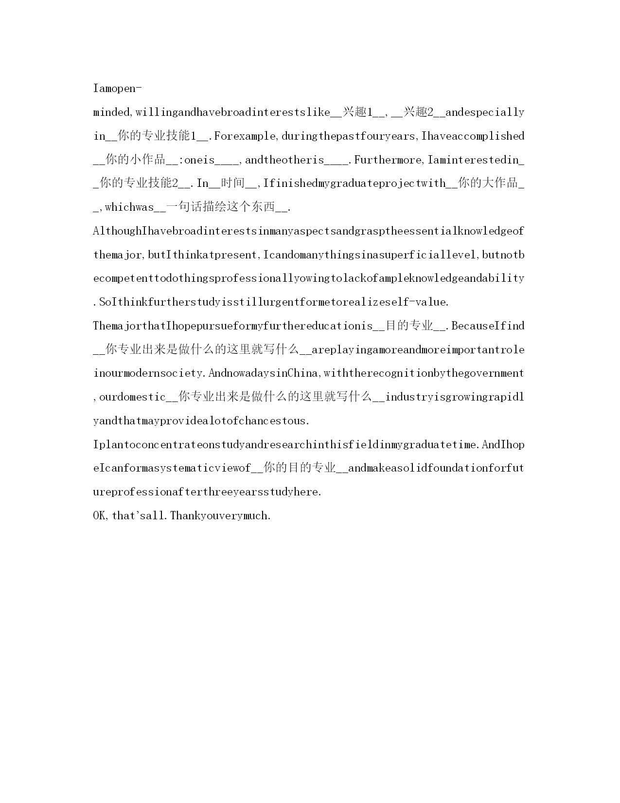 研究生复试英语自我介绍参考模板2篇假如你只是一个安静平凡的学渣,请用这篇。DearProfessors:Itismygreatpleasuretobehere.Mynameis__姓名__,graduatedfrom__专业__Departmentof__本科院校__University.Duringmyfour-yearstudyintheuniversityasanunder-graduatestudent,Ihavebuiltupasolidfoundationofprofessionalknowledge,aswellasarichexperienceofsocialactivities.Iamadeterminedperson,alwayswillingtoachievehighergoals.Whatsmore,Iamgoodatanalysis,withastrongsenseofcooperation.AlloftheseledmetothesuccessofpassingthefirstroundoftheentranceexaminationtotheMastersdegree.Personally,Iamveryhumorousandeasy-going,enjoyingagoodrelationshipamongmyclassmates.Inmysparetime,Iliketoreadbooksregardinghowtobemyselfandhowtodealwithproblems.Musicandmoviesaremyfavoriteentertainments.Asformysportinterest,Icouldnotdenymygreatestinterestisfootball.Playingthisgamebringsmealotofglory,happinessandpassion.Allinall,__目的院校__University,withahighlyqualifiedfacultyandstrongacademicenvironmentistheuniversityIhavelongadmired.IbelievethatIamaveryqualifiedapplicantforadmissionintoyourMasterof__目的专业__andcancontributetotheenrichmentordiversityofyouruniversity.THANKYOUFORYOURATTENTION!(239words)假如你是一个闪瞎导师眼的学霸,请用这篇。Goodmorning.Iamverygladtobehereforthisinterview.Firstletmeintroducemyself.Mynameis__姓名__,andmyEnglishnameis__英文名__.I'vefinishedmyundergraduateeducationin__本科院校__University,majoringin__本科专业__.Iamopen-minded,willingandhavebroadinterestslike__兴趣1__,__兴趣2__andespeciallyin__你的专业技能1__.Forexample,duringthepastfouryears,Ihaveaccomplished__你的小作品__:oneis____,andtheotheris____.Furthermore,Iaminterestedin__你的专业技能2__.In__时间__,Ifinishedmygraduateprojectwith__你的大作品__,whichwas__一句话描绘这个东西__.AlthoughIhavebroadinterestsinmanyaspectsandgrasptheessentialknowledgeofthemajor,butIthinkatpresent,Icandomanythingsinasuperficiallevel,butnotbecompetenttodothingsprofessionallyowingtolackofampleknowledgeandability.SoIthinkfurtherstudyisstillurgentformetorealizeself-value.ThemajorthatIhopepursueformyfurthereducationis__目的专业__.BecauseIfind__你专业出来是做什么的这里就写什么__areplayingamoreandm