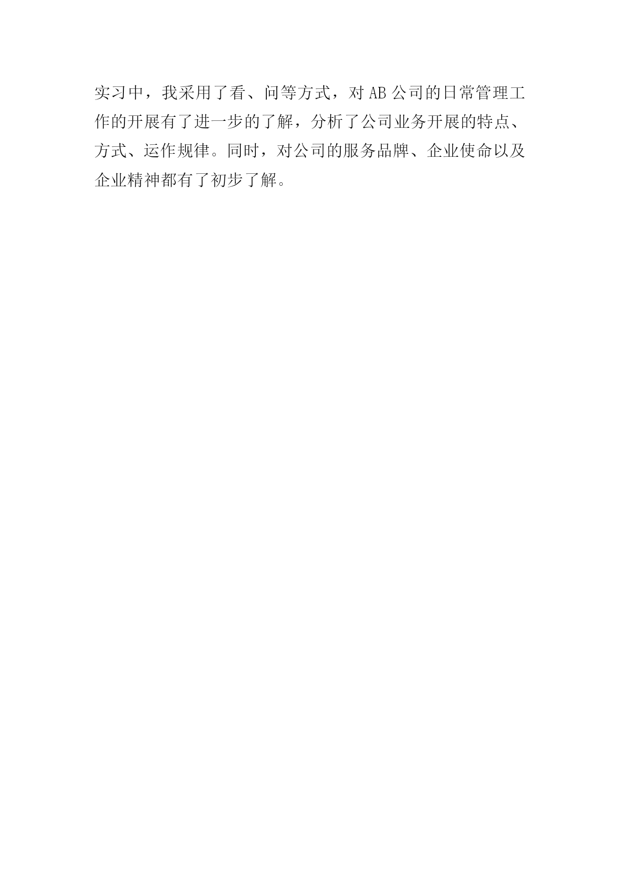 工商管理实习的自我鉴定今年开始,我在某工程公司附属单位AB公司进行了工商管理实习工作。在实习中,我在公司指导老师的热心指导下,积极参与公司日常管理相关工作,注意把书本上学到的工商管理理论知识对照实际工作,用理论知识加深对实际工作的认识,用实践验证所学的工商管理理论,探求日常管理工作的本质与规律。简短的实习生活,既紧张,又新奇,收获也很多。通过实习,使我对日常管理工作有了深层次的感性和理性的认识。我所实习的AB公司,隶属于某工程公司。该工程公司是以水工、市政、工民建、路桥、安装工程等为主要经营项目的国有大型骨干建筑施工企业,具有航务工程总承包一级、房建二级、市政、水利水电三级、地基与基础一级、钢结构一级、机电设备安装一级、商砼与预制构件二级、勘察设计甲级、计量二级、建筑材料试验甲级等资质。公司现有正式职工3000余名,先进的工程技术装备千余台;拥有2.6万平方米的高层办公楼和30多万平方米的生产基地;近700米的工作船码头和4万余平方米的海域,固定资产达3亿多元。公司于1998年通过了ISO9002质量体系认证;1999年通过了ISO10012国际标准认证,取得了“计量保证确认合格证书”;20xx年通过了ISO9001国际质量管理体系认证。回顾我的实习生活,感触是很深的,收获是丰硕的。实习中,我采用了看、问等方式,对AB公司的日常管理工作的开展有了进一步的了解,分析了公司业务开展的特点、方式、运作规律。同时,对公司的服务品牌、企业使命以及企业精神都有了初步了解。