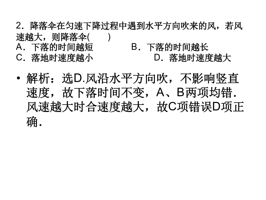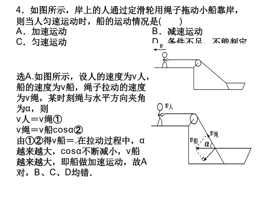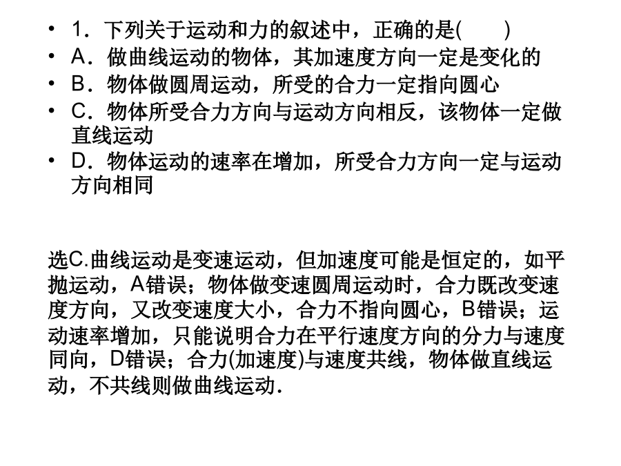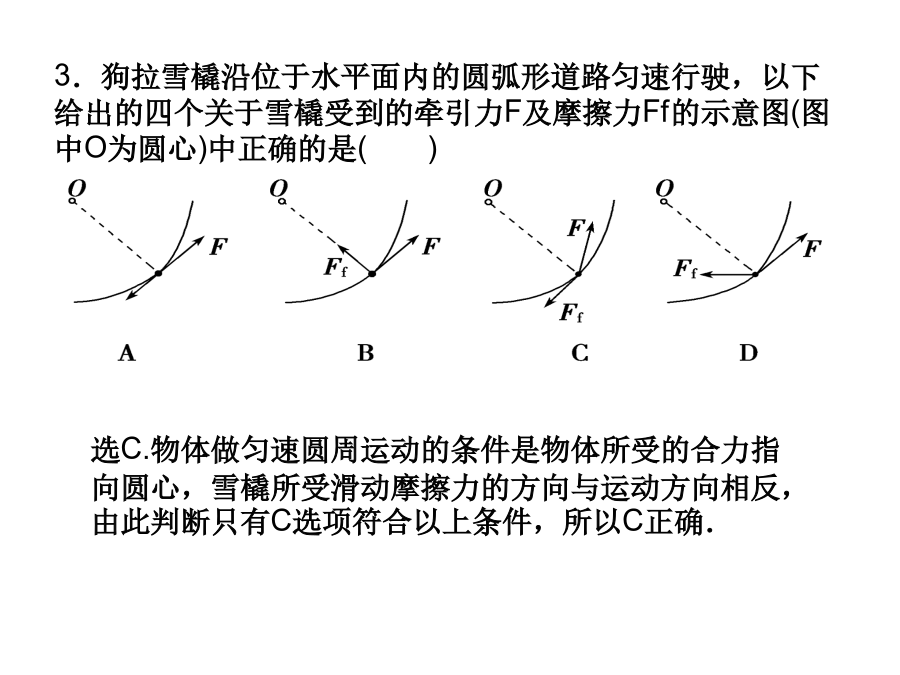 曲线运动练习题选C.曲线运动是变速运动,但加速度可能是恒定的,如平抛运动,A错误;物体做变速圆周运动时,合力既改变速度方向,又改变速度大小,合力不指向圆心,B错误;运动速率增加,只能说明合力在平行速度方向的分力与速度同向,D错误;合力(加速度)与速度共线,物体做直线运动,不共线则做曲线运动.2.降落伞在匀速下降过程中遇到水平方向吹来的风,若风速越大,则降落伞()A.下落的时间越短B.下落的时间越长C.落地时速度越小D.落地时速度越大3.狗拉雪橇沿位于水平面内的圆弧形道路匀速行驶,以下给出的四个关于雪橇受到的牵引力F及摩擦力Ff的示意图(图中O为圆心)中正确的是()4.如图所示,岸上的人通过定滑轮用绳子拖动小船靠岸,则当人匀速运动时,船的运动情况是()A.加速运动B.减速运动C.匀速运动D.条件不足,不能判定5、某人站在自动扶梯上,经过t1时间从一楼升到二楼,如果自动扶梯不运动,人沿着扶梯从一楼走到二楼的时间为t2.现使自动扶梯正常运动,人也保持原有速度沿扶梯向上走,则人从一楼到二楼的时间是多少?