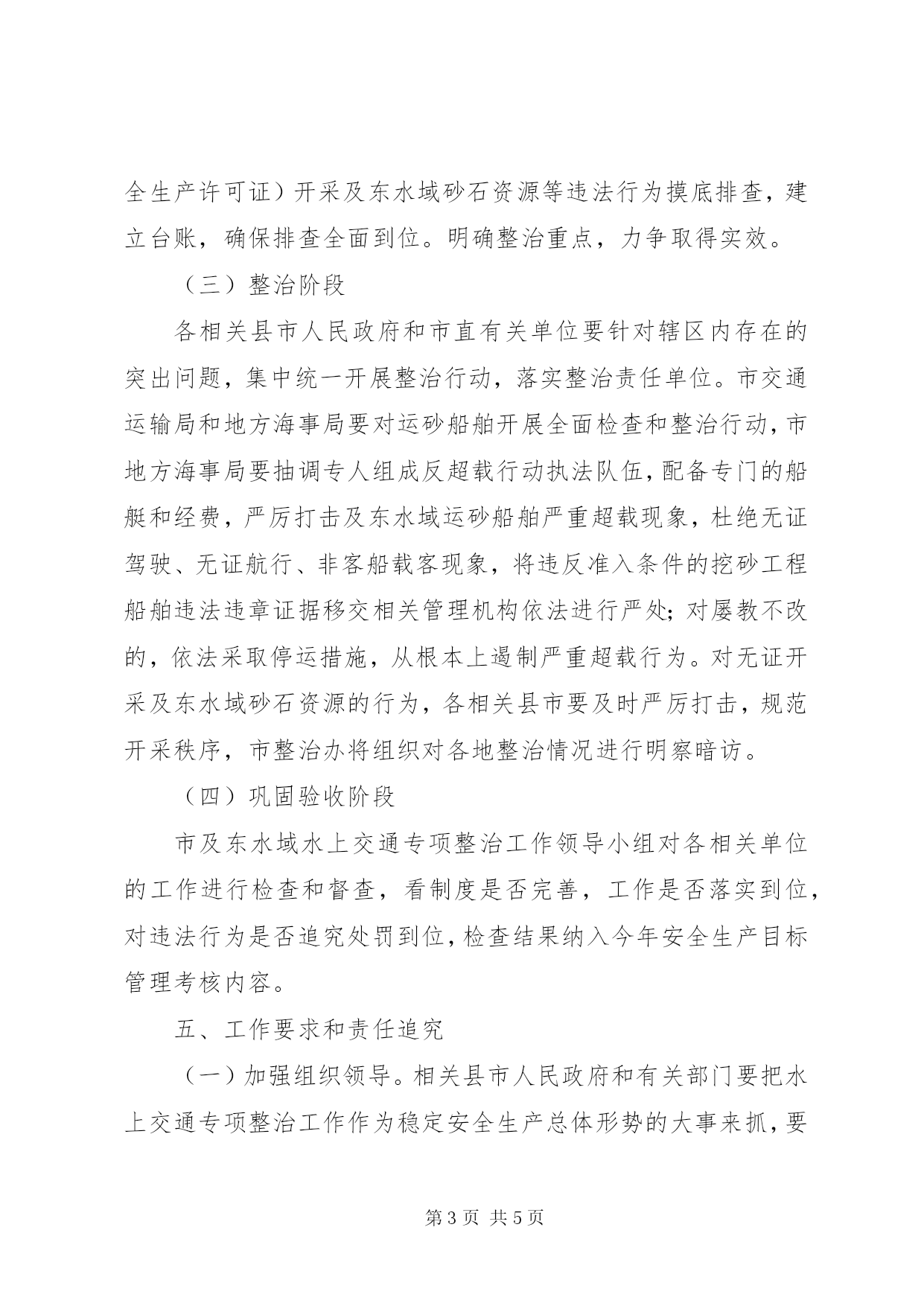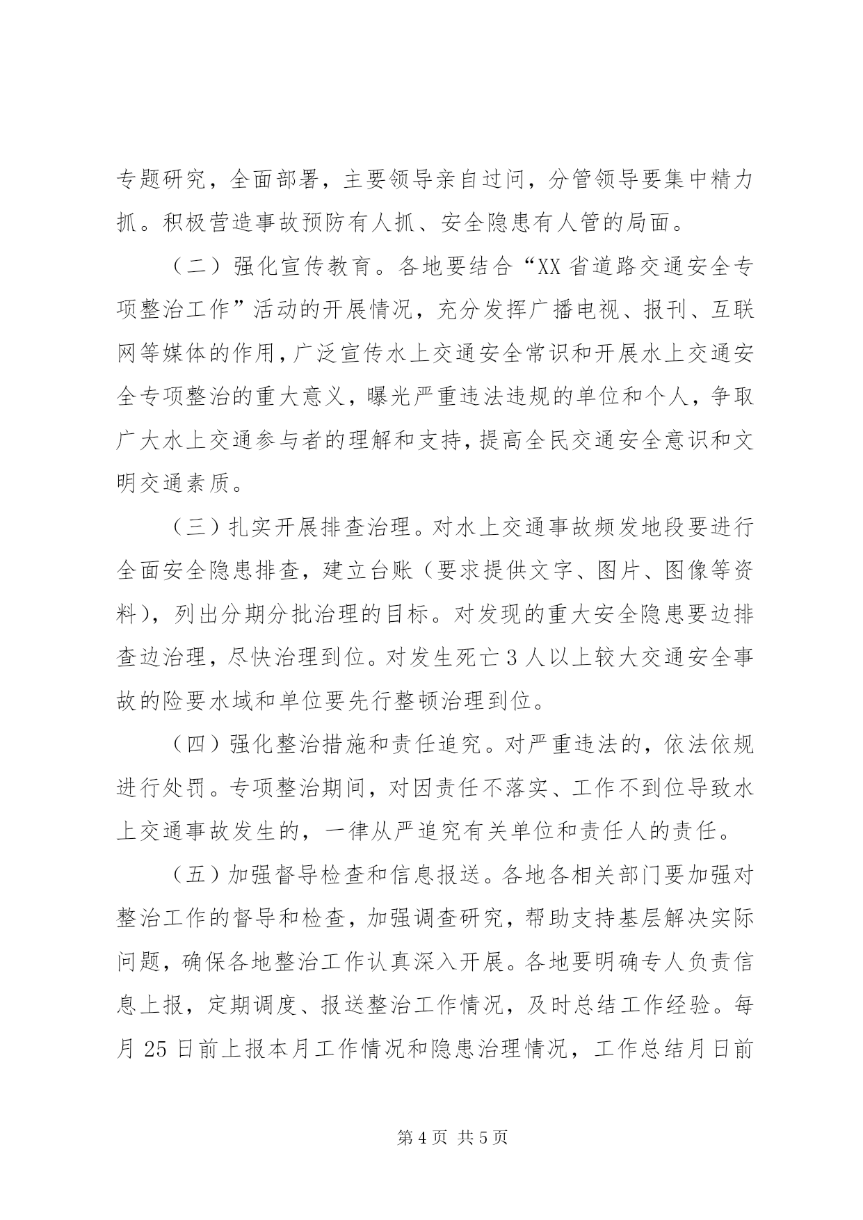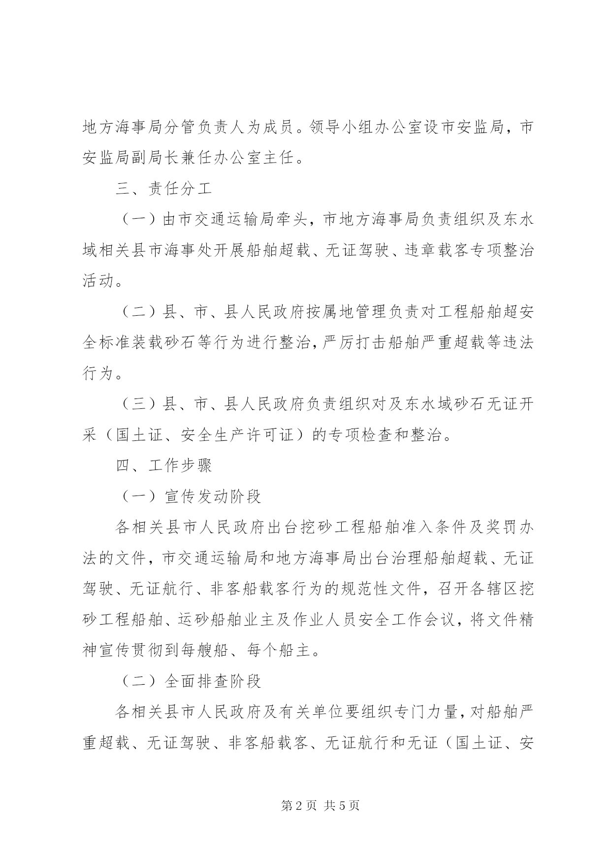 第PAGE\*Arabic\*MERGEFORMAT5页共NUMPAGES\*MERGEFORMAT5页市水上交通专治工作方案为进一步规范及东水域水上交通安全秩序,切实转变工作作风,提高工作效率,更好地服务于经济社会发展和“两型”社会建设,坚决杜绝我市水上交通较大以上事故发生,减少水上交通事故总量,促进我市水上交通平安畅通,根据《中华人民共和国安全生产法》和市作风建设领导小组《关于印发的通知》(作通〔〕1号)精神,结合及东水域水上交通安全工作实际,制定本方案。一、指导思想和工作目标坚持科学发展观和安全发展理念,认真贯彻“安全第一、预防为主、综合治理”的方针,以更加严密的组织方式、更加有力的打击措施、更加严格的监管手段、更加有效的执法监督,加大工程船舶装载管理力度、严厉打击船舶严重超载、无证驾驶、非客船载客、无证航行和无证(国土资源证、安全生产许可证)开采及东水域砂石资源等违法行为,彻底扭转及东水域航运船舶违法现象普遍、事故多发的局面。二、组织领导成立市及东水域水上交通专项整治工作领导小组,市人民政府副市长蒋锋任组长,市人民政府副秘书长,市安委办主任、安监局局长任副组长,县、县、市、市安监局、市交通运输局、市地方海事局分管负责人为成员。领导小组办公室设市安监局,市安监局副局长兼任办公室主任。三、责任分工(一)由市交通运输局牵头,市地方海事局负责组织及东水域相关县市海事处开展船舶超载、无证驾驶、违章载客专项整治活动。(二)县、市、县人民政府按属地管理负责对工程船舶超安全标准装载砂石等行为进行整治,严厉打击船舶严重超载等违法行为。(三)县、市、县人民政府负责组织对及东水域砂石无证开采(国土证、安全生产许可证)的专项检查和整治。四、工作步骤(一)宣传发动阶段各相关县市人民政府出台挖砂工程船舶准入条件及奖罚办法的文件,市交通运输局和地方海事局出台治理船舶超载、无证驾驶、无证航行、非客船载客行为的规范性文件,召开各辖区挖砂工程船舶、运砂船舶业主及作业人员安全工作会议,将文件精神宣传贯彻到每艘船、每个船主。(二)全面排查阶段各相关县市人民政府及有关单位要组织专门力量,对船舶严重超载、无证驾驶、非客船载客、无证航行和无证(国土证、安全生产许可证)开采及东水域砂石资源等违法行为摸底排查,建立台账,确保排查全面到位。明确整治重点,力争取得实效。(三)整治阶段各相关县市人民政府和市直有关单位要针对辖区内存在的突出问题,集中统一开展整治行动,落实整治责任单位。市交通运输局和地方海事局要对运砂船舶开展全面检查和整治行动,市地方海事局要抽调专人组成反超载行动执法队伍,配备专门的船艇和经费,严厉打击及东水域运砂船舶严重超载现象,杜绝无证驾驶、无证航行、非客船载客现象,将违反准入条件的挖砂工程船舶违法违章证据移交相关管理机构依法进行严处;对屡教不改的,依法采取停运措施,从根本上遏制严重超载行为。对无证开采及东水域砂石资源的行为,各相关县市要及时严厉打击,规范开采秩序,市整治办将组织对各地整治情况进行明察暗访。(四)巩固验收阶段市及东水域水上交通专项整治工作领导小组对各相关单位的工作进行检查和督查,看制度是否完善,工作是否落实到位,对违法行为是否追究处罚到位,检查结果纳入今年安全生产目标管理考核内容。五、工作要求和责任追究(一)加强组织领导。相关县市人民政府和有关部门要把水上交通专项整治工作作为稳定安全生产总体形势的大事来抓,要专题研究,全面部署,主要领导亲自过问,分管领导要集中精力抓。积极营造事故预防有人抓、安全隐患有人管的局面。(二)强化宣传教育。各地要结合“XX省道路交通安全专项整治工作”活动的开展情况,充分发挥广播电视、报刊、互联网等媒体的作用,广泛宣传水上交通安全常识和开展水上交通安全专项整治的重大意义,曝光严重违法违规的单位和个人,争取广大水上交通参与者的理解和支持,提高全民交通安全意识和文明交通素质。(三)扎实开展排查治理。对水上交通事故频发地段要进行全面安全隐患排查,建立台账(要求提供文字、图片、图像等资料),列出分期分批治理的目标。对发现的重大安全隐患要边排查边治理,尽快治理到位。对发生死亡3人以上较大交通安全事故的险要水域和单位要先行整顿治理到位。(四)强化整治措施和责任追究。对严重违法的,依法依规进行处罚。专项整治期间,对因责任不落实、工作不到位导致水上交通事故发生的,一律从严追究有关单位和责任人的责任。(五)加强督导检查和信息报送。各地各相关部门要加强对整治工作的督导和检查,加强调查研究,帮助支持基层解决实际问题,确保各地整治工作认真深入开展。各地要明确专人负责信息上报,定期调度、报送整治工作情况,及时总结工作经验。每月25日前上报本月工作情况和隐患治理情况,工作总结月日前报送市安委会办公室。