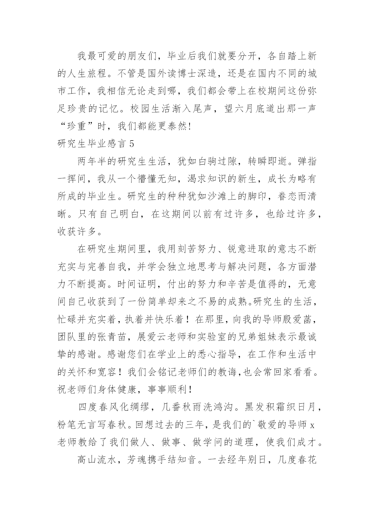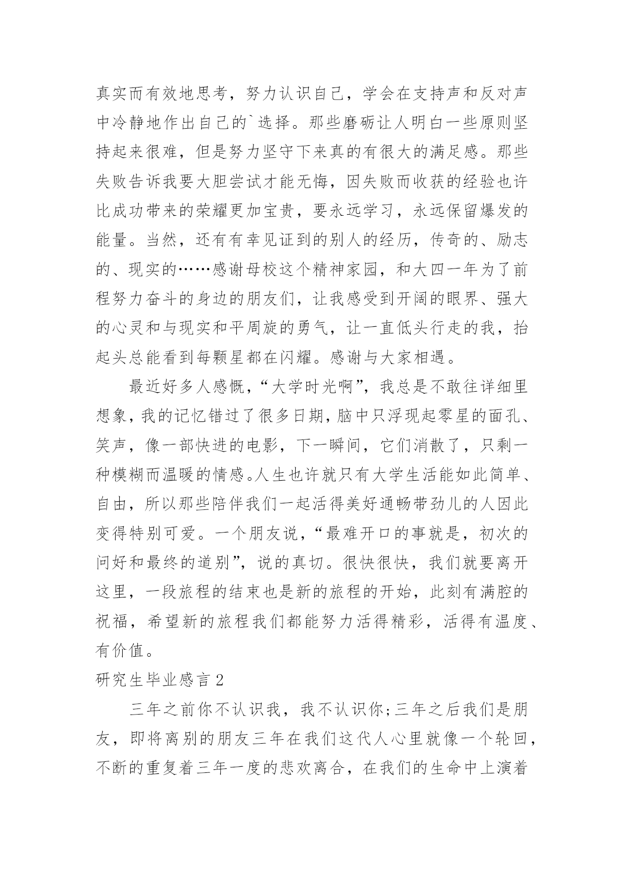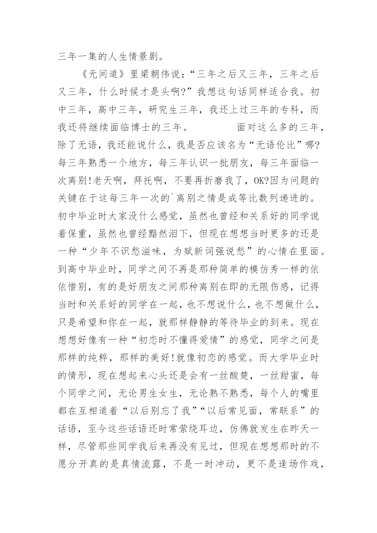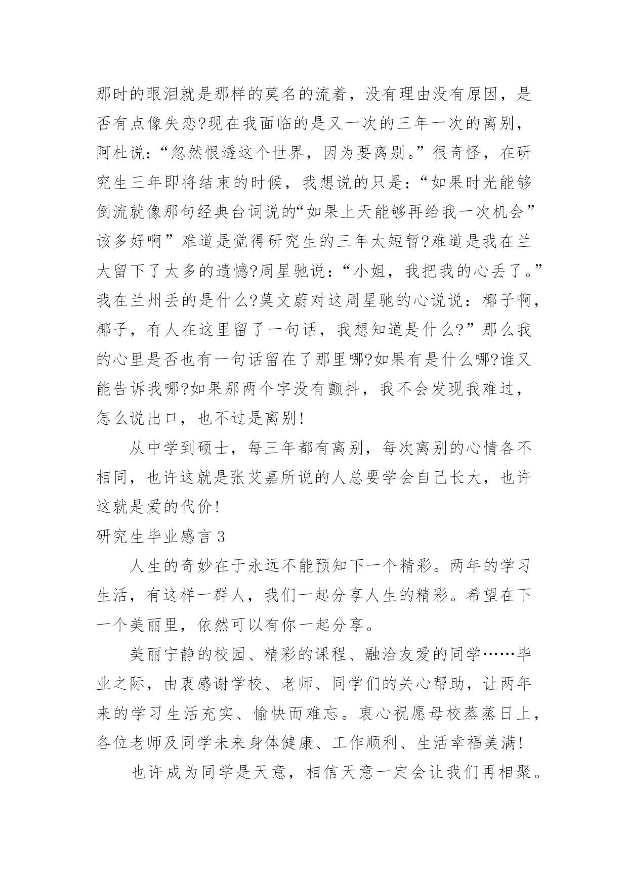 研究生毕业感言研究生毕业感言在平日的学习、工作、生活中,我们总会收获一些心得和感悟,有这样的时机,就要好好写一写感言将其记录下来。很多人都十分头疼怎么写一篇精彩的感言,下面是小编帮大家整理的研究生毕业感言,希望对大家有所帮助。研究生毕业感言1这个五月过得太快,虽然我在心中安慰着自己,毕业典礼尚在远方的六月,但日头越来越毒辣,热浪翻滚着提醒着毕业生们,六月已近在眼前。翻过这个周日,和儿童节一起来临的,就是道别的季节。每年的这个时点,学校里随处可见学士服,今年终于与我们有关,轮到我们穿上。大概从这之前的一年,就已经没有了大一大二的概念,别人会叫你毕业生。毕业,可能是期待,可能是喜悦,但直到现在才知道这种感觉很复杂,有怀念,有感谢,还有祝福。每个人对于毕业的感受都不一样,对还要继续研究生生涯的人来说,也许只是等待又一个暑假的开始。然而对于大多数的同学,经过这个六月,就要硬生生地扯断与校园的联系,告别了“特殊优待”的学生生活。这么想想,毕业还有些残酷。答辩之后,时间似乎就一步一步催着人离开,宿舍里的人越来越少,而自己的行李也已经打包好放在墙角。后来在各种聚会上,大家说着刚报道时的青涩,说着军训时的狼狈,说着运动会上的英姿,说着在宿舍时的懒惰,说着有的没的的八卦,然后哈哈大笑,我不由自主地笑着然后努力忍着,结果还是无可避免的有些感慨和伤感。人们总是这样,还没有失去,就开始怀念。正如怀念青春的人总是有青春的脸庞。我怀念什么?怀念和全班同学一起上课一起出游的时刻,怀念和老师讨论问题的时刻,怀念临时抱佛脚刷夜的时刻,怀念宿舍闺蜜一起做饭打火锅的时刻,怀念和社团战友们办活动的时刻,怀念在宿舍楼下用力的吼歌,怀念交换时度过的奇异时光,怀念保研司考时的只争朝夕,怀念准备毕业论文时的呕心沥血,以及,怀念即将分别的酷酷的朋友们......值得回味的太多太多,连那些当时觉得痛苦的难以忍受的时刻,在毕业的日子里也有了特别的光泽,仿佛经历了喧闹的如梦一般的场景,但这场景明媚阳光、生机勃勃、充满希望。希望源自收获。提到收获,这时候很难想到所谓的公平、正义、自强不息与勤奋刻苦,而是满脑子充盈着感受到的越来越真切的小道理。感谢优秀的同窗们,他们激发着我实现梦想的勇气和动力,让我懂得想要收获必须播种,必须努力且脚踏实地。感谢让人醉心的朋友们,他们陪伴我去实践疯狂和体验新奇,告诉我生活一定要有爱,有快乐,有梦想。感谢可敬的师长们,孜孜不倦传道授业,教予我严于律己,保持谦卑,以包容之心去理解身边的人和事。感谢经历,让我曾体验过欢喜兴奋,也感受过的脆弱痛苦。那些低谷让人真实而有效地思考,努力认识自己,学会在支持声和反对声中冷静地作出自己的`选择。那些磨砺让人明白一些原则坚持起来很难,但是努力坚守下来真的有很大的满足感。那些失败告诉我要大胆尝试才能无悔,因失败而收获的经验也许比成功带来的荣耀更加宝贵,要永远学习,永远保留爆发的能量。当然,还有有幸见证到的别人的经历,传奇的、励志的、现实的……感谢母校这个精神家园,和大四一年为了前程努力奋斗的身边的朋友们,让我感受到开阔的眼界、强大的心灵和与现实和平周旋的勇气,让一直低头行走的我,抬起头总能看到每颗星都在闪耀。感谢与大家相遇。最近好多人感慨,“大学时光啊”,我总是不敢往详细里想象,我的记忆错过了很多日期,脑中只浮现起零星的面孔、笑声,像一部快进的电影,下一瞬间,它们消散了,只剩一种模糊而温暖的情感。人生也许就只有大学生活能如此简单、自由,所以那些陪伴我们一起活得美好通畅带劲儿的人因此变得特别可爱。一个朋友说,“最难开口的事就是,初次的问好和最终的道别”,说的真切。很快很快,我们就要离开这里,一段旅程的结束也是新的旅程的开始,此刻有满腔的祝福,希望新的旅程我们都能努力活得精彩,活得有温度、有价值。研究生毕业感言2三年之前你不认识我,我不认识你;三年之后我们是朋友,即将离别的朋友三年在我们这代人心里就像一个轮回,不断的重复着三年一度的悲欢离合,在我们的生命中上演着三年一集的人生情景剧。《无间道》里梁朝伟说:“三年之后又三年,三年之后又三年,什么时候才是头啊?”我想这句话同样适合我。初中三年,高中三年,研究生三年,我还上过三年的专科,而我还将继续面临博士的三年。面对这么多的三年,除了无语,我还能说什么,我是否应该名为“无语伦比”哪?每三年熟悉一个地方,每三年认识一批朋友,每三年面临一次离别!老天啊,拜托啊,不要再折磨我了,OK?因为问题的关键在于这每三年一次的`离别之情是成等比数列递进的。初中毕业时大家没什么感觉,虽然也曾经和关系好的同学说着保重,虽然也曾经黯然泪下,但现在想想当时更多的还是一种“少年不识愁滋味,为赋新词强说愁”的心情在里面。到高中毕业时,同学之间不再是那种简单的模仿秀一样的依依惜别,有的是好朋友之间那种离别在即