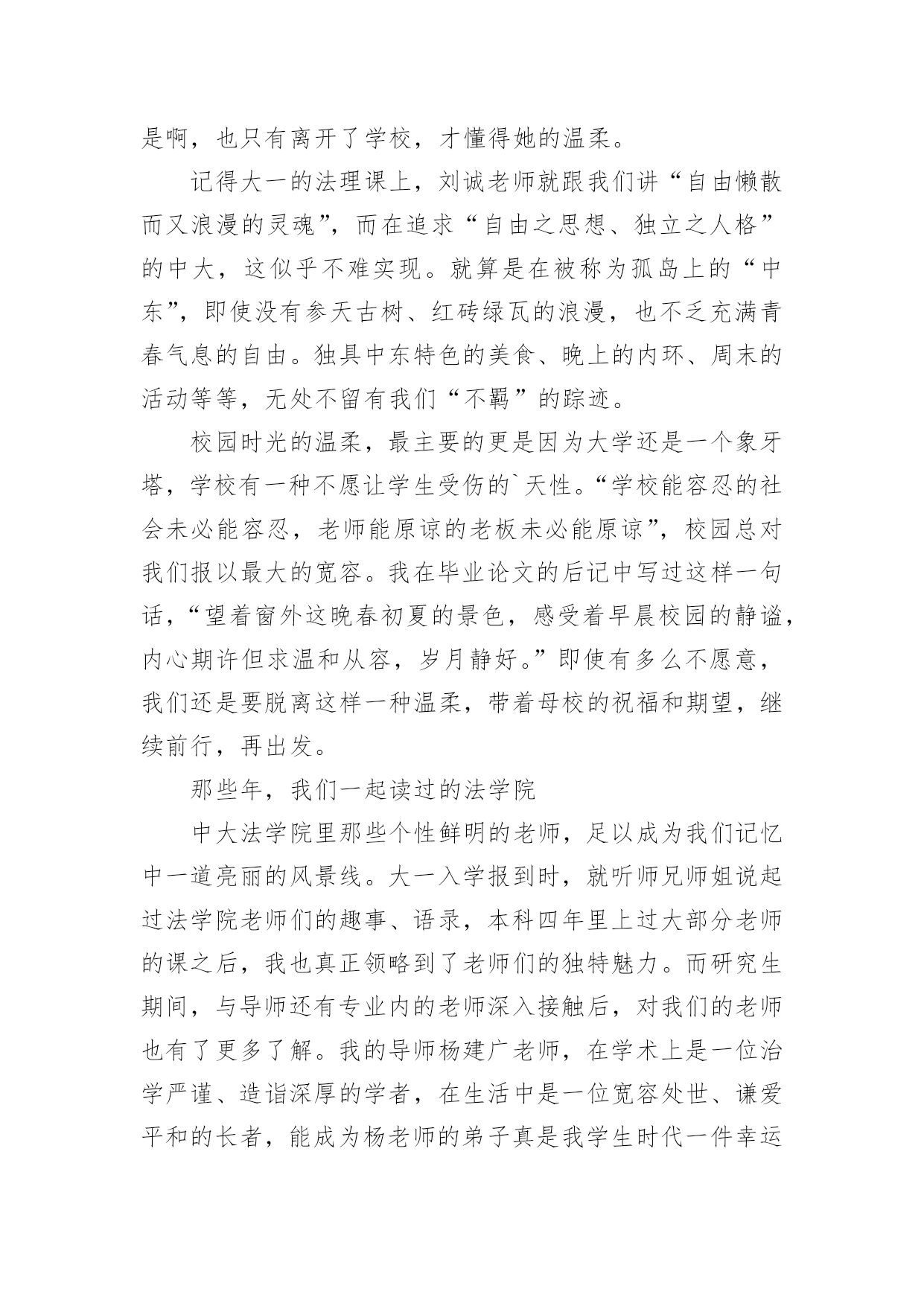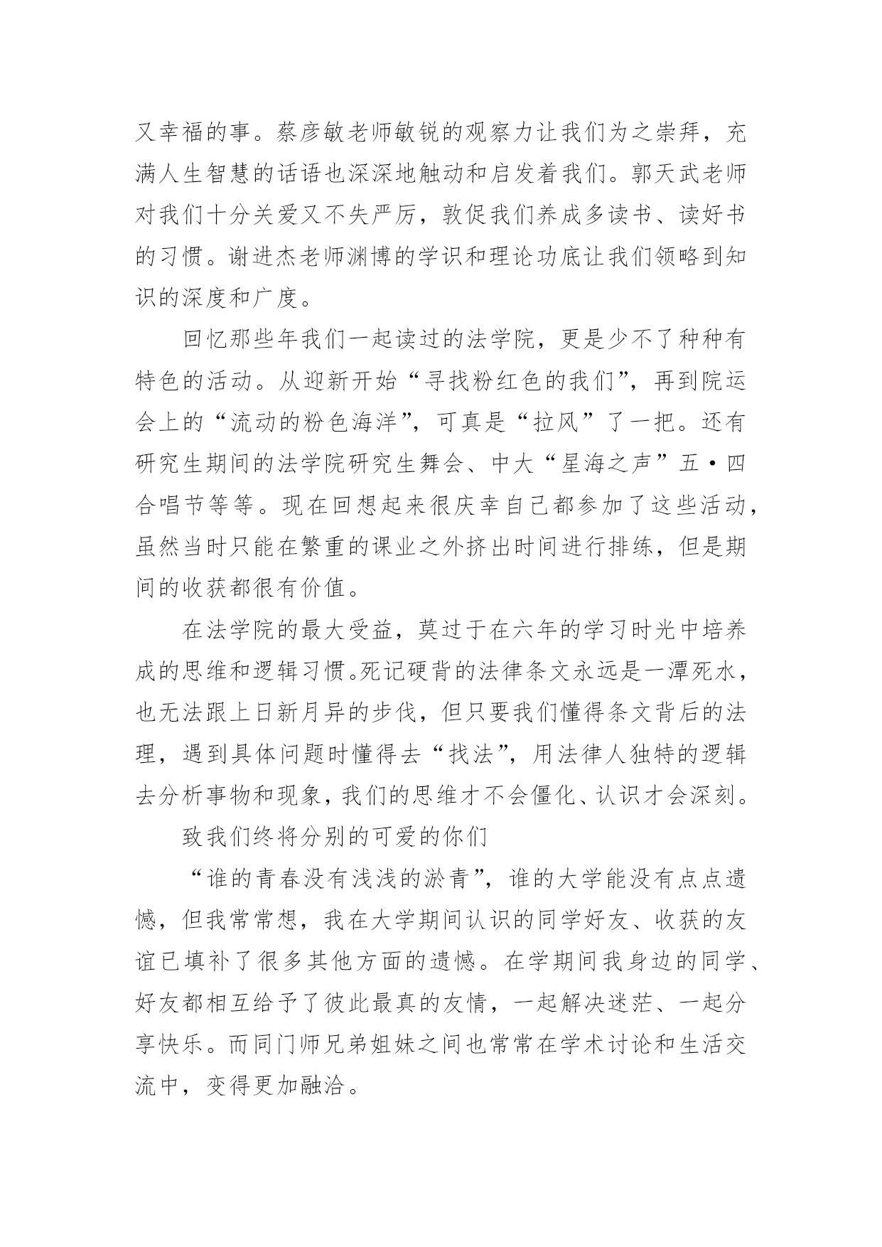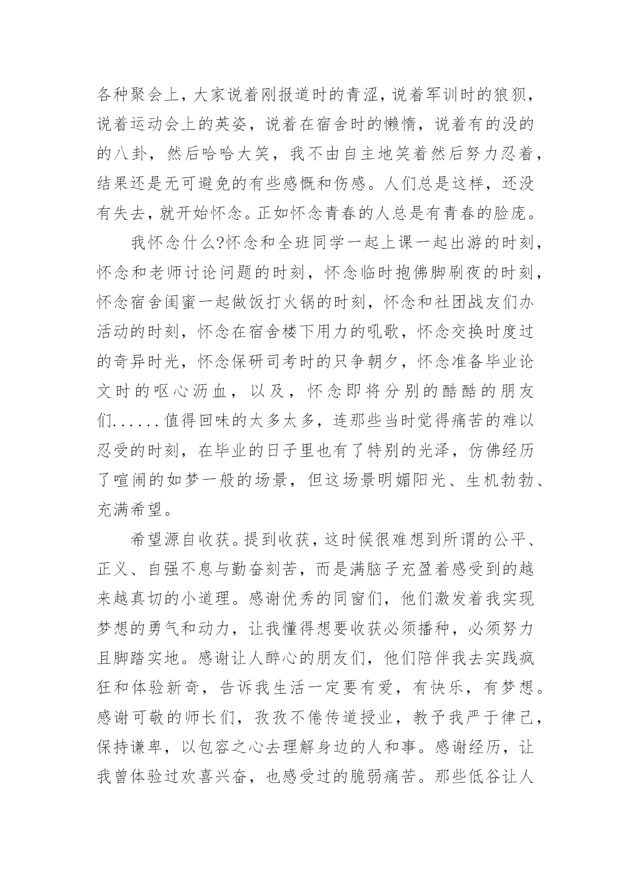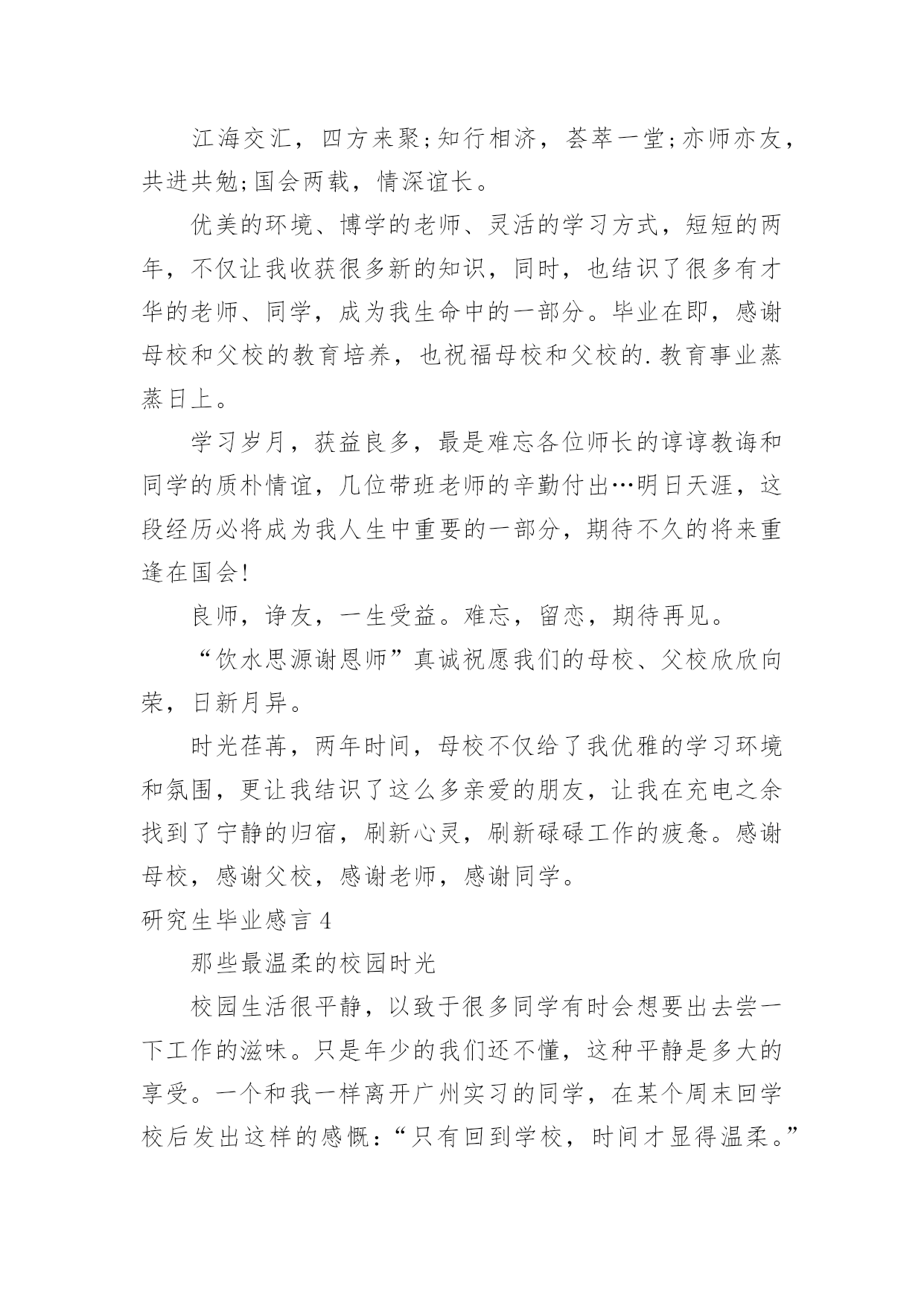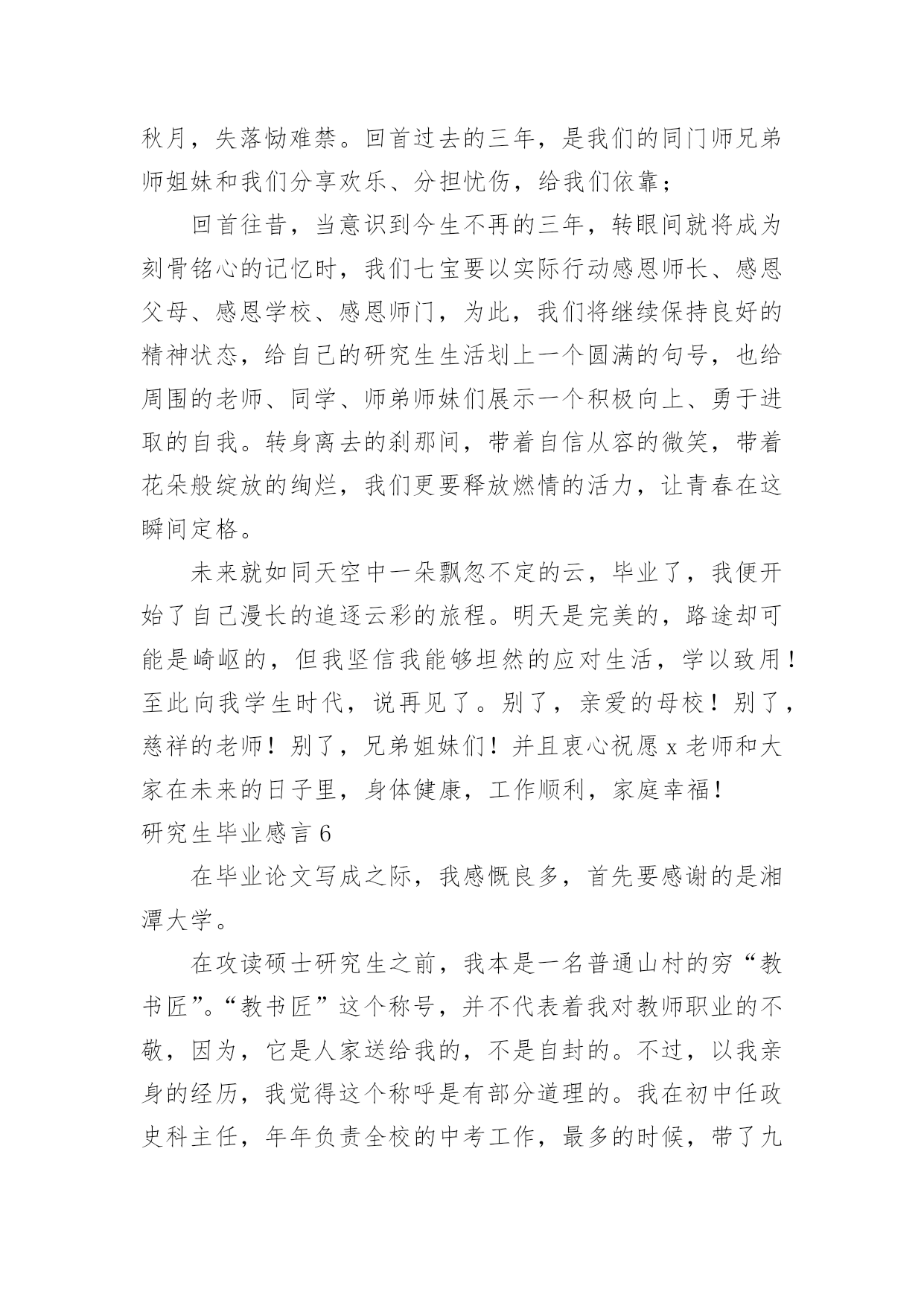 研究生毕业感言研究生毕业感言在平日的学习、工作、生活中,我们总会收获一些心得和感悟,有这样的时机,就要好好写一写感言将其记录下来。很多人都十分头疼怎么写一篇精彩的感言,下面是小编帮大家整理的研究生毕业感言,希望对大家有所帮助。研究生毕业感言1这个五月过得太快,虽然我在心中安慰着自己,毕业典礼尚在远方的六月,但日头越来越毒辣,热浪翻滚着提醒着毕业生们,六月已近在眼前。翻过这个周日,和儿童节一起来临的,就是道别的季节。每年的这个时点,学校里随处可见学士服,今年终于与我们有关,轮到我们穿上。大概从这之前的一年,就已经没有了大一大二的概念,别人会叫你毕业生。毕业,可能是期待,可能是喜悦,但直到现在才知道这种感觉很复杂,有怀念,有感谢,还有祝福。每个人对于毕业的感受都不一样,对还要继续研究生生涯的人来说,也许只是等待又一个暑假的开始。然而对于大多数的同学,经过这个六月,就要硬生生地扯断与校园的联系,告别了“特殊优待”的学生生活。这么想想,毕业还有些残酷。答辩之后,时间似乎就一步一步催着人离开,宿舍里的人越来越少,而自己的行李也已经打包好放在墙角。后来在各种聚会上,大家说着刚报道时的青涩,说着军训时的狼狈,说着运动会上的英姿,说着在宿舍时的懒惰,说着有的没的的八卦,然后哈哈大笑,我不由自主地笑着然后努力忍着,结果还是无可避免的有些感慨和伤感。人们总是这样,还没有失去,就开始怀念。正如怀念青春的人总是有青春的脸庞。我怀念什么?怀念和全班同学一起上课一起出游的时刻,怀念和老师讨论问题的时刻,怀念临时抱佛脚刷夜的时刻,怀念宿舍闺蜜一起做饭打火锅的时刻,怀念和社团战友们办活动的时刻,怀念在宿舍楼下用力的吼歌,怀念交换时度过的奇异时光,怀念保研司考时的只争朝夕,怀念准备毕业论文时的呕心沥血,以及,怀念即将分别的酷酷的朋友们......值得回味的太多太多,连那些当时觉得痛苦的难以忍受的时刻,在毕业的日子里也有了特别的光泽,仿佛经历了喧闹的如梦一般的场景,但这场景明媚阳光、生机勃勃、充满希望。希望源自收获。提到收获,这时候很难想到所谓的公平、正义、自强不息与勤奋刻苦,而是满脑子充盈着感受到的越来越真切的小道理。感谢优秀的同窗们,他们激发着我实现梦想的勇气和动力,让我懂得想要收获必须播种,必须努力且脚踏实地。感谢让人醉心的朋友们,他们陪伴我去实践疯狂和体验新奇,告诉我生活一定要有爱,有快乐,有梦想。感谢可敬的师长们,孜孜不倦传道授业,教予我严于律己,保持谦卑,以包容之心去理解身边的人和事。感谢经历,让我曾体验过欢喜兴奋,也感受过的脆弱痛苦。那些低谷让人真实而有效地思考,努力认识自己,学会在支持声和反对声中冷静地作出自己的`选择。那些磨砺让人明白一些原则坚持起来很难,但是努力坚守下来真的有很大的满足感。那些失败告诉我要大胆尝试才能无悔,因失败而收获的经验也许比成功带来的荣耀更加宝贵,要永远学习,永远保留爆发的能量。当然,还有有幸见证到的别人的经历,传奇的、励志的、现实的……感谢母校这个精神家园,和大四一年为了前程努力奋斗的身边的朋友们,让我感受到开阔的眼界、强大的心灵和与现实和平周旋的勇气,让一直低头行走的我,抬起头总能看到每颗星都在闪耀。感谢与大家相遇。最近好多人感慨,“大学时光啊”,我总是不敢往详细里想象,我的记忆错过了很多日期,脑中只浮现起零星的面孔、笑声,像一部快进的电影,下一瞬间,它们消散了,只剩一种模糊而温暖的情感。人生也许就只有大学生活能如此简单、自由,所以那些陪伴我们一起活得美好通畅带劲儿的人因此变得特别可爱。一个朋友说,“最难开口的事就是,初次的问好和最终的道别”,说的真切。很快很快,我们就要离开这里,一段旅程的结束也是新的旅程的开始,此刻有满腔的祝福,希望新的旅程我们都能努力活得精彩,活得有温度、有价值。研究生毕业感言2三年之前你不认识我,我不认识你;三年之后我们是朋友,即将离别的朋友三年在我们这代人心里就像一个轮回,不断的重复着三年一度的悲欢离合,在我们的生命中上演着三年一集的人生情景剧。《无间道》里梁朝伟说:“三年之后又三年,三年之后又三年,什么时候才是头啊?”我想这句话同样适合我。初中三年,高中三年,研究生三年,我还上过三年的专科,而我还将继续面临博士的三年。面对这么多的三年,除了无语,我还能说什么,我是否应该名为“无语伦比”哪?每三年熟悉一个地方,每三年认识一批朋友,每三年面临一次离别!老天啊,拜托啊,不要再折磨我了,OK?因为问题的关键在于这每三年一次的`离别之情是成等比数列递进的。初中毕业时大家没什么感觉,虽然也曾经和关系好的同学说着保重,虽然也曾经黯然泪下,但现在想想当时更多的还是一种“少年不识愁滋味,为赋新词强说愁”的心情在里面。到高中毕业时,同学之间不再是那种简单的模仿秀一样的依依惜别,有的是好朋友之间那种离别在即