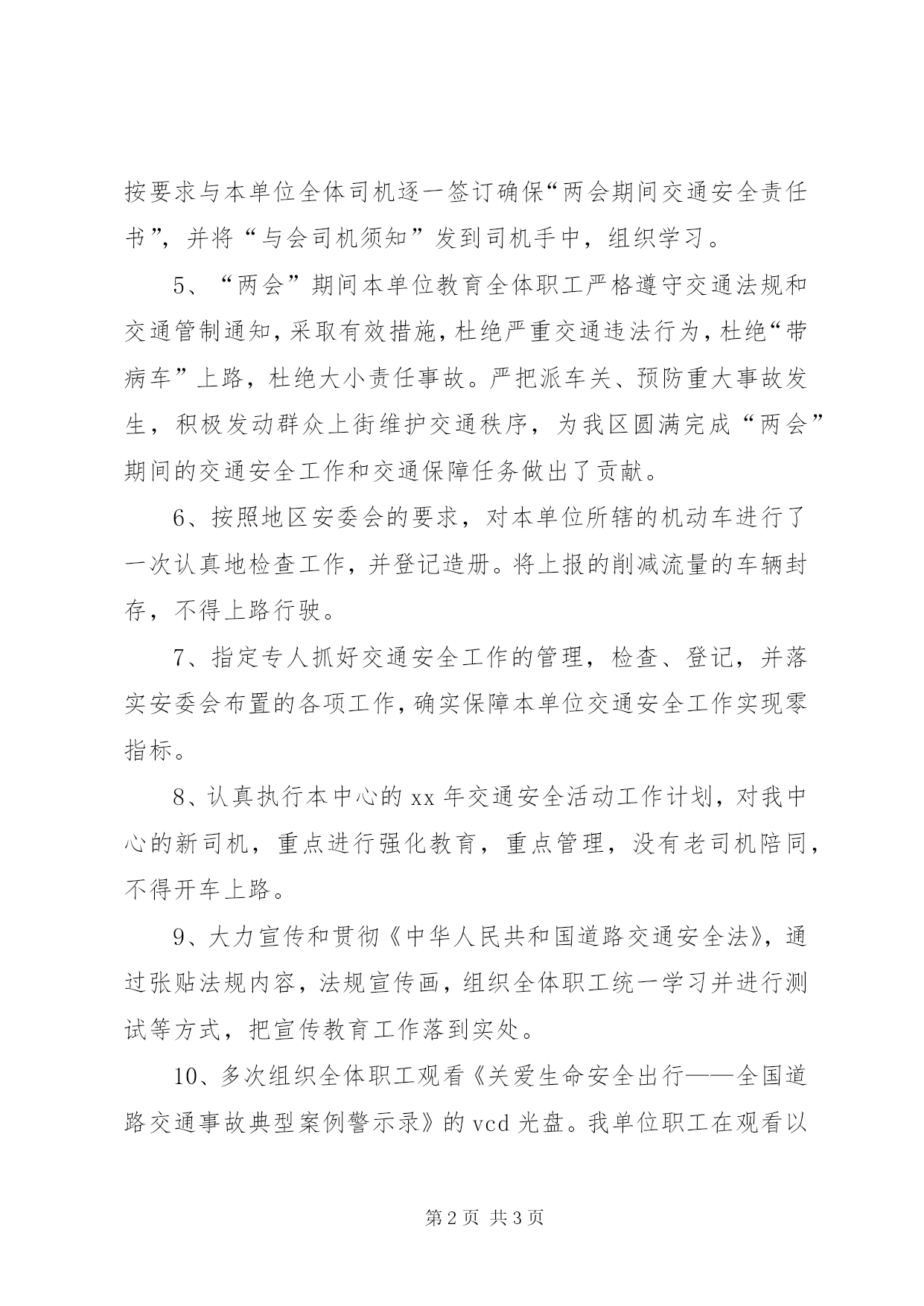 第PAGE\*Arabic\*MERGEFORMAT3页共NUMPAGES\*MERGEFORMAT3页交通安全宣传部:XX年交通安全工作总结1、中心的领导十分重视交通安全工作,对这项工作常抓不懈,经常检查单位内部的交通安全宣传和管理工作,在“两会期间”,在中心的大小会议上,每次都强调交通安全的重要性,把安全教育工作落到实处,增强了每个职工树立模范遵守交通法规的意识和观念,使大家做到了不出交通事故,不违章。2、中心按要求与地区安委会签订了《全国人大、政协“两会”期间与会单位交通安全与交通保障责任书》和《甘家口地区xx年度安委会与辖区单位交通安全责任书》。并按责任书中的要求认真落实,组织实施,严把派车关,做到了预防事故发生。3、在“两会”召开前,组织全体职工召开了交通安全宣传教育会,会上中心领导和车管干部就交通安全的重要性对全体职工进行了宣传,提出了更高的要求,要求人人必须模范遵守交通规则,杜绝交通违法行为和交通事故。增强了中心全体职工的首都意识,安全意识,增强了全体职工的光荣感和政治责任感。大家都表示,要认真学习交通法规,对自己高标准,严要求,为“两会”期间的交通安全工作目标的落实做出自己的努力。4、按照地区安委会和交通支队的部署和要求,在“两会”召开前,本中心领导亲自组织全体职工进行了一次交通安全学习,测试交通法规,制定“两会”期间的安全行车措施,按要求削减交通流量,对单位机、非机动车一个不漏地进行了一次检查。并按要求与本单位全体司机逐一签订确保“两会期间交通安全责任书”,并将“与会司机须知”发到司机手中,组织学习。5、“两会”期间本单位教育全体职工严格遵守交通法规和交通管制通知,采取有效措施,杜绝严重交通违法行为,杜绝“带病车”上路,杜绝大小责任事故。严把派车关、预防重大事故发生,积极发动群众上街维护交通秩序,为我区圆满完成“两会”期间的交通安全工作和交通保障任务做出了贡献。6、按照地区安委会的要求,对本单位所辖的机动车进行了一次认真地检查工作,并登记造册。将上报的削减流量的车辆封存,不得上路行驶。7、指定专人抓好交通安全工作的管理,检查、登记,并落实安委会布置的各项工作,确实保障本单位交通安全工作实现零指标。8、认真执行本中心的xx年交通安全活动工作计划,对我中心的新司机,重点进行强化教育,重点管理,没有老司机陪同,不得开车上路。9、大力宣传和贯彻《中华人民共和国道路交通安全法》,通过张贴法规内容,法规宣传画,组织全体职工统一学习并进行测试等方式,把宣传教育工作落到实处。10、多次组织全体职工观看《关爱生命安全出行——全国道路交通事故典型案例警示录》的vcd光盘。我单位职工在观看以后,纷纷表示要认真学习新交法,严格遵守交通规则,真正做到“关爱生命,安全出行”。xx年上半年,我中心在地区安委会的和片组的领导下,认真抓各项工作的落实,抓全体职工的交通安全意识教育,增强了职工的交通安全意识,通过全体职工的努力,使我中心的交通安全工作取得了很大的收获,没有发生交通安全事故。下半年我们要继续努力,抓好交通安全工作,为创造良好的交通环境、为人民的生命安全、配合地区安委会和片组把交通安全工作做得更好。国家建筑材料展贸中心xx年6月17日