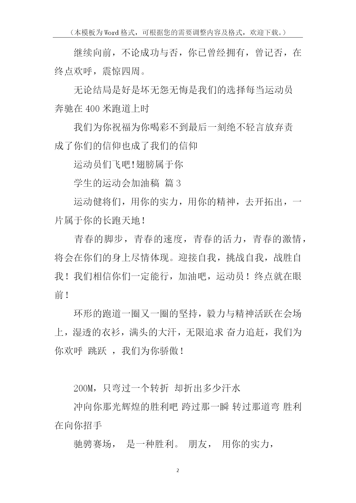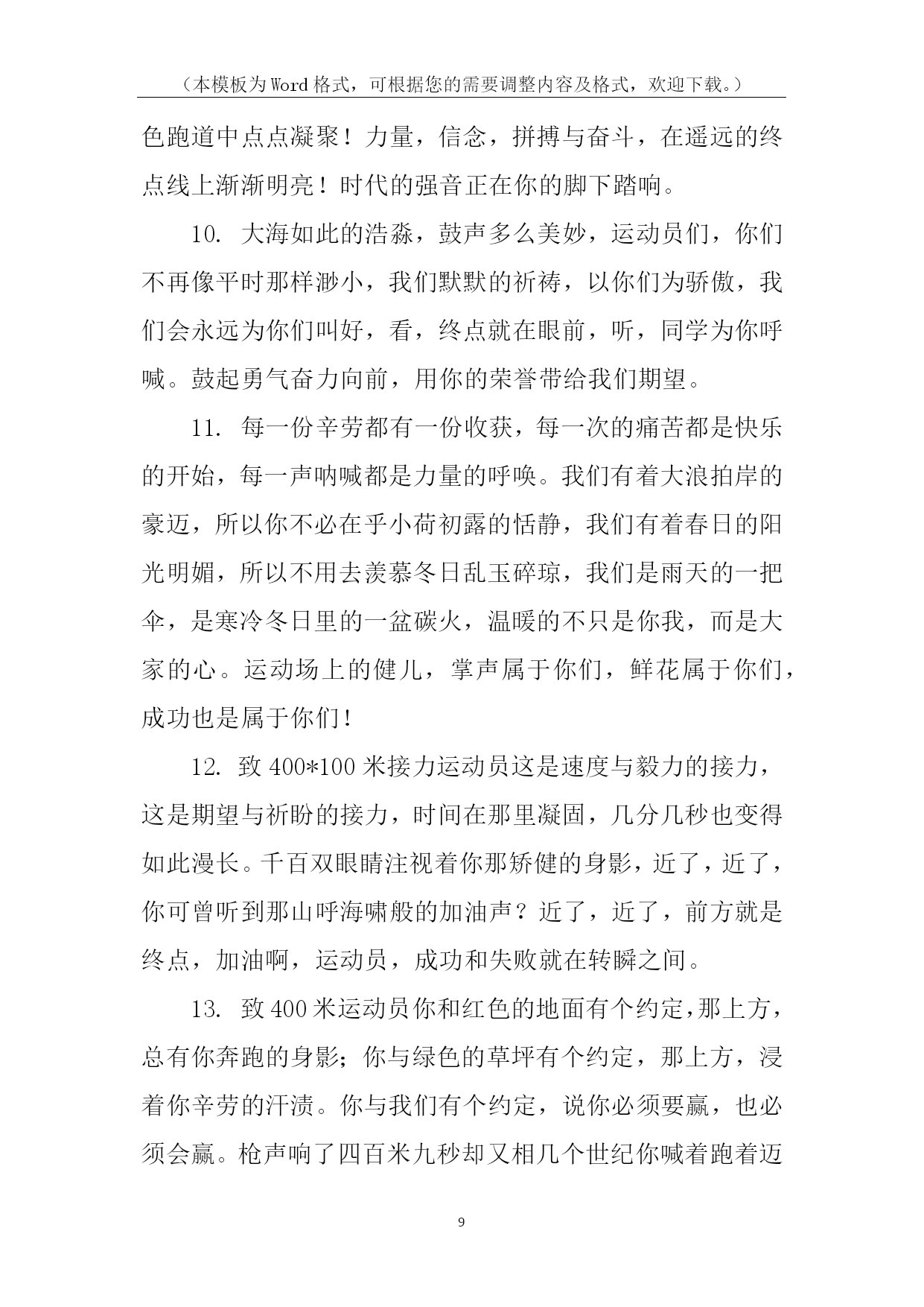 (本模板为Word格式,可根据您的需要调整内容及格式,欢迎下载。)PAGE\*MERGEFORMAT17学生的运动会加油稿学生的运动会加油稿篇1春天是播种希望的季节,亲爱的运动员们,一份耕耘一份收获,唯有拼搏才能够达到成功的彼岸,加油吧,前面就是成功!生活中,我们每天都在尝试尝试中,我们走向成功品味失败,走过心灵的阴雨晴空运动员们,不要放弃尝试无论失败与否重要的是你勇于参与的精神,付出的背后是成功无论是否成功,我们永远赞美你,你永远是我们的骄傲。有多少次挥汗如雨,伤痛曾添满记忆,只因为始终相信,去拼搏才能够成功。总在鼓舞自己,要成功就得努力。热血在赛场沸腾,巨人在赛场升起。相信自己,你将赢得成功,创造奇迹;相信自己,梦想在你手中,这是你的天地。当一切过去,你们将是第一。相信自己,你们将会超越极限,超越自己!相信自己,加油吧,健儿们,相信你自己。学生的运动会加油稿篇2人类的力量在那一刹那展现,拚搏在那一瞬间化为生命的起点,在那一须臾万物化为虚有,只知道,胜利并不遥远,抬起头望望前面,终点线已依稀可见,无数个日日夜夜的辛劳,将在今日兑现。洒一把艰辛的汗水,继续抬起疲倦的脚步,爆发的一吼气贯长虹,继续向前,不论成功与否,你已曾经拥有,曾记否,在终点欢呼,震惊四周。无论结局是好是坏无怨无悔是我们的选择每当运动员奔驰在400米跑道上时我们为你祝福为你喝彩不到最后一刻绝不轻言放弃责成了你们的信仰也成了我们的信仰运动员们飞吧!翅膀属于你学生的运动会加油稿篇3运动健将们,用你的实力,用你的精神,去开拓出,一片属于你的长跑天地!青春的脚步,青春的速度,青春的活力,青春的激情,将会在你们的身上尽情体现。迎接自我,挑战自我,战胜自我!我们相信你们一定能行,加油吧,运动员!终点就在眼前!环形的跑道一圈又一圈的坚持,毅力与精神活跃在会场上,湿透的衣衫,满头的大汗,无限追求奋力追赶,我们为你欢呼跳跃,我们为你骄傲!200M,只弯过一个转折却折出多少汗水冲向你那光辉煌的胜利吧跨过那一瞬转过那道弯胜利在向你招手驰骋赛场,是一种胜利。朋友,用你的实力,用你的精神,去开拓出一片属于你的短跑天地。枪声伴你踏上征程,你昂着自信的头,带着必胜的信念,冲去,奔去。那一刻时光仿佛都为你停住,你的勇气振动了一切,震撼了每一个人的心灵。终点。你赢了。虽然只是那短短的十几秒,但你在我们心中留下了永恒。红色的跑道,承载着多少汗水,一条红线,记载着多少成败。一次起跑,是瞬间的爆发,成败,即决定其中。瞬间的瞬间,闪电的闪电,即是成功的起步。枪声响了,你们冲向前,不为别的,就为班级一马当先,没有昔日的汗水,怎见今天的胜利?相信自己,鼓励自己,超越自己。为太阳的光辉在添上永恒的一笔!要的就是坚持到底,不是华丽。冲吧!向着那未来,进行到底。最想目睹的是你的风姿,最想倾听的是你的呼吸,最想感觉的是你呼啸而过的骤风,今天,你们是焦点;今天,你们是骄傲。年轻的我们自信飞扬,青春的气息如同出生的朝阳,蓬勃的力量如同阳光的挥洒。此时此刻,跑道便是我们精彩的舞台,声声加油便是我们最高的奖项!论何成功,谈何荣辱,心中的信念只有一个:拼搏!你的汗水洒在跑道,浇灌着成功的花朵开放。你的欢笑飞扬在赛场,为班争光数你最棒。跑吧,追吧在这广阔的赛场上,你似骏马似离铉的箭。跑吧,追吧,你比虎猛,比豹强。坚定,执着,耐力与希望,在延伸的白色跑道中点点凝聚!力量,信念,拼搏与奋斗,在遥远的终点线上渐渐明亮!时代的强音正在你的脚下踏响。你们挥舞着充满力量的双臂看着实心球化成美丽的弧线我着实在心里佩服你们你们抛出了自己的最佳水平!一根小小的木棒,连接的是团结和友爱一根小小的木棒,传递的是勇气和力量一根小小的木棒,演绎的是奋斗和拼搏加油吧!让这激动人心的时刻,一直回荡在我们心中!天如幕,日如初,运动场内生龙活虎!没有常胜将,万古侯更无,江山代代有才人出!赛场如战场,彩旗列列迎红日,呐喊声声震雷霆!英雄勇将,呼之欲出;各领风骚,一帜独树!群雄乍现,英雄谁属?洒过泪,不服输,霸气早成,英雄我属青春写下我们的召唤,青春编织我们的诺言。我们有无穷的活力,我们有无边的幻想,我们时刻准备着去创造无限的可能。绿荫场上,我们勇往直前,因为我们坚信勇者无惧!终点线上,我们放声高呼,因为我们知道来之不易!领奖台上,我们心潮澎湃,因为我们懂得人定胜天!致短跑运动员踏上跑道,是一种选择。离弄起点,是一种勇气。200M,有一个人生的起点200M,有一个人生的弯道200M,有一段人生的冲刺200M,有一个辉煌的胜利200M,只刹那一瞬间却成就一段永恒的胜利学生的运动会加油稿篇4一年一度的.校运动会经过5天紧张有序的激烈角逐,已经圆满结束了。在此,我谨代表学校向本届运动会的圆满成功表示热烈的祝贺,向各位参判表示衷心的感谢!向在比赛中取得