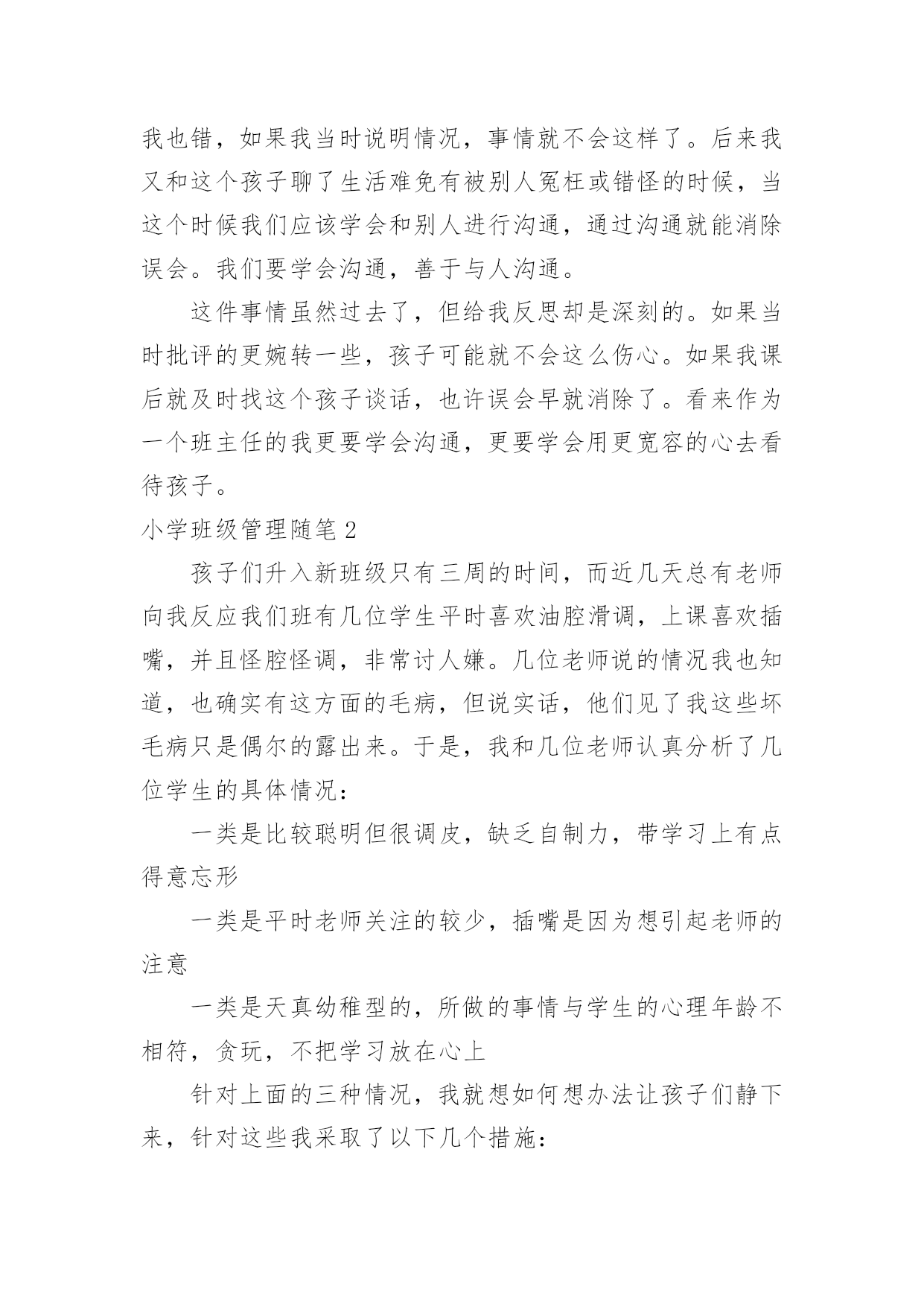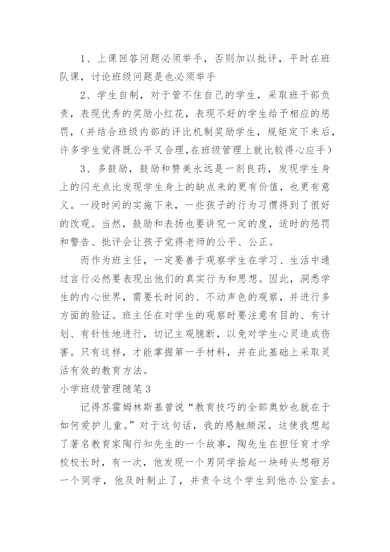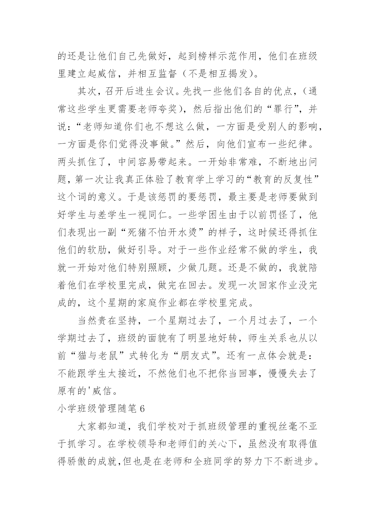 小学班级管理随笔小学班级管理随笔在平时的学习、工作中,大家都看到过不少让自己印象深刻的随笔吧?随笔的创作非常随意,不需要有任何的负担,不需要华丽的辞藻,没有严密的结构,随心写。想要更多的了解随笔吗?下面是小编收集整理的小学班级管理随笔,仅供参考,希望能够帮助到大家。小学班级管理随笔1这是我上星期布置的一篇周记,题目是《记班中的一件小事》。批改的过程中我发现孩子用细腻的笔触描写了孩子发生在班级中的一件件小事,内容是酸甜苦辣,样样都有。这些小事既有我知道的,也有我不知道的,看来通过这次周记的批改能让我更了解这些孩子,更了解这个班级了。然而有一篇周记却让我陷入了深深的反思。这篇周记这样写道:那一天,我永远也忘不了,那件事我一想起来就想哭。因为,那并不是我的错!那天您在上数学课,您叫我们抬起头来,您要讲一道题目。我那时把头抬起来,也专心的听着。……这篇周记把我的思绪带回到上星期的一节数学课。那天我正在上课,刚在分析一道数学题,忽然我的眼睛看到一位男生的眼睛正“专心致志”的看着窗外。当时我的第一反应,这位男生思想在开小差,心想如此重要的一道题目所有的孩子都听的那么认真,你却如此地不认真。按以往我总是先看他几眼,用眼光先提醒他一下。这次可能心里有些急,一下子直接点了这个孩子的名字。孩子站了起来,很显然他心理上没有准备,我接下去的提问也吱吱呜呜的回答不上来。因为一般情况上课堂对付思想开小差的孩子,我们老师总是用提问的形式来“为难”孩子,达到提醒的目的。看着孩子回答不上这个我认为认真的听课的孩子都应该能回答的问题,更肯定了这个孩子肯定刚才思想开小差了。又问:“你知道,俞老师为什么让你站起来吗?”孩子沉默了一下,吱呜着说:“我不知道。”一听这话,我当时火就有些上来了,更联想到了这个孩子这个学期不断下降的数学成绩,脱口而出:“怪不得你这个学期的数学成绩会没有进步!”考虑到其它孩子还要听课,我便让他坐下去继续听课。下课了,一大群孩子围着我改作业的订正,我把这件事也就忘记了。很显然今天这个孩子通过这篇周记告诉了事情的真相。当时这个孩子有些牙痛,被我看到时候,刚好把头转向窗外,其实课是在认真听的。而回答不出问题,是应该当然被老师叫起来后有些紧张,所以才没有回答上来。看来我真的冤枉了他了,也深深伤害了这个孩子的心了。因为周记的最后写着:这对您而言,是非常小的小事,可对我而言,这是一件大事。这天放学后,我找了这个孩子。在办公室里我郑重其事的向这个孩子道了谦。孩子很宽容,也很大肚,说:俞老师,我也错,如果我当时说明情况,事情就不会这样了。后来我又和这个孩子聊了生活难免有被别人冤枉或错怪的时候,当这个时候我们应该学会和别人进行沟通,通过沟通就能消除误会。我们要学会沟通,善于与人沟通。这件事情虽然过去了,但给我反思却是深刻的。如果当时批评的更婉转一些,孩子可能就不会这么伤心。如果我课后就及时找这个孩子谈话,也许误会早就消除了。看来作为一个班主任的我更要学会沟通,更要学会用更宽容的心去看待孩子。小学班级管理随笔2孩子们升入新班级只有三周的时间,而近几天总有老师向我反应我们班有几位学生平时喜欢油腔滑调,上课喜欢插嘴,并且怪腔怪调,非常讨人嫌。几位老师说的情况我也知道,也确实有这方面的毛病,但说实话,他们见了我这些坏毛病只是偶尔的露出来。于是,我和几位老师认真分析了几位学生的具体情况:一类是比较聪明但很调皮,缺乏自制力,带学习上有点得意忘形一类是平时老师关注的较少,插嘴是因为想引起老师的注意一类是天真幼稚型的,所做的事情与学生的心理年龄不相符,贪玩,不把学习放在心上针对上面的三种情况,我就想如何想办法让孩子们静下来,针对这些我采取了以下几个措施:1、上课回答问题必须举手,否则加以批评,平时在班队课,讨论班级问题是也必须举手2、学生自制,对于管不住自己的学生,采取班干部负责,表现优秀的奖励小红花,表现不好的学生给予相应的惩罚,(并结合班级内部的评比机制奖励学生,规矩定下来后,许多学生觉得既公平又合理,在班级管理上就比较得心应手)3、多鼓励,鼓励和赞美永远是一剂良药,发现学生身上的闪光点比发现学生身上的缺点来的更有价值,也更有意义。一段时间的实施下来,一些孩子的行为习惯得到了很好的改观。当然,鼓励和表扬也要讲究一定的度,适时的惩罚和警告、批评会让孩子觉得老师的公平、公正。而作为班主任,一定要善于观察学生在学习、生活中通过言行必然要表现出他们的真实行为和思想。因此,洞悉学生的内心世界,需要长时间的、不动声色的观察,并进行多方面的验证。班主任在对学生的观察时要注意有目的、有计划、有针性地进行,切记主观臆断,以免对学生心灵造成伤害。只有这样,才能掌握第一手材料,并在此基础上采取灵活有效的教育方法。小学班级管理随笔3记得苏霍姆林斯基曾说“教育技巧的全部奥妙也就在于如何爱护儿童