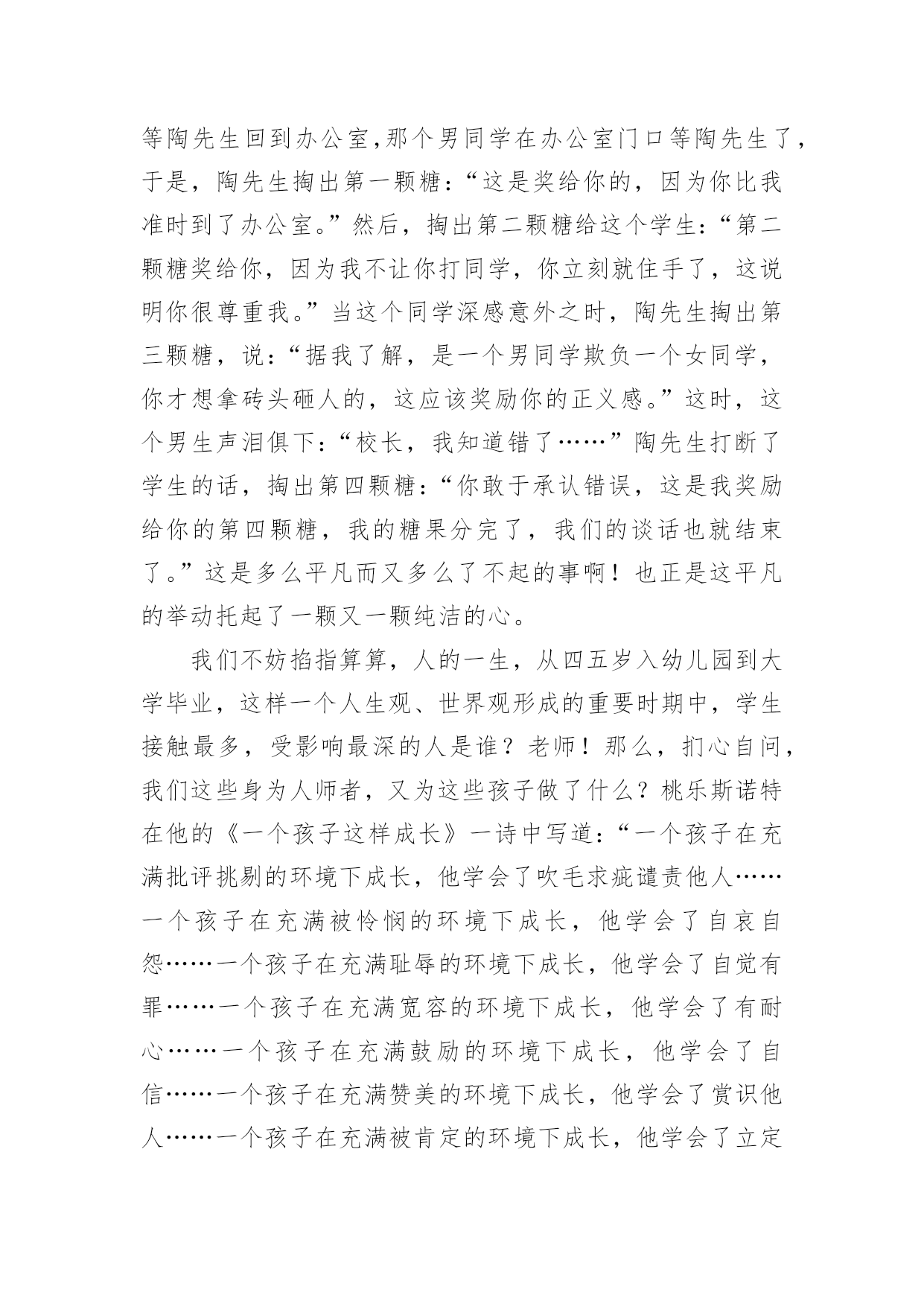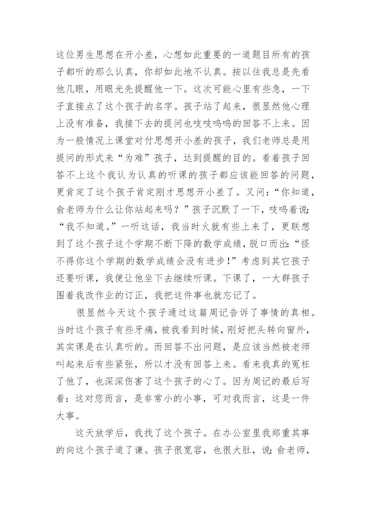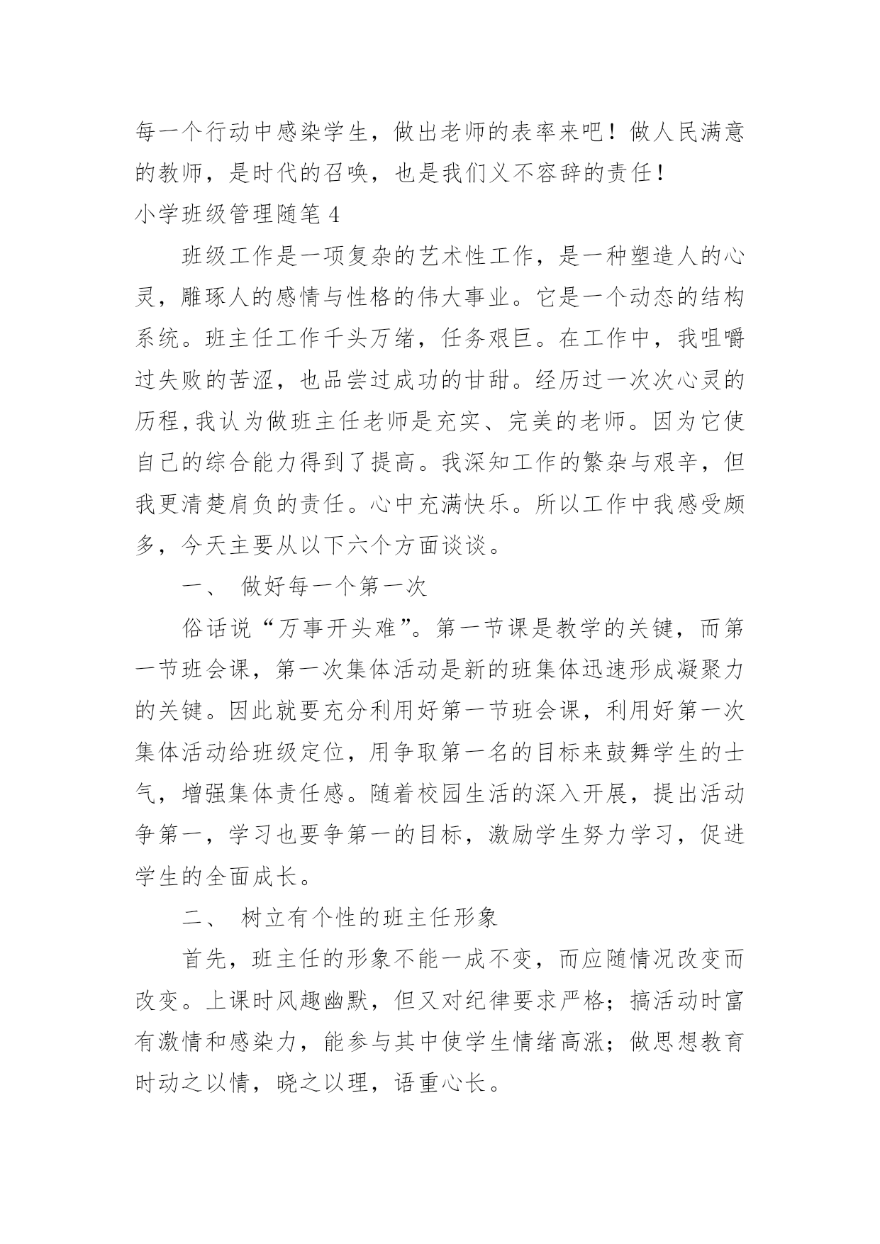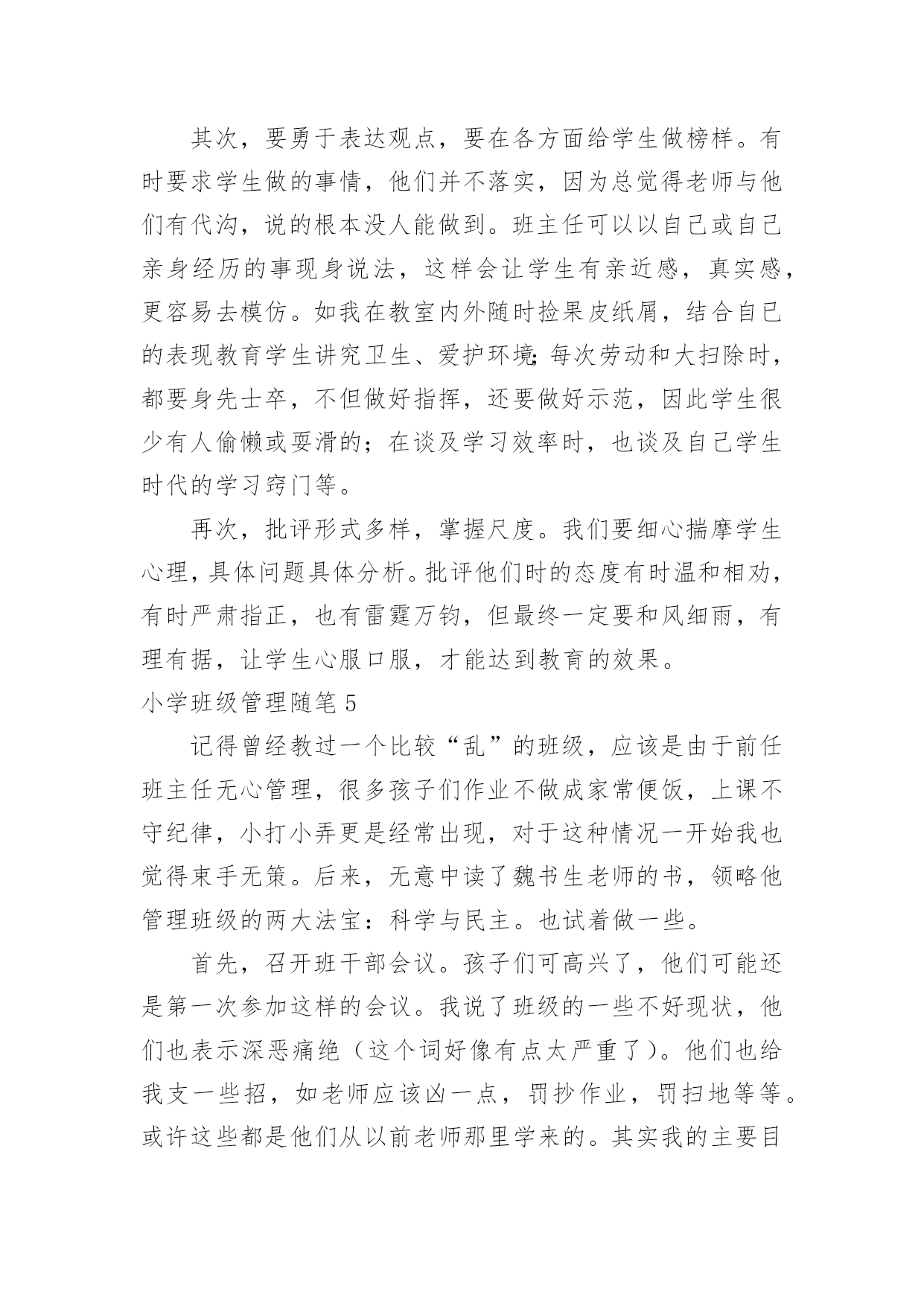 小学班级管理随笔小学班级管理随笔在平时的学习、工作中,大家都看到过不少让自己印象深刻的随笔吧?随笔的创作非常随意,不需要有任何的负担,不需要华丽的辞藻,没有严密的结构,随心写。想要更多的了解随笔吗?下面是小编收集整理的小学班级管理随笔,仅供参考,希望能够帮助到大家。小学班级管理随笔1这是我上星期布置的一篇周记,题目是《记班中的一件小事》。批改的过程中我发现孩子用细腻的笔触描写了孩子发生在班级中的一件件小事,内容是酸甜苦辣,样样都有。这些小事既有我知道的,也有我不知道的,看来通过这次周记的批改能让我更了解这些孩子,更了解这个班级了。然而有一篇周记却让我陷入了深深的反思。这篇周记这样写道:那一天,我永远也忘不了,那件事我一想起来就想哭。因为,那并不是我的错!那天您在上数学课,您叫我们抬起头来,您要讲一道题目。我那时把头抬起来,也专心的听着。……这篇周记把我的思绪带回到上星期的一节数学课。那天我正在上课,刚在分析一道数学题,忽然我的眼睛看到一位男生的眼睛正“专心致志”的看着窗外。当时我的第一反应,这位男生思想在开小差,心想如此重要的一道题目所有的孩子都听的那么认真,你却如此地不认真。按以往我总是先看他几眼,用眼光先提醒他一下。这次可能心里有些急,一下子直接点了这个孩子的名字。孩子站了起来,很显然他心理上没有准备,我接下去的提问也吱吱呜呜的回答不上来。因为一般情况上课堂对付思想开小差的孩子,我们老师总是用提问的形式来“为难”孩子,达到提醒的目的。看着孩子回答不上这个我认为认真的听课的孩子都应该能回答的问题,更肯定了这个孩子肯定刚才思想开小差了。又问:“你知道,俞老师为什么让你站起来吗?”孩子沉默了一下,吱呜着说:“我不知道。”一听这话,我当时火就有些上来了,更联想到了这个孩子这个学期不断下降的数学成绩,脱口而出:“怪不得你这个学期的数学成绩会没有进步!”考虑到其它孩子还要听课,我便让他坐下去继续听课。下课了,一大群孩子围着我改作业的订正,我把这件事也就忘记了。很显然今天这个孩子通过这篇周记告诉了事情的真相。当时这个孩子有些牙痛,被我看到时候,刚好把头转向窗外,其实课是在认真听的。而回答不出问题,是应该当然被老师叫起来后有些紧张,所以才没有回答上来。看来我真的冤枉了他了,也深深伤害了这个孩子的心了。因为周记的最后写着:这对您而言,是非常小的小事,可对我而言,这是一件大事。这天放学后,我找了这个孩子。在办公室里我郑重其事的向这个孩子道了谦。孩子很宽容,也很大肚,说:俞老师,我也错,如果我当时说明情况,事情就不会这样了。后来我又和这个孩子聊了生活难免有被别人冤枉或错怪的时候,当这个时候我们应该学会和别人进行沟通,通过沟通就能消除误会。我们要学会沟通,善于与人沟通。这件事情虽然过去了,但给我反思却是深刻的。如果当时批评的更婉转一些,孩子可能就不会这么伤心。如果我课后就及时找这个孩子谈话,也许误会早就消除了。看来作为一个班主任的我更要学会沟通,更要学会用更宽容的心去看待孩子。小学班级管理随笔2孩子们升入新班级只有三周的时间,而近几天总有老师向我反应我们班有几位学生平时喜欢油腔滑调,上课喜欢插嘴,并且怪腔怪调,非常讨人嫌。几位老师说的情况我也知道,也确实有这方面的毛病,但说实话,他们见了我这些坏毛病只是偶尔的露出来。于是,我和几位老师认真分析了几位学生的具体情况:一类是比较聪明但很调皮,缺乏自制力,带学习上有点得意忘形一类是平时老师关注的较少,插嘴是因为想引起老师的注意一类是天真幼稚型的,所做的事情与学生的心理年龄不相符,贪玩,不把学习放在心上针对上面的三种情况,我就想如何想办法让孩子们静下来,针对这些我采取了以下几个措施:1、上课回答问题必须举手,否则加以批评,平时在班队课,讨论班级问题是也必须举手2、学生自制,对于管不住自己的学生,采取班干部负责,表现优秀的奖励小红花,表现不好的学生给予相应的惩罚,(并结合班级内部的评比机制奖励学生,规矩定下来后,许多学生觉得既公平又合理,在班级管理上就比较得心应手)3、多鼓励,鼓励和赞美永远是一剂良药,发现学生身上的闪光点比发现学生身上的缺点来的更有价值,也更有意义。一段时间的实施下来,一些孩子的行为习惯得到了很好的改观。当然,鼓励和表扬也要讲究一定的度,适时的惩罚和警告、批评会让孩子觉得老师的公平、公正。而作为班主任,一定要善于观察学生在学习、生活中通过言行必然要表现出他们的真实行为和思想。因此,洞悉学生的内心世界,需要长时间的、不动声色的观察,并进行多方面的验证。班主任在对学生的观察时要注意有目的、有计划、有针性地进行,切记主观臆断,以免对学生心灵造成伤害。只有这样,才能掌握第一手材料,并在此基础上采取灵活有效的教育方法。小学班级管理随笔3记得苏霍姆林斯基曾说“教育技巧的全部奥妙也就在于如何爱护儿童