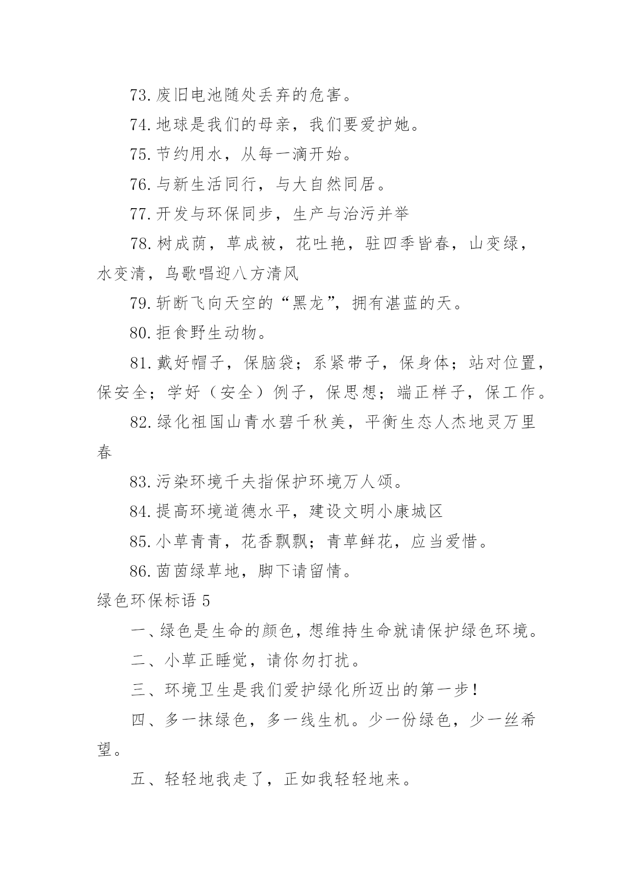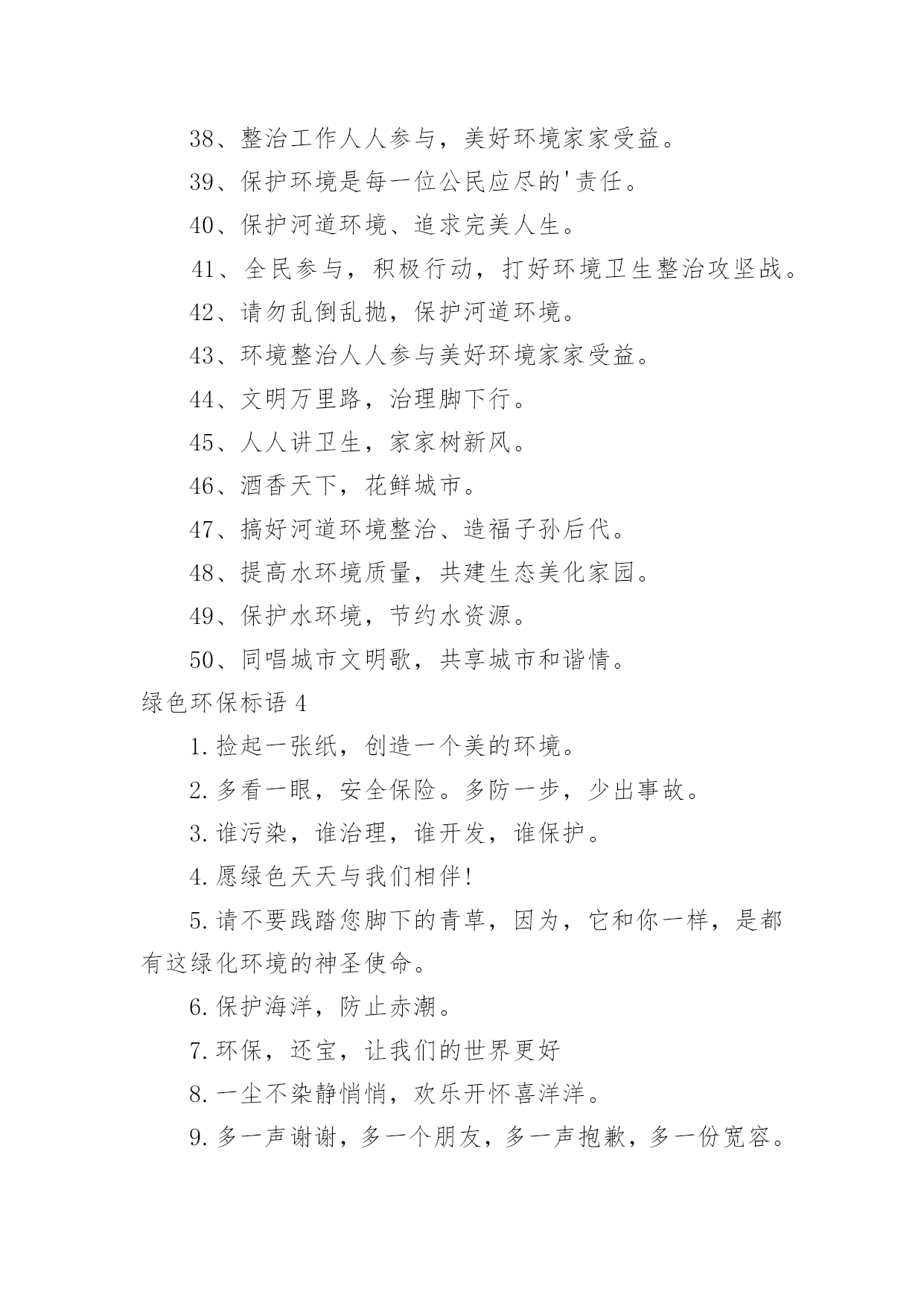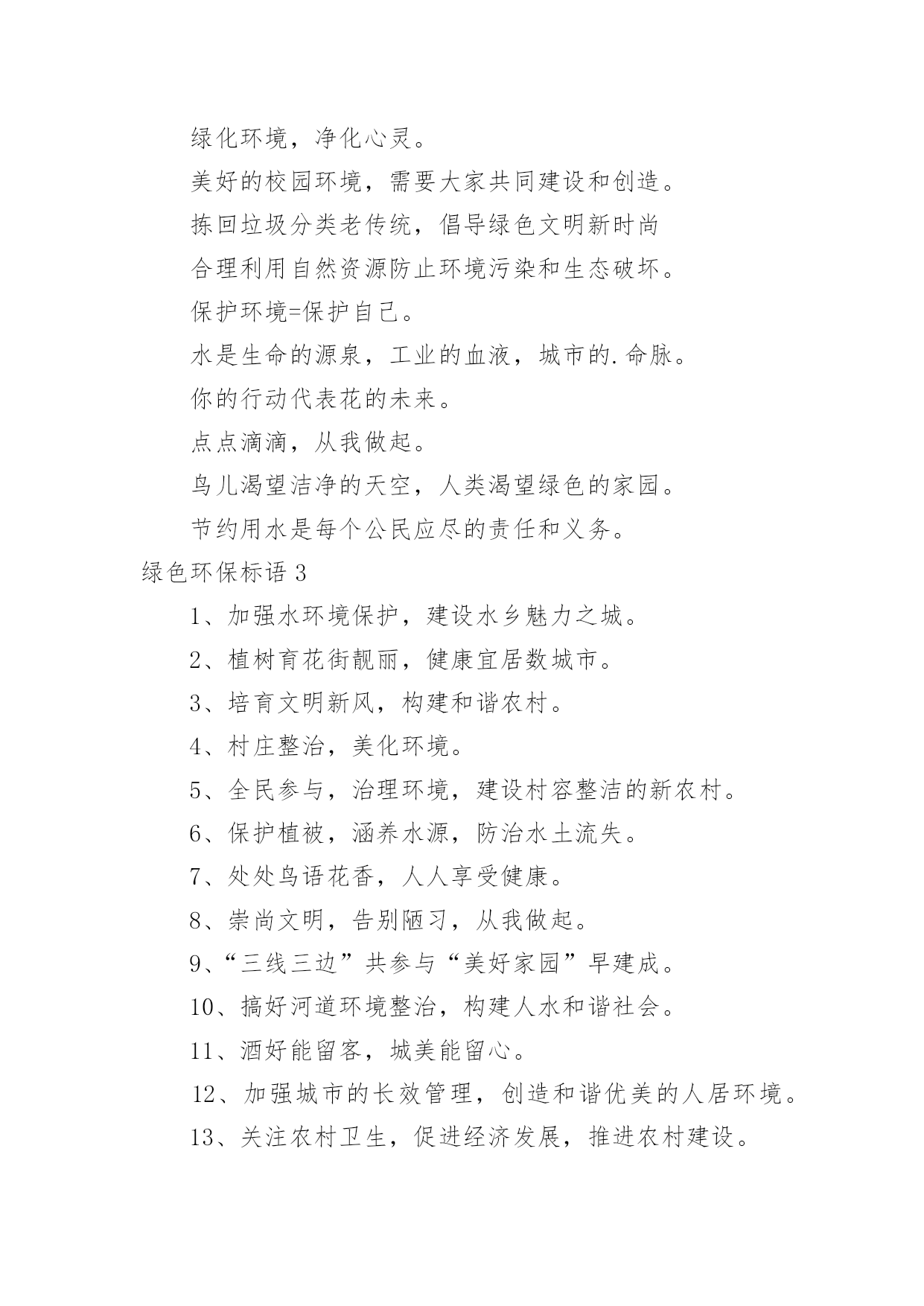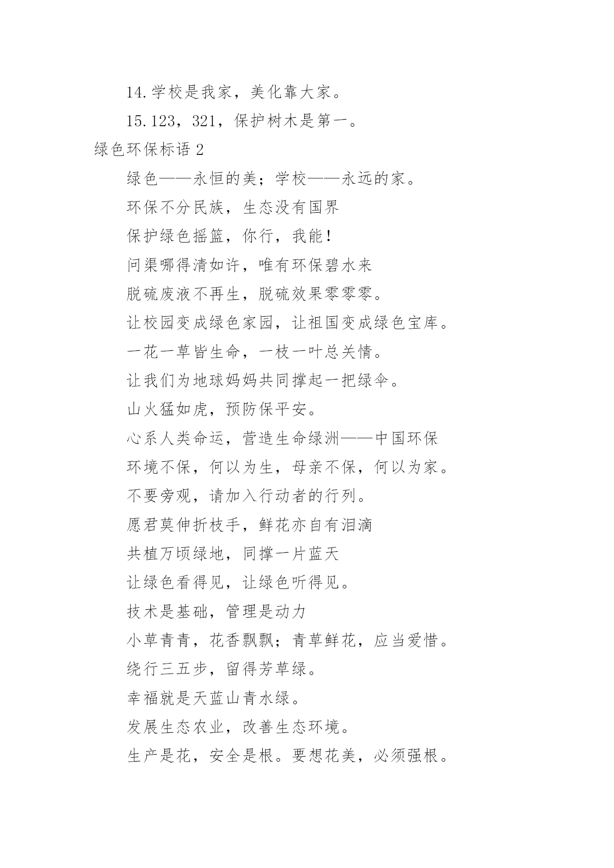 绿色环保标语绿色环保标语(15篇)无论是身处学校还是步入社会,大家最不陌生的就是标语了吧,标语是指文字简练、意义鲜明的宣传、鼓动口号。其实很多朋友都不太清楚什么样的标语才是好的标语,以下是小编为大家收集的绿色环保标语,欢迎阅读,希望大家能够喜欢。绿色环保标语11.爱花、爱草、爱树、爱校园。2.美丽的`校园,美丽的家,永远的美丽靠大家。3.人间知音难觅,校园草坪难培。4.把绿色带入校园。5.家园由我来保护。6.尊崇自然、敬畏生命。7.创建环保模范城市,建设环保绿色家园。8.但存方寸地,留与子孙耕。9.让校园变成绿色家园,让祖国变成绿色宝库。10.幸福生活不只在于丰衣足食,也在于碧水蓝天。11.善待地球就是善待自己。12.8.节约为本,治污优先。13.人类离不开花草,就像婴儿离不开母亲的怀抱。14.学校是我家,美化靠大家。15.123,321,保护树木是第一。绿色环保标语2绿色——永恒的美;学校——永远的家。环保不分民族,生态没有国界保护绿色摇篮,你行,我能!问渠哪得清如许,唯有环保碧水来脱硫废液不再生,脱硫效果零零零。让校园变成绿色家园,让祖国变成绿色宝库。一花一草皆生命,一枝一叶总关情。让我们为地球妈妈共同撑起一把绿伞。山火猛如虎,预防保平安。心系人类命运,营造生命绿洲——中国环保环境不保,何以为生,母亲不保,何以为家。不要旁观,请加入行动者的行列。愿君莫伸折枝手,鲜花亦自有泪滴共植万顷绿地,同撑一片蓝天让绿色看得见,让绿色听得见。技术是基础,管理是动力小草青青,花香飘飘;青草鲜花,应当爱惜。绕行三五步,留得芳草绿。幸福就是天蓝山青水绿。发展生态农业,改善生态环境。生产是花,安全是根。要想花美,必须强根。把消费限制在生态圈可以承受的范围内美丽有你的一半功劳,也有我的一半功劳。让大地妈妈更加干净、美丽人类靠环境生存,环境靠人类保护。乘阴靠绿树,美化靠大家。距离产生美,谢绝亲密接触多种一棵翠绿的小树,还我一片蔚蓝的天空。保护戈壁植被,防止沙尘污染,保护大气环境。环保与生活相融,环保与时代同行莫踏青草,勿采红花。少一个烟囱,多一片蓝天争做环保使者,共创绿色文明水是生命的源泉,农业的命脉,工业的血液!山中何所有?岑上多白云星星之火,易酿恶果,进山切记,请勿麻痹。空气、清水、绿色,我们无价的财富。爱护碧水蓝天,拥抱美好明天。今天节约一滴水,留给后人一滴血。拣回垃圾分类老传统,倡导绿色文明新时尚人人关心环境质量,人人参与环境保护。珍惜资源人人有责,爱护环境由心出发森林是我家,我们需要爱护它。推展减废运动,做好废弃管理与自然重建和谐,与地球重修旧好绿化环境,净化心灵。美好的校园环境,需要大家共同建设和创造。拣回垃圾分类老传统,倡导绿色文明新时尚合理利用自然资源防止环境污染和生态破坏。保护环境=保护自己。水是生命的源泉,工业的血液,城市的.命脉。你的行动代表花的未来。点点滴滴,从我做起。鸟儿渴望洁净的天空,人类渴望绿色的家园。节约用水是每个公民应尽的责任和义务。绿色环保标语31、加强水环境保护,建设水乡魅力之城。2、植树育花街靓丽,健康宜居数城市。3、培育文明新风,构建和谐农村。4、村庄整治,美化环境。5、全民参与,治理环境,建设村容整洁的新农村。6、保护植被,涵养水源,防治水土流失。7、处处鸟语花香,人人享受健康。8、崇尚文明,告别陋习,从我做起。9、“三线三边”共参与“美好家园”早建成。10、搞好河道环境整治,构建人水和谐社会。11、酒好能留客,城美能留心。12、加强城市的长效管理,创造和谐优美的人居环境。13、关注农村卫生,促进经济发展,推进农村建设。14、整治城乡环境,共建美好家园。15、保护水环境,人人有责,人人受益。16、城市是我家,文明靠大家。17、市民素质高一分,城乡环境美十分。18、全民参与村庄环境治理,建设美好家园。19、草儿绿、花儿香,环境优美人健康。20、加强河道管护,维护良好环境。21、综合治理做到家,城市环境人人夸。22、青山绿水好,农村要环保。23、家庭卫生天天好,城乡环境日日新。24、卫生关系你我他,环境整治靠大家。25、污染环境,害人害已。26、“三线三边”环境提升,生活美好幸福人人!27、卫生关联你我他,齐抓共管靠大家。28、水清岸绿城乡美,和谐文明城市人。29、保护生态环境,造福子孙后代。30、城市国色天香,天地一尘不染。31、建新绿色生态村,构建社会主义新农村。32、让我们共同行动,还家园碧水,蓝天。33、垃圾分分类,资源不浪费。34、监护水源——保护水源就是保护生命。35、全民参与,治理环境,建设整洁优美新家园。36、保护环境常抓不懈、保持清洁持之以恒。37、请保护河道,维护生命健康。38、整治工作人人参与,美好环境家家受益。39、保护环境是每一位公民应尽的'责任。40、保护河道环境、追求完美人生