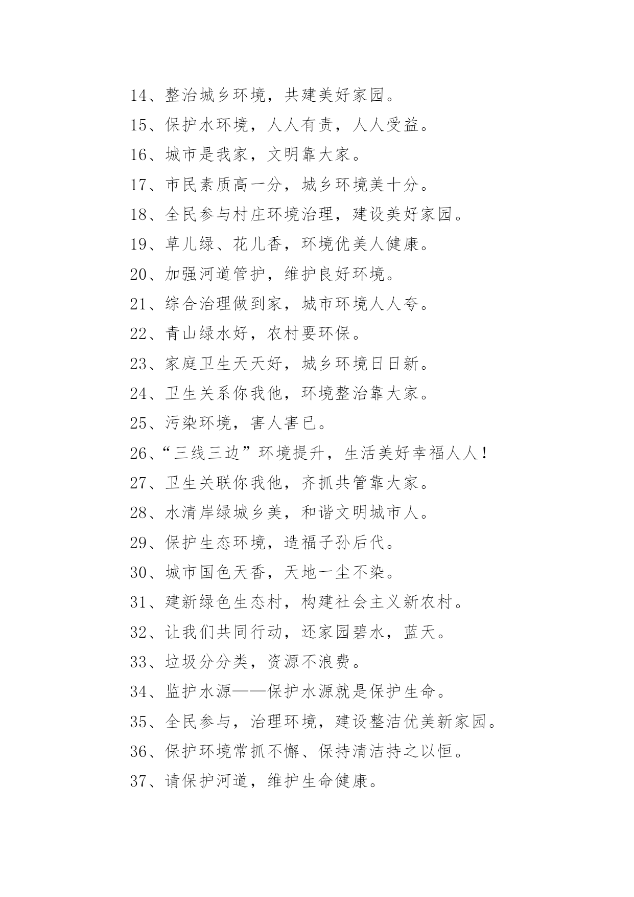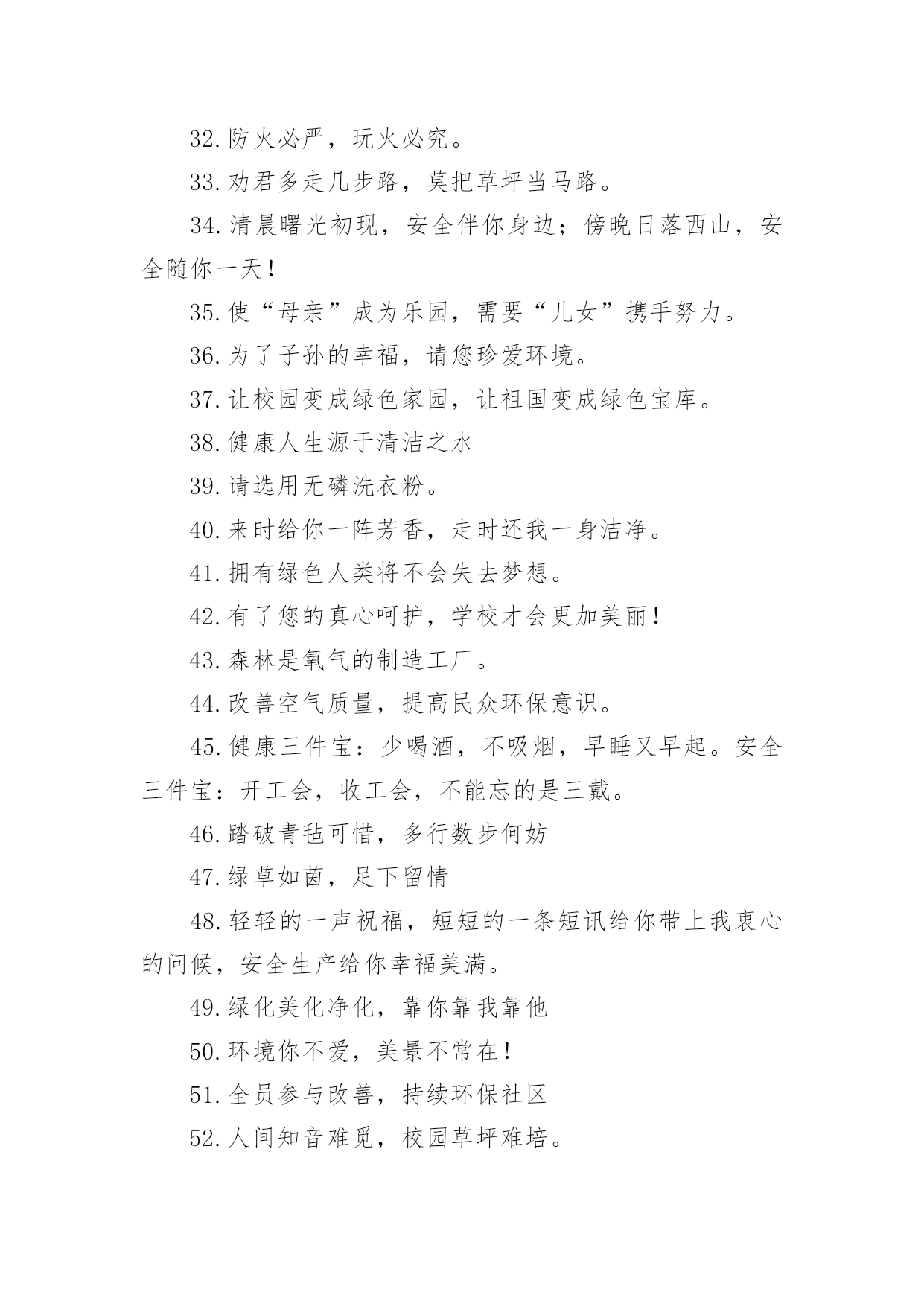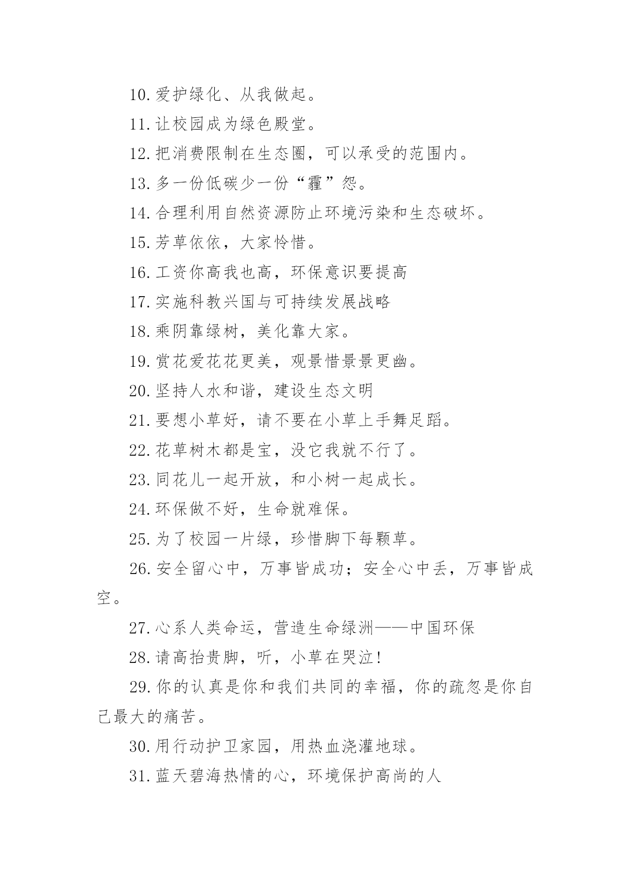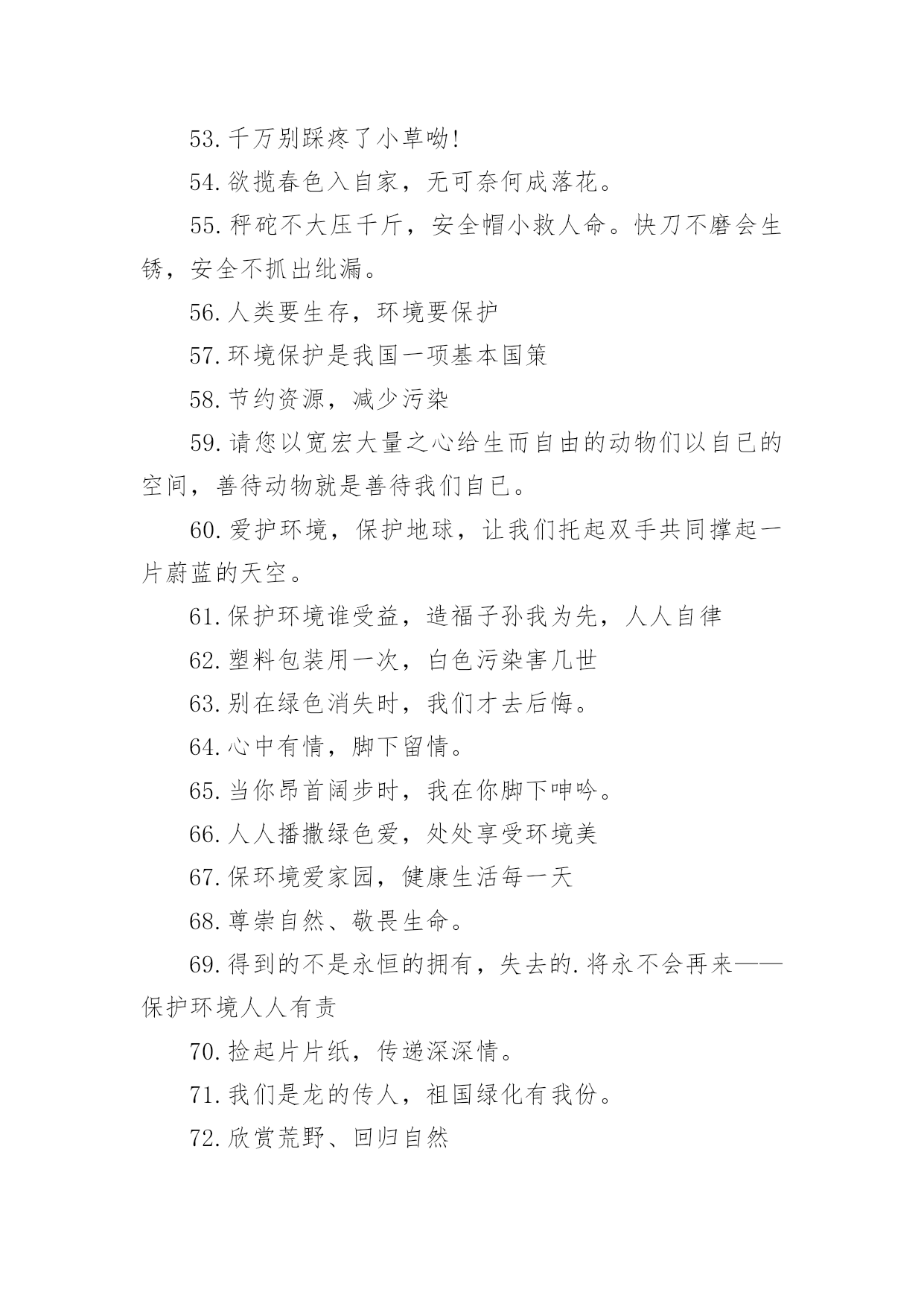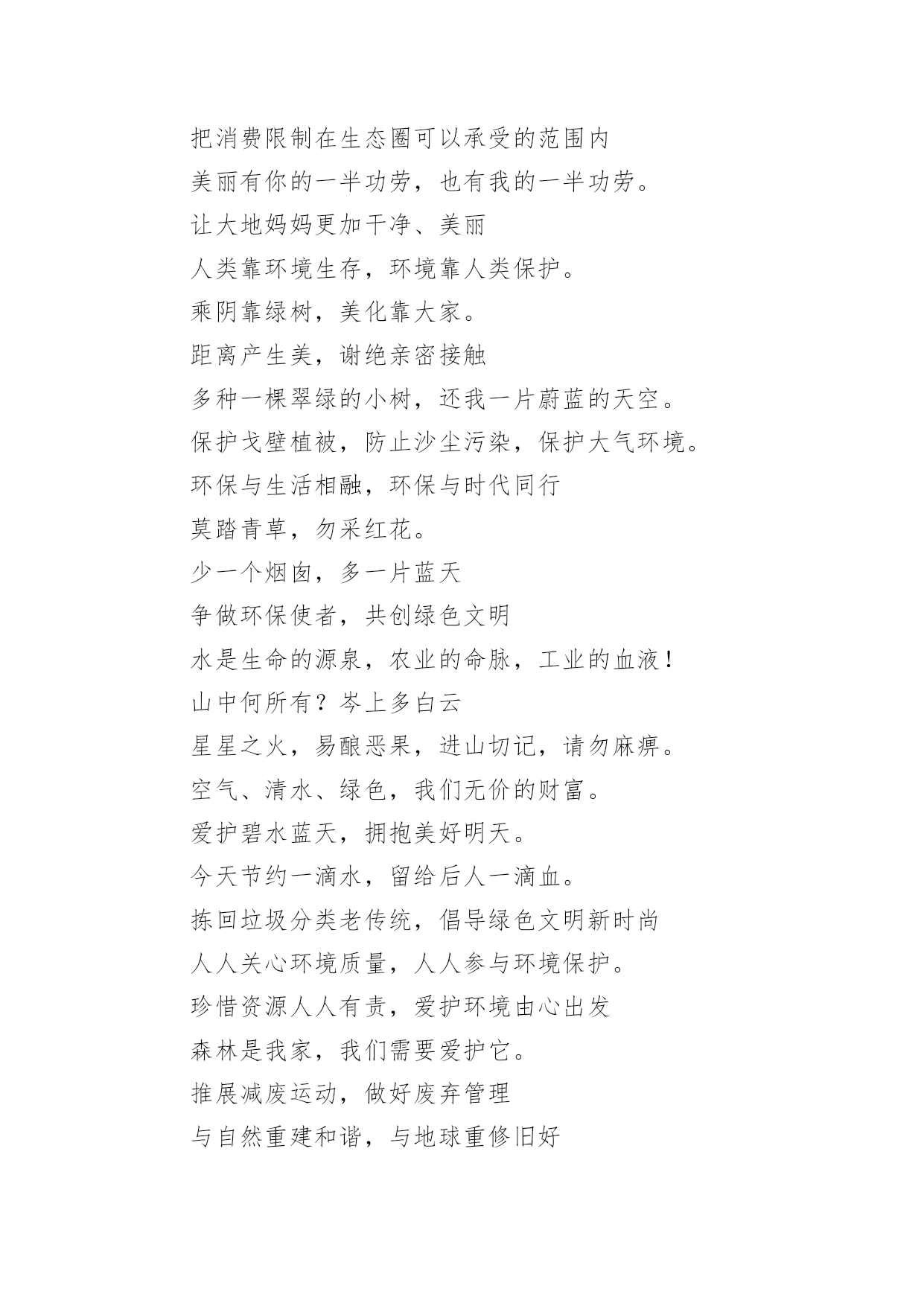 绿色环保标语绿色环保标语(15篇)无论是身处学校还是步入社会,大家最不陌生的就是标语了吧,标语是指文字简练、意义鲜明的宣传、鼓动口号。其实很多朋友都不太清楚什么样的标语才是好的标语,以下是小编为大家收集的绿色环保标语,欢迎阅读,希望大家能够喜欢。绿色环保标语11.爱花、爱草、爱树、爱校园。2.美丽的`校园,美丽的家,永远的美丽靠大家。3.人间知音难觅,校园草坪难培。4.把绿色带入校园。5.家园由我来保护。6.尊崇自然、敬畏生命。7.创建环保模范城市,建设环保绿色家园。8.但存方寸地,留与子孙耕。9.让校园变成绿色家园,让祖国变成绿色宝库。10.幸福生活不只在于丰衣足食,也在于碧水蓝天。11.善待地球就是善待自己。12.8.节约为本,治污优先。13.人类离不开花草,就像婴儿离不开母亲的怀抱。14.学校是我家,美化靠大家。15.123,321,保护树木是第一。绿色环保标语2绿色——永恒的美;学校——永远的家。环保不分民族,生态没有国界保护绿色摇篮,你行,我能!问渠哪得清如许,唯有环保碧水来脱硫废液不再生,脱硫效果零零零。让校园变成绿色家园,让祖国变成绿色宝库。一花一草皆生命,一枝一叶总关情。让我们为地球妈妈共同撑起一把绿伞。山火猛如虎,预防保平安。心系人类命运,营造生命绿洲——中国环保环境不保,何以为生,母亲不保,何以为家。不要旁观,请加入行动者的行列。愿君莫伸折枝手,鲜花亦自有泪滴共植万顷绿地,同撑一片蓝天让绿色看得见,让绿色听得见。技术是基础,管理是动力小草青青,花香飘飘;青草鲜花,应当爱惜。绕行三五步,留得芳草绿。幸福就是天蓝山青水绿。发展生态农业,改善生态环境。生产是花,安全是根。要想花美,必须强根。把消费限制在生态圈可以承受的范围内美丽有你的一半功劳,也有我的一半功劳。让大地妈妈更加干净、美丽人类靠环境生存,环境靠人类保护。乘阴靠绿树,美化靠大家。距离产生美,谢绝亲密接触多种一棵翠绿的小树,还我一片蔚蓝的天空。保护戈壁植被,防止沙尘污染,保护大气环境。环保与生活相融,环保与时代同行莫踏青草,勿采红花。少一个烟囱,多一片蓝天争做环保使者,共创绿色文明水是生命的源泉,农业的命脉,工业的血液!山中何所有?岑上多白云星星之火,易酿恶果,进山切记,请勿麻痹。空气、清水、绿色,我们无价的财富。爱护碧水蓝天,拥抱美好明天。今天节约一滴水,留给后人一滴血。拣回垃圾分类老传统,倡导绿色文明新时尚人人关心环境质量,人人参与环境保护。珍惜资源人人有责,爱护环境由心出发森林是我家,我们需要爱护它。推展减废运动,做好废弃管理与自然重建和谐,与地球重修旧好绿化环境,净化心灵。美好的校园环境,需要大家共同建设和创造。拣回垃圾分类老传统,倡导绿色文明新时尚合理利用自然资源防止环境污染和生态破坏。保护环境=保护自己。水是生命的源泉,工业的血液,城市的.命脉。你的行动代表花的未来。点点滴滴,从我做起。鸟儿渴望洁净的天空,人类渴望绿色的家园。节约用水是每个公民应尽的责任和义务。绿色环保标语31、加强水环境保护,建设水乡魅力之城。2、植树育花街靓丽,健康宜居数城市。3、培育文明新风,构建和谐农村。4、村庄整治,美化环境。5、全民参与,治理环境,建设村容整洁的新农村。6、保护植被,涵养水源,防治水土流失。7、处处鸟语花香,人人享受健康。8、崇尚文明,告别陋习,从我做起。9、“三线三边”共参与“美好家园”早建成。10、搞好河道环境整治,构建人水和谐社会。11、酒好能留客,城美能留心。12、加强城市的长效管理,创造和谐优美的人居环境。13、关注农村卫生,促进经济发展,推进农村建设。14、整治城乡环境,共建美好家园。15、保护水环境,人人有责,人人受益。16、城市是我家,文明靠大家。17、市民素质高一分,城乡环境美十分。18、全民参与村庄环境治理,建设美好家园。19、草儿绿、花儿香,环境优美人健康。20、加强河道管护,维护良好环境。21、综合治理做到家,城市环境人人夸。22、青山绿水好,农村要环保。23、家庭卫生天天好,城乡环境日日新。24、卫生关系你我他,环境整治靠大家。25、污染环境,害人害已。26、“三线三边”环境提升,生活美好幸福人人!27、卫生关联你我他,齐抓共管靠大家。28、水清岸绿城乡美,和谐文明城市人。29、保护生态环境,造福子孙后代。30、城市国色天香,天地一尘不染。31、建新绿色生态村,构建社会主义新农村。32、让我们共同行动,还家园碧水,蓝天。33、垃圾分分类,资源不浪费。34、监护水源——保护水源就是保护生命。35、全民参与,治理环境,建设整洁优美新家园。36、保护环境常抓不懈、保持清洁持之以恒。37、请保护河道,维护生命健康。38、整治工作人人参与,美好环境家家受益。39、保护环境是每一位公民应尽的'责任。40、保护河道环境、追求完美人生