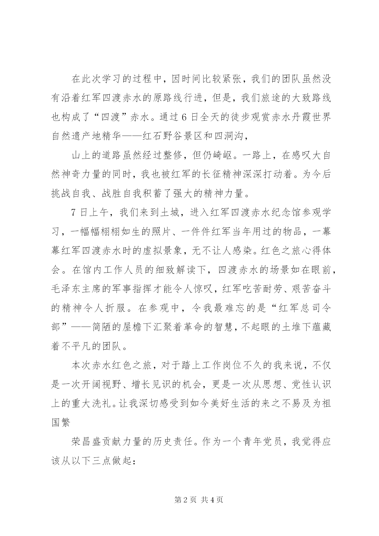 第PAGE\*Arabic\*MERGEFORMAT4页共NUMPAGES\*MERGEFORMAT4页商业资料“红色之旅”心得体会红色之旅心得体会-红色之旅心得体会8月5日上午,机关工会干部及相关人员共49人组团乘车离开重庆,踏上去往赤水的旅途,一路上,在导游的带动下,大家有说有笑,工会干部细致周到的安排,使得大家激情高涨,丝毫没有旅途中的疲惫,在车上,大家互帮互助,气氛和谐融洽。经过3个半小时左右乘坐长途旅游车的颠簸,我们的团队来到了四川和贵州两省的交界处——赤水河边,并在XX省境内住宿。简单收拾好行李后,我们来到赤水河边,遥望河对面,灯火辉煌,赤水河波光闪耀,就在这个地方发生了驰名中外、对中央红军长征成败起到决定性作用的四渡赤水战役。红色之旅心得体会回顾这段在赤水河上发生的光辉历史:“1935年1月15日至17日遵义会议之后,中央红军在长征途中,处于国民党几十万重兵围追堵截的艰险条件下。红色之旅心得体会。毛泽东、周恩来、王稼祥、朱德等指挥中央红军采取高度机动的运动战方针,纵横驰骋于川黔滇边境广大地区,积极寻找战机,有效地调动和歼灭敌人,彻底粉碎了蒋介石等反动派企图围歼红军于川黔滇边境的狂妄计划,红军取得了战略转移中具有决定意义的胜利。这场战役是我军战争史上以少胜多、变被动为主动的光辉范例。”在此次学习的过程中,因时间比较紧张,我们的团队虽然没有沿着红军四渡赤水的原路线行进,但是,我们旅途的大致路线也构成了“四渡”赤水。通过6日全天的徒步观赏赤水丹霞世界自然遗产地精华——红石野谷景区和四洞沟,山上的道路虽然经过整修,但仍崎岖。一路上,在感叹大自然神奇力量的同时,我也被红军的长征精神深深打动着。为今后挑战自我、战胜自我积蓄了强大的精神力量。7日上午,我们来到土城,进入红军四渡赤水纪念馆参观学习,一幅幅栩栩如生的照片、一件件红军当年用过的物品,一幕幕红军四渡赤水时的虚拟景象,无不让人感染。红色之旅心得体会。在馆内工作人员的细致解读下,四渡赤水的场景如在眼前,毛泽东主席的军事指挥才能令人惊叹,红军吃苦耐劳、艰苦奋斗的精神令人折服。在参观中,令我最难忘的是“红军总司令部”——简陋的屋檐下汇聚着革命的智慧,不起眼的土堆下蕴藏着不平凡的团队。本次赤水红色之旅,对于踏上工作岗位不久的我来说,不仅是一次开阔视野、增长见识的机会,更是一次从思想、党性认识上的重大洗礼。让我深切感受到如今美好生活的来之不易及为祖国繁荣昌盛贡献力量的历史责任。作为一个青年党员,我觉得应该从以下三点做起:一、加强理论学习,充实自我。认真学习我国历史,我党的历史,不断学习党的理论,了解时事政策,与时俱进,用先进的理论知识来武装自己的头脑,永葆共产党员的先进性。二、珍惜工作机会,把握青春。珍惜每一份工作,从小事做起,脚踏实地,艰苦奋斗,以饱满的热情和端正的态度迎接每一天的挑战。三、提高专业技能,服务单位。不断学习新的专业知识,勤于实践,提升自己在专业方面的各项技能,为建设具有特色的多学科协调发展的高水平研究型单位做出自己的贡献。最后,感谢机关党委和机关工会的领导们不辞劳苦为我们安排这么好的学习机会,也期盼参加更多这样的学习活动。红色之旅心得体会时光如梭,一转眼“红色之旅“的活动已经过去好几天了,短短几天的相聚,让我再一次感受了狼队的凝聚力;同时使我的工作灵魂又一次得到净化,有了很大的提高。培训之后,回来让我想起了很多、整理过思绪,我写了很多、在南昌的军训中,尽管穿着没有肩章的迷彩,尽管只有短短的两天,我却已经体味到军营的博大精深。印象最深的是第一次站军姿,虽然短短的二十分钟却象过了千万年似的,就在全身每一条神经站的麻木浑身发抖想放弃的时候,教官的一番话却让我又一次振作起来,“只要我们再努力一点,就可以走到别人的前面”,其实何止站军姿是如此,我们现在面对医药行业的销售困境不也是这样吗。虽然前方的路重重险阻,阻力如山,但是只要我们顶住当前形势的压力,排除万难,取得成功的时候,回首望去会发现那只不过是一些另类的风景,所以军营是历练意志的好学校。