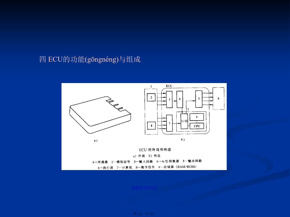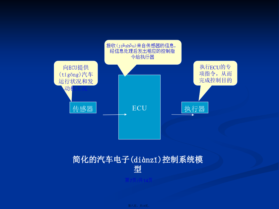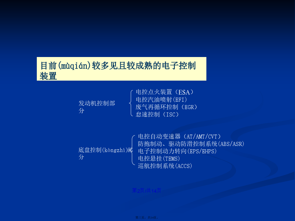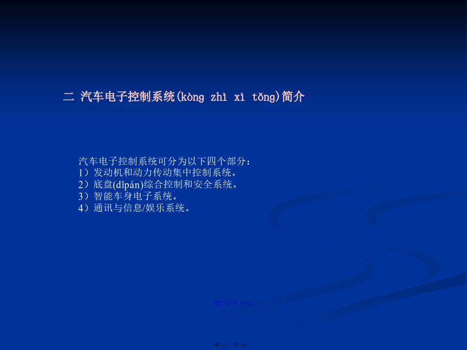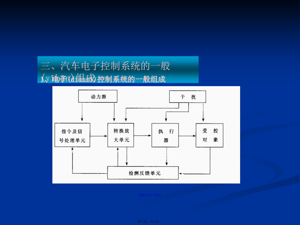 会计学二汽车电子控制系统(kònɡzhìxìtǒnɡ)简介目前(mùqián)较多见且较成熟的电子控制装置行驶(xíngshǐ)安全系统三、汽车电子控制系统的一般(yībān)组成(1)、检测反馈单元(dānyuán)通过各种传感器检测受控参数或其它中间变量,经放大、转换后用以显示或作为反馈信号。(4).执行器直接驱动受控对象的部件,可以是电磁元件,如电磁铁、电动机等;也可以是液压或气动元件,如液压或气压工作缸及马达。为了使驱动特性(tèxìng)与受控对象的负荷特性(tèxìng)相互匹配,还可附加变速机构,如液压马达和行星齿轮传动的组合。简化的汽车电子(diànzǐ)控制系统模型输入(shūrù)回路的作用是将传感器输入(shūrù)的信号,在除去杂波和把正弦波转变为矩形波后,再转换成输入(shūrù)电平(2)A/D转换器(模拟/数字(shùzì)转换器)由传感器输入的模拟信号,微机不能直接处理,故要用A/D转换器将模拟信号转换成数字(shùzì)信号,再输入微机。(3)微型计算机微机的功用是根据发动机工作的需要,把各种传感器送来的信号用内存(nèicún)的程序(微机处理的顺序)和数据进行运算处理,并把处理结果如汽油喷射控制信号、点火控制信号等送往输出回路。Theend
