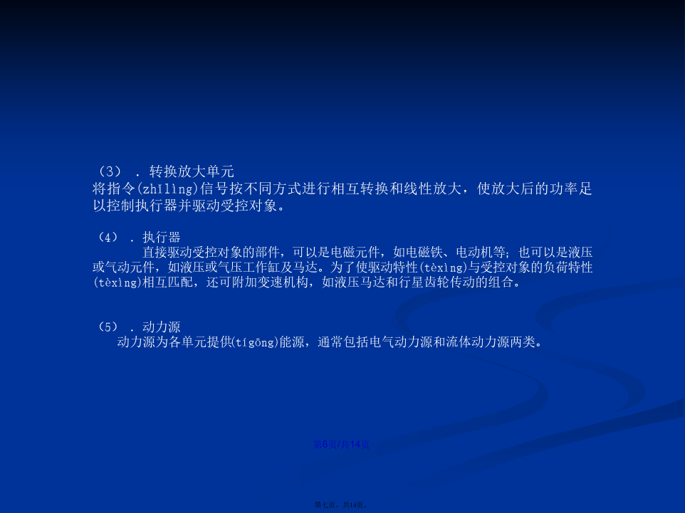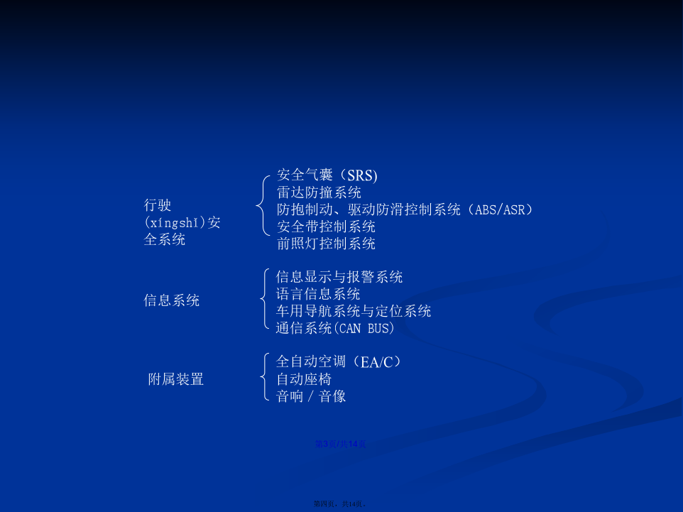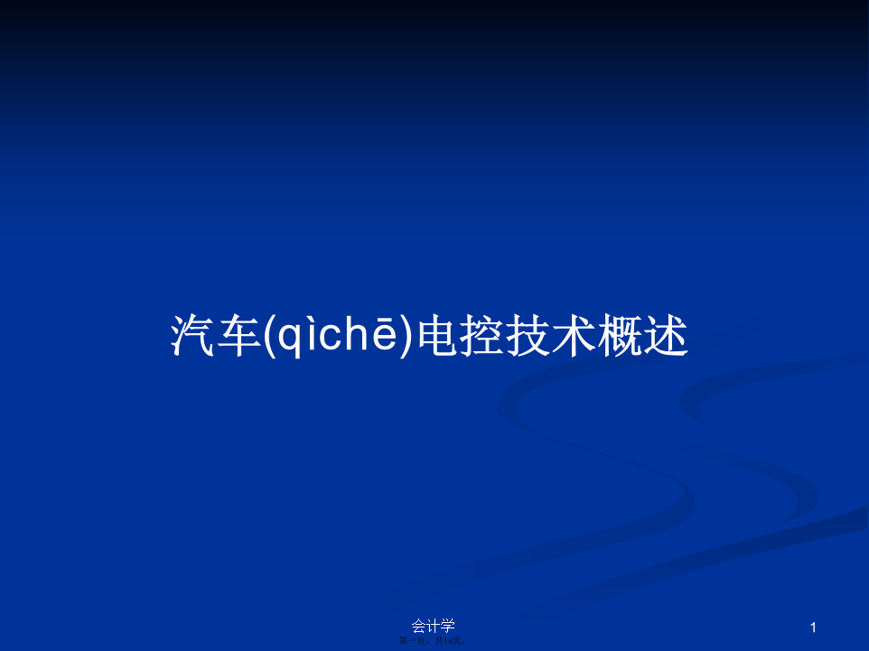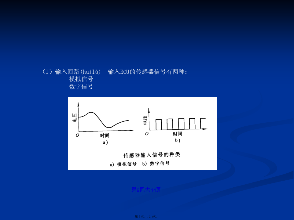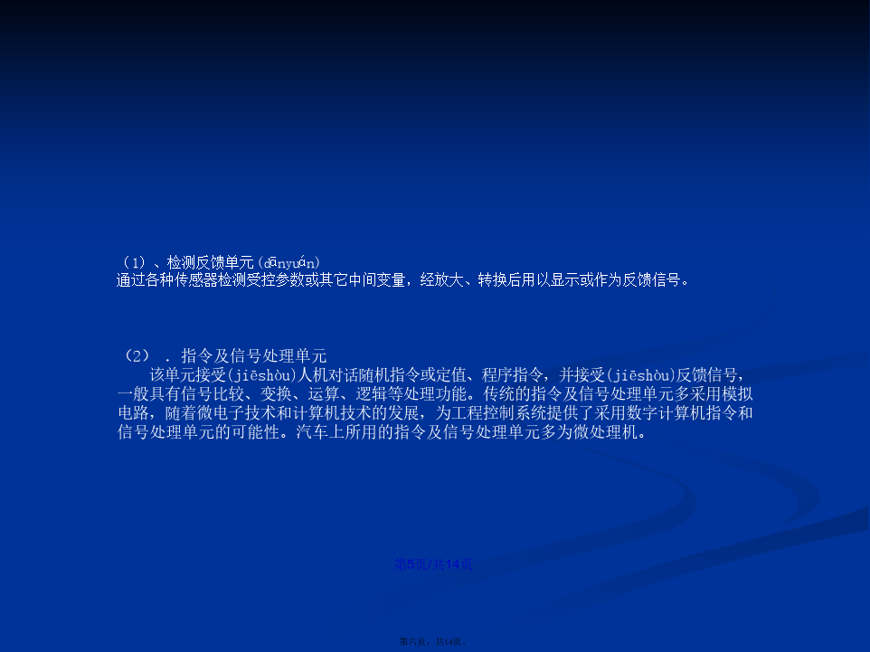 会计学二汽车电子控制系统(kònɡzhìxìtǒnɡ)简介目前(mùqián)较多见且较成熟的电子控制装置行驶(xíngshǐ)安全系统三、汽车电子控制系统的一般(yībān)组成(1)、检测反馈单元(dānyuán)通过各种传感器检测受控参数或其它中间变量,经放大、转换后用以显示或作为反馈信号。(4).执行器直接驱动受控对象的部件,可以是电磁元件,如电磁铁、电动机等;也可以是液压或气动元件,如液压或气压工作缸及马达。为了使驱动特性(tèxìng)与受控对象的负荷特性(tèxìng)相互匹配,还可附加变速机构,如液压马达和行星齿轮传动的组合。简化的汽车电子(diànzǐ)控制系统模型输入(shūrù)回路的作用是将传感器输入(shūrù)的信号,在除去杂波和把正弦波转变为矩形波后,再转换成输入(shūrù)电平(2)A/D转换器(模拟/数字(shùzì)转换器)由传感器输入的模拟信号,微机不能直接处理,故要用A/D转换器将模拟信号转换成数字(shùzì)信号,再输入微机。(3)微型计算机微机的功用是根据发动机工作的需要,把各种传感器送来的信号用内存(nèicún)的程序(微机处理的顺序)和数据进行运算处理,并把处理结果如汽油喷射控制信号、点火控制信号等送往输出回路。Theend