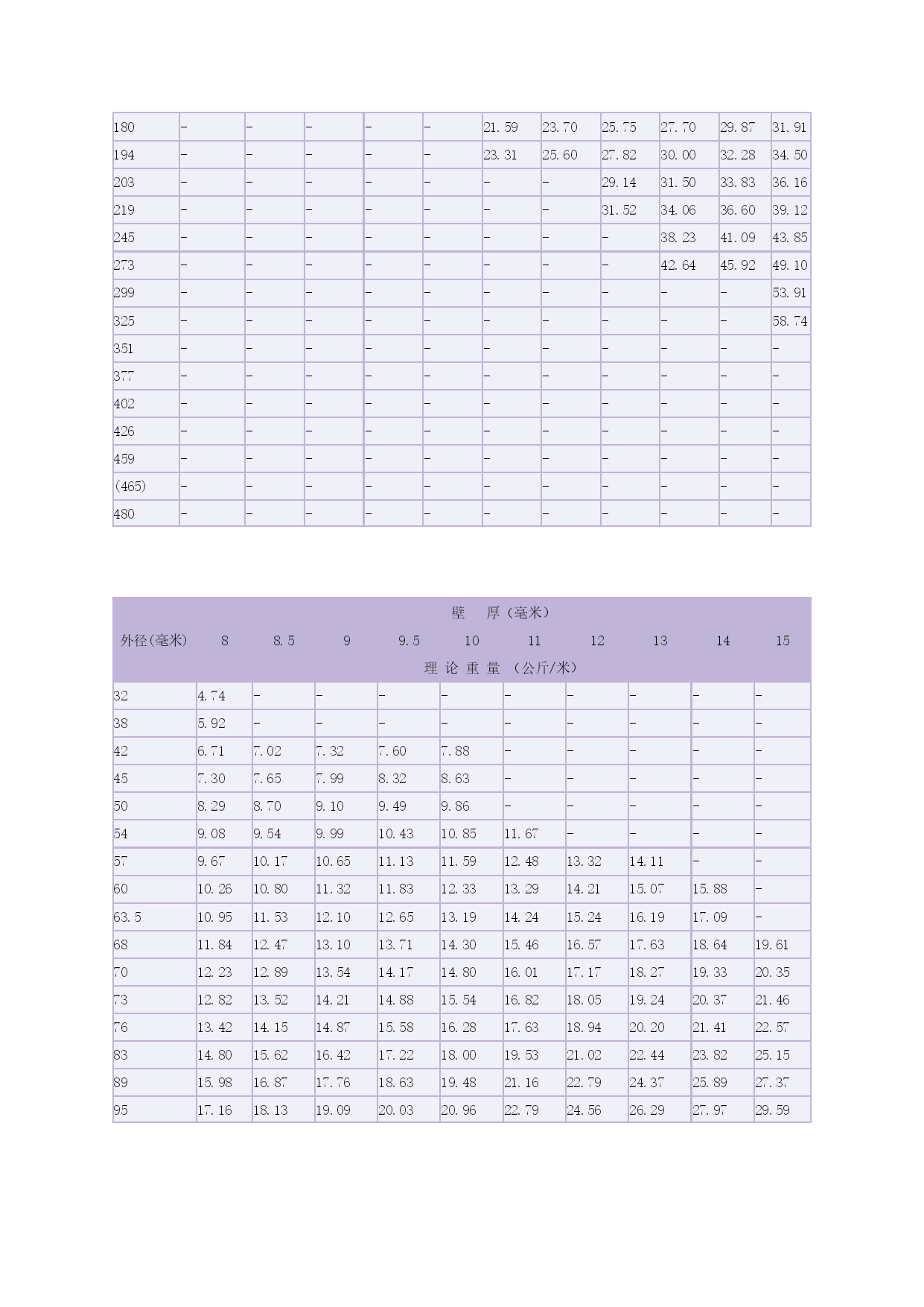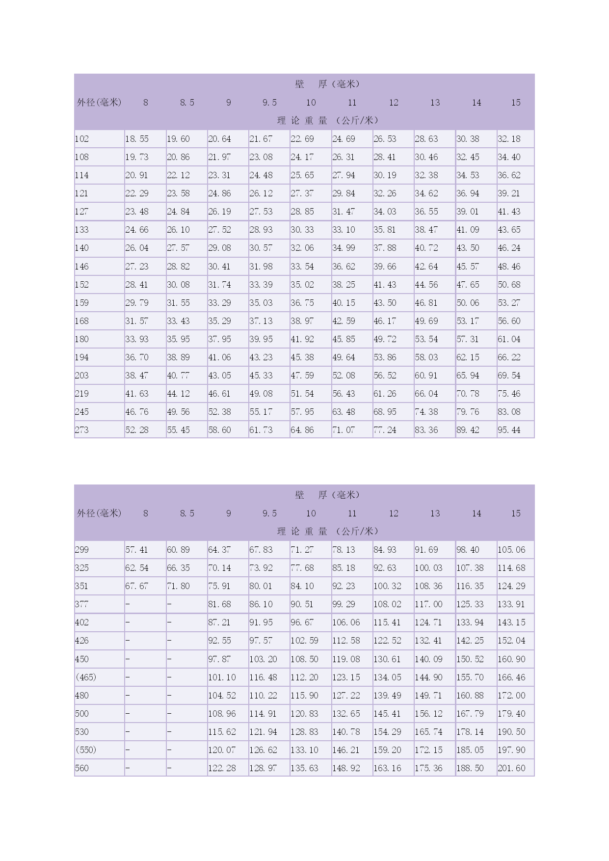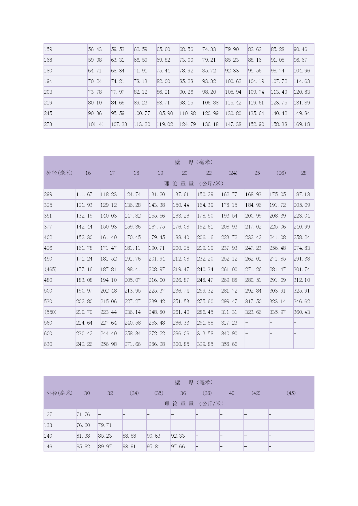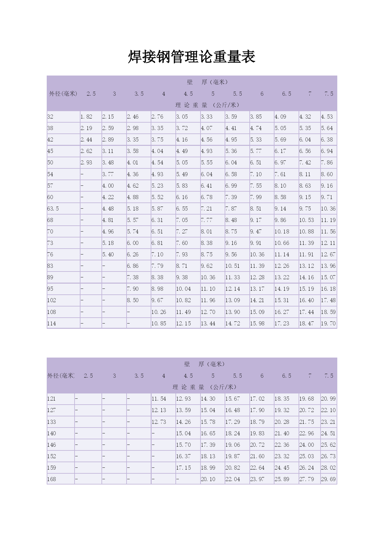 焊接钢管理论重量表优质资料(可以直接使用,可编辑优质资料,欢迎下载)焊接钢管理论重量表外径(毫米)壁厚(毫米)2.533.544.555.566.577.5理论重量(公斤/米)321.822.152.462.763.053.333.593.854.094.324.53382.192.592.983.353.724.074.414.745.055.355.64422.442.893.353.754.164.564.955.335.696.046.38452.623.113.584.044.494.935.365.776.176.566.94502.933.484.014.545.055.556.046.516.977.427.8654-3.774.364.935.496.046.587.107.618.118.6057-4.004.625.235.836.416.997.558.108.639.1660-4.224.885.526.166.787.397.998.589.159.7163.5-4.485.185.876.557.217.878.519.149.7510.3668-4.815.576.317.057.778.489.179.8610.5311.1970-4.965.746.517.278.018.759.4710.1810.8811.5673-5.186.006.817.608.389.169.9110.6611.3912.1176-5.406.267.107.938.759.5610.3611.1411.9112.6783--6.867.798.719.6210.5111.3912.2613.1213.9689--7.388.389.3810.3611.3312.2813.2214.1615.0795--7.908.9810.0411.1012.1413.1714.1915.1916.18102--8.509.6710.8211.9613.0914.2115.3116.4017.48108---10.2611.4912.7013.9015.0916.2717.4418.59114---10.8512.1513.4414.7215.9817.2318.4719.70外径(毫米)壁厚(毫米)2.533.544.555.566.577.5理论重量(公斤/米)121---11.5412.9314.3015.6717.0218.3519.6820.99127---12.1313.5915.0416.4817.9019.3220.7222.10133---12.7314.2615.7817.2918.7920.2821.7523.21140----15.0416.6518.2419.8321.4022.9624.51146----15.7017.3919.0620.7222.3624.0025.62152----16.3718.1319.8721.6023.3225.0326.73159----17.1518.9920.8222.6424.4526.2428.02168-----20.1022.0423.9725.8927.7929.69180-----21.5923.7025.7527.7029.8731.91194-----23.3125.6027.8230.0032.2834.50203-------29.1431.5033.8336.16219-------31.5234.0636.6039.12245--------38.2341.0943.85273--------42.6445.9249.10299----------53.91325----------58.74351-----------377-----------402-----------426-----------459-----------(465)-----------480-----------外径(毫米)壁厚(毫米)88.599.5101112131415理论重量(公斤/米)324.74---------385.92---------426.717.027.327.607.88-----457.307.657.998.328.63-----508.298.709.109.499.86-----549.089.549.9910.4310.8511.67----579.6710.1710.6511.1311.5912.4813.3214.11--6010.2610.8011.3211.8312.3313.2914.2115.0715.88-63.510.9511.5312.1012.6513.1914.2415.2416.1917.09-