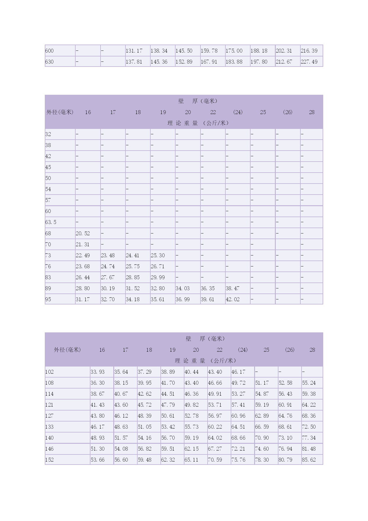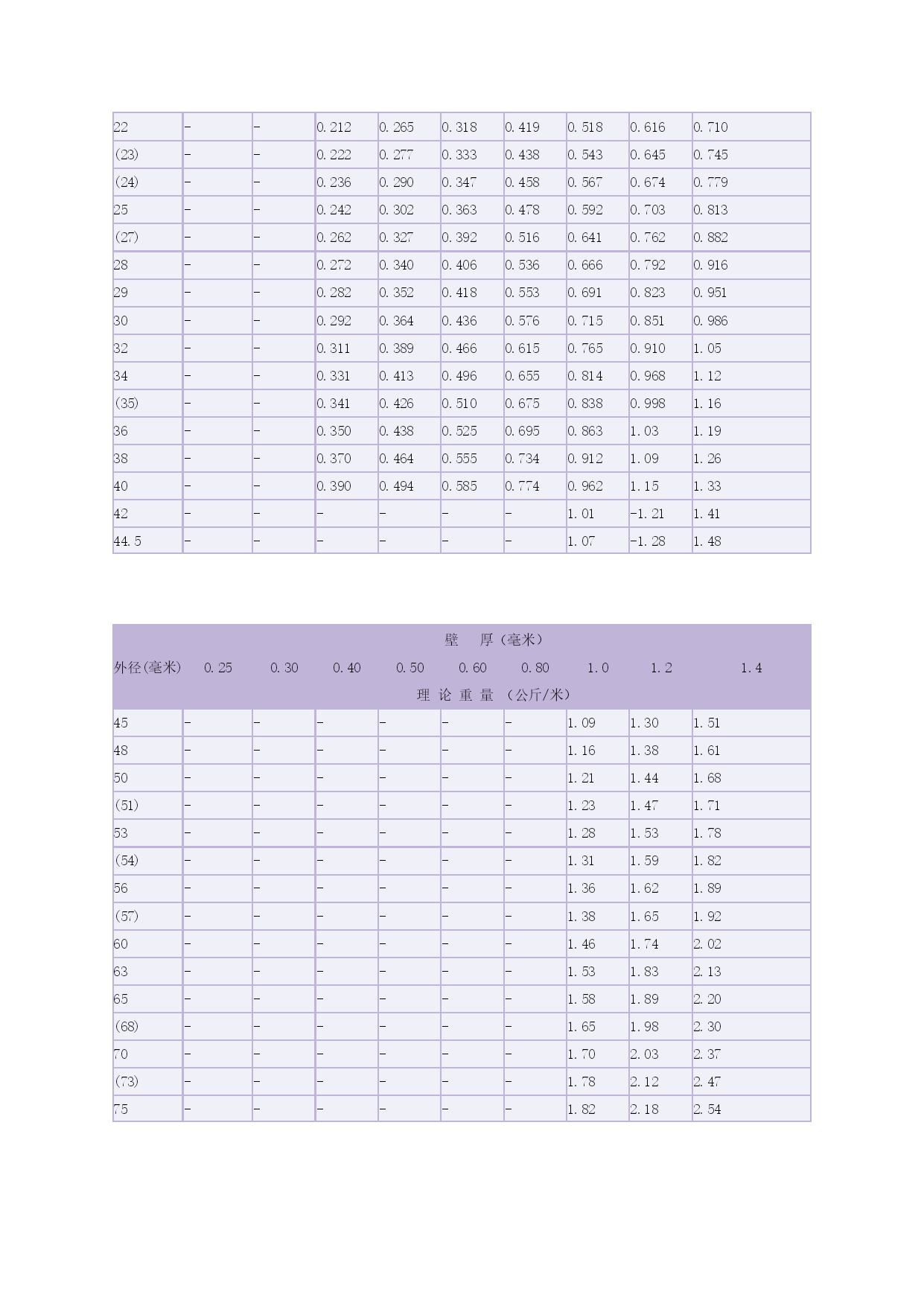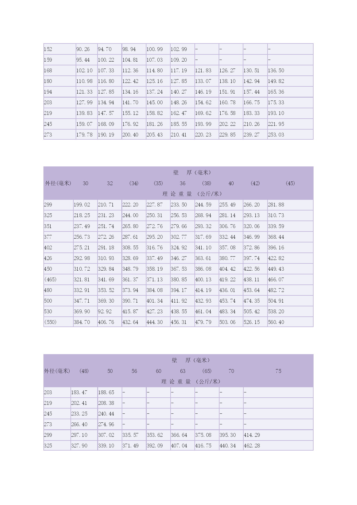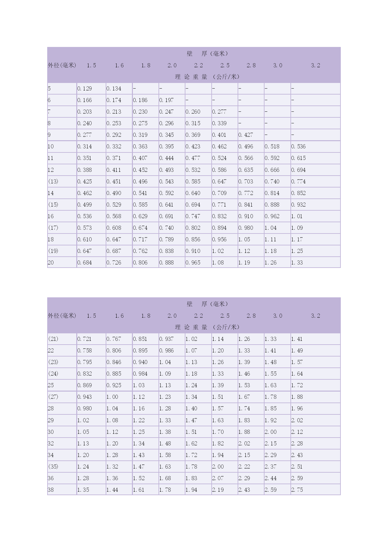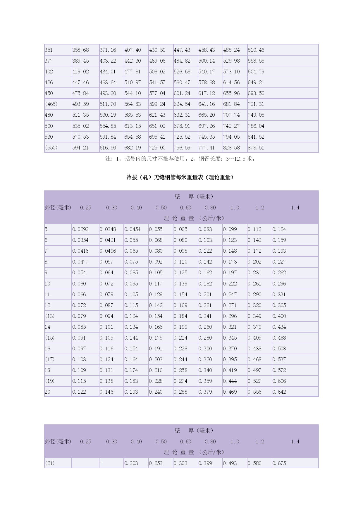 焊接钢管理论重量表优质资料(可以直接使用,可编辑优质资料,欢迎下载)焊接钢管理论重量表外径(毫米)壁厚(毫米)2.533.544.555.566.577.5理论重量(公斤/米)321.822.152.462.763.053.333.593.854.094.324.53382.192.592.983.353.724.074.414.745.055.355.64422.442.893.353.754.164.564.955.335.696.046.38452.623.113.584.044.494.935.365.776.176.566.94502.933.484.014.545.055.556.046.516.977.427.8654-3.774.364.935.496.046.587.107.618.118.6057-4.004.625.235.836.416.997.558.108.639.1660-4.224.885.526.166.787.397.998.589.159.7163.5-4.485.185.876.557.217.878.519.149.7510.3668-4.815.576.317.057.778.489.179.8610.5311.1970-4.965.746.517.278.018.759.4710.1810.8811.5673-5.186.006.817.608.389.169.9110.6611.3912.1176-5.406.267.107.938.759.5610.3611.1411.9112.6783--6.867.798.719.6210.5111.3912.2613.1213.9689--7.388.389.3810.3611.3312.2813.2214.1615.0795--7.908.9810.0411.1012.1413.1714.1915.1916.18102--8.509.6710.8211.9613.0914.2115.3116.4017.48108---10.2611.4912.7013.9015.0916.2717.4418.59114---10.8512.1513.4414.7215.9817.2318.4719.70外径(毫米)壁厚(毫米)2.533.544.555.566.577.5理论重量(公斤/米)121---11.5412.9314.3015.6717.0218.3519.6820.99127---12.1313.5915.0416.4817.9019.3220.7222.10133---12.7314.2615.7817.2918.7920.2821.7523.21140----15.0416.6518.2419.8321.4022.9624.51146----15.7017.3919.0620.7222.3624.0025.62152----16.3718.1319.8721.6023.3225.0326.73159----17.1518.9920.8222.6424.4526.2428.02168-----20.1022.0423.9725.8927.7929.69180-----21.5923.7025.7527.7029.8731.91194-----23.3125.6027.8230.0032.2834.50203-------29.1431.5033.8336.16219-------31.5234.0636.6039.12245--------38.2341.0943.85273--------42.6445.9249.10299----------53.91325----------58.74351-----------377-----------402-----------426-----------459-----------(465)-----------480-----------外径(毫米)壁厚(毫米)88.599.5101112131415理论重量(公斤/米)324.74---------385.92---------426.717.027.327.607.88-----457.307.657.998.328.63-----508.298.709.109.499.86-----549.089.549.9910.4310.8511.67----579.6710.1710.6511.1311.5912.4813.3214.11--6010.2610.8011.3211.8312.3313.2914.2115.0715.88-63.510.9511.5312.1012.6513.1914.2415.2416.1917.09-