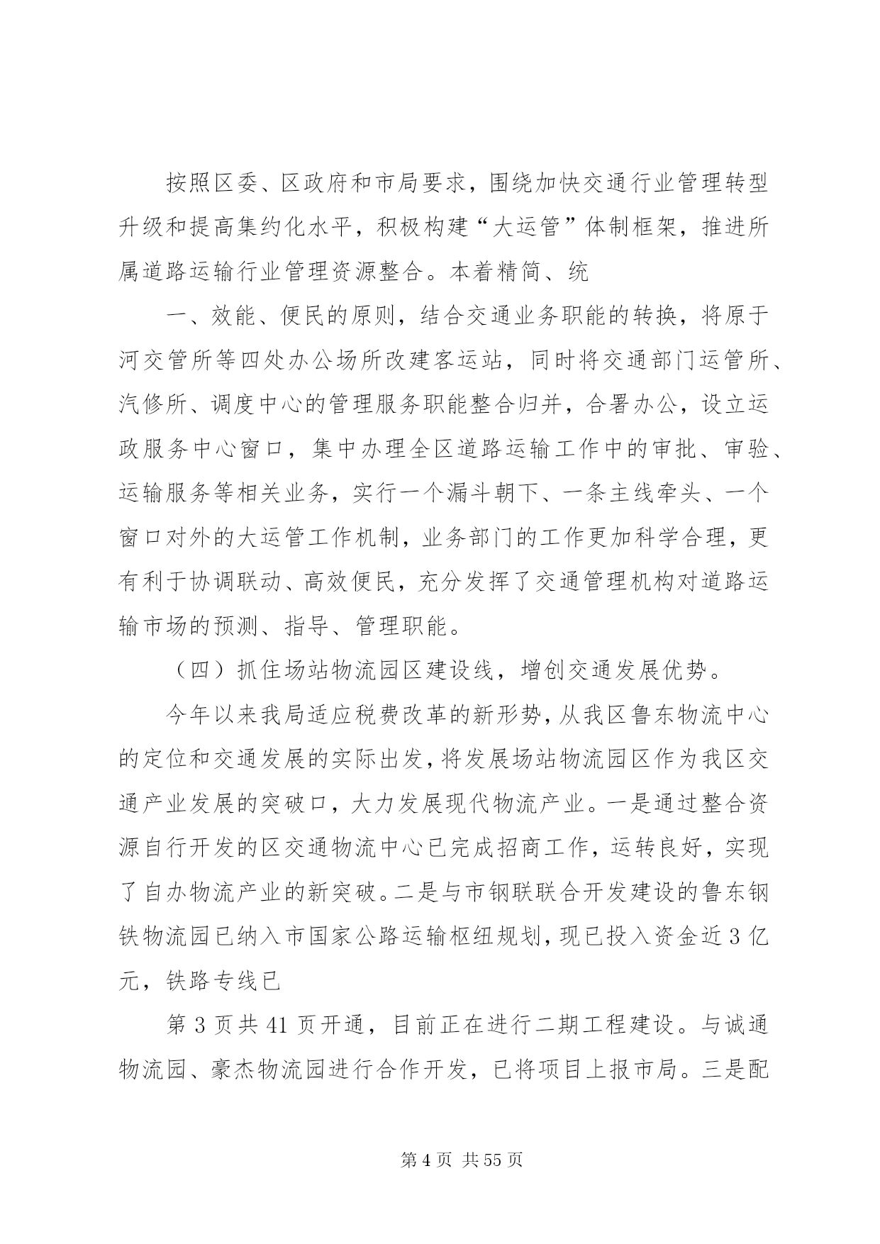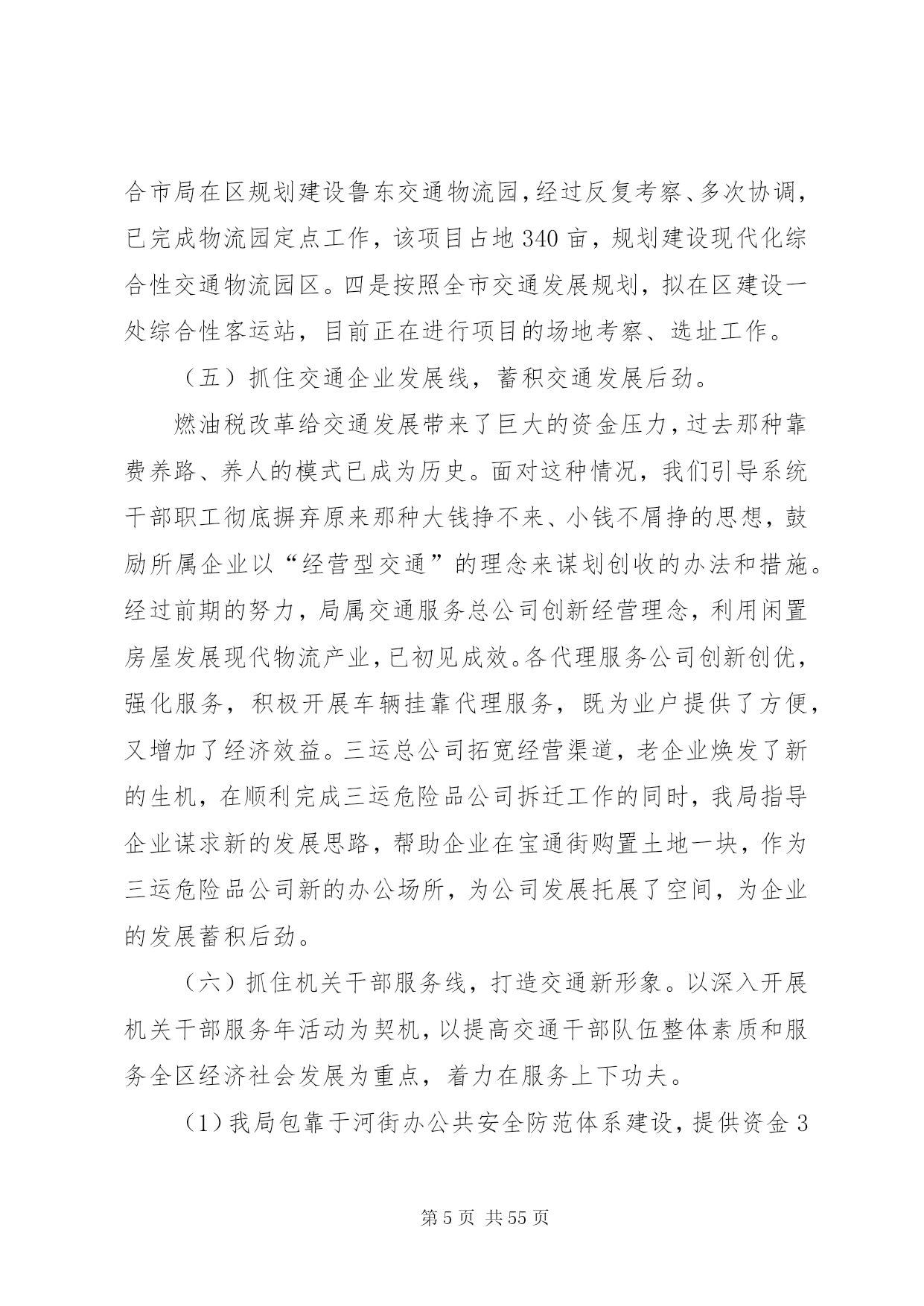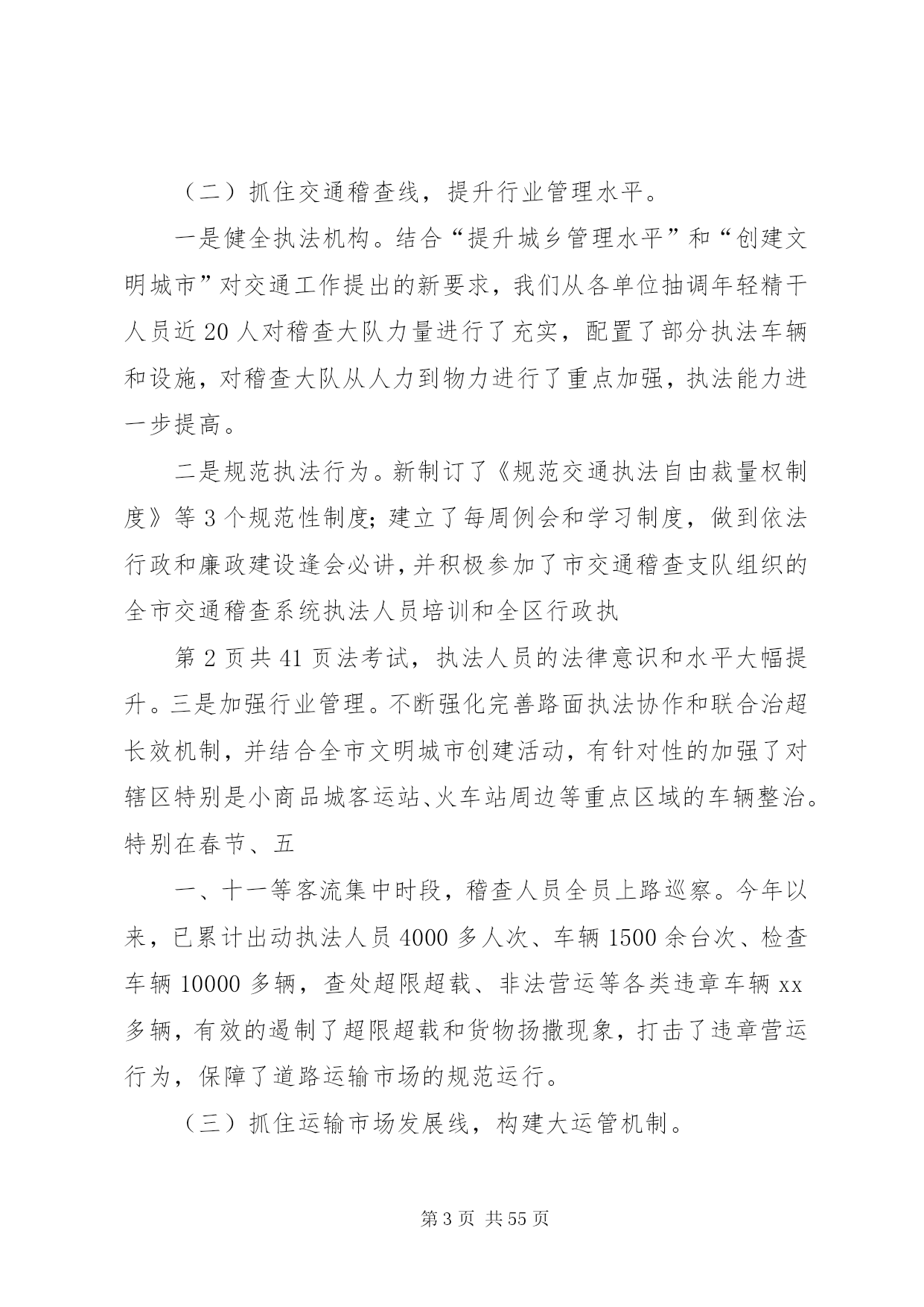 第PAGE\*Arabic\*MERGEFORMAT55页共NUMPAGES\*MERGEFORMAT55页县交通局工作总结交通局工作总结目录第一篇:区委交通局年终工作总结第二篇:市交通局年终工作总结第三篇:XX县区交通局xx年工作总结第四篇:交通局xx年度工作总结第五篇:交通局xx工作总结正文第一篇:区委交通局年终工作总结点击关注:今年以来,在区委、区政府的正确领导下,区交通运输局紧紧围绕区委“一三四一”任务目标,以科学发展观为指导,以“转方式、调结构”为主题,以“机关干部服务年”为保障,以“创先争优,强堡垒做先锋”为动力,突出“大交通、大物流、大管理、大服务、大提升”工作思路,调整结构、整合资源,创新思路、谋求发展,全区交通事业呈现出全面铺开、奋进跨越的良好态势。一、年工作情况年是交通税费改革的第二年,也是交通在新形势下谋划发展思路、抢占发展先机的关键年,面对交通发展的新形势和巨大压力,我们积极开展“转方式、调结构、谋发展”大讨论活动,并以“六条线”为统领扎实抓好交通各项工作。(一)抓住公路建、管、养线,保障公路安全畅通。一是加大农村公路建设投入。我局始终将解决群众关心的热点难点问题作为全局中心工作来抓,经过多方面的努力和协调,对于群众反映强烈的五大路、潍昌路等老大难问题已逐步得到解决。总投资近700万元的五大路改造工程现已竣工通车;对总投资xx多万元的潍昌路,我们化整为零、分段实施,今年投资400多万元对该路长松路至西二环路段2.8公里实施了改造;投资30多万元对姚官庄至白浪河水库坝路段500米进行了整修,现已完工;按照市政府对潍高路进行综合整治提升改造的要求,将沿路两侧需整修道路进行了调查摸底,并已上报市局,即将实施改造。年共新建改建农村公路11条、20.5公里。二是加强公路路政管理。依据《公路法》,成立路政稽查大队,对路政管理工作进行了重点加强。今年以来共发现和制止破坏路产路权的违法行为80多起,办理路政许可案件12件,收缴公路赔补偿费近3万元,有效地保护了路产路权。三是提高农村公路养护水平。依据新颁布的《省农村公路条例》,及时创新农村公路养护管理体制和运行机制改革,对机构进行了理顺,对人员进行了调整,公路养护一并由县乡公路管理处负责,积极倡导养护新理念,加大养护资金投入,加强公路养护管理。截至目前,共投资养护资金50多万元,对春鸢路、水库路等路段进行了挖补维修,全区在养农村公路126公里,综合好路率达80%以上,农村公路的通达能力不断提高。(二)抓住交通稽查线,提升行业管理水平。一是健全执法机构。结合“提升城乡管理水平”和“创建文明城市”对交通工作提出的新要求,我们从各单位抽调年轻精干人员近20人对稽查大队力量进行了充实,配置了部分执法车辆和设施,对稽查大队从人力到物力进行了重点加强,执法能力进一步提高。二是规范执法行为。新制订了《规范交通执法自由裁量权制度》等3个规范性制度;建立了每周例会和学习制度,做到依法行政和廉政建设逢会必讲,并积极参加了市交通稽查支队组织的全市交通稽查系统执法人员培训和全区行政执法考试,执法人员的法律意识和水平大幅提升。三是加强行业管理。不断强化完善路面执法协作和联合治超长效机制,并结合全市文明城市创建活动,有针对性的加强了对辖区特别是小商品城客运站、火车站周边等重点区域的车辆整治。特别在春节、五一、十一等客流集中时段,稽查人员全员上路巡察。今年以来,已累计出动执法人员4000多人次、车辆1500余台次、检查车辆10000多辆,查处超限超载、非法营运等各类违章车辆xx多辆,有效的遏制了超限超载和货物扬撒现象,打击了违章营运行为,保障了道路运输市场的规范运行。(三)抓住运输市场发展线,构建大运管机制。按照区委、区政府和市局要求,围绕加快交通行业管理转型升级和提高集约化水平,积极构建“大运管”体制框架,推进所属道路运输行业管理资源整合。本着精简、统一、效能、便民的原则,结合交通业务职能的转换,将原于河交管所等四处办公场所改建客运站,同时将交通部门运管所、汽修所、调度中心的管理服务职能整合归并,合署办公,设立运政服务中心窗口,集中办理全区道路运输工作中的审批、审验、运输服务等相关业务,实行一个漏斗朝下、一条主线牵头、一个窗口对外的大运管工作机制,业务部门的工作更加科学合理,更有利于协调联动、高效便民,充分发挥了交通管理机构对道路运输市场的预测、指导、管理职能。(四)抓住场站物流园区建设线,增创交通发展优势。今年以来我局适应税费改革的新形势,从我区鲁东物流中心的定位和交通发展的实际出发,将发展场站物流园区作为我区交通产业发展的突破口,大力发展现代物流产业。一是通过整合资源自行开发的区交通物流中心已完成招商工作,运转良好,实现了自办物流产业的新突破。二是与市钢联联合开发建设