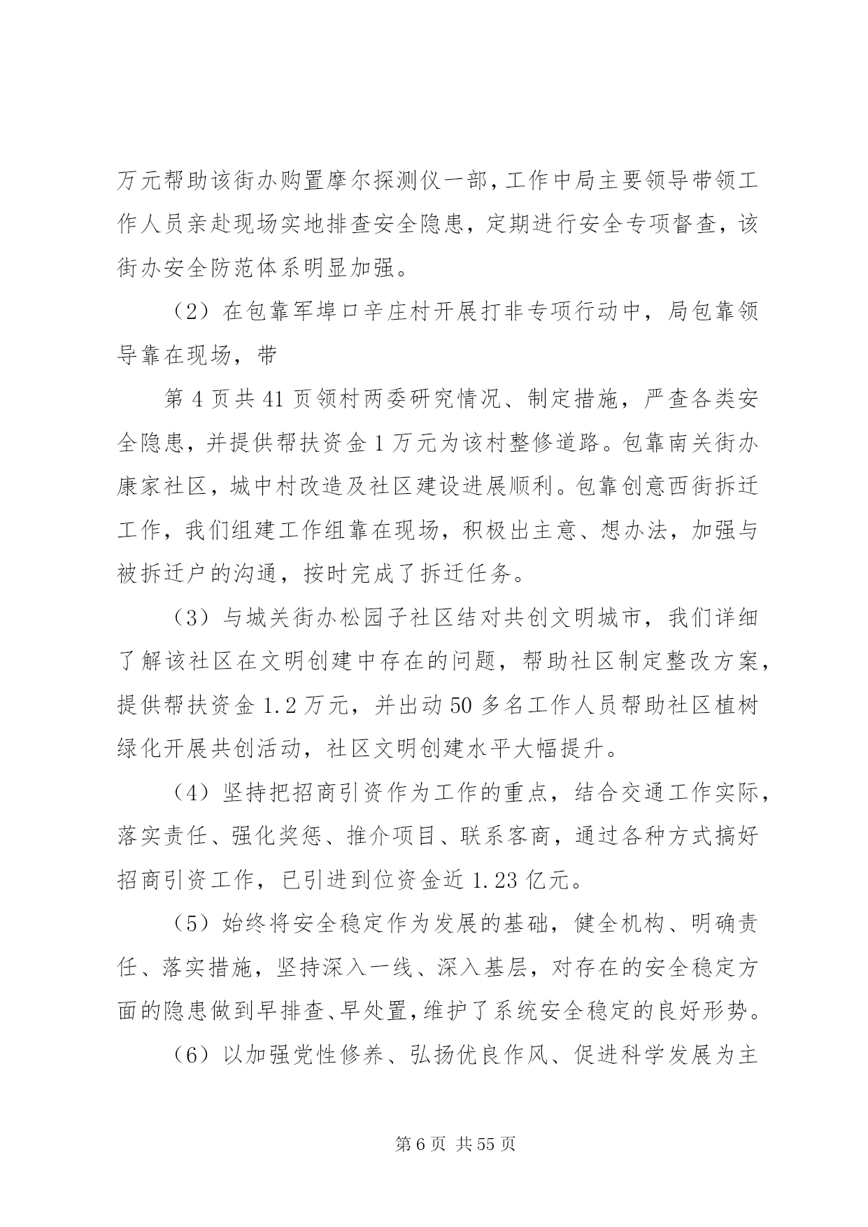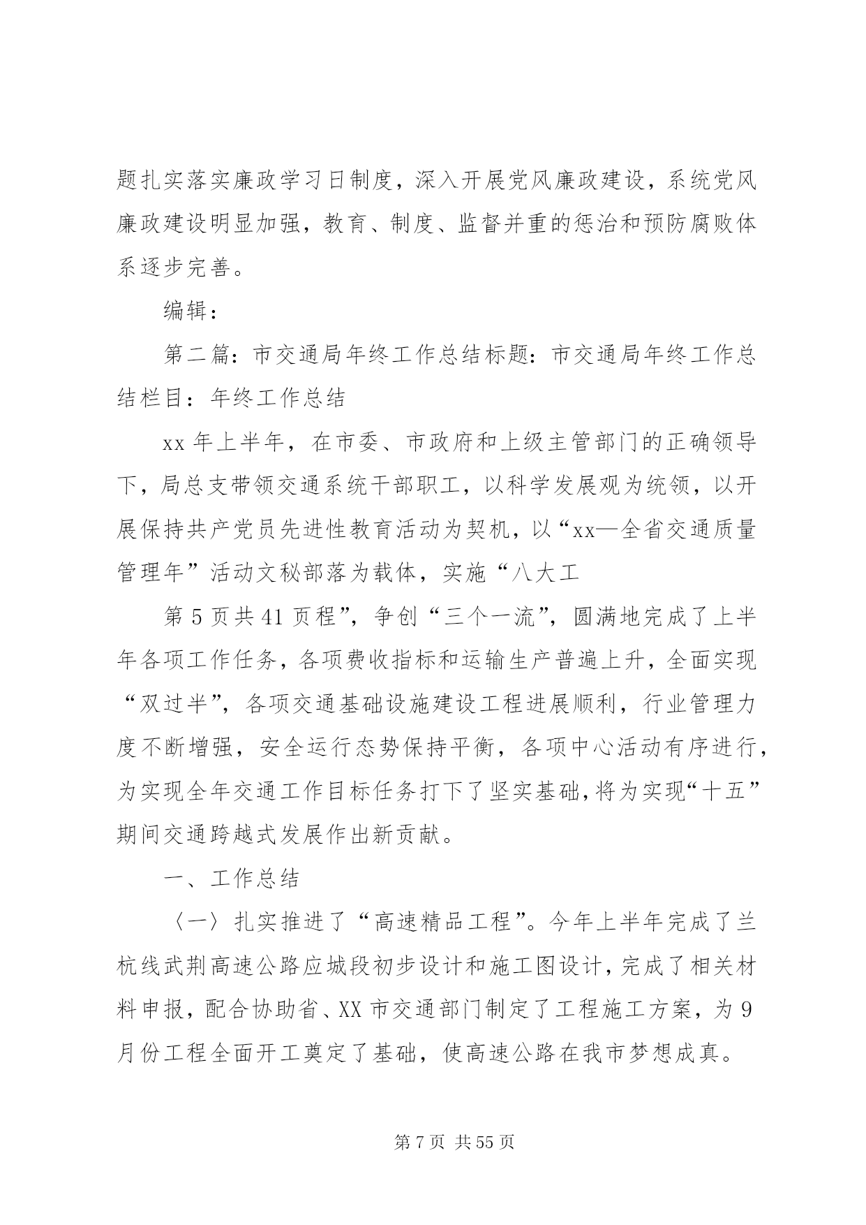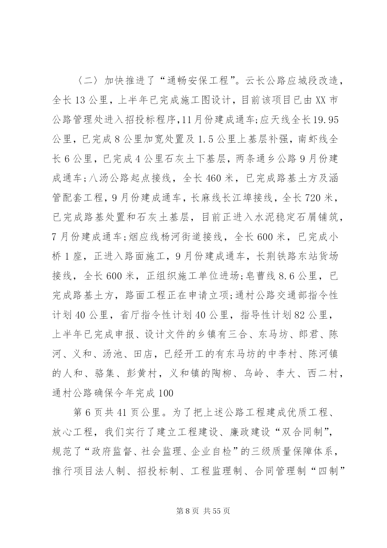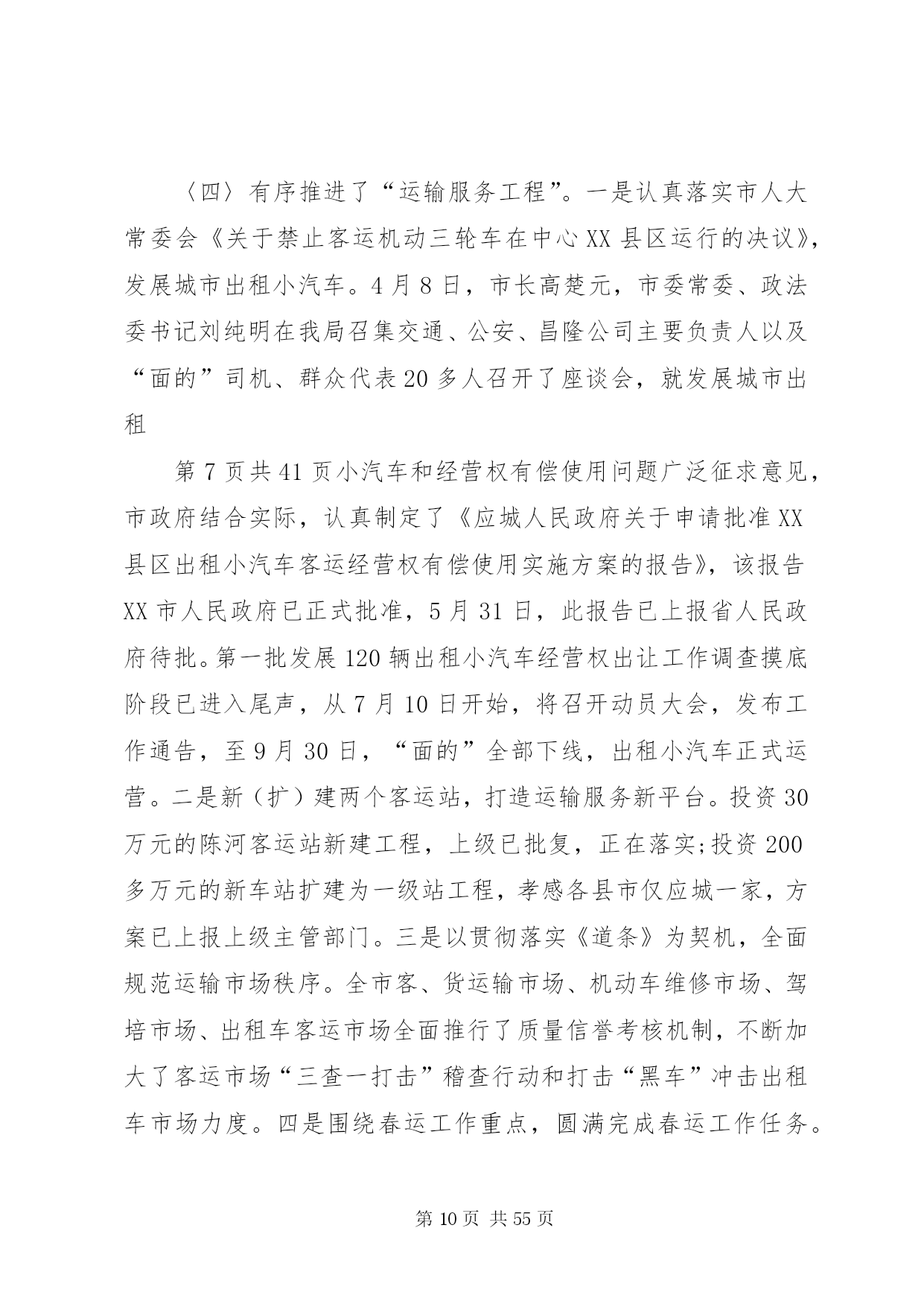 第PAGE\*Arabic\*MERGEFORMAT55页共NUMPAGES\*MERGEFORMAT55页县交通局工作总结交通局工作总结目录第一篇:区委交通局年终工作总结第二篇:市交通局年终工作总结第三篇:XX县区交通局xx年工作总结第四篇:交通局xx年度工作总结第五篇:交通局xx工作总结正文第一篇:区委交通局年终工作总结点击关注:今年以来,在区委、区政府的正确领导下,区交通运输局紧紧围绕区委“一三四一”任务目标,以科学发展观为指导,以“转方式、调结构”为主题,以“机关干部服务年”为保障,以“创先争优,强堡垒做先锋”为动力,突出“大交通、大物流、大管理、大服务、大提升”工作思路,调整结构、整合资源,创新思路、谋求发展,全区交通事业呈现出全面铺开、奋进跨越的良好态势。一、年工作情况年是交通税费改革的第二年,也是交通在新形势下谋划发展思路、抢占发展先机的关键年,面对交通发展的新形势和巨大压力,我们积极开展“转方式、调结构、谋发展”大讨论活动,并以“六条线”为统领扎实抓好交通各项工作。(一)抓住公路建、管、养线,保障公路安全畅通。一是加大农村公路建设投入。我局始终将解决群众关心的热点难点问题作为全局中心工作来抓,经过多方面的努力和协调,对于群众反映强烈的五大路、潍昌路等老大难问题已逐步得到解决。总投资近700万元的五大路改造工程现已竣工通车;对总投资xx多万元的潍昌路,我们化整为零、分段实施,今年投资400多万元对该路长松路至西二环路段2.8公里实施了改造;投资30多万元对姚官庄至白浪河水库坝路段500米进行了整修,现已完工;按照市政府对潍高路进行综合整治提升改造的要求,将沿路两侧需整修道路进行了调查摸底,并已上报市局,即将实施改造。年共新建改建农村公路11条、20.5公里。二是加强公路路政管理。依据《公路法》,成立路政稽查大队,对路政管理工作进行了重点加强。今年以来共发现和制止破坏路产路权的违法行为80多起,办理路政许可案件12件,收缴公路赔补偿费近3万元,有效地保护了路产路权。三是提高农村公路养护水平。依据新颁布的《省农村公路条例》,及时创新农村公路养护管理体制和运行机制改革,对机构进行了理顺,对人员进行了调整,公路养护一并由县乡公路管理处负责,积极倡导养护新理念,加大养护资金投入,加强公路养护管理。截至目前,共投资养护资金50多万元,对春鸢路、水库路等路段进行了挖补维修,全区在养农村公路126公里,综合好路率达80%以上,农村公路的通达能力不断提高。(二)抓住交通稽查线,提升行业管理水平。一是健全执法机构。结合“提升城乡管理水平”和“创建文明城市”对交通工作提出的新要求,我们从各单位抽调年轻精干人员近20人对稽查大队力量进行了充实,配置了部分执法车辆和设施,对稽查大队从人力到物力进行了重点加强,执法能力进一步提高。二是规范执法行为。新制订了《规范交通执法自由裁量权制度》等3个规范性制度;建立了每周例会和学习制度,做到依法行政和廉政建设逢会必讲,并积极参加了市交通稽查支队组织的全市交通稽查系统执法人员培训和全区行政执法考试,执法人员的法律意识和水平大幅提升。三是加强行业管理。不断强化完善路面执法协作和联合治超长效机制,并结合全市文明城市创建活动,有针对性的加强了对辖区特别是小商品城客运站、火车站周边等重点区域的车辆整治。特别在春节、五一、十一等客流集中时段,稽查人员全员上路巡察。今年以来,已累计出动执法人员4000多人次、车辆1500余台次、检查车辆10000多辆,查处超限超载、非法营运等各类违章车辆xx多辆,有效的遏制了超限超载和货物扬撒现象,打击了违章营运行为,保障了道路运输市场的规范运行。(三)抓住运输市场发展线,构建大运管机制。按照区委、区政府和市局要求,围绕加快交通行业管理转型升级和提高集约化水平,积极构建“大运管”体制框架,推进所属道路运输行业管理资源整合。本着精简、统一、效能、便民的原则,结合交通业务职能的转换,将原于河交管所等四处办公场所改建客运站,同时将交通部门运管所、汽修所、调度中心的管理服务职能整合归并,合署办公,设立运政服务中心窗口,集中办理全区道路运输工作中的审批、审验、运输服务等相关业务,实行一个漏斗朝下、一条主线牵头、一个窗口对外的大运管工作机制,业务部门的工作更加科学合理,更有利于协调联动、高效便民,充分发挥了交通管理机构对道路运输市场的预测、指导、管理职能。(四)抓住场站物流园区建设线,增创交通发展优势。今年以来我局适应税费改革的新形势,从我区鲁东物流中心的定位和交通发展的实际出发,将发展场站物流园区作为我区交通产业发展的突破口,大力发展现代物流产业。一是通过整合资源自行开发的区交通物流中心已完成招商工作,运转良好,实现了自办物流产业的新突破。二是与市钢联联合开发建设