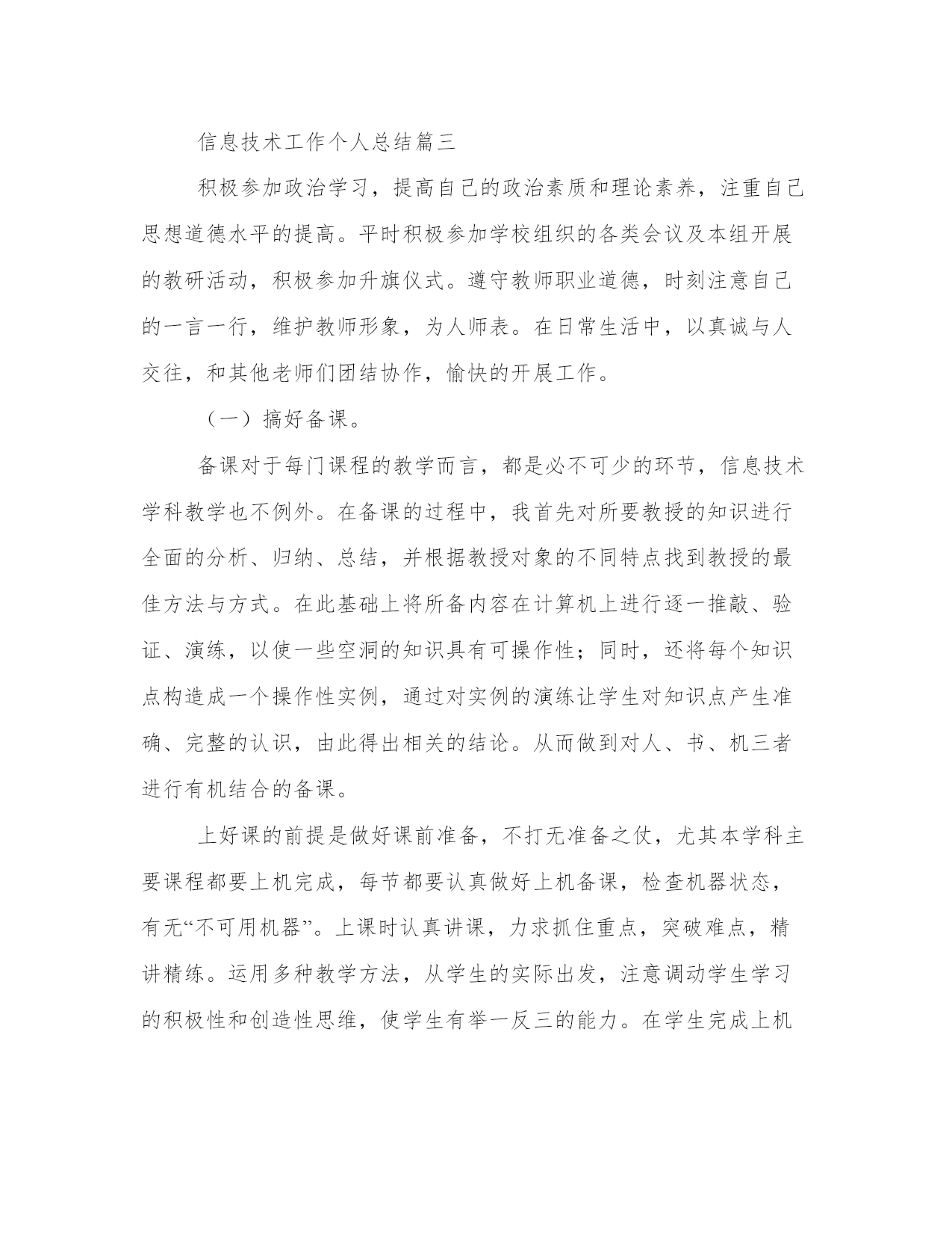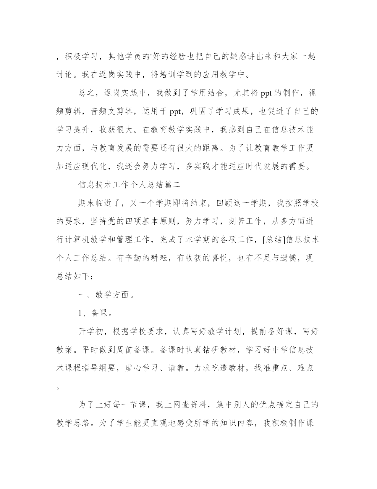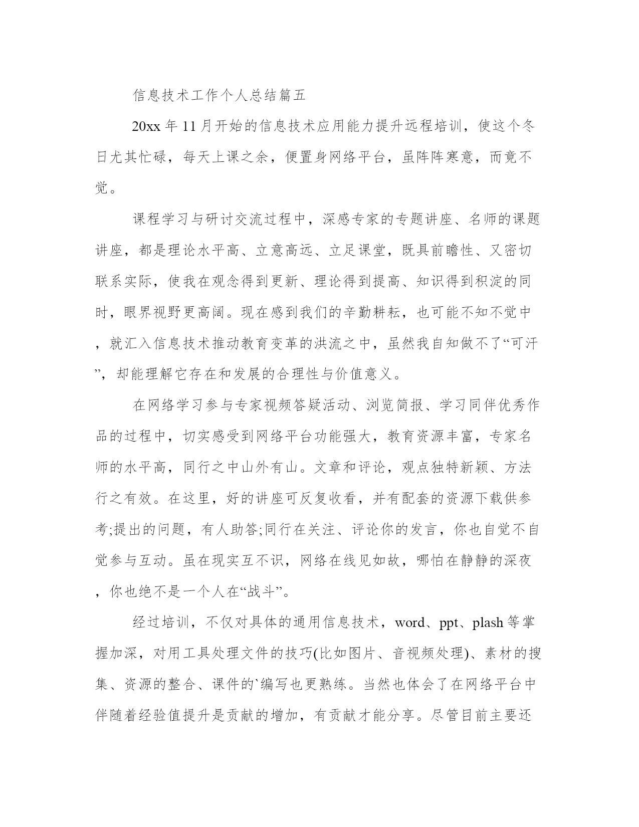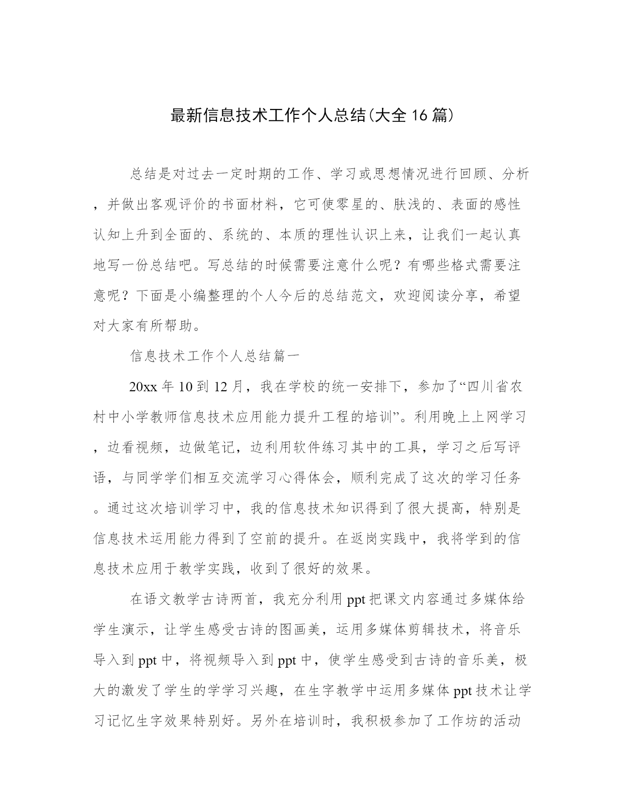 最新信息技术工作个人总结(大全16篇)总结是对过去一定时期的工作、学习或思想情况进行回顾、分析,并做出客观评价的书面材料,它可使零星的、肤浅的、表面的感性认知上升到全面的、系统的、本质的理性认识上来,让我们一起认真地写一份总结吧。写总结的时候需要注意什么呢?有哪些格式需要注意呢?下面是小编整理的个人今后的总结范文,欢迎阅读分享,希望对大家有所帮助。信息技术工作个人总结篇一20xx年10到12月,我在学校的统一安排下,参加了“四川省农村中小学教师信息技术应用能力提升工程的培训”。利用晚上上网学习,边看视频,边做笔记,边利用软件练习其中的工具,学习之后写评语,与同学学们相互交流学习心得体会,顺利完成了这次的学习任务。通过这次培训学习中,我的信息技术知识得到了很大提高,特别是信息技术运用能力得到了空前的提升。在返岗实践中,我将学到的信息技术应用于教学实践,收到了很好的效果。在语文教学古诗两首,我充分利用ppt把课文内容通过多媒体给学生演示,让学生感受古诗的图画美,运用多媒体剪辑技术,将音乐导入到ppt中,将视频导入到ppt中,使学生感受到古诗的音乐美,极大的激发了学生的学学习兴趣,在生字教学中运用多媒体ppt技术让学习记忆生字效果特别好。另外在培训时,我积极参加了工作坊的活动,积极学习,其他学员的'好的经验也把自己的疑惑讲出来和大家一起讨论。我在返岗实践中,将培训学到的应用教学中。总之,返岗实践中,我做到了学用结合,尤其将ppt的制作,视频剪辑,音频文剪辑,运用于ppt,巩固了学习成果,也促进了自己的学习提升,收获很大。在教育教学实践中,我感到自己在信息技术能力方面,与教育发展的需要还有很大的距离。为了让教育教学工作更加适应现代化,我还会努力学习,多实践才能适应时代发展的需要。信息技术工作个人总结篇二期末临近了,又一个学期即将结束,回顾这一学期,我按照学校的要求,坚持党的四项基本原则,努力学习,刻苦工作,从多方面进行计算机教学和管理工作,完成了本学期的各项工作,[总结]信息技术个人工作总结。有辛勤的耕耘,有收获的喜悦,也有不足与遗憾,现总结如下:一、教学方面。1、备课。开学初,根据学校要求,认真写好教学计划,提前备好课,写好教案。平时做到周前备课。备课时认真钻研教材,学习好中学信息技术课程指导纲要,虚心学习、请教。力求吃透教材,找准重点、难点。为了上好每一节课,我上网查资料,集中别人的优点确定自己的教学思路。为了学生能更直观地感受所学的知识内容,我积极制作课件,准备各种直观教学软件,搜集制作各知识点优秀案例展示给学生。2、上课。上好课的前提是做好课前准备,不打无准备之仗,每节都要认真做好备课。上课时认真讲课,力求抓住重点,突破难点,精讲精练。本学科主要课程都要在多媒体网络教室完成,无法控制学生上机、上网操作,针对这种情形,我把我收藏的多媒体教室软件拿出来,给学校的计算机全部安装上,从而达到可以控制学生上机和上网的操作,为上好每一节课打好基础。上课时,从学生的实际出发,运用了引导教学的方法,让学生进行演练,注意调动学生学习的积极性和创造性思维,使学生有举一反三的能力。在学生完成上机任务时,注意对学困生进行手把手的辅导,课后及时做课后记,找出不足。3、反思。对每一节课进行及时的反思,达到课前反思、课中反思、课后反思,为达到教学的最优化而努力,对学生的个性特点及时了解,着重进行弥补。二、个人学习:积极参加学校的各项活动,树立现代教育观念,适应新世纪发展的需要,以确立自己的整体素质培养观、自主教育观、个性发展观、创新教学观、终身学习观。积极学习各种理论,以充实自己,以便在工作中以坚实的理论作为指导,更好地进行教育教学。我还利用业余时间认真学习网络知识,学习制作网站,为学校的教育教学服务。同时,帮助其它老师制作多媒体课件。三、努力方向:1、加强自身基本功的训练,课堂上做到精讲精练,注重对学生能力的培养,知识上做到课课清、段段清。2、对差生多些关心,多点爱心,再多一些耐心,使他们在对计算机的认识上有更大进步。3、加强机房纪律和机器使用道德方面的教育,使学生不仅在班级集中注意力学习,在机房上机时也要按规定严格约束自己。4、利用各种方法,训练学生集中注意力。5、多媒体课件制作上下功夫,努力使学校的多媒体课件的水平在原有的基础上有更大的进步。四、其他:这学期本人做好本职工作的同时,还为学校迎接检查做了大量地材料录入工作,为学校的各项工作贡献了自己的力量。一学期的工作,总的来看取得了较好的成绩,不仅完成了本职工作,而且自学掌握一些新知识,为下一阶段工作奠定了基础。为适应网络时代,及高速发展的信息时代,还需努力学习,不断丰富自己,改变自己,设计自己。教育工作,是一项常做常新、永无止境的工作。社会在发展