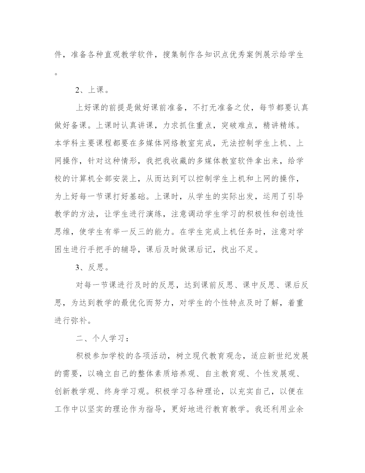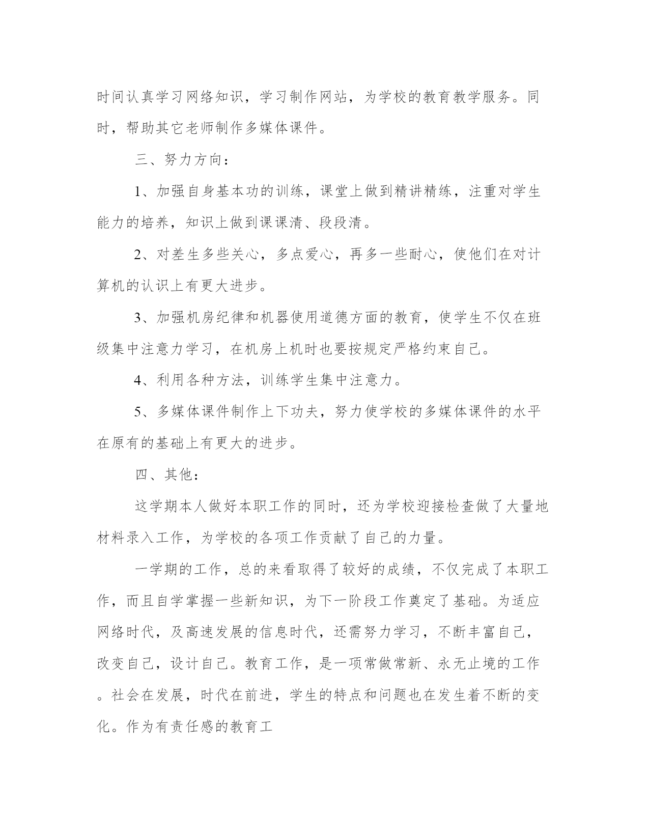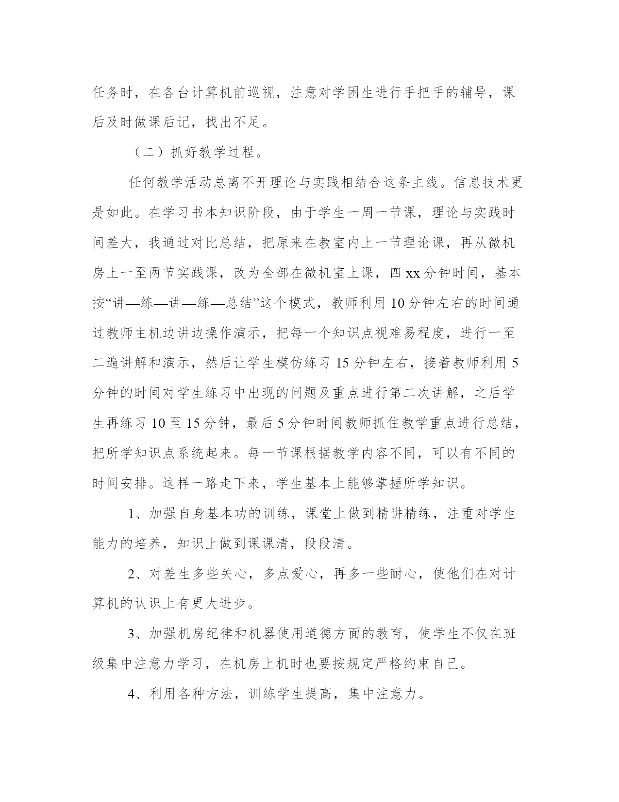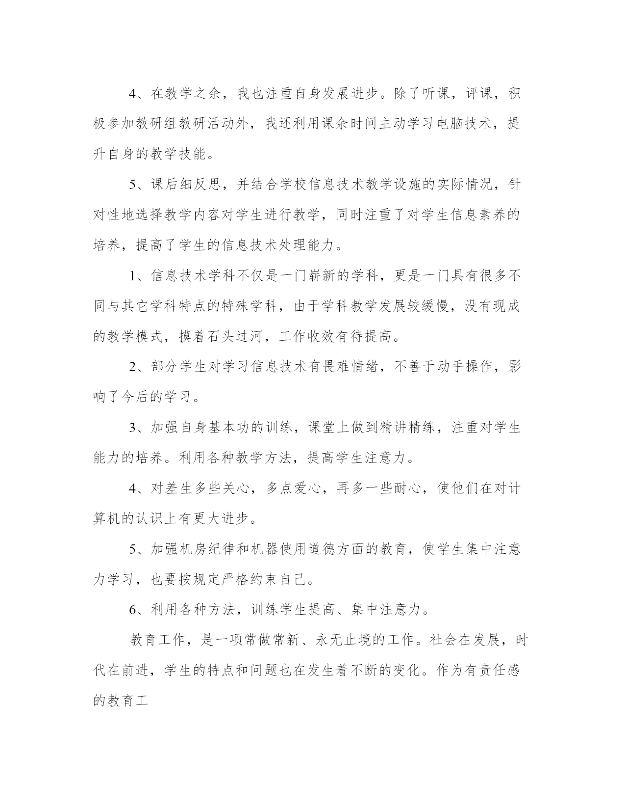 最新信息技术工作个人总结(大全16篇)总结是对过去一定时期的工作、学习或思想情况进行回顾、分析,并做出客观评价的书面材料,它可使零星的、肤浅的、表面的感性认知上升到全面的、系统的、本质的理性认识上来,让我们一起认真地写一份总结吧。写总结的时候需要注意什么呢?有哪些格式需要注意呢?下面是小编整理的个人今后的总结范文,欢迎阅读分享,希望对大家有所帮助。信息技术工作个人总结篇一20xx年10到12月,我在学校的统一安排下,参加了“四川省农村中小学教师信息技术应用能力提升工程的培训”。利用晚上上网学习,边看视频,边做笔记,边利用软件练习其中的工具,学习之后写评语,与同学学们相互交流学习心得体会,顺利完成了这次的学习任务。通过这次培训学习中,我的信息技术知识得到了很大提高,特别是信息技术运用能力得到了空前的提升。在返岗实践中,我将学到的信息技术应用于教学实践,收到了很好的效果。在语文教学古诗两首,我充分利用ppt把课文内容通过多媒体给学生演示,让学生感受古诗的图画美,运用多媒体剪辑技术,将音乐导入到ppt中,将视频导入到ppt中,使学生感受到古诗的音乐美,极大的激发了学生的学学习兴趣,在生字教学中运用多媒体ppt技术让学习记忆生字效果特别好。另外在培训时,我积极参加了工作坊的活动,积极学习,其他学员的'好的经验也把自己的疑惑讲出来和大家一起讨论。我在返岗实践中,将培训学到的应用教学中。总之,返岗实践中,我做到了学用结合,尤其将ppt的制作,视频剪辑,音频文剪辑,运用于ppt,巩固了学习成果,也促进了自己的学习提升,收获很大。在教育教学实践中,我感到自己在信息技术能力方面,与教育发展的需要还有很大的距离。为了让教育教学工作更加适应现代化,我还会努力学习,多实践才能适应时代发展的需要。信息技术工作个人总结篇二期末临近了,又一个学期即将结束,回顾这一学期,我按照学校的要求,坚持党的四项基本原则,努力学习,刻苦工作,从多方面进行计算机教学和管理工作,完成了本学期的各项工作,[总结]信息技术个人工作总结。有辛勤的耕耘,有收获的喜悦,也有不足与遗憾,现总结如下:一、教学方面。1、备课。开学初,根据学校要求,认真写好教学计划,提前备好课,写好教案。平时做到周前备课。备课时认真钻研教材,学习好中学信息技术课程指导纲要,虚心学习、请教。力求吃透教材,找准重点、难点。为了上好每一节课,我上网查资料,集中别人的优点确定自己的教学思路。为了学生能更直观地感受所学的知识内容,我积极制作课件,准备各种直观教学软件,搜集制作各知识点优秀案例展示给学生。2、上课。上好课的前提是做好课前准备,不打无准备之仗,每节都要认真做好备课。上课时认真讲课,力求抓住重点,突破难点,精讲精练。本学科主要课程都要在多媒体网络教室完成,无法控制学生上机、上网操作,针对这种情形,我把我收藏的多媒体教室软件拿出来,给学校的计算机全部安装上,从而达到可以控制学生上机和上网的操作,为上好每一节课打好基础。上课时,从学生的实际出发,运用了引导教学的方法,让学生进行演练,注意调动学生学习的积极性和创造性思维,使学生有举一反三的能力。在学生完成上机任务时,注意对学困生进行手把手的辅导,课后及时做课后记,找出不足。3、反思。对每一节课进行及时的反思,达到课前反思、课中反思、课后反思,为达到教学的最优化而努力,对学生的个性特点及时了解,着重进行弥补。二、个人学习:积极参加学校的各项活动,树立现代教育观念,适应新世纪发展的需要,以确立自己的整体素质培养观、自主教育观、个性发展观、创新教学观、终身学习观。积极学习各种理论,以充实自己,以便在工作中以坚实的理论作为指导,更好地进行教育教学。我还利用业余时间认真学习网络知识,学习制作网站,为学校的教育教学服务。同时,帮助其它老师制作多媒体课件。三、努力方向:1、加强自身基本功的训练,课堂上做到精讲精练,注重对学生能力的培养,知识上做到课课清、段段清。2、对差生多些关心,多点爱心,再多一些耐心,使他们在对计算机的认识上有更大进步。3、加强机房纪律和机器使用道德方面的教育,使学生不仅在班级集中注意力学习,在机房上机时也要按规定严格约束自己。4、利用各种方法,训练学生集中注意力。5、多媒体课件制作上下功夫,努力使学校的多媒体课件的水平在原有的基础上有更大的进步。四、其他:这学期本人做好本职工作的同时,还为学校迎接检查做了大量地材料录入工作,为学校的各项工作贡献了自己的力量。一学期的工作,总的来看取得了较好的成绩,不仅完成了本职工作,而且自学掌握一些新知识,为下一阶段工作奠定了基础。为适应网络时代,及高速发展的信息时代,还需努力学习,不断丰富自己,改变自己,设计自己。教育工作,是一项常做常新、永无止境的工作。社会在发展