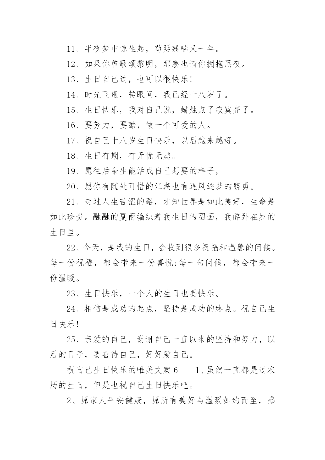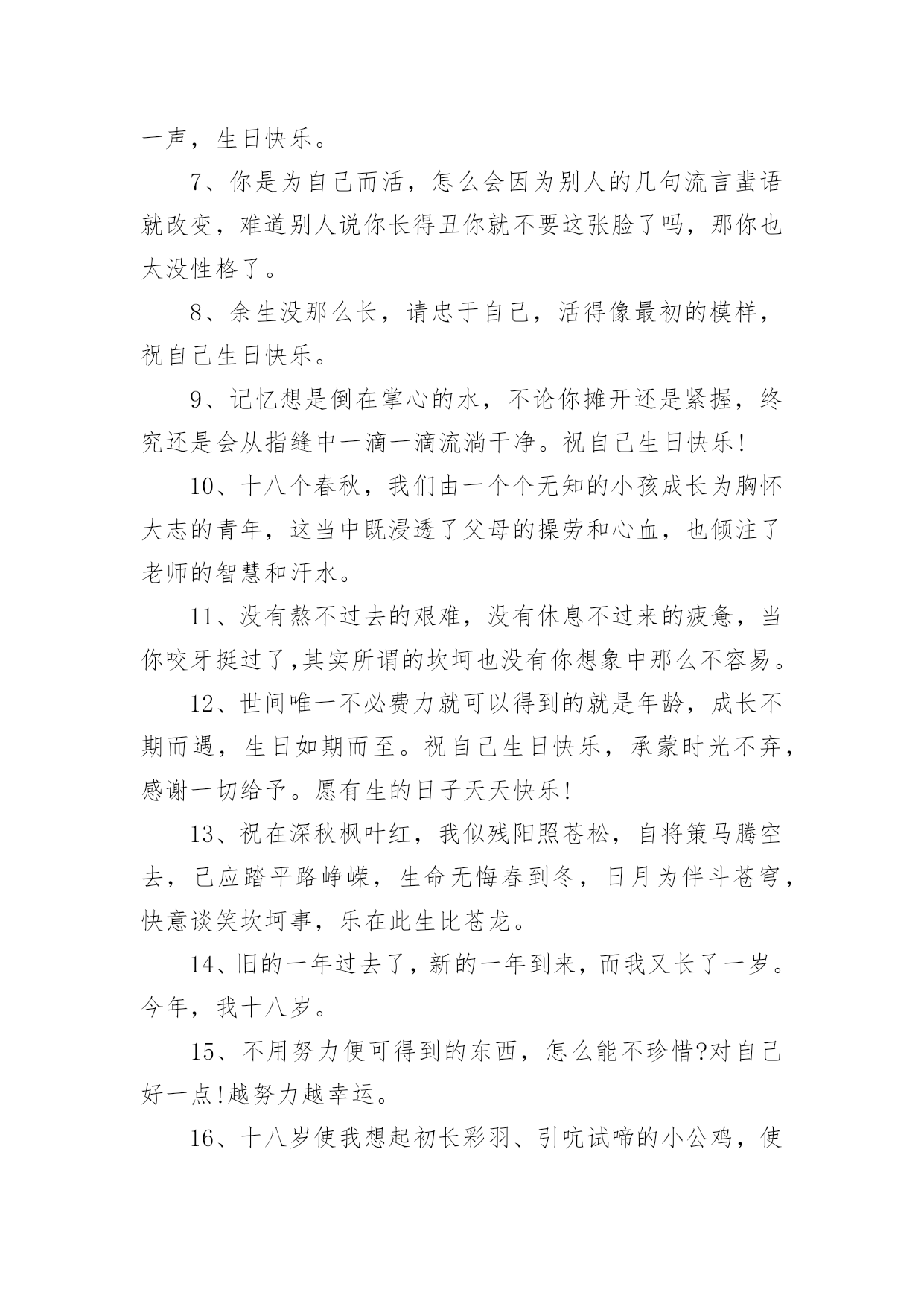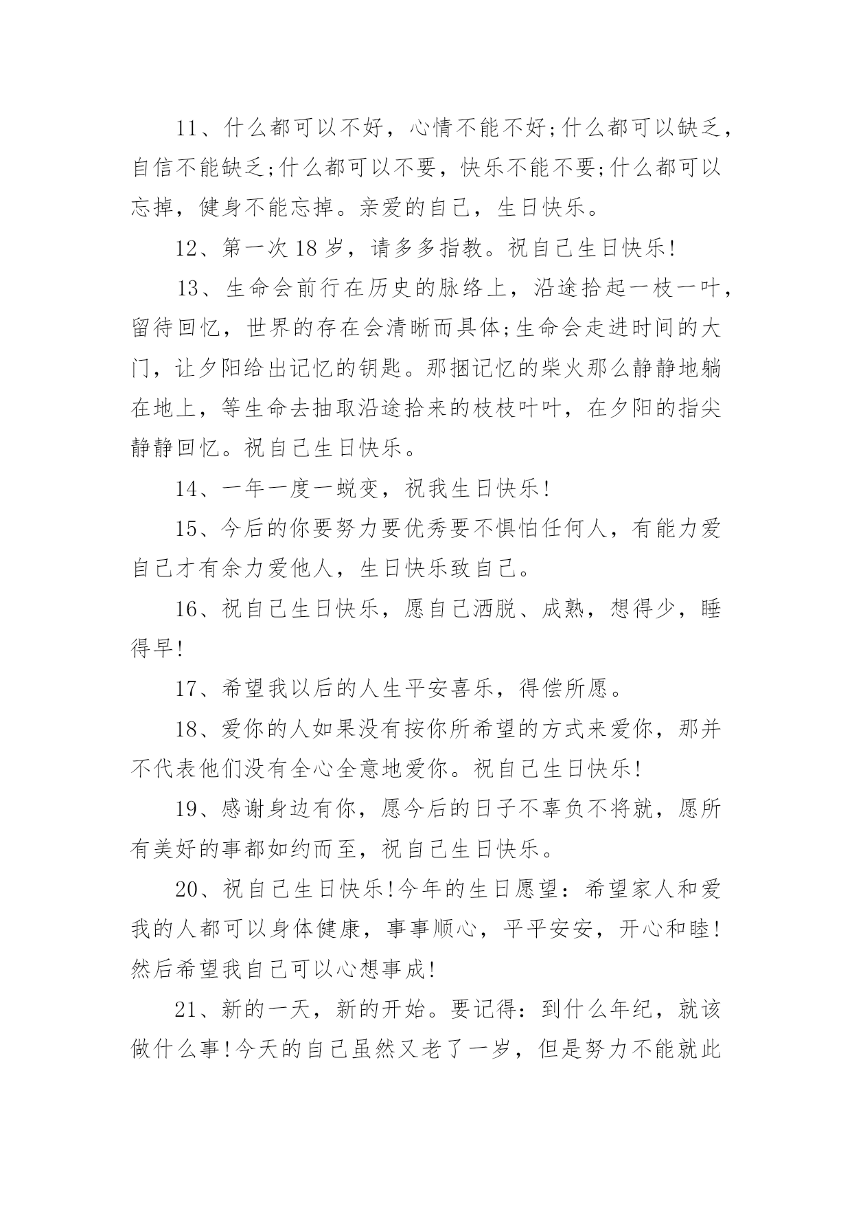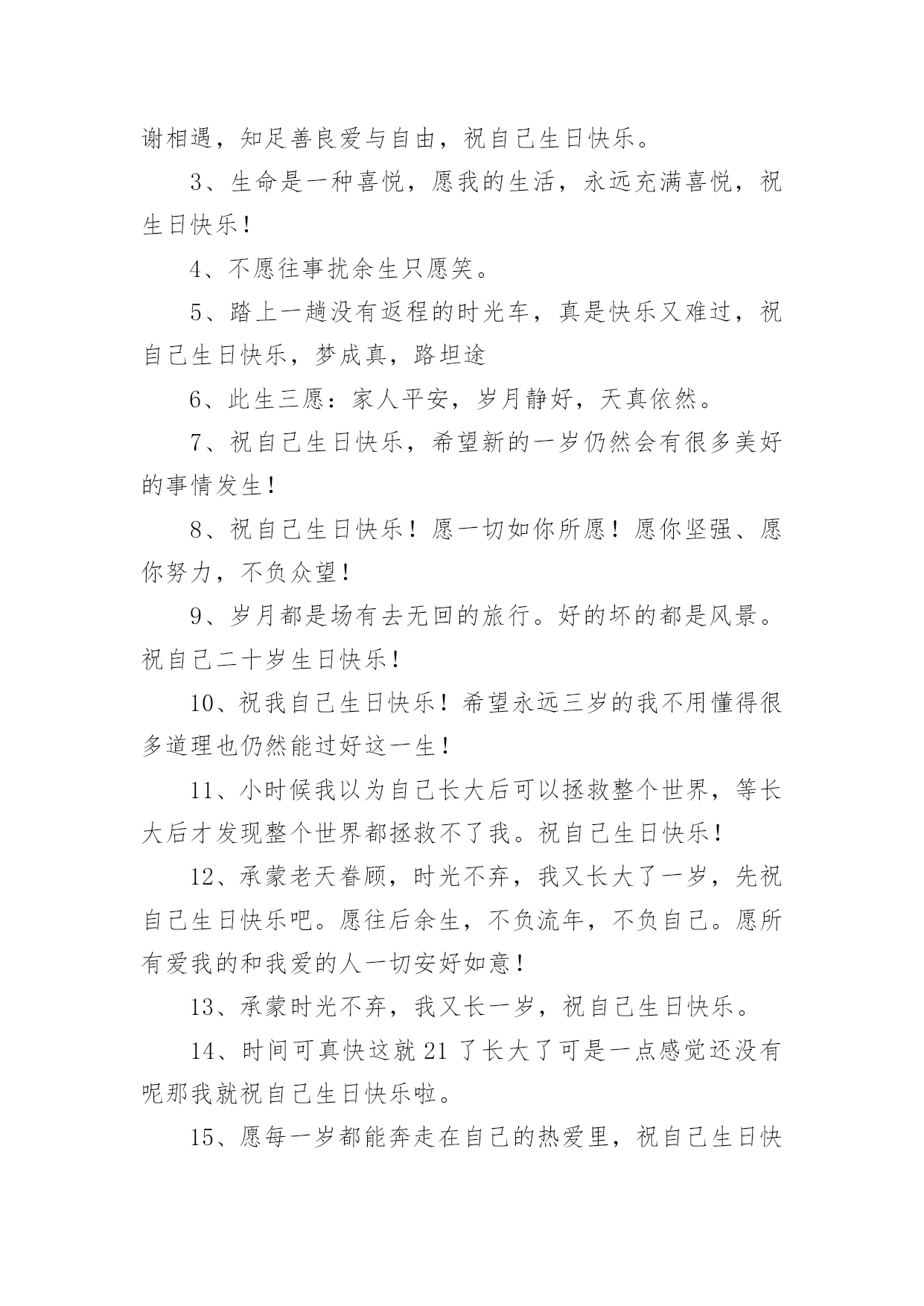 祝自己生日快乐的唯美文案祝自己生日快乐的唯美文案(精选130句)我们都知道,生日是每个人出生的重要节日,那么在生日这个重要的日子里,我们怎样才能表达我们对生日最美好的祝愿呢?以下是小编收集整理的祝自己生日快乐的唯美文案,供大家参考借鉴,希望可以帮助到有需要的朋友。祝自己生日快乐的唯美文案11、旦逢良辰,顺颂时宜。2、朝暮与年岁共往。3、愿以诚挚之心,领岁月之教诲。4、十七舒展眉,与光同成灰。5、解锁成就:18岁!6、我家有喜事今天我生日。7、尚未成熟,但已在途中。8、叮~按时长大。9、往后余生,不负流年,不负自己。10、拥有愉快生活,储存十吨热爱。11、故事不长,也不难讲,四字概括,生日快乐。12、简简单单发个日期,懂的人自然懂。13、第一次18岁请多多指教!14、按时长大,永远年轻,永远热泪盈眶!15、不过是又长大一岁的美女罢了。16、醒来惊觉不是梦,眉间皱纹又一重。17、吃个鸡蛋得了,也不买啥了。18、愿每一岁都能奔走在自己的热爱里。19、第二十年的人间游历。20、一年一度吹蜡烛时间到!祝自己生日快乐的唯美文案21、祝自己生日快乐!健康平安。在新的年岁里,努力让自己变得更优秀,做自己。不随波逐流,不忘初心,方得始终。也希望缘分早点到来。2、凡是过往,皆为序章。生日快乐,我对自己说。3、刚下班,快下班的时候才想起来今天是自己生日。哎,老了,记不住事了。4、听从命运安排的是凡人;主宰自己命运的才是强者;没有主见的是盲从,三思而行的是智者。祝自己生日快乐。5、又长一岁,应该又成熟了许多,不能在浪费光阴了温柔不帅,祝自己永远开心快乐,找到幸福。祝我生日快乐!6、祝自己生日快乐,希望自己能更加成熟自信,沉着冷静的面向明天,以后的日子更加坚强无畏、勇往直前!7、层层绿意中,祝福一重重。祝我生日快乐,又涨一岁了!8、亲爱的自己,生日快乐!全世界只有一个你,就算没有人懂得欣赏你,你也要好好地爱自己。9、加了一岁,就是加了一份魅力,加了一份成熟,加了一份智慧。10、别人生日吃的长寿面,我生日吃的挂面。11、什么都可以不好,心情不能不好;什么都可以缺乏,自信不能缺乏;什么都可以不要,快乐不能不要;什么都可以忘掉,健身不能忘掉。亲爱的自己,生日快乐。12、第一次18岁,请多多指教。祝自己生日快乐!13、生命会前行在历史的脉络上,沿途拾起一枝一叶,留待回忆,世界的存在会清晰而具体;生命会走进时间的大门,让夕阳给出记忆的钥匙。那捆记忆的柴火那么静静地躺在地上,等生命去抽取沿途拾来的枝枝叶叶,在夕阳的指尖静静回忆。祝自己生日快乐。14、一年一度一蜕变,祝我生日快乐!15、今后的你要努力要优秀要不惧怕任何人,有能力爱自己才有余力爱他人,生日快乐致自己。16、祝自己生日快乐,愿自己洒脱、成熟,想得少,睡得早!17、希望我以后的人生平安喜乐,得偿所愿。18、爱你的人如果没有按你所希望的方式来爱你,那并不代表他们没有全心全意地爱你。祝自己生日快乐!19、感谢身边有你,愿今后的日子不辜负不将就,愿所有美好的事都如约而至,祝自己生日快乐。20、祝自己生日快乐!今年的生日愿望:希望家人和爱我的人都可以身体健康,事事顺心,平平安安,开心和睦!然后希望我自己可以心想事成!21、新的一天,新的开始。要记得:到什么年纪,就该做什么事!今天的自己虽然又老了一岁,但是努力不能就此停留!加油吧!祝自己生日快乐!22、生日快乐,又老了一岁,感谢给我过生日的朋友们。23、生日快乐!愿这特殊的日子里,你的每时每刻都充满欢乐。24、又长一岁要更加忠于自己,阳光、自信、坚持。25、亲爱的自己,生日快乐。希望自己在接下来的日子,能够活得更加的洒脱与快乐。希望自己爱的人和爱自己的人,都健康快乐。低调做人,高调做事,让自己越来越完美。祝自己生日快乐的唯美文案31、愿你年少足风流,一万星辰掬在手,三千清诗唱不休。愿你霜尘梦不朽,也有白月牵衣袖,也有春秋抚眉头2、亲爱的自己,不要太低调了,有时要强悍一点,被欺负的时候,一定要讨回来!但是一定不要记恨,小人之见随他们去好了,怜悯会使你高贵。3、本想祝你那些美好的梦不会被现实晒成枯槁可是如今我只希望你着床便可安睡吃好喝好时常笑口常开阳光一直洒在脸上4、亲爱的自己,要快乐、要开朗、要坚韧、要温暖,这和性格无关。5、那些把灯背在背上的人,把他们的影子投在了自己的前面。6、明年这个时候我一定要找2个女朋友给我过生日一起伺候我7、不是每天都能过生日,希望我今天生日快乐,愿你年年岁岁幸福永伴!8、以后就算我再忙,我都要记得想你们!记得传递给你们我衷心的祝福!9、愿每天的太阳带给我光明的同时,也带给我快乐。真心祝自己生日快乐!10、十八岁的我,已经走出童年的幼稚;十八岁的季节,是一个多梦的季节;十八岁的天空,有着绮丽的梦想,也有着长大的烦恼。祝自己生日快乐!祝