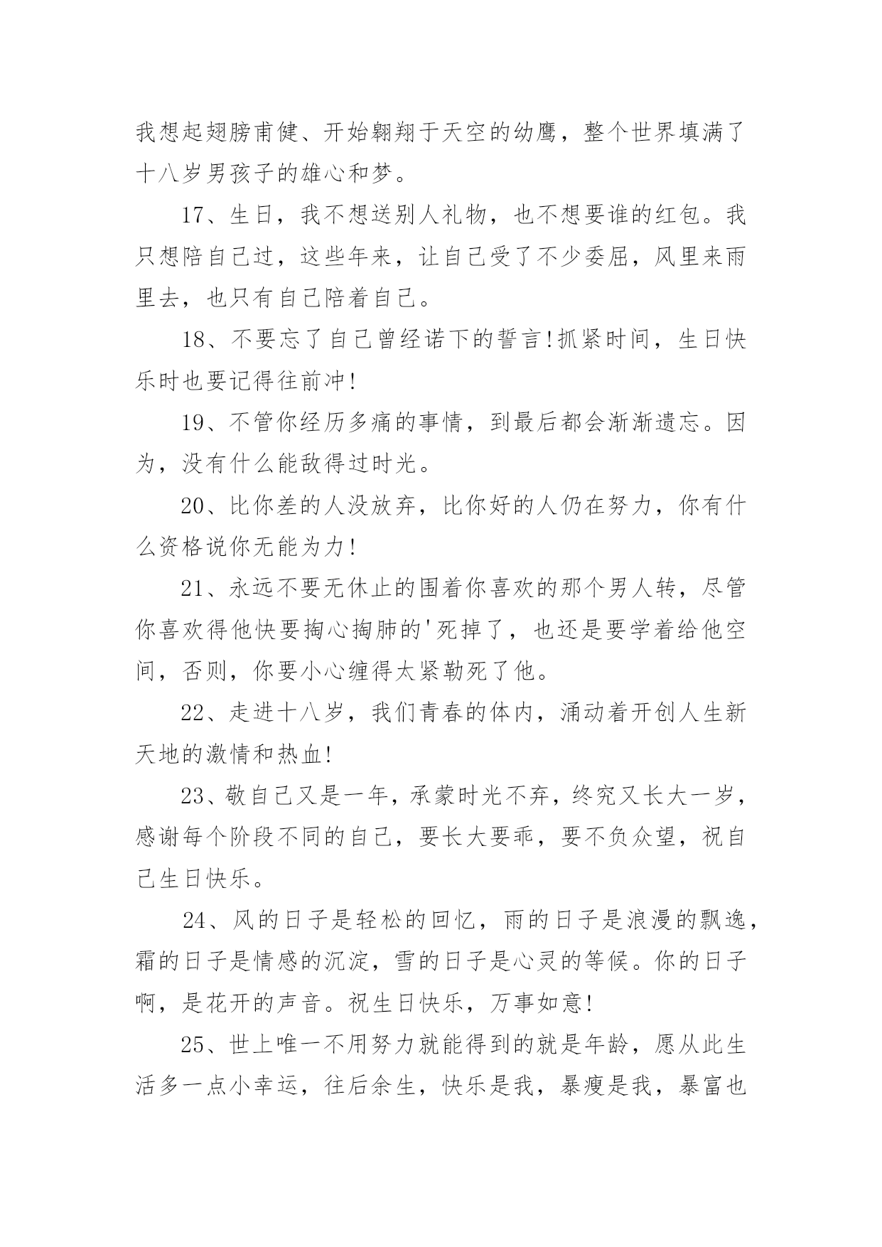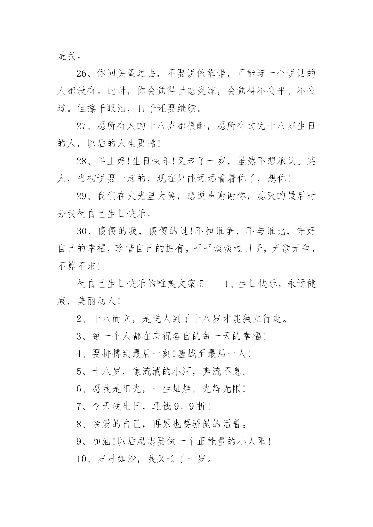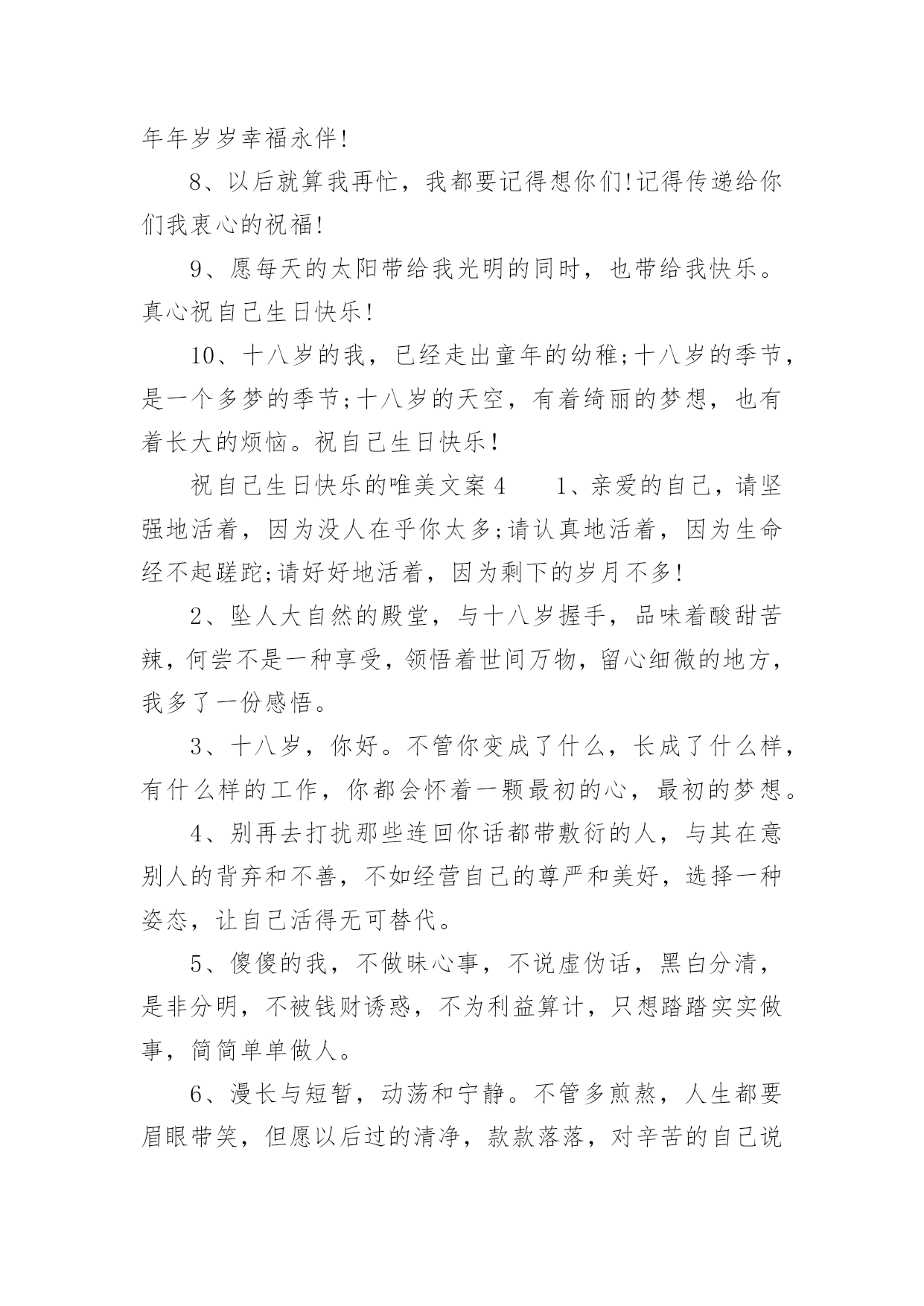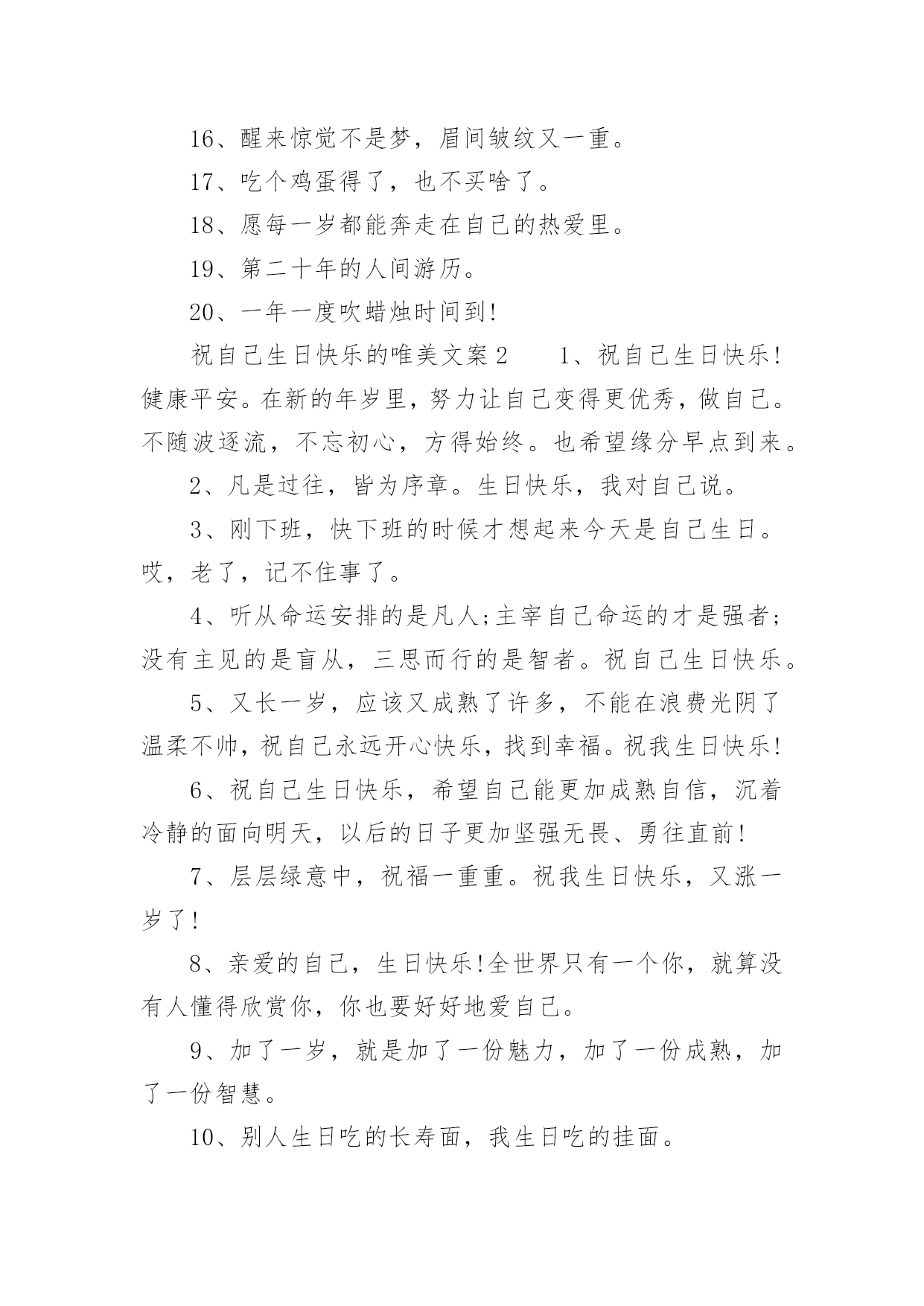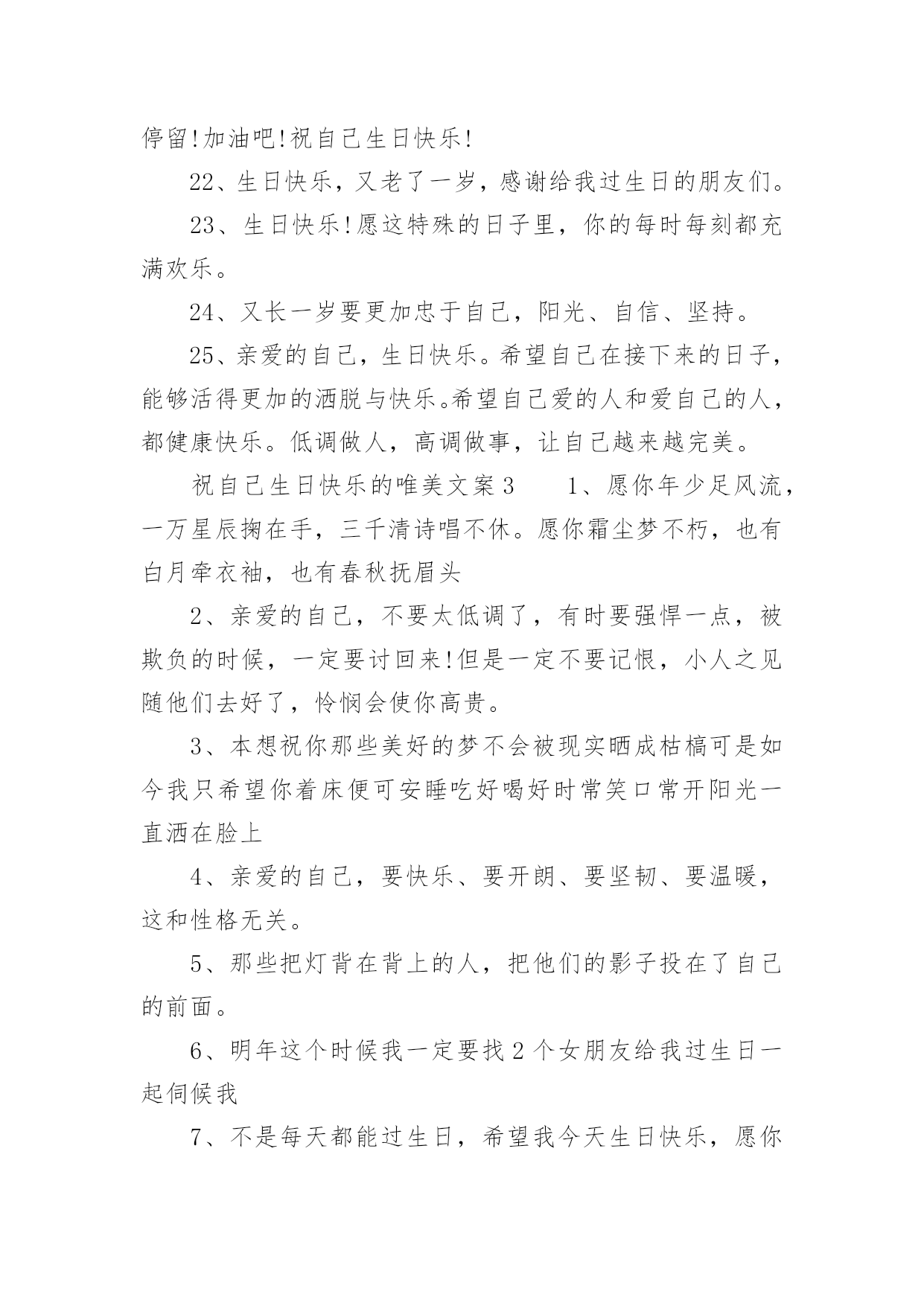 祝自己生日快乐的唯美文案祝自己生日快乐的唯美文案(精选130句)我们都知道,生日是每个人出生的重要节日,那么在生日这个重要的日子里,我们怎样才能表达我们对生日最美好的祝愿呢?以下是小编收集整理的祝自己生日快乐的唯美文案,供大家参考借鉴,希望可以帮助到有需要的朋友。祝自己生日快乐的唯美文案11、旦逢良辰,顺颂时宜。2、朝暮与年岁共往。3、愿以诚挚之心,领岁月之教诲。4、十七舒展眉,与光同成灰。5、解锁成就:18岁!6、我家有喜事今天我生日。7、尚未成熟,但已在途中。8、叮~按时长大。9、往后余生,不负流年,不负自己。10、拥有愉快生活,储存十吨热爱。11、故事不长,也不难讲,四字概括,生日快乐。12、简简单单发个日期,懂的人自然懂。13、第一次18岁请多多指教!14、按时长大,永远年轻,永远热泪盈眶!15、不过是又长大一岁的美女罢了。16、醒来惊觉不是梦,眉间皱纹又一重。17、吃个鸡蛋得了,也不买啥了。18、愿每一岁都能奔走在自己的热爱里。19、第二十年的人间游历。20、一年一度吹蜡烛时间到!祝自己生日快乐的唯美文案21、祝自己生日快乐!健康平安。在新的年岁里,努力让自己变得更优秀,做自己。不随波逐流,不忘初心,方得始终。也希望缘分早点到来。2、凡是过往,皆为序章。生日快乐,我对自己说。3、刚下班,快下班的时候才想起来今天是自己生日。哎,老了,记不住事了。4、听从命运安排的是凡人;主宰自己命运的才是强者;没有主见的是盲从,三思而行的是智者。祝自己生日快乐。5、又长一岁,应该又成熟了许多,不能在浪费光阴了温柔不帅,祝自己永远开心快乐,找到幸福。祝我生日快乐!6、祝自己生日快乐,希望自己能更加成熟自信,沉着冷静的面向明天,以后的日子更加坚强无畏、勇往直前!7、层层绿意中,祝福一重重。祝我生日快乐,又涨一岁了!8、亲爱的自己,生日快乐!全世界只有一个你,就算没有人懂得欣赏你,你也要好好地爱自己。9、加了一岁,就是加了一份魅力,加了一份成熟,加了一份智慧。10、别人生日吃的长寿面,我生日吃的挂面。11、什么都可以不好,心情不能不好;什么都可以缺乏,自信不能缺乏;什么都可以不要,快乐不能不要;什么都可以忘掉,健身不能忘掉。亲爱的自己,生日快乐。12、第一次18岁,请多多指教。祝自己生日快乐!13、生命会前行在历史的脉络上,沿途拾起一枝一叶,留待回忆,世界的存在会清晰而具体;生命会走进时间的大门,让夕阳给出记忆的钥匙。那捆记忆的柴火那么静静地躺在地上,等生命去抽取沿途拾来的枝枝叶叶,在夕阳的指尖静静回忆。祝自己生日快乐。14、一年一度一蜕变,祝我生日快乐!15、今后的你要努力要优秀要不惧怕任何人,有能力爱自己才有余力爱他人,生日快乐致自己。16、祝自己生日快乐,愿自己洒脱、成熟,想得少,睡得早!17、希望我以后的人生平安喜乐,得偿所愿。18、爱你的人如果没有按你所希望的方式来爱你,那并不代表他们没有全心全意地爱你。祝自己生日快乐!19、感谢身边有你,愿今后的日子不辜负不将就,愿所有美好的事都如约而至,祝自己生日快乐。20、祝自己生日快乐!今年的生日愿望:希望家人和爱我的人都可以身体健康,事事顺心,平平安安,开心和睦!然后希望我自己可以心想事成!21、新的一天,新的开始。要记得:到什么年纪,就该做什么事!今天的自己虽然又老了一岁,但是努力不能就此停留!加油吧!祝自己生日快乐!22、生日快乐,又老了一岁,感谢给我过生日的朋友们。23、生日快乐!愿这特殊的日子里,你的每时每刻都充满欢乐。24、又长一岁要更加忠于自己,阳光、自信、坚持。25、亲爱的自己,生日快乐。希望自己在接下来的日子,能够活得更加的洒脱与快乐。希望自己爱的人和爱自己的人,都健康快乐。低调做人,高调做事,让自己越来越完美。祝自己生日快乐的唯美文案31、愿你年少足风流,一万星辰掬在手,三千清诗唱不休。愿你霜尘梦不朽,也有白月牵衣袖,也有春秋抚眉头2、亲爱的自己,不要太低调了,有时要强悍一点,被欺负的时候,一定要讨回来!但是一定不要记恨,小人之见随他们去好了,怜悯会使你高贵。3、本想祝你那些美好的梦不会被现实晒成枯槁可是如今我只希望你着床便可安睡吃好喝好时常笑口常开阳光一直洒在脸上4、亲爱的自己,要快乐、要开朗、要坚韧、要温暖,这和性格无关。5、那些把灯背在背上的人,把他们的影子投在了自己的前面。6、明年这个时候我一定要找2个女朋友给我过生日一起伺候我7、不是每天都能过生日,希望我今天生日快乐,愿你年年岁岁幸福永伴!8、以后就算我再忙,我都要记得想你们!记得传递给你们我衷心的祝福!9、愿每天的太阳带给我光明的同时,也带给我快乐。真心祝自己生日快乐!10、十八岁的我,已经走出童年的幼稚;十八岁的季节,是一个多梦的季节;十八岁的天空,有着绮丽的梦想,也有着长大的烦恼。祝自己生日快乐!祝