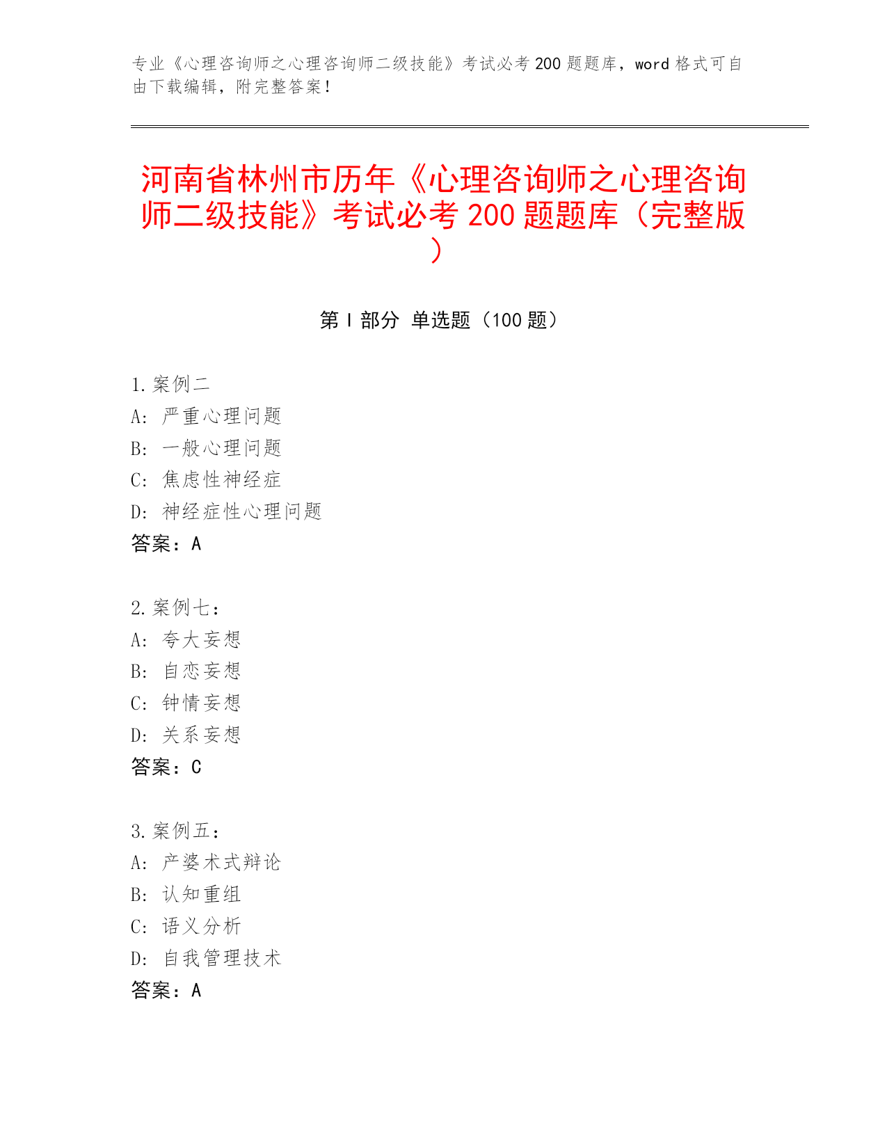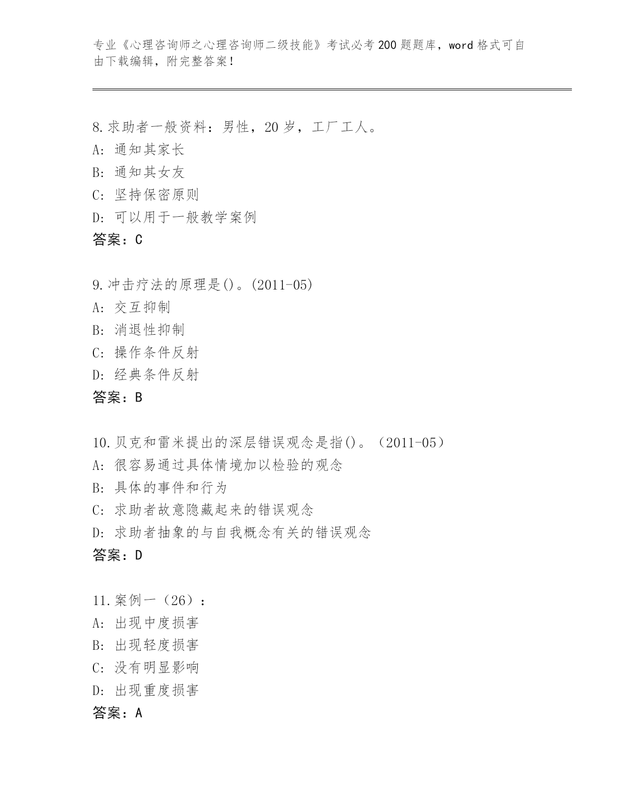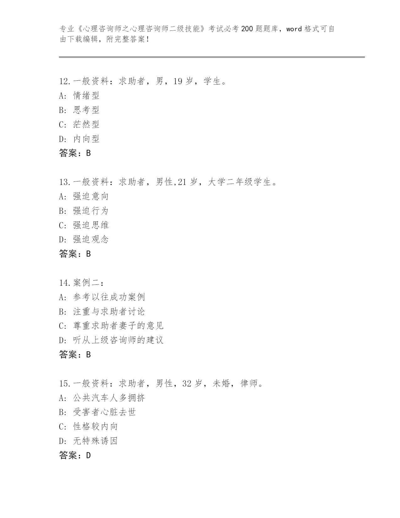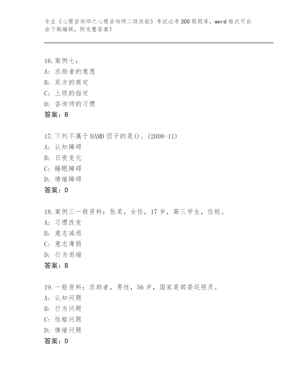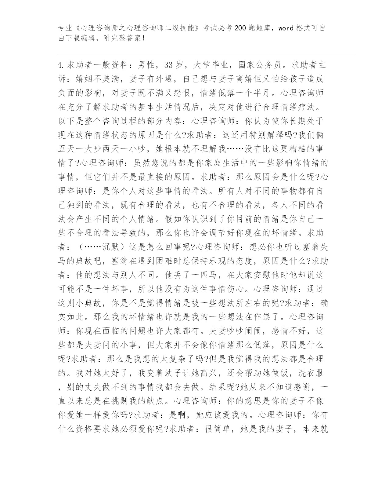 历年河南省北关区《心理咨询师之心理咨询师二级技能》考试必考200题题库(综合题)