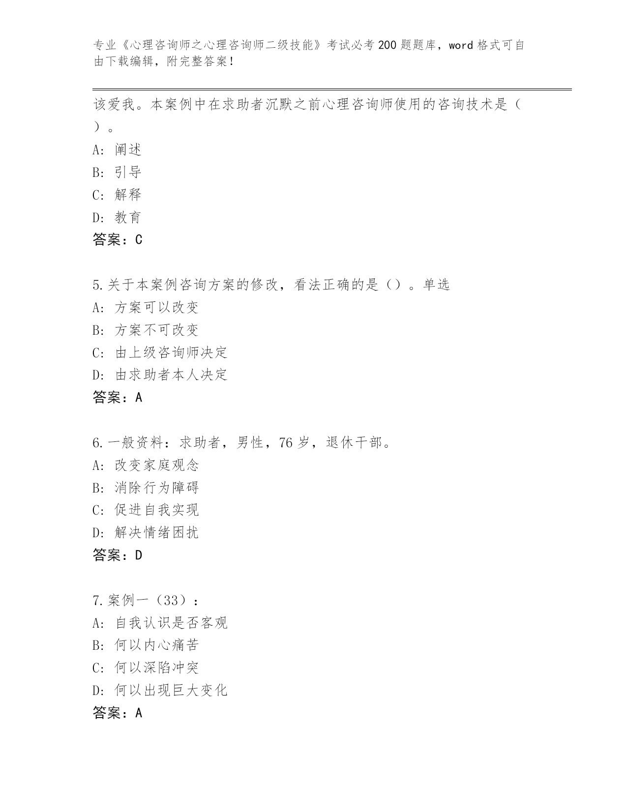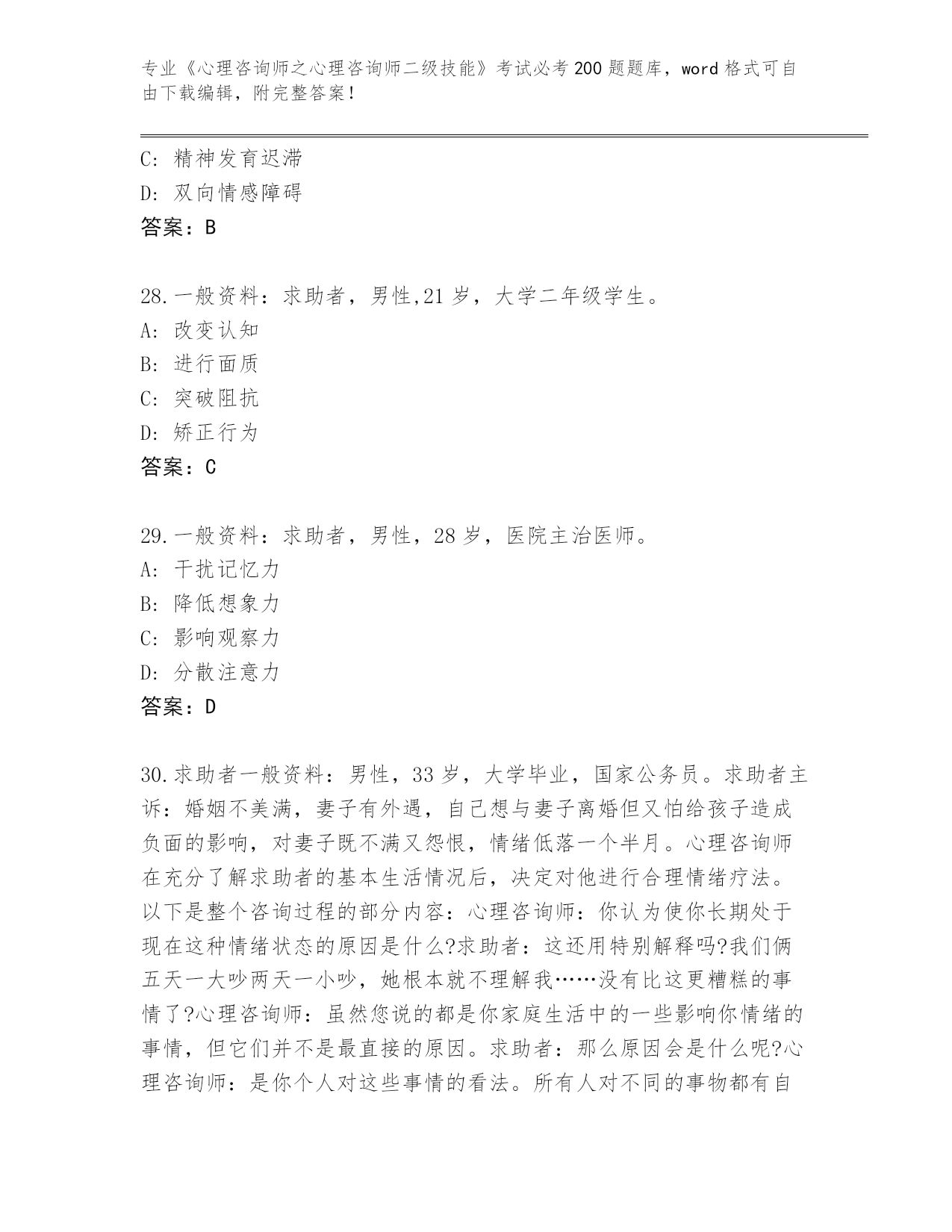 河南省睢阳区历年《心理咨询师之心理咨询师二级技能》考试必考200题真题题库(达标题)