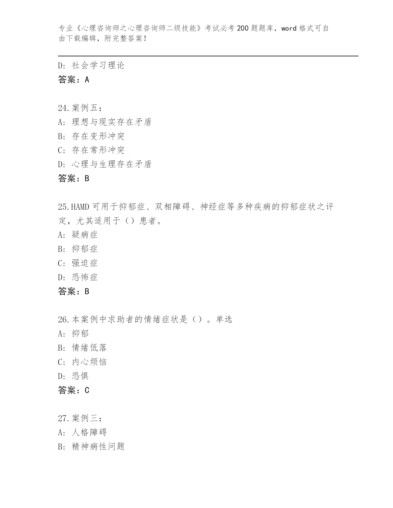 河南省历年《心理咨询师之心理咨询师二级技能》考试必考200题题库大全(典优)
