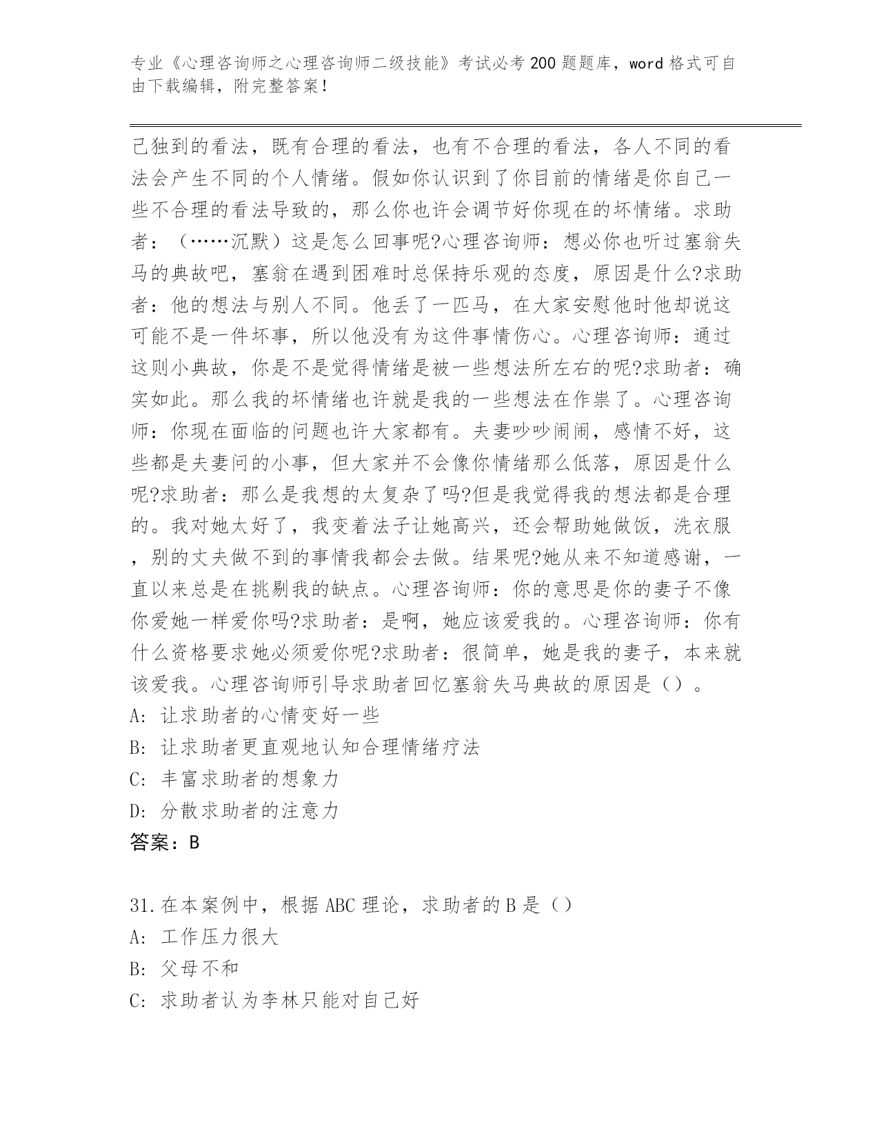 河南省兰考县历年《心理咨询师之心理咨询师二级技能》考试必考200题题库及答案参考