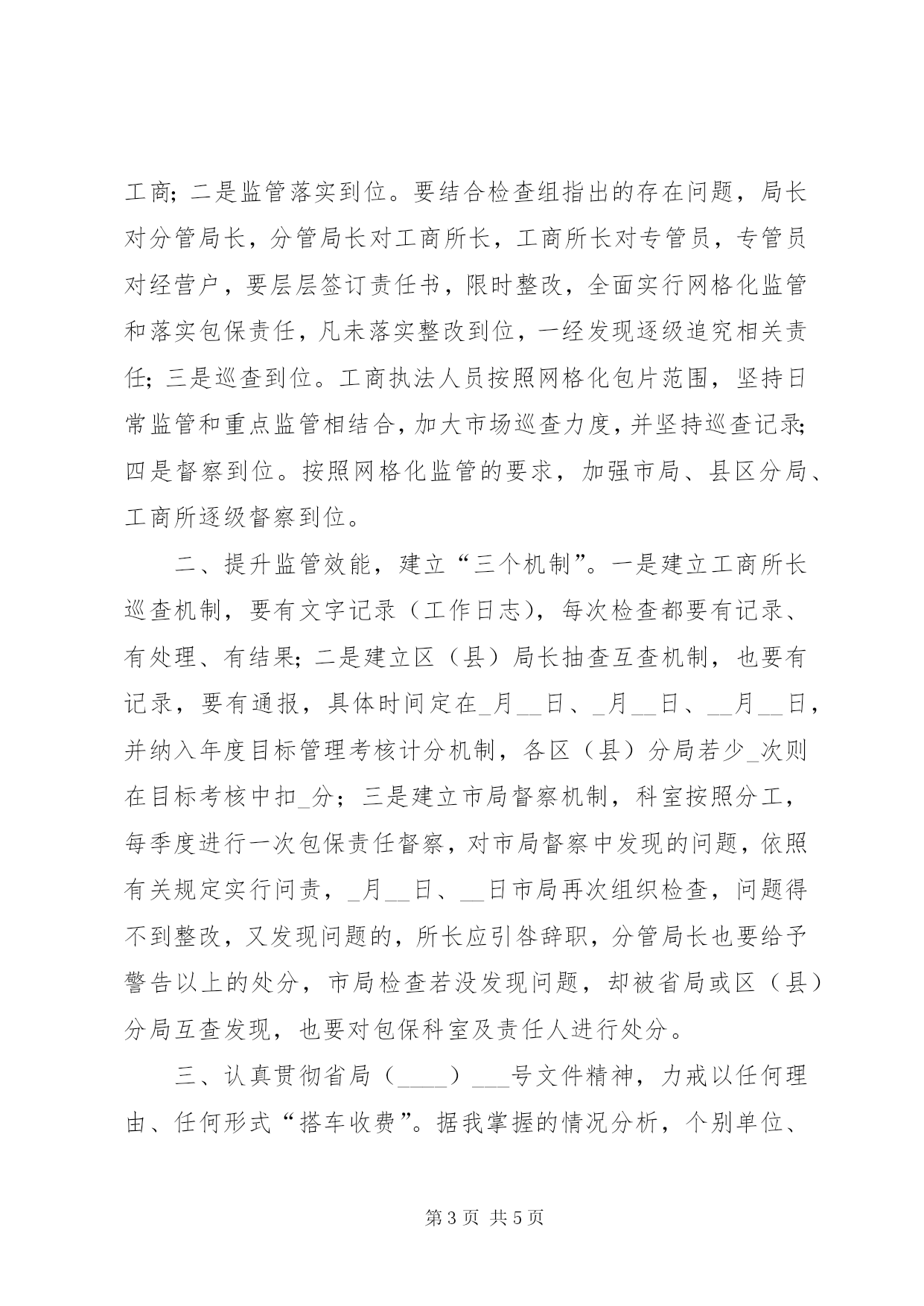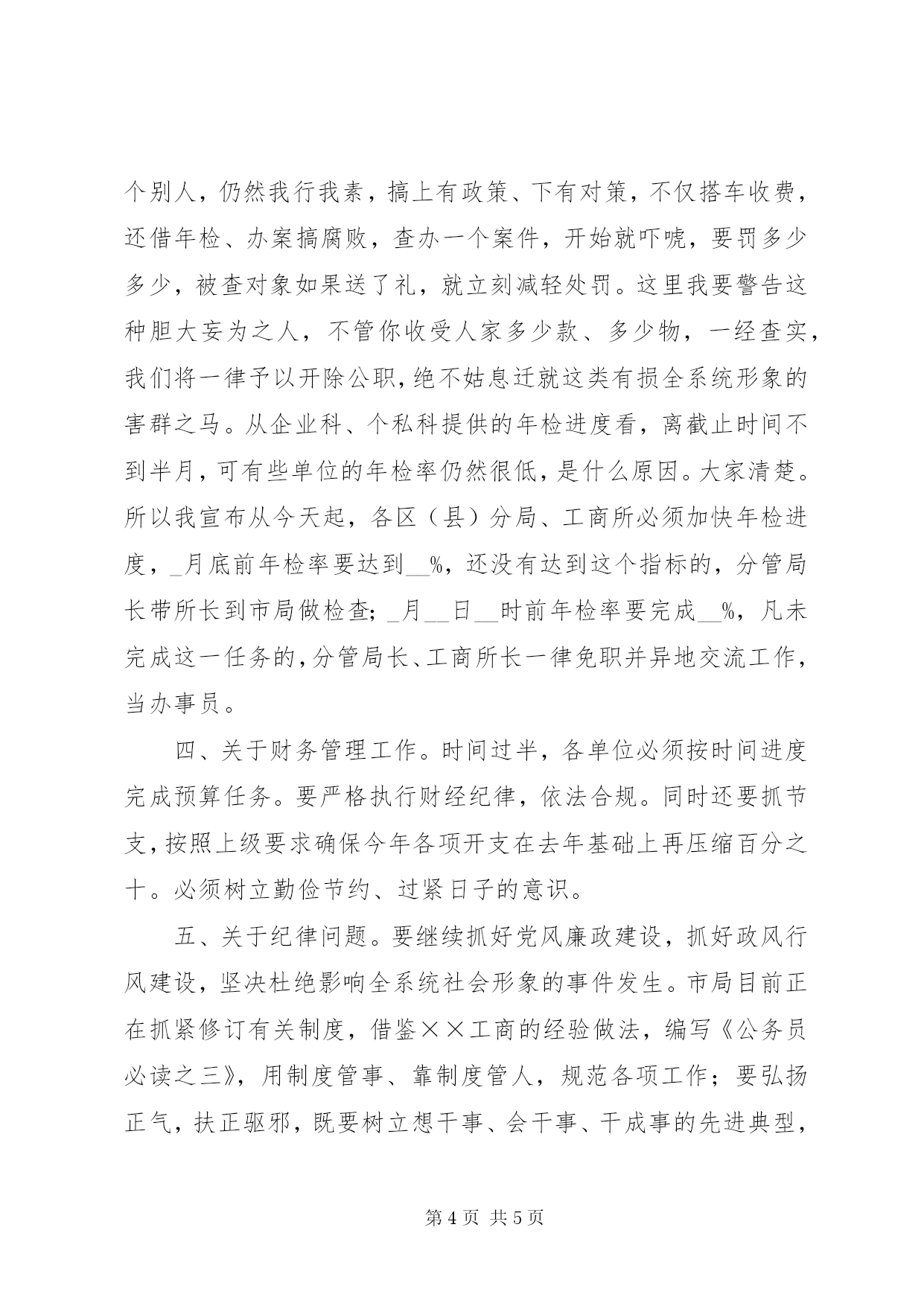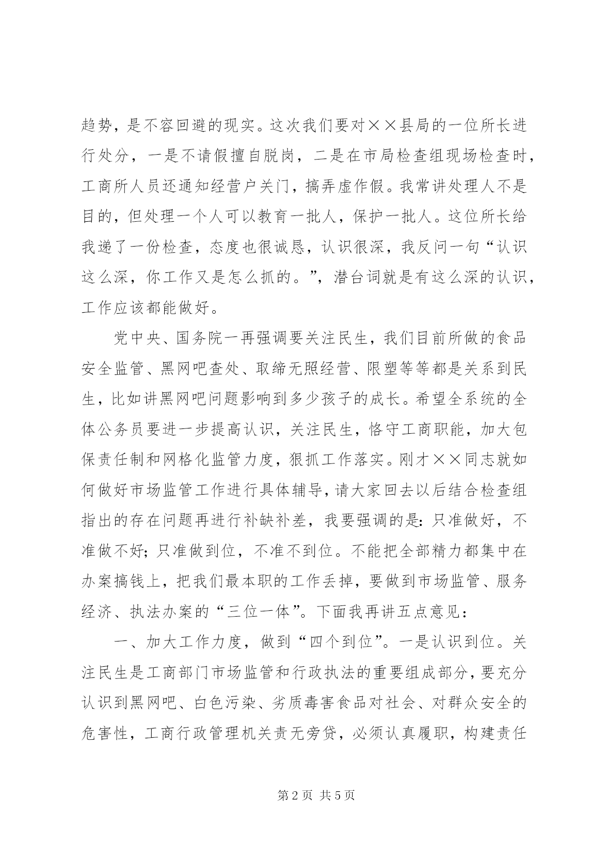 第PAGE\*Arabic\*MERGEFORMAT5页共NUMPAGES\*MERGEFORMAT5页市工商系统市场监管会议上的讲话同志们:今天,我们在这里举办全市工商系统市场监管重点工作培训会,其目的就是贯彻省局_月_日视频会议精神,认真组织开展取缔无照经营、查处黑网吧、加大夏季市场食品安全监管,限塑整治等工作,前不久,市局连续组织_次检查,就省局部署的八个方面存在问题逐项对照排查,并发了通报。我认为全系统基本上都动了起来,从检查统计数字分析:XX县区好于农村,乡镇所在地好于偏远地方,但不平衡。刚才,××、××分局介绍了经验,××分局主要做法就是实,监管工作就是纵向到底、横向到边;××分局主要做法就是建立“四个机制”、突出“四个确定”、明确“四个标准”,抓好落实,他们的经验和做法值得大家学习、借鉴和推广。××分局、××县局也做了表态性发言,他们也认识到工作上存在问题是在做检讨。我认为态度是端正的。检查的目的就是要发现问题,解决难题,对先进经验要总结和推广,对不足之处要及时加以整改。我在贯彻市委学习实践科学发展观整改提高年活动动员讲话中讲到“我们干工作,就是三分布置、七分落实”,抓什么。怎么抓。抓到什么标准。达到什么程度。总之,就是要求我们做什么事情都要实实在在,扎扎实实,不允许敷衍塞责、得过且过,更不准“糊”,蒙混过关。随着我国各方面体制机制的完善,对公务员问责力度也不断加强,这是趋势,是不容回避的现实。这次我们要对××县局的一位所长进行处分,一是不请假擅自脱岗,二是在市局检查组现场检查时,工商所人员还通知经营户关门,搞弄虚作假。我常讲处理人不是目的,但处理一个人可以教育一批人,保护一批人。这位所长给我递了一份检查,态度也很诚恳,认识很深,我反问一句“认识这么深,你工作又是怎么抓的。”,潜台词就是有这么深的认识,工作应该都能做好。党中央、国务院一再强调要关注民生,我们目前所做的食品安全监管、黑网吧查处、取缔无照经营、限塑等等都是关系到民生,比如讲黑网吧问题影响到多少孩子的成长。希望全系统的全体公务员要进一步提高认识,关注民生,恪守工商职能,加大包保责任制和网格化监管力度,狠抓工作落实。刚才××同志就如何做好市场监管工作进行具体辅导,请大家回去以后结合检查组指出的存在问题再进行补缺补差,我要强调的是:只准做好,不准做不好;只准做到位,不准不到位。不能把全部精力都集中在办案搞钱上,把我们最本职的工作丢掉,要做到市场监管、服务经济、执法办案的“三位一体”。下面我再讲五点意见:一、加大工作力度,做到“四个到位”。一是认识到位。关注民生是工商部门市场监管和行政执法的重要组成部分,要充分认识到黑网吧、白色污染、劣质毒害食品对社会、对群众安全的危害性,工商行政管理机关责无旁贷,必须认真履职,构建责任工商;二是监管落实到位。要结合检查组指出的存在问题,局长对分管局长,分管局长对工商所长,工商所长对专管员,专管员对经营户,要层层签订责任书,限时整改,全面实行网格化监管和落实包保责任,凡未落实整改到位,一经发现逐级追究相关责任;三是巡查到位。工商执法人员按照网格化包片范围,坚持日常监管和重点监管相结合,加大市场巡查力度,并坚持巡查记录;四是督察到位。按照网格化监管的要求,加强市局、县区分局、工商所逐级督察到位。二、提升监管效能,建立“三个机制”。一是建立工商所长巡查机制,要有文字记录(工作日志),每次检查都要有记录、有处理、有结果;二是建立区(县)局长抽查互查机制,也要有记录,要有通报,具体时间定在_月__日、_月__日、__月__日,并纳入年度目标管理考核计分机制,各区(县)分局若少_次则在目标考核中扣_分;三是建立市局督察机制,科室按照分工,每季度进行一次包保责任督察,对市局督察中发现的问题,依照有关规定实行问责,_月__日、__日市局再次组织检查,问题得不到整改,又发现问题的,所长应引咎辞职,分管局长也要给予警告以上的处分,市局检查若没发现问题,却被省局或区(县)分局互查发现,也要对包保科室及责任人进行处分。三、认真贯彻省局(____)___号文件精神,力戒以任何理由、任何形式“搭车收费”。据我掌握的情况分析,个别单位、个别人,仍然我行我素,搞上有政策、下有对策,不仅搭车收费,还借年检、办案搞腐败,查办一个案件,开始就吓唬,要罚多少多少,被查对象如果送了礼,就立刻减轻处罚。这里我要警告这种胆大妄为之人,不管你收受人家多少款、多少物,一经查实,我们将一律予以开除公职,绝不姑息迁就这类有损全系统形象的害群之马。从企业科、个私科提供的年检进度看,离截止时间不到半月,可有些单位的年检率仍然很低,是什么原因。大家清楚。所以我宣布从今天起,各区(县)分局、工商所必须加快年检进度,_月底前年检率要达到__%,还没有达到这个指