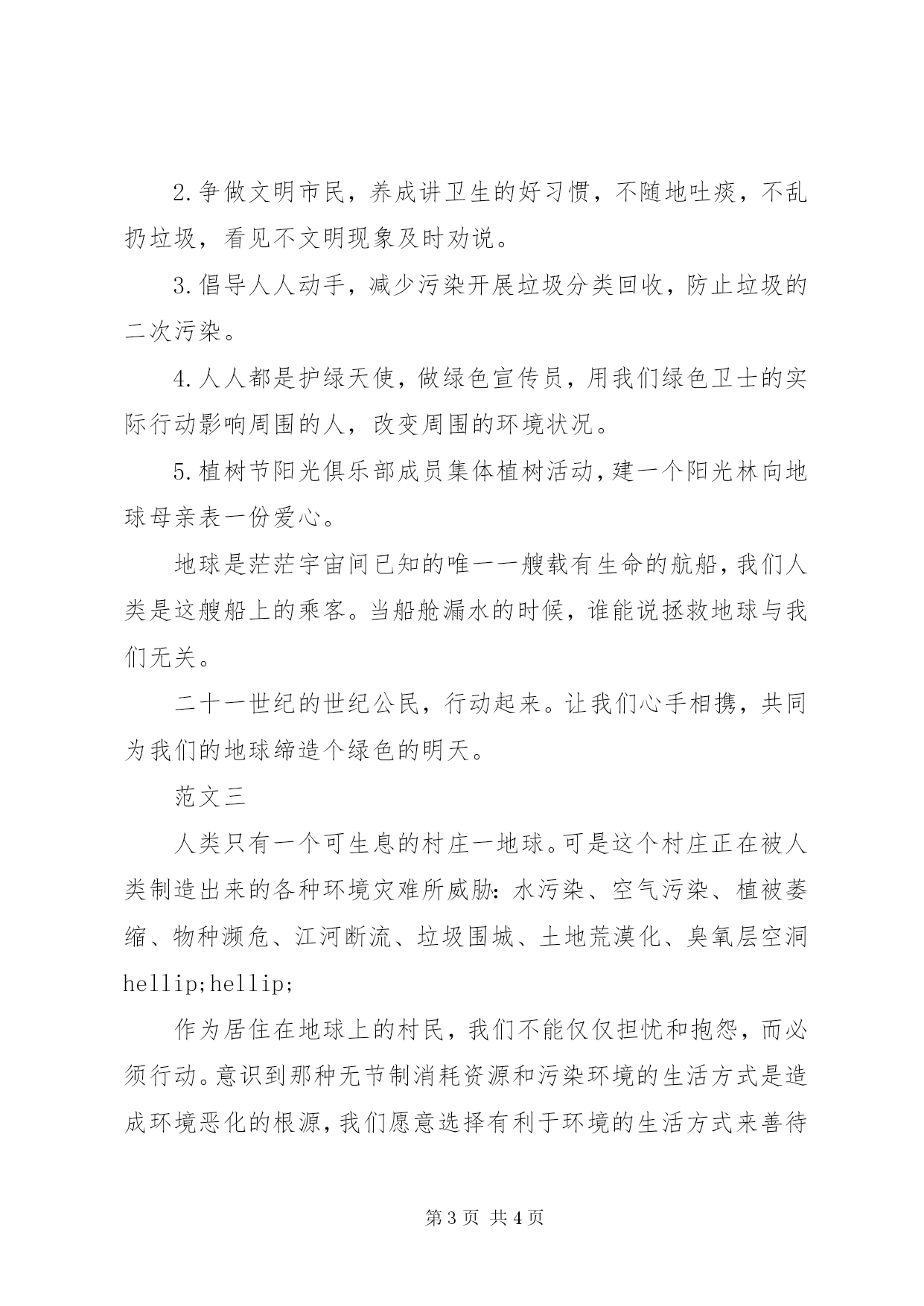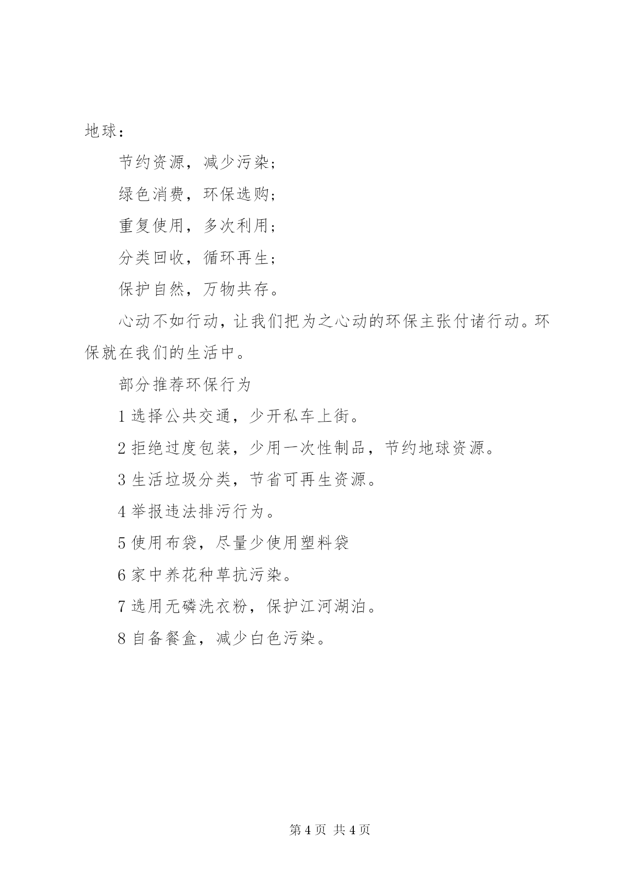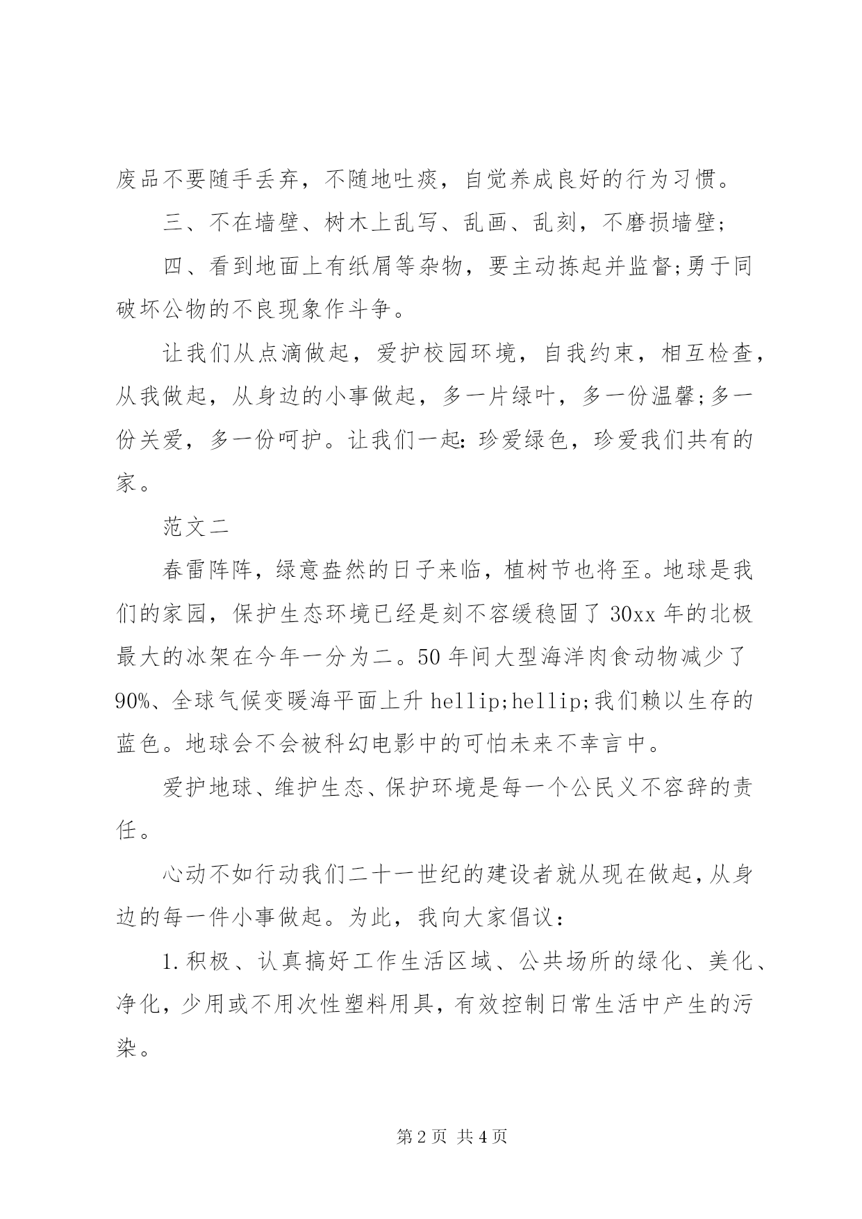 第PAGE\*Arabic\*MERGEFORMAT4页共NUMPAGES\*MERGEFORMAT4页绿色环保倡议书范文一尊敬的老师、亲爱的同学们:谁不渴望那郁郁葱葱的草地。谁不愿自己的校园变成花城一样。谁不希望在温馨洁净的校园内读书。现在学校给我们提供了一切,可是,大风偶尔吹起的是那白色的垃圾,这是谁的错。当我们在绿树成荫的校园中漫步时,一定会感到心旷神怡;当我们坐在窗明几净的教室中读书时,哪能不全神贯注。当我们在整洁优雅的环境中学习时,定会倍感心情舒畅。优美的环境,让我们懂得珍惜,学会爱护;优美的环境,让我们知书达礼,更加文明;优美的环境,让我们学习进步,道德高尚;优美的环境让我们学会谦让,学会做人。在优美的校园环境中,我们沐浴着阳光收获,吸取着营养成长。学校是我们的家,我们是学校的主人,建设靠的是我们。在我们新一届同学刚入住新校区,我们的家更需要我们的爱,我们倡议全校师生爱我校园,从我做起的校园文明行动。我们向全校师生发出以下倡议:一、校师生一齐来保护现有草木,全不践踏绿地草坪,不攀摘树枝花朵;爱护每一片绿叶,爱护每一株幼苗。二、节约用水,不乱扔废纸、果皮纸屑,使用过的塑料瓶等废品不要随手丢弃,不随地吐痰,自觉养成良好的行为习惯。三、不在墙壁、树木上乱写、乱画、乱刻,不磨损墙壁;四、看到地面上有纸屑等杂物,要主动拣起并监督;勇于同破坏公物的不良现象作斗争。让我们从点滴做起,爱护校园环境,自我约束,相互检查,从我做起,从身边的小事做起,多一片绿叶,多一份温馨;多一份关爱,多一份呵护。让我们一起:珍爱绿色,珍爱我们共有的家。范文二春雷阵阵,绿意盎然的日子来临,植树节也将至。地球是我们的家园,保护生态环境已经是刻不容缓稳固了30xx年的北极最大的冰架在今年一分为二。50年间大型海洋肉食动物减少了90%、全球气候变暖海平面上升hellip;hellip;我们赖以生存的蓝色。地球会不会被科幻电影中的可怕未来不幸言中。爱护地球、维护生态、保护环境是每一个公民义不容辞的责任。心动不如行动我们二十一世纪的建设者就从现在做起,从身边的每一件小事做起。为此,我向大家倡议:1.积极、认真搞好工作生活区域、公共场所的绿化、美化、净化,少用或不用次性塑料用具,有效控制日常生活中产生的污染。2.争做文明市民,养成讲卫生的好习惯,不随地吐痰,不乱扔垃圾,看见不文明现象及时劝说。3.倡导人人动手,减少污染开展垃圾分类回收,防止垃圾的二次污染。4.人人都是护绿天使,做绿色宣传员,用我们绿色卫士的实际行动影响周围的人,改变周围的环境状况。5.植树节阳光俱乐部成员集体植树活动,建一个阳光林向地球母亲表一份爱心。地球是茫茫宇宙间已知的唯一一艘载有生命的航船,我们人类是这艘船上的乘客。当船舱漏水的时候,谁能说拯救地球与我们无关。二十一世纪的世纪公民,行动起来。让我们心手相携,共同为我们的地球缔造个绿色的明天。范文三人类只有一个可生息的村庄一地球。可是这个村庄正在被人类制造出来的各种环境灾难所威胁:水污染、空气污染、植被萎缩、物种濒危、江河断流、垃圾围城、土地荒漠化、臭氧层空洞hellip;hellip;作为居住在地球上的村民,我们不能仅仅担忧和抱怨,而必须行动。意识到那种无节制消耗资源和污染环境的生活方式是造成环境恶化的根源,我们愿意选择有利于环境的生活方式来善待地球:节约资源,减少污染;绿色消费,环保选购;重复使用,多次利用;分类回收,循环再生;保护自然,万物共存。心动不如行动,让我们把为之心动的环保主张付诸行动。环保就在我们的生活中。部分推荐环保行为1选择公共交通,少开私车上街。2拒绝过度包装,少用一次性制品,节约地球资源。3生活垃圾分类,节省可再生资源。4举报违法排污行为。5使用布袋,尽量少使用塑料袋6家中养花种草抗污染。7选用无磷洗衣粉,保护江河湖泊。8自备餐盒,减少白色污染。